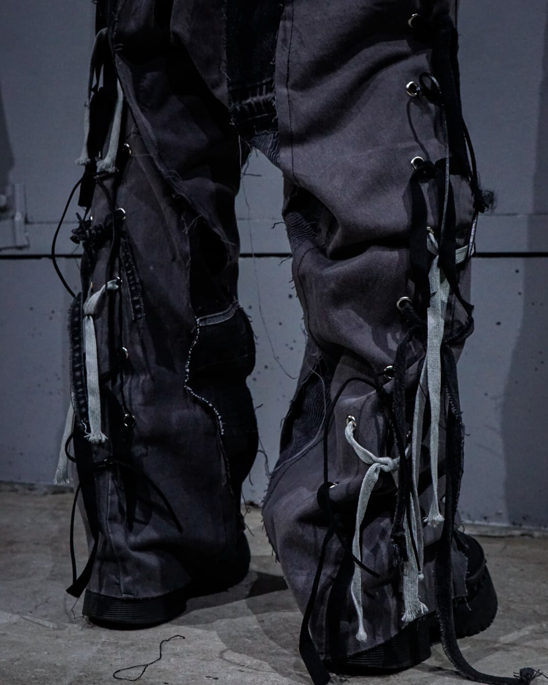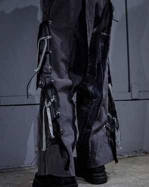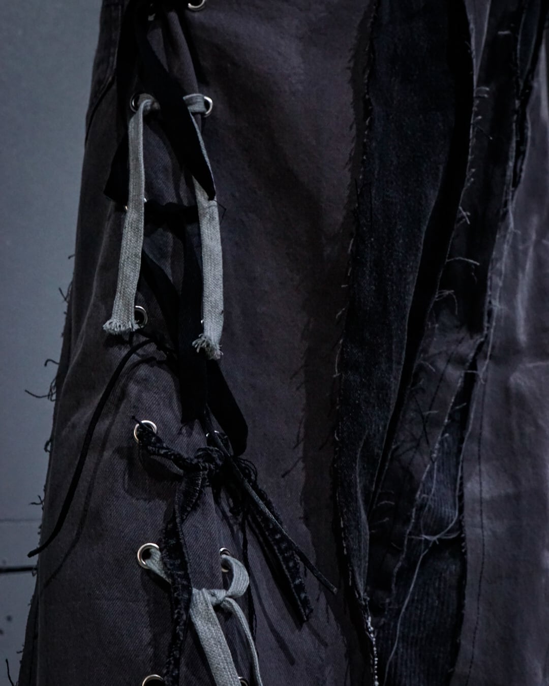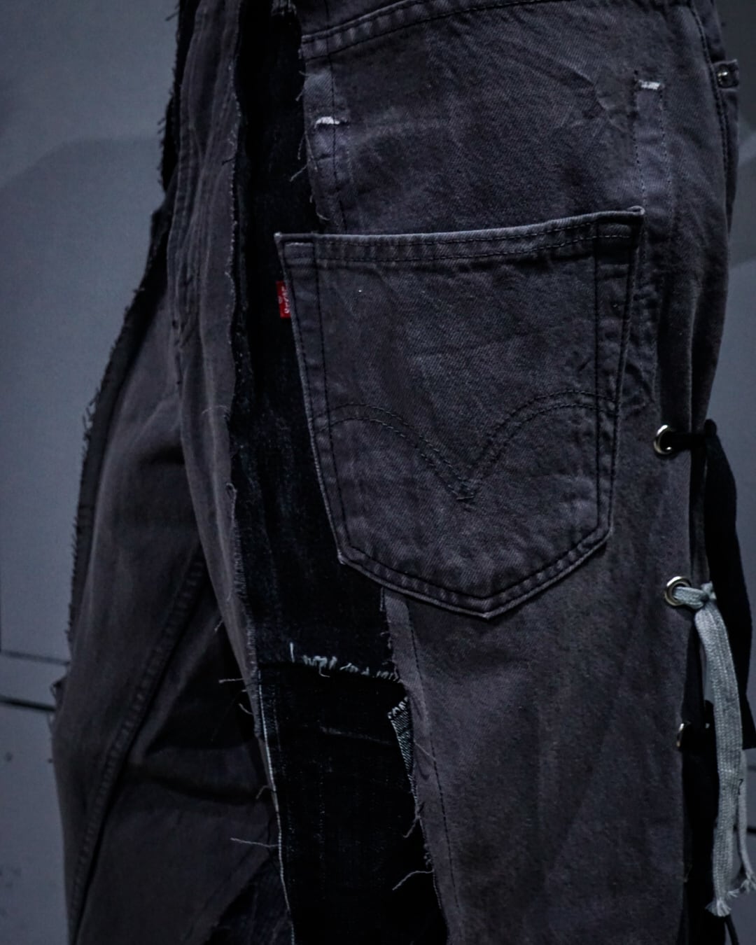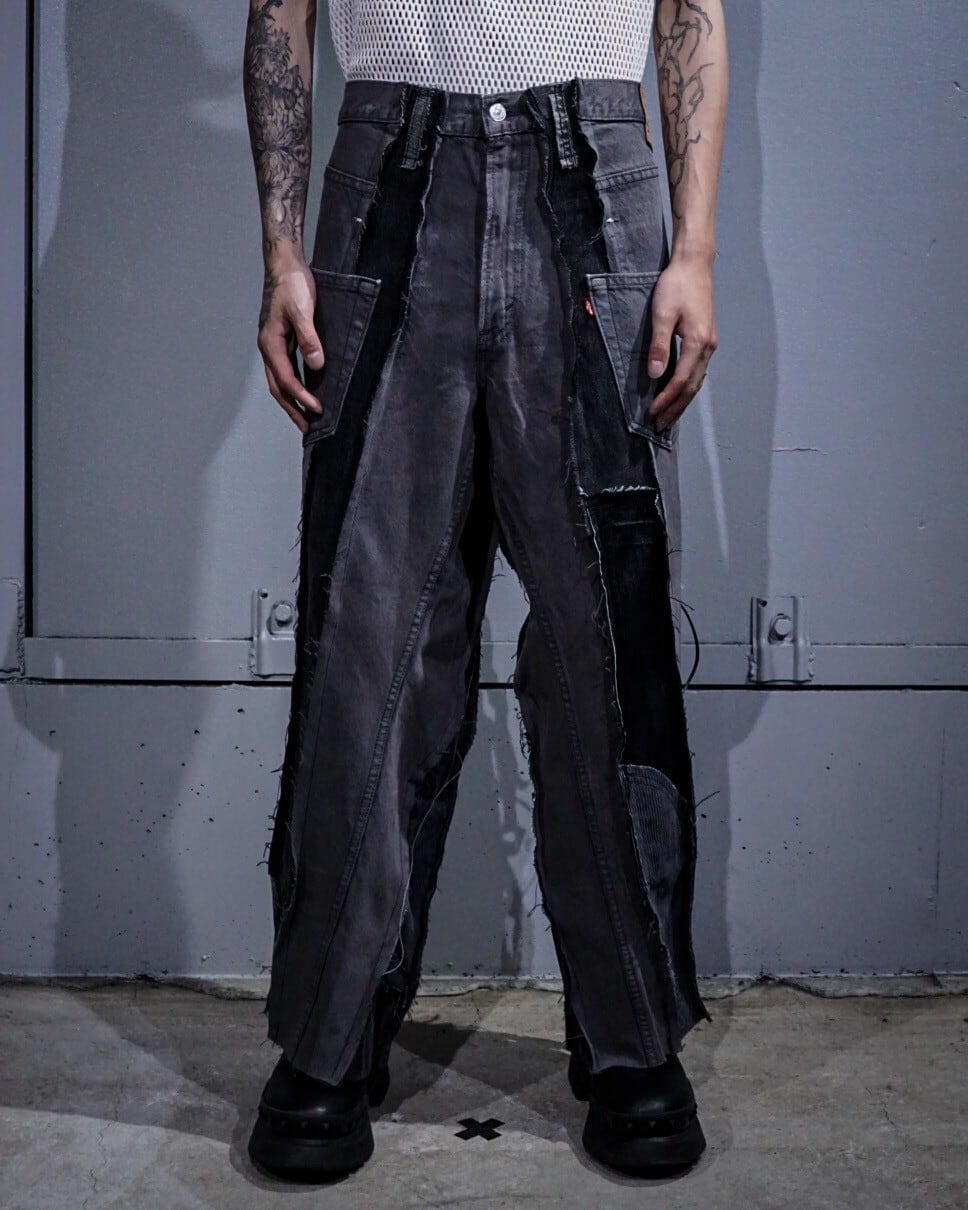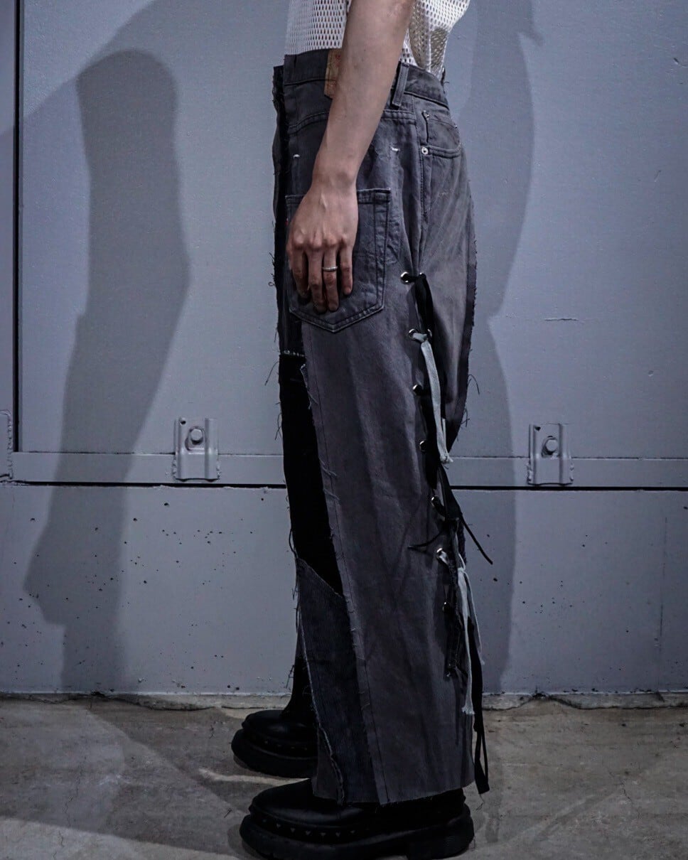 グレーのデニムをベースに、フェードグレーのデニムをアシンメトリーにパネル状に切り替え、ワイドにリサイズした1着。