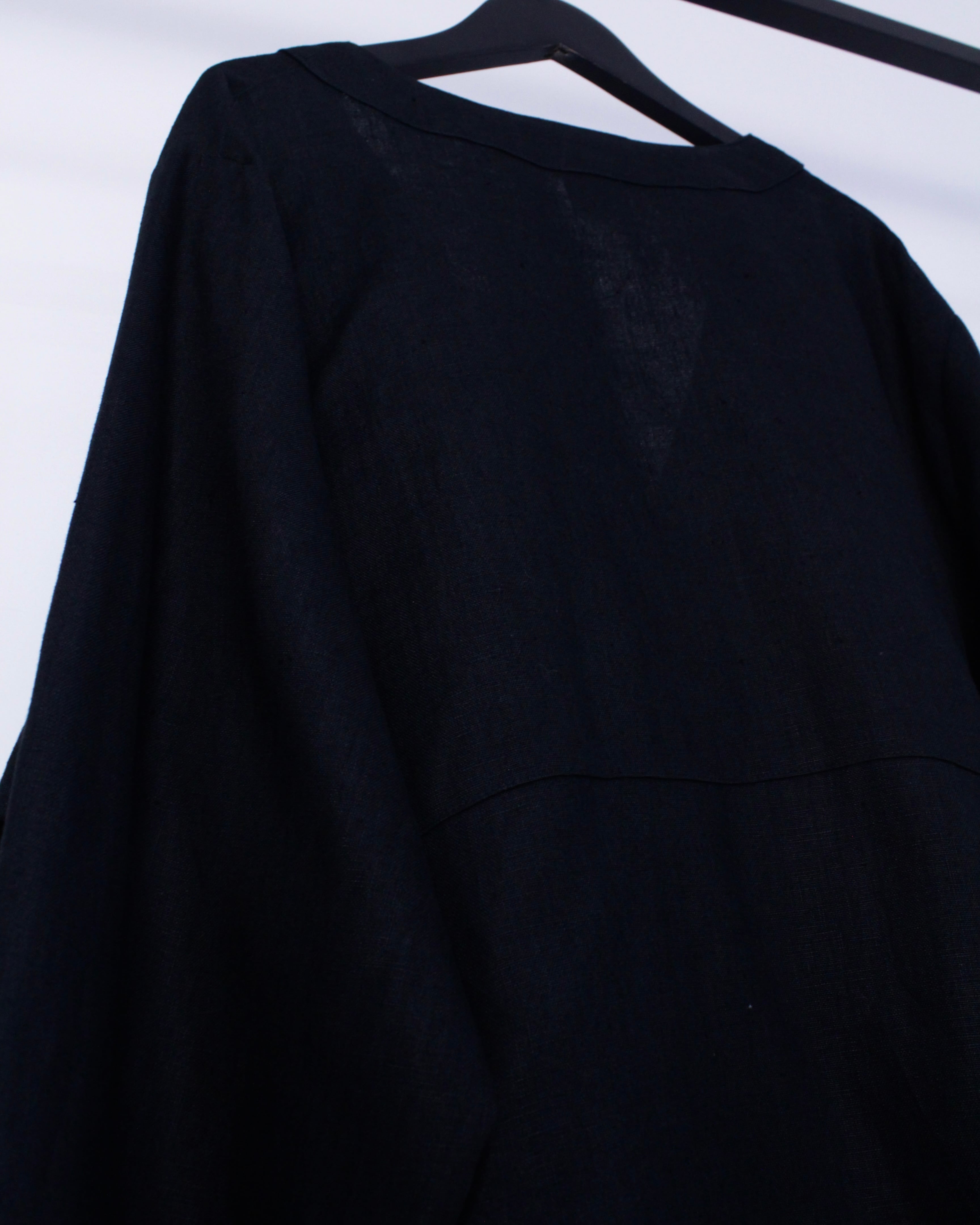 ハリのある、少し厚手のブラックのリネン素材を用いて、に日本の和の"甚兵衛"をデザインソースに作られたジャケット。