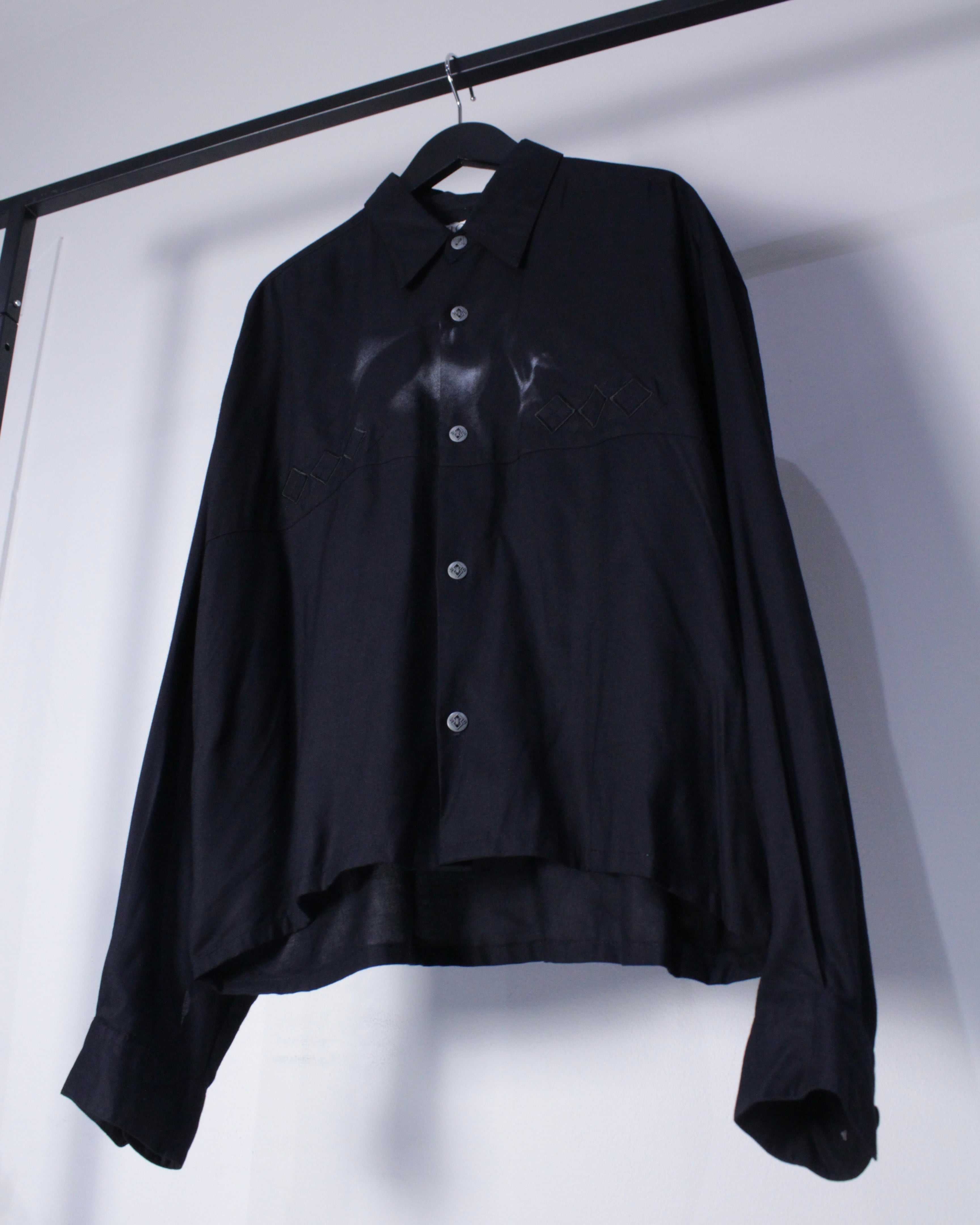 ブラックのボディをベースに、フロントにアーガイルの刺繍を刻んだ長袖シャツ。