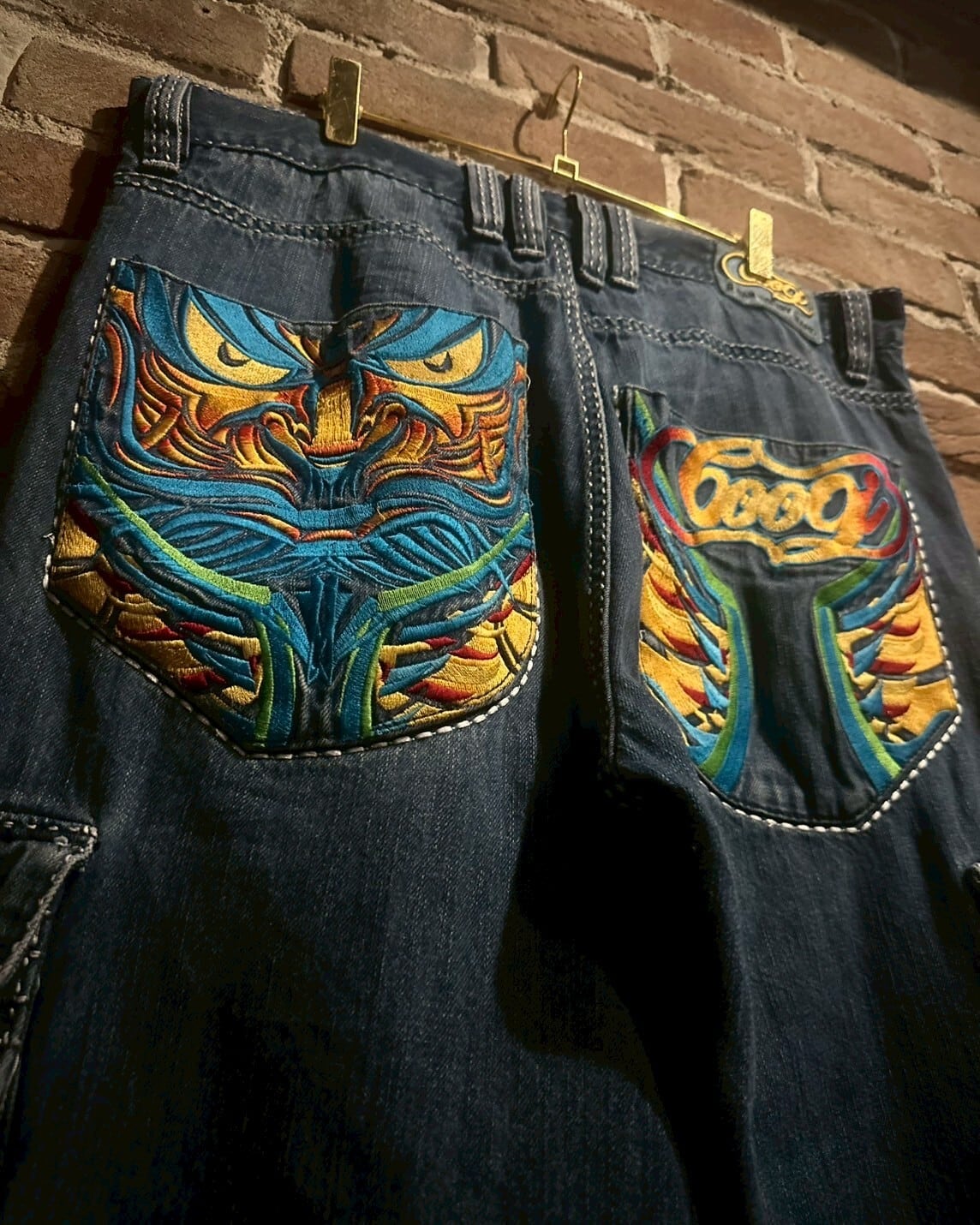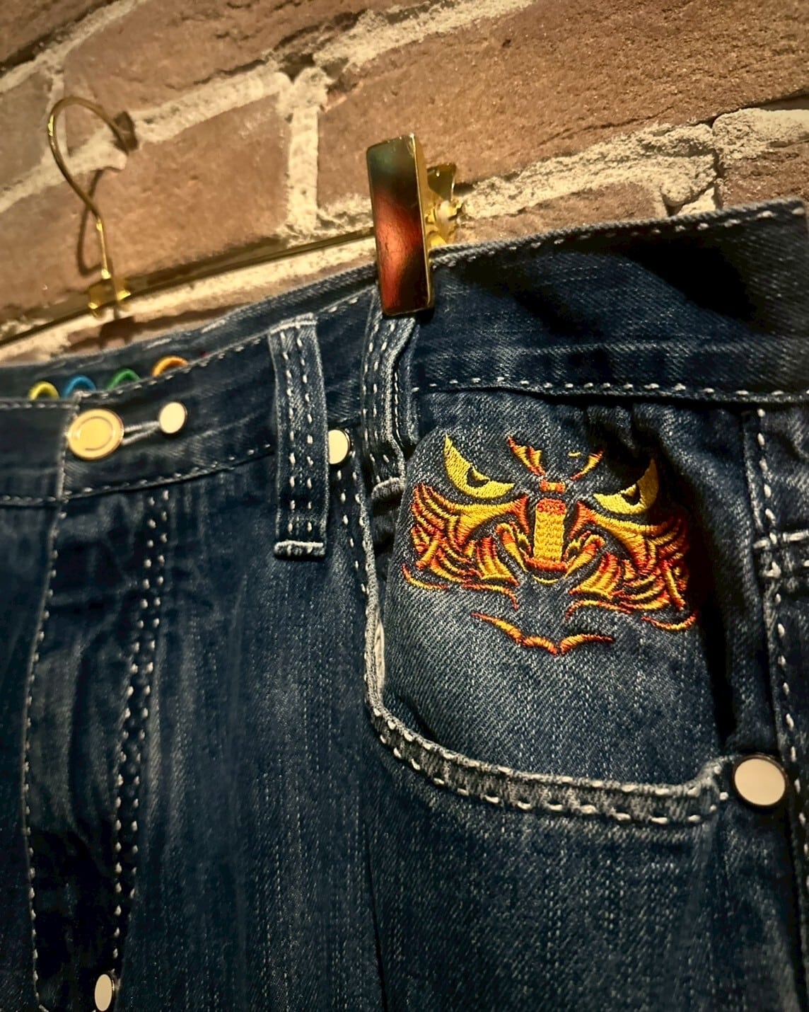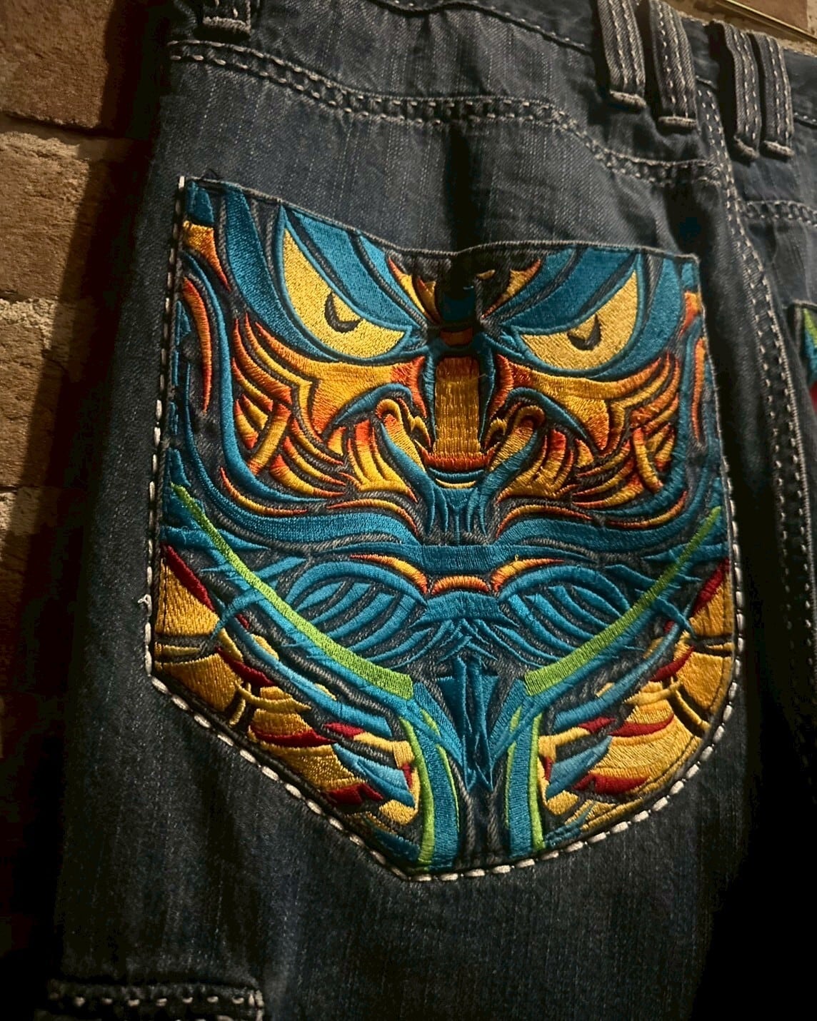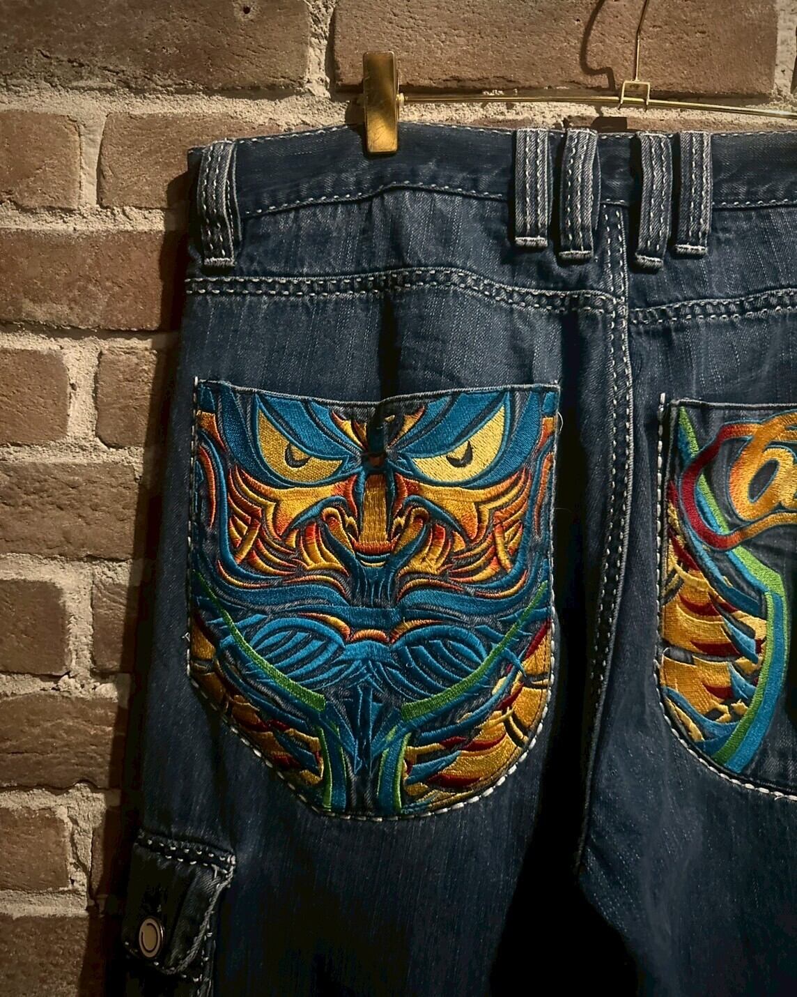 フェード感の良いインディゴのデニムに、バックポケットやフロントのポケットにアーティスティックかつ迫力のある刺繍を施した逸品。