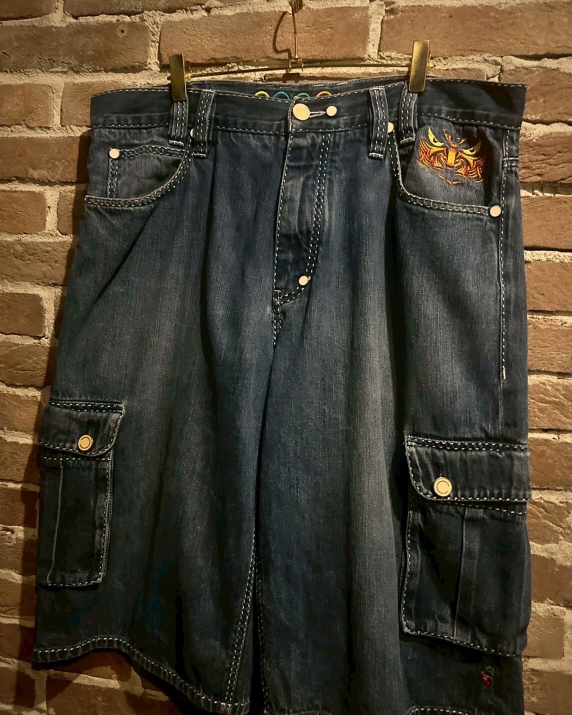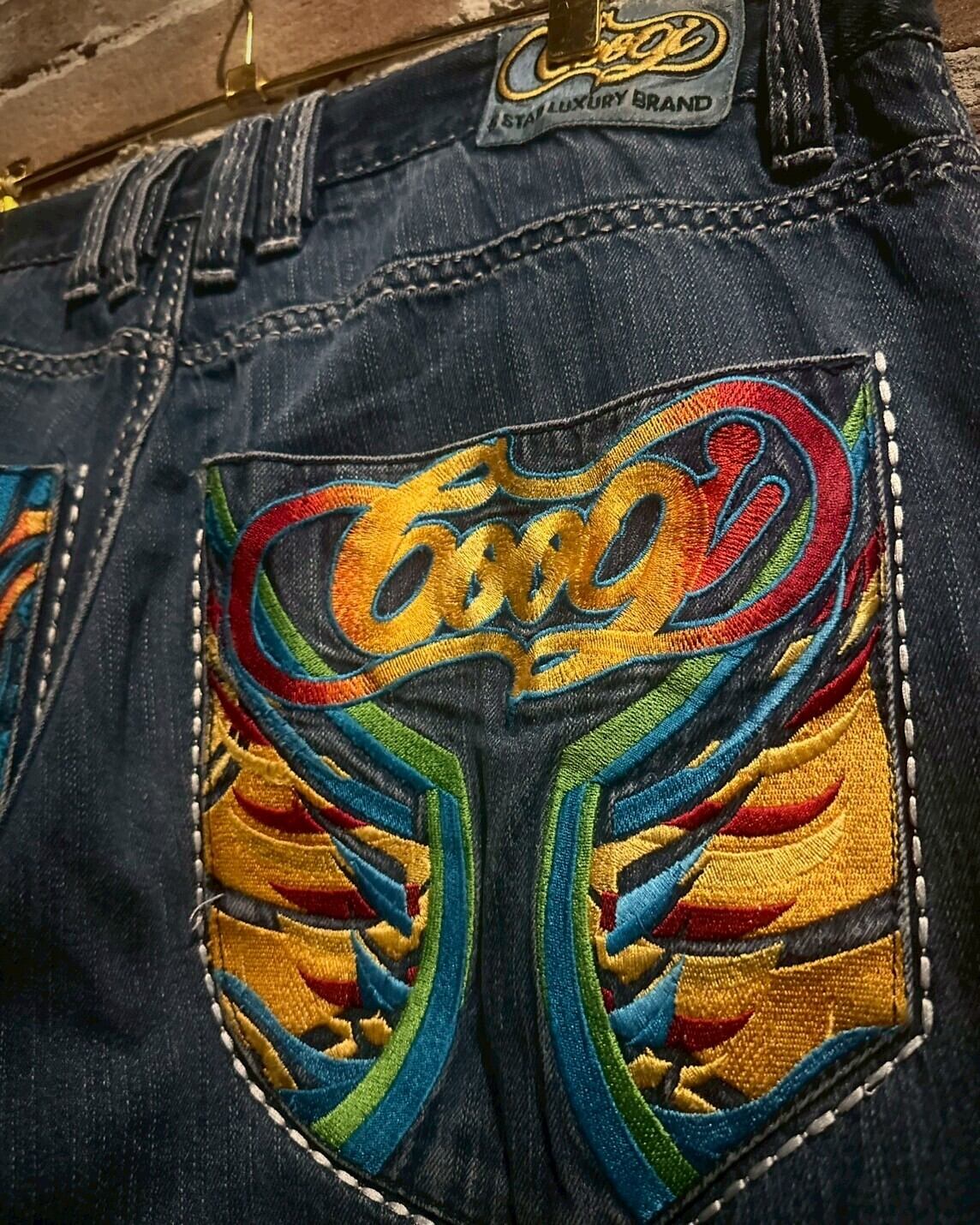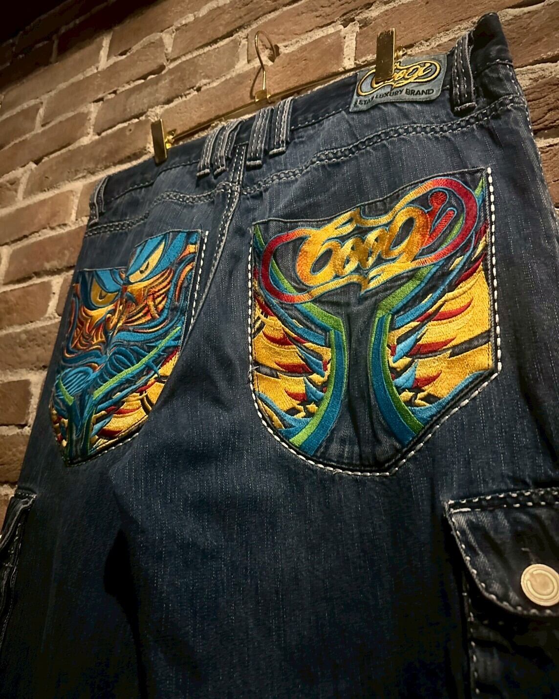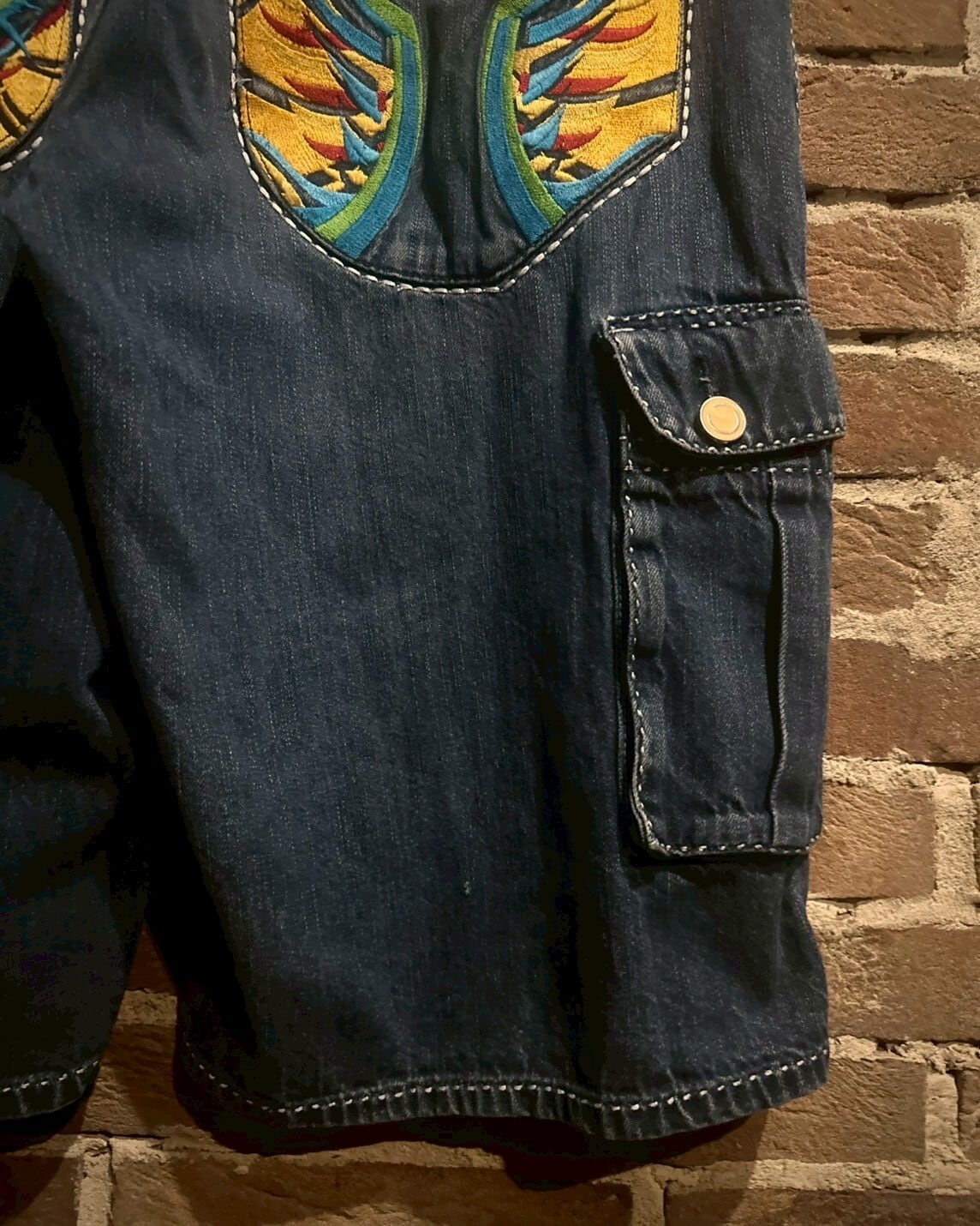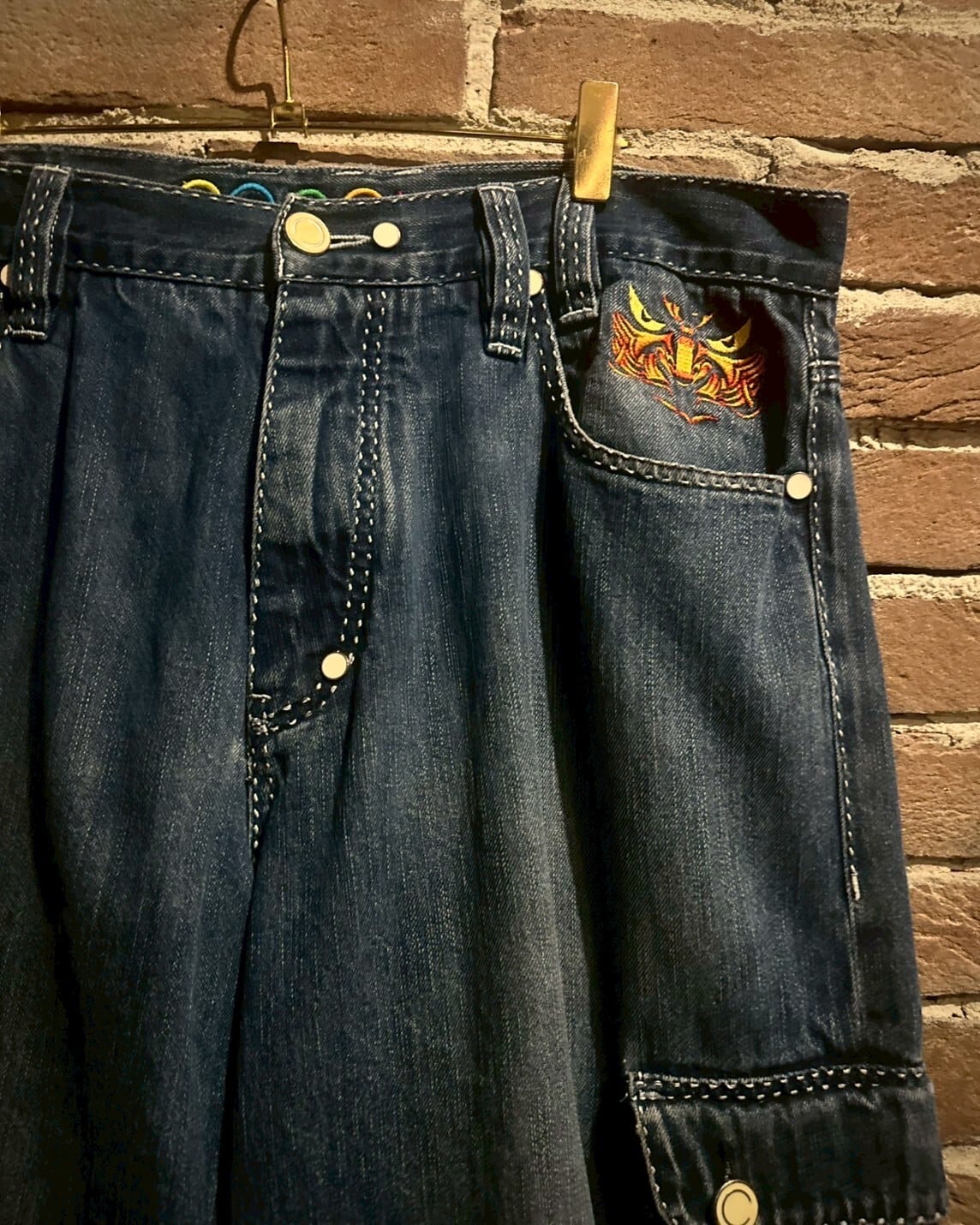 フェード感の良いインディゴのデニムに、バックポケットやフロントのポケットにアーティスティックかつ迫力のある刺繍を施した逸品。