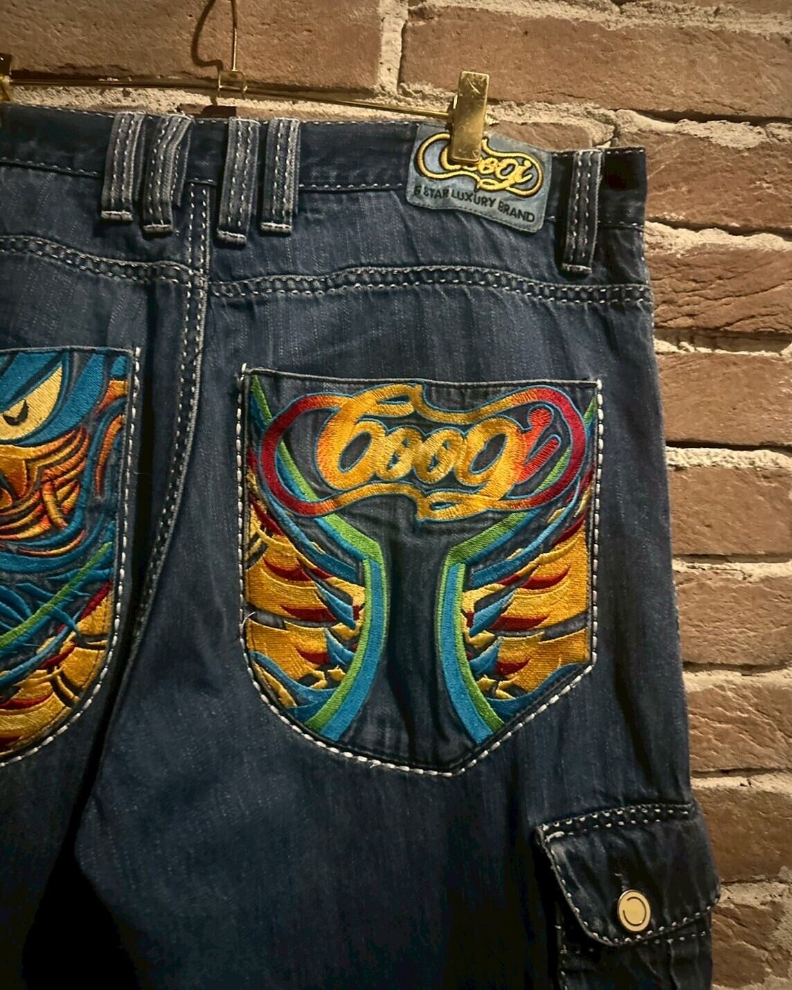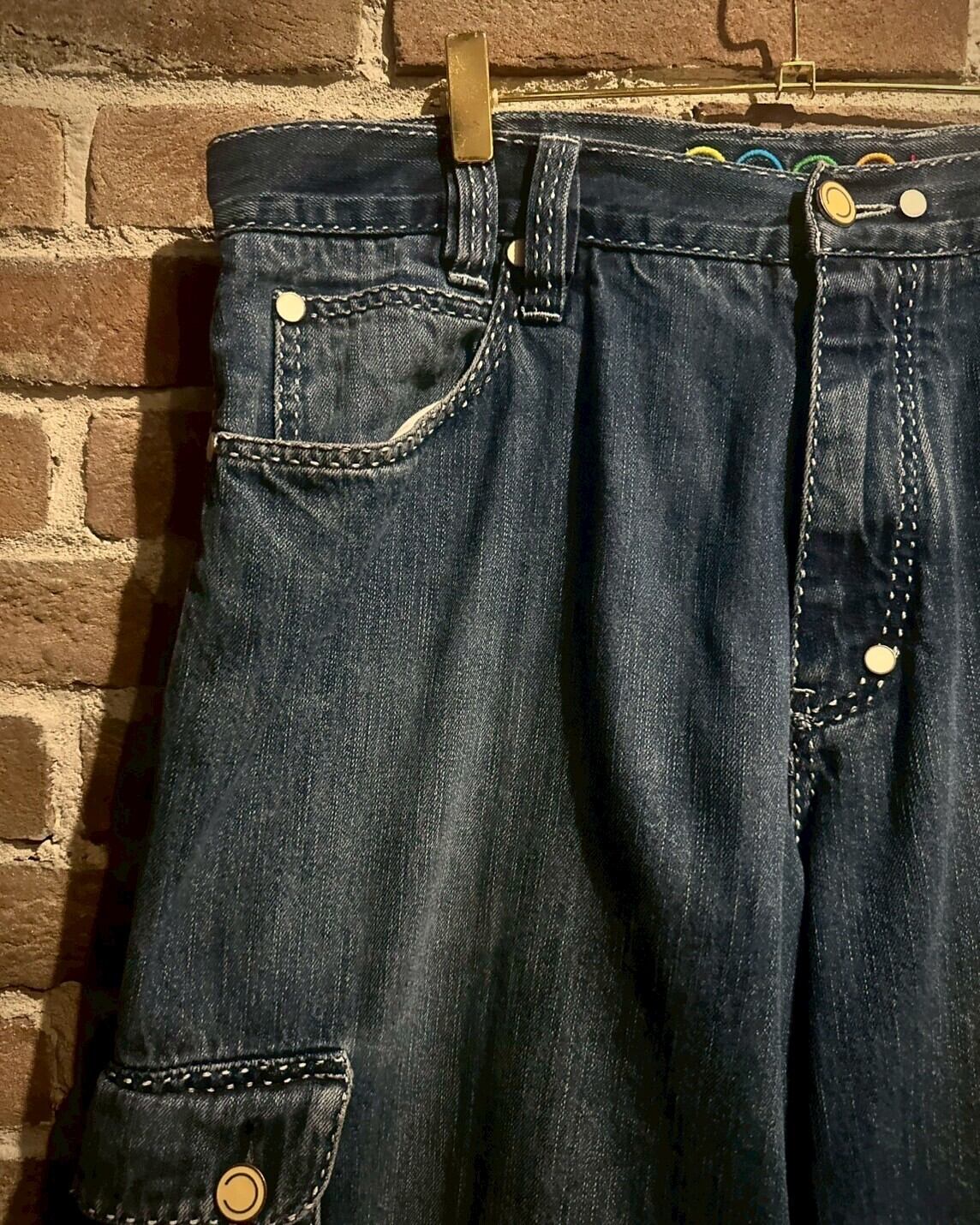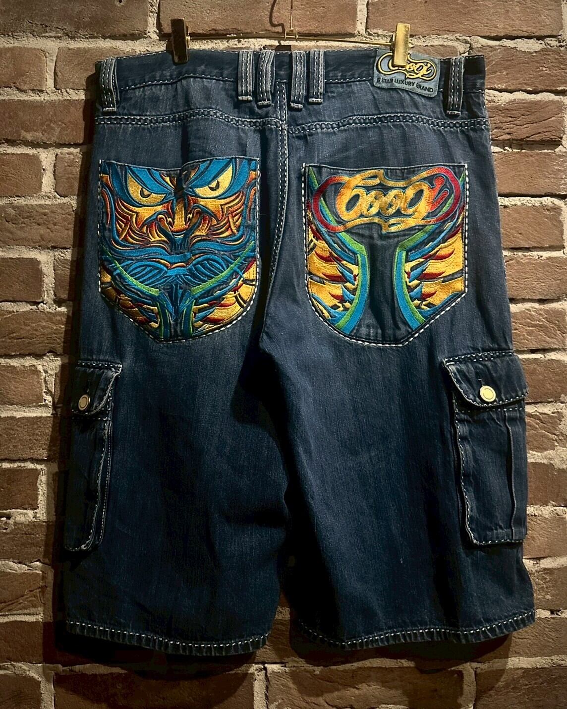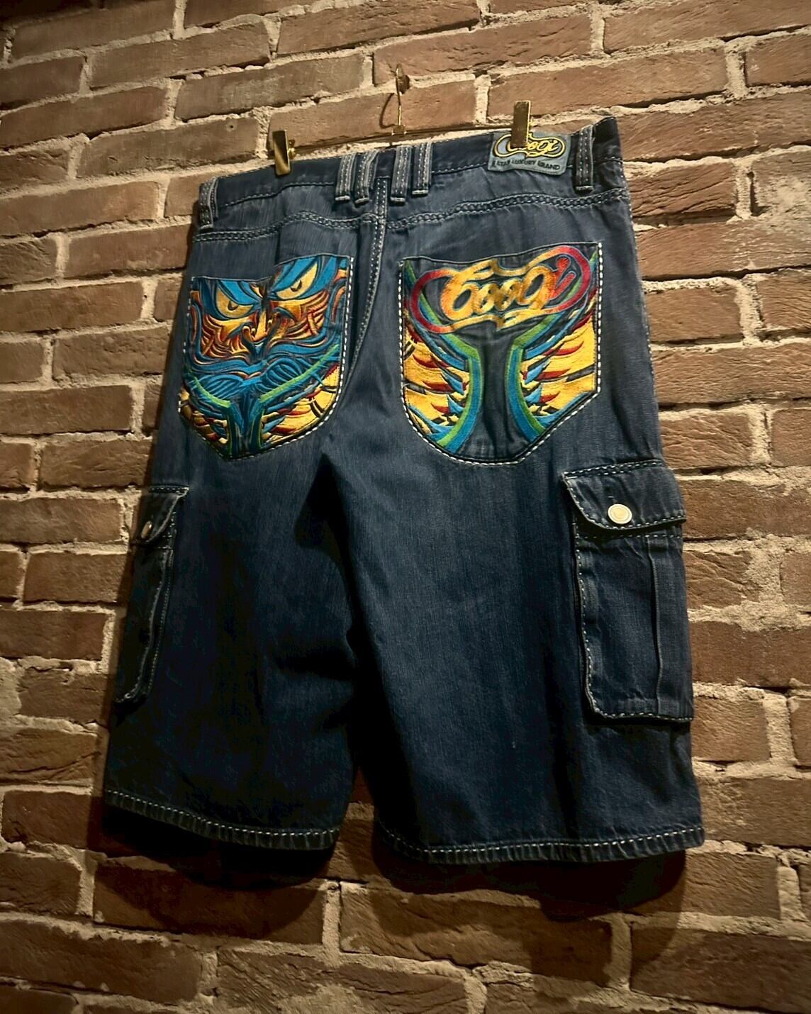フェード感の良いインディゴのデニムに、バックポケットやフロントのポケットにアーティスティックかつ迫力のある刺繍を施した逸品。