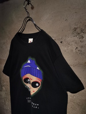 ブラックボディのフロントに、煙草を吸うエイリアンのプリントを載せたTシャツ。