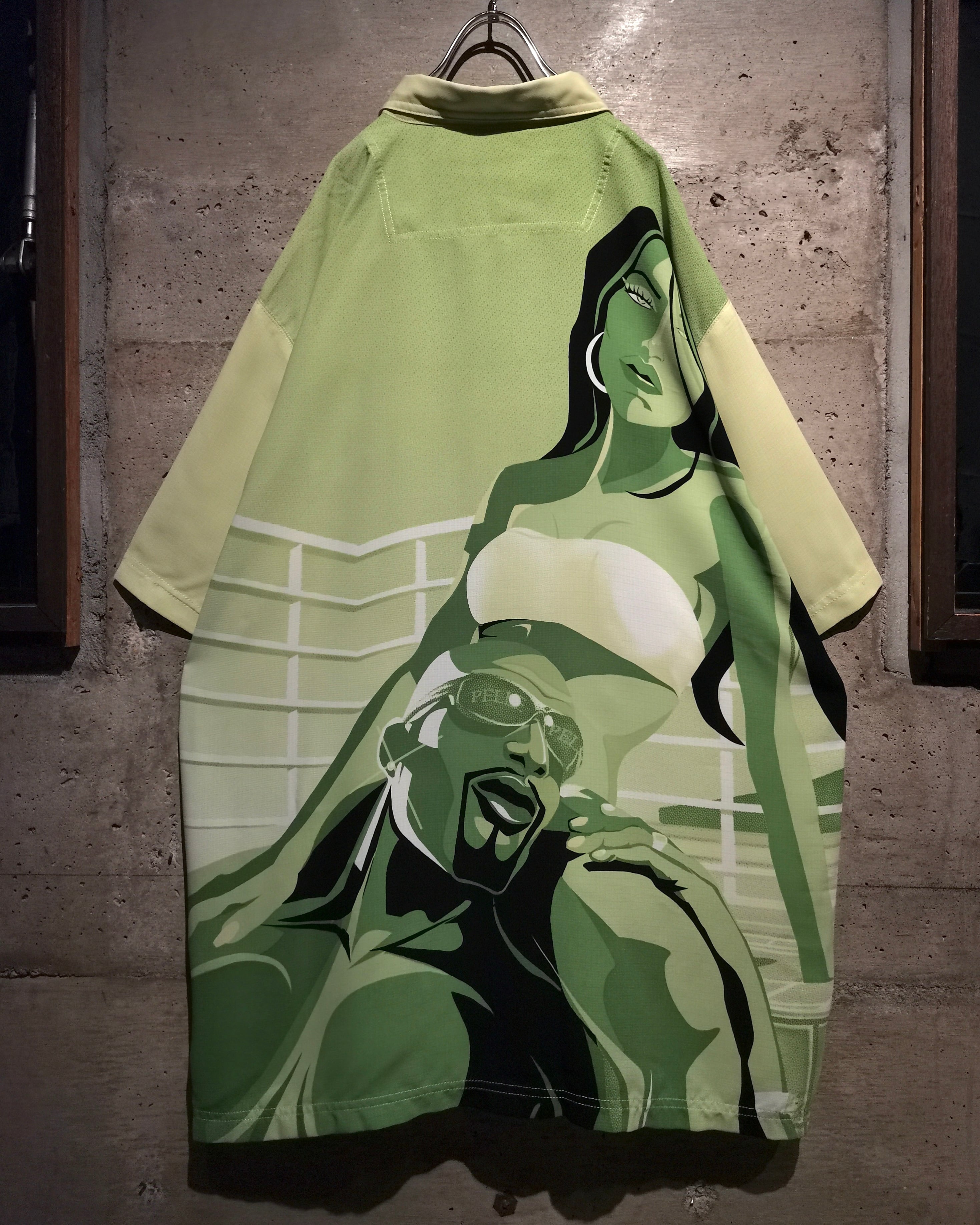 ライトグリーンをベースとしたカラーリングで、THUGな雰囲気を感じさせる男女のグラフィックを載せた1着。