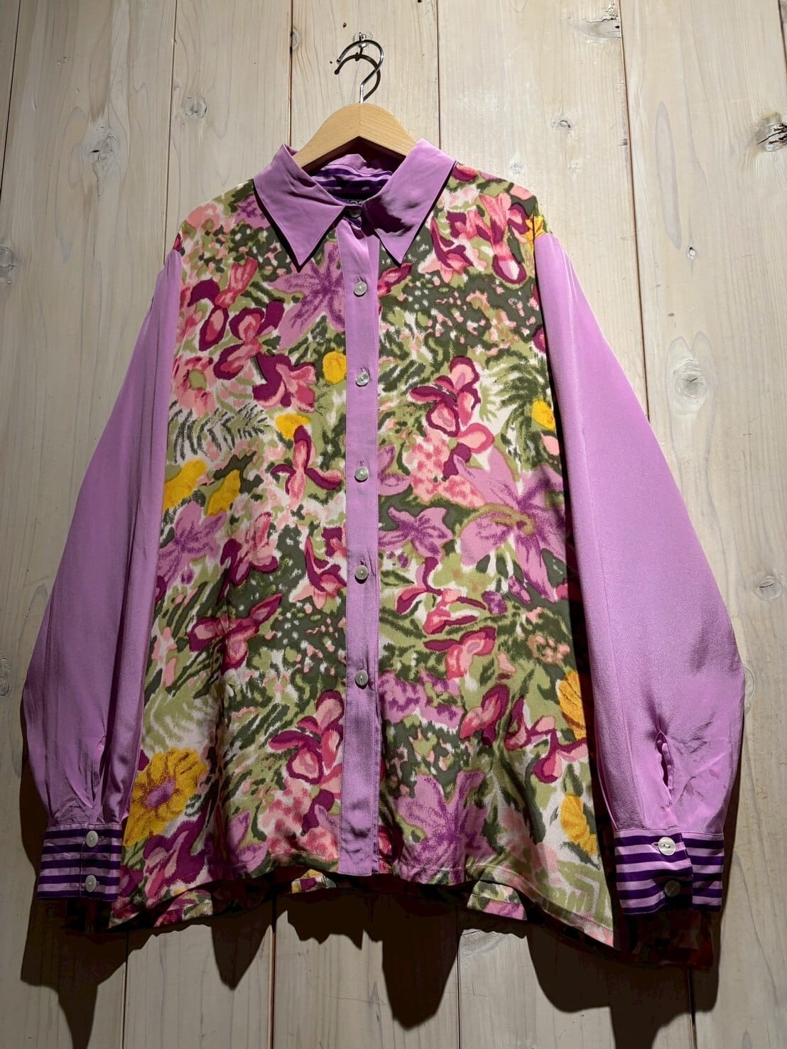 ハリ、光沢のある上質なシルクを用いたボディに、アーティスティックな花柄を載せた長袖シャツ。
