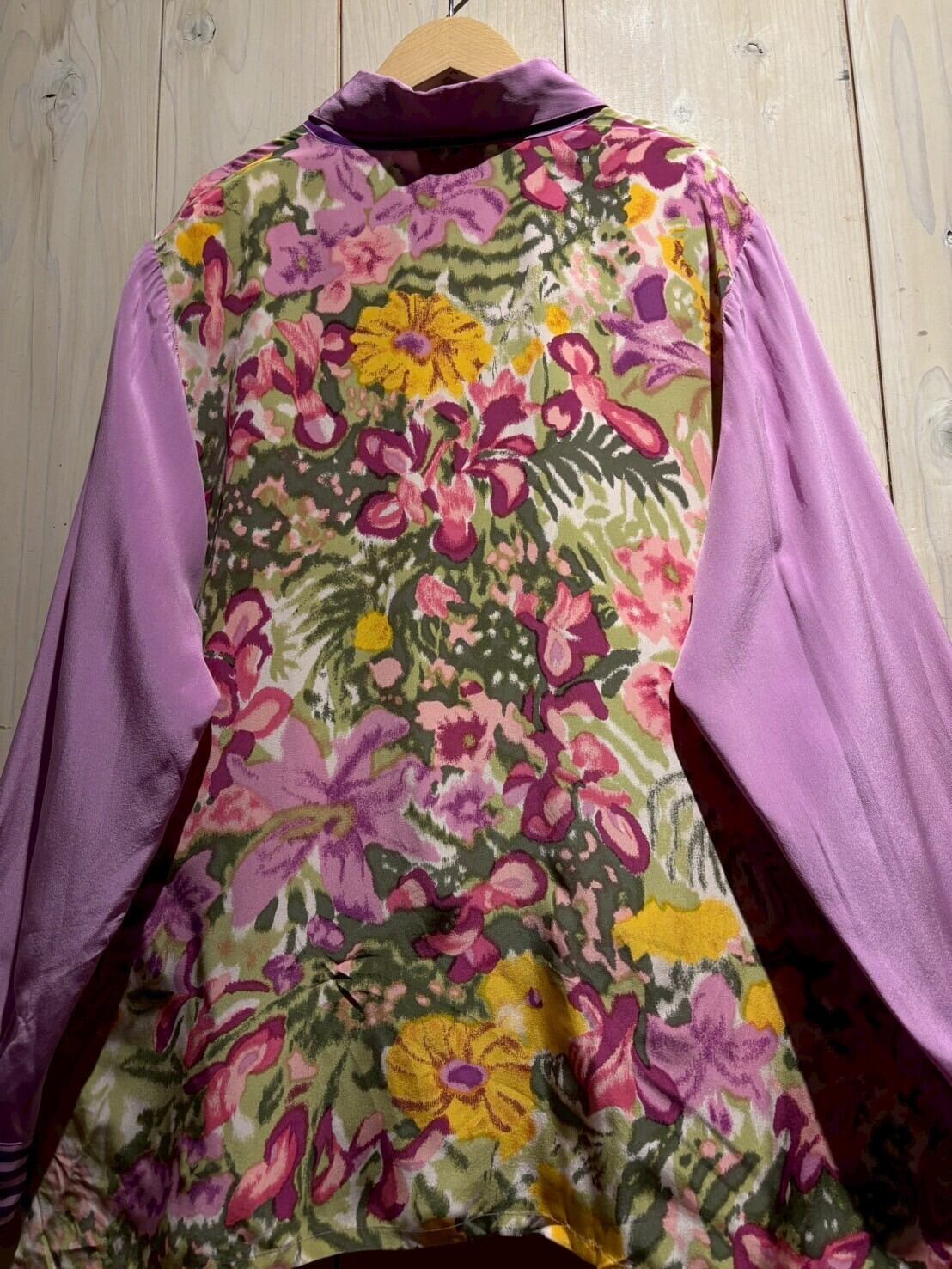 シルク本来の艶、上品花のデザインがマッチして高級感を漂わせています。フロントのシェルボタンのアクセントも◎