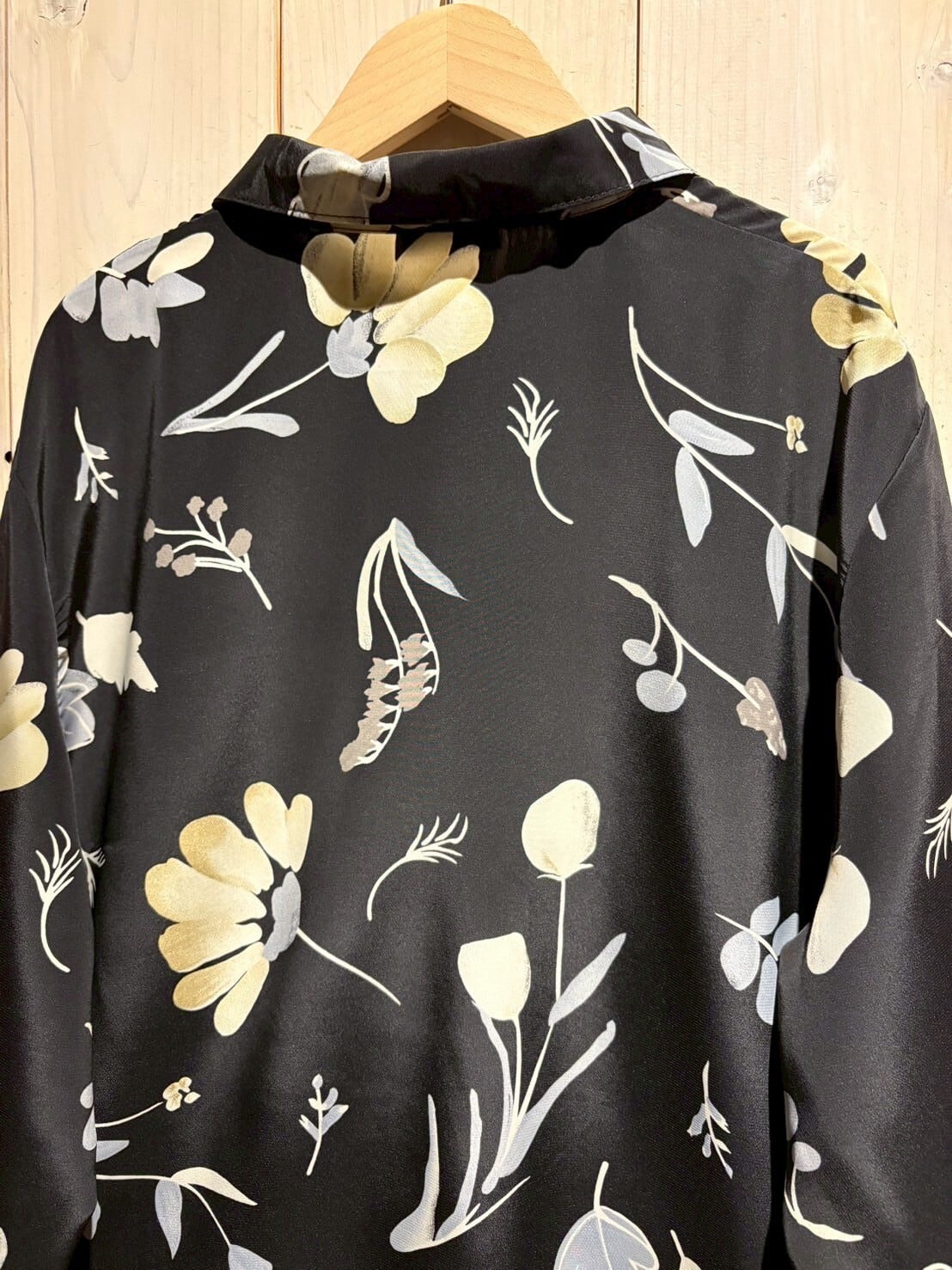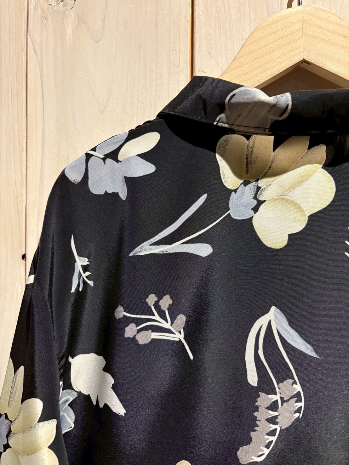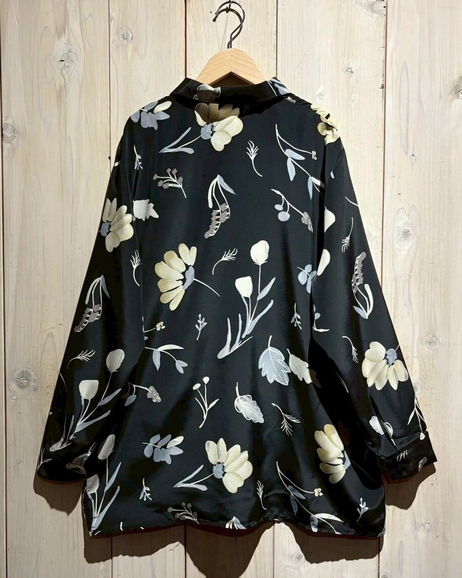 ブラックのボディをベースに、花柄をボディ全体に載せた長袖シャツ。