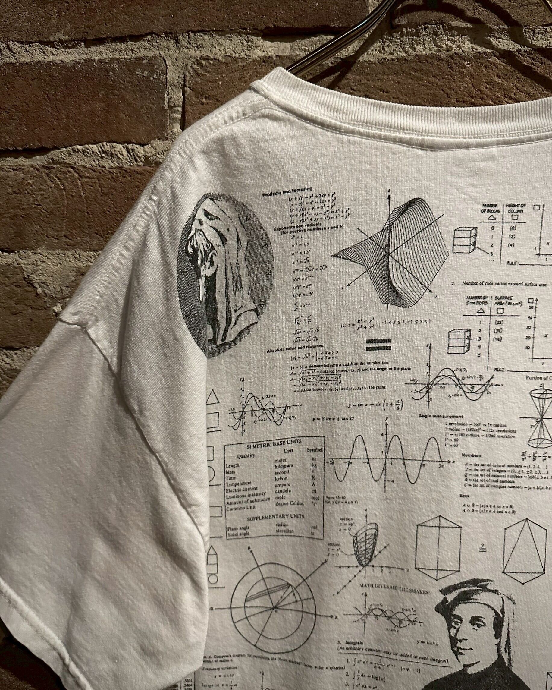 ホワイトのTシャツに、数式や図形、グラフなどがみっちりと所狭しに載せられたTシャツ。
