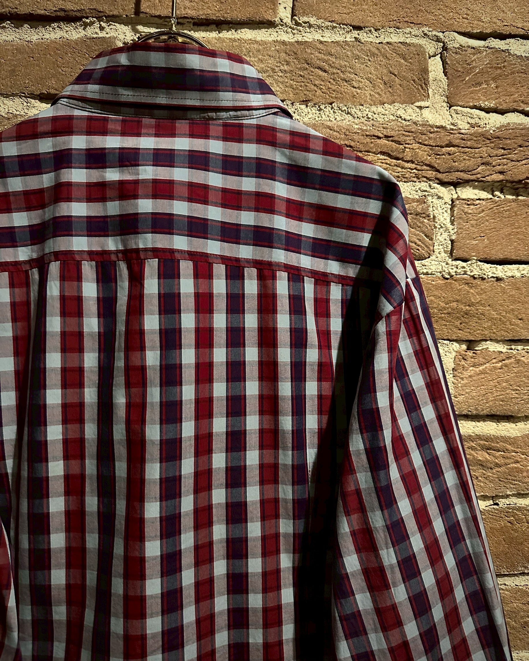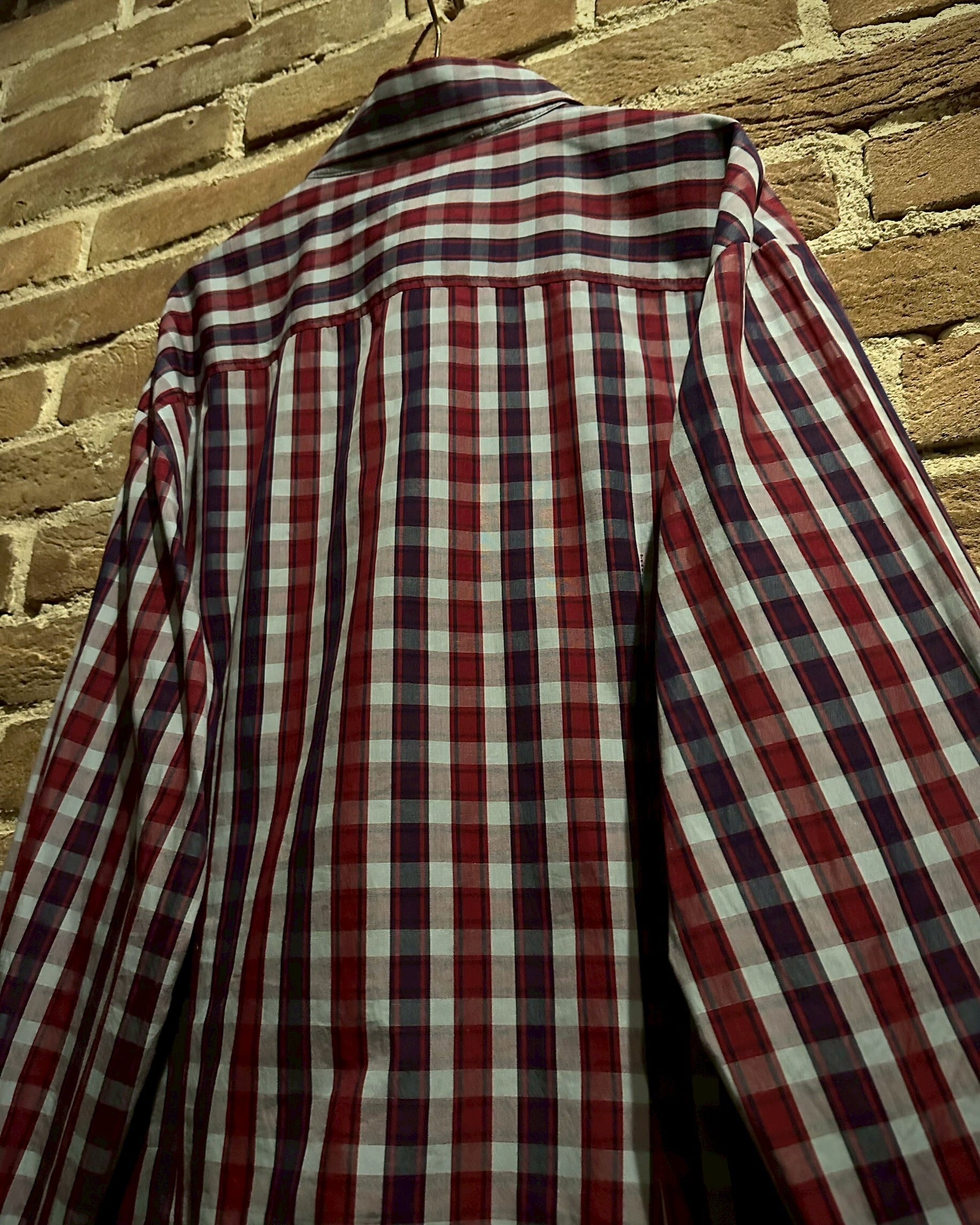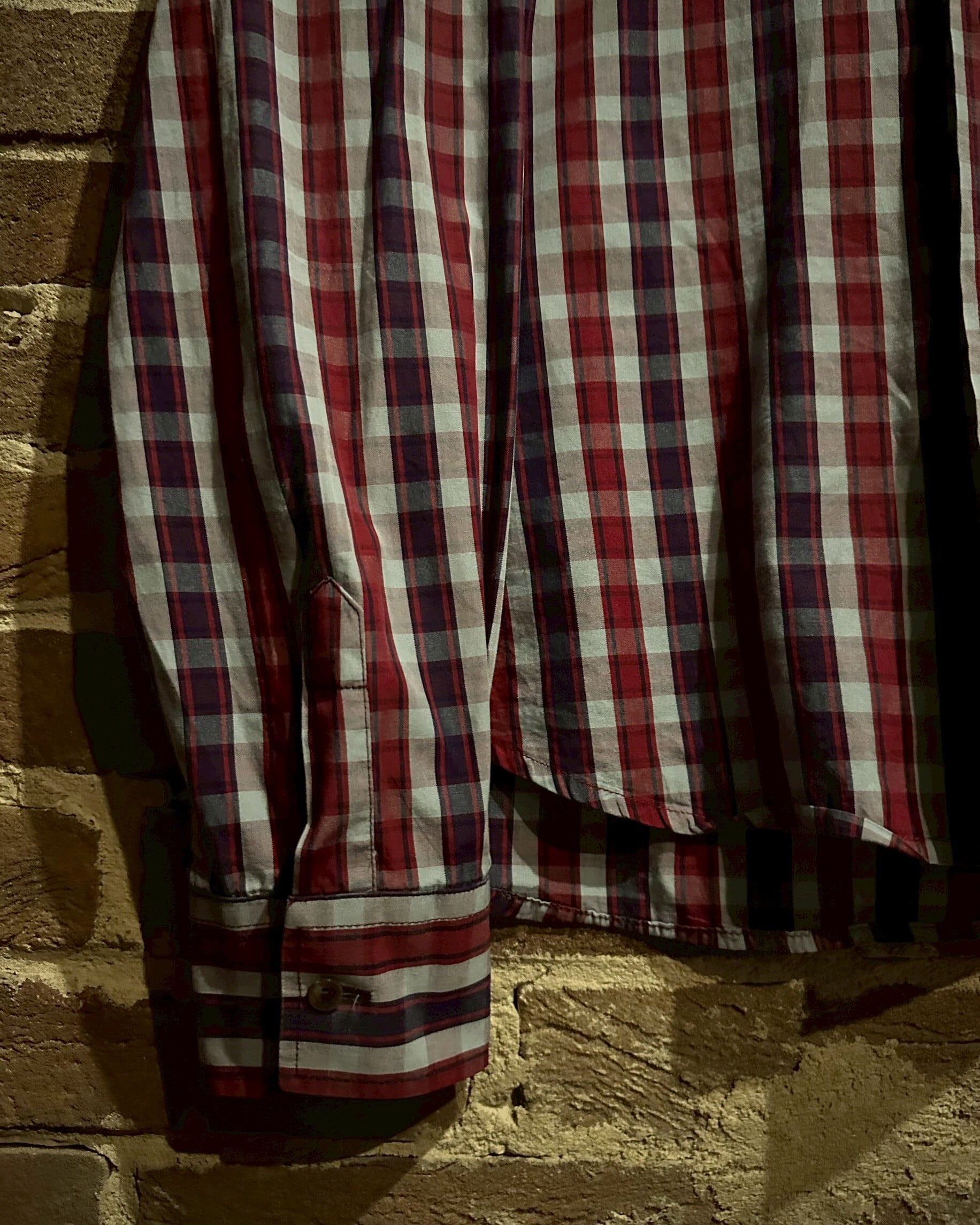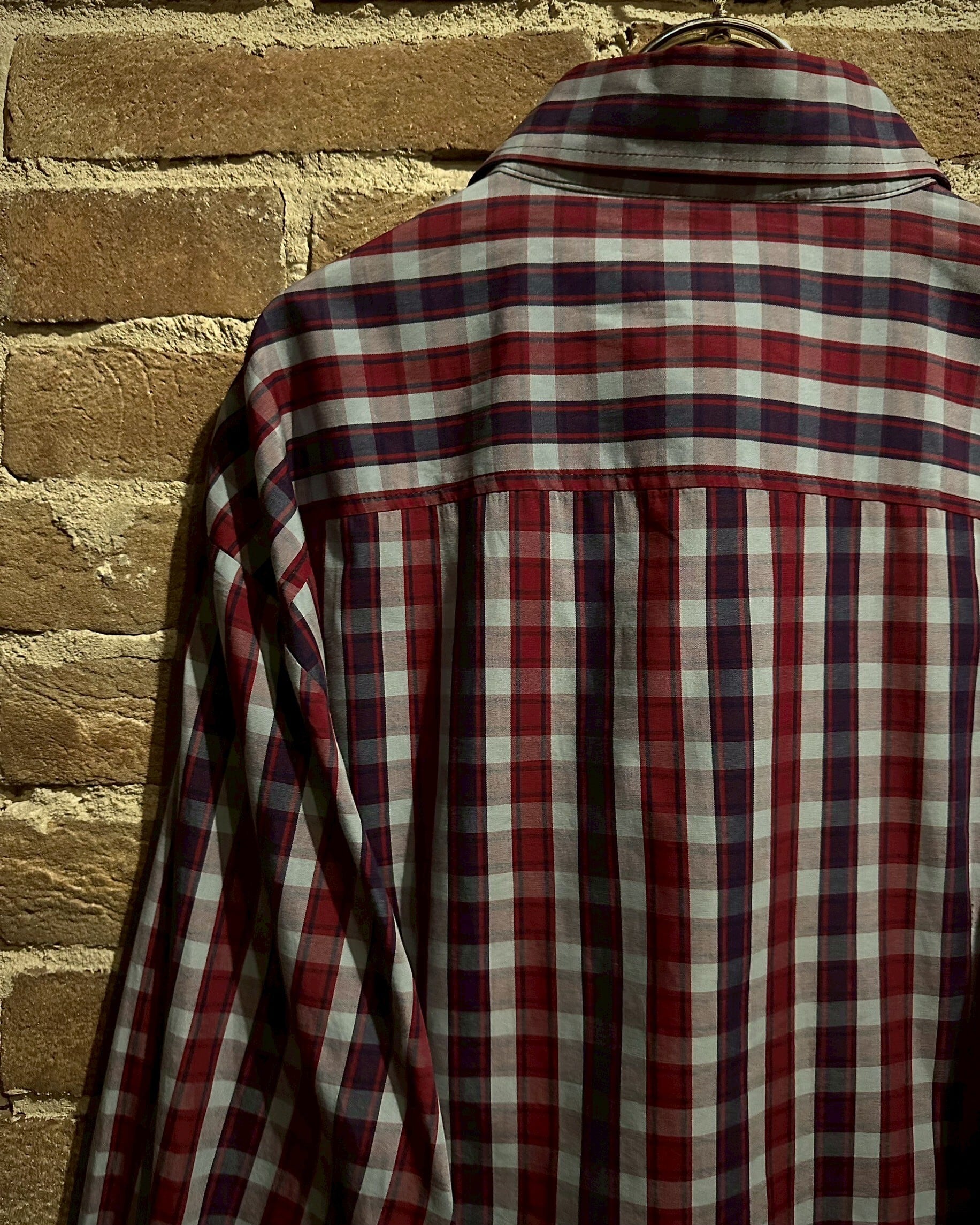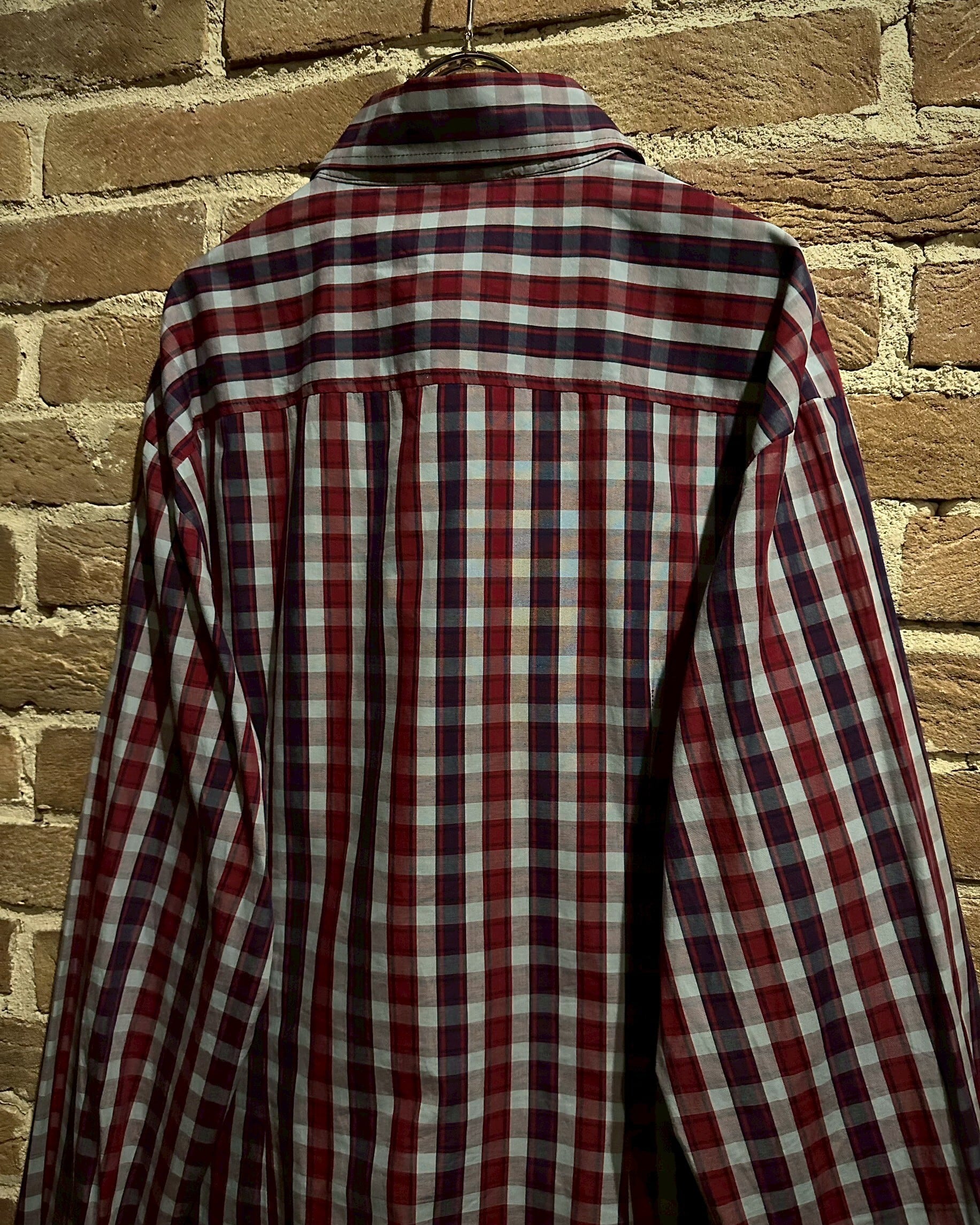 赤やライトブルーをベースとしたチェック柄を載せた長袖シャツ。