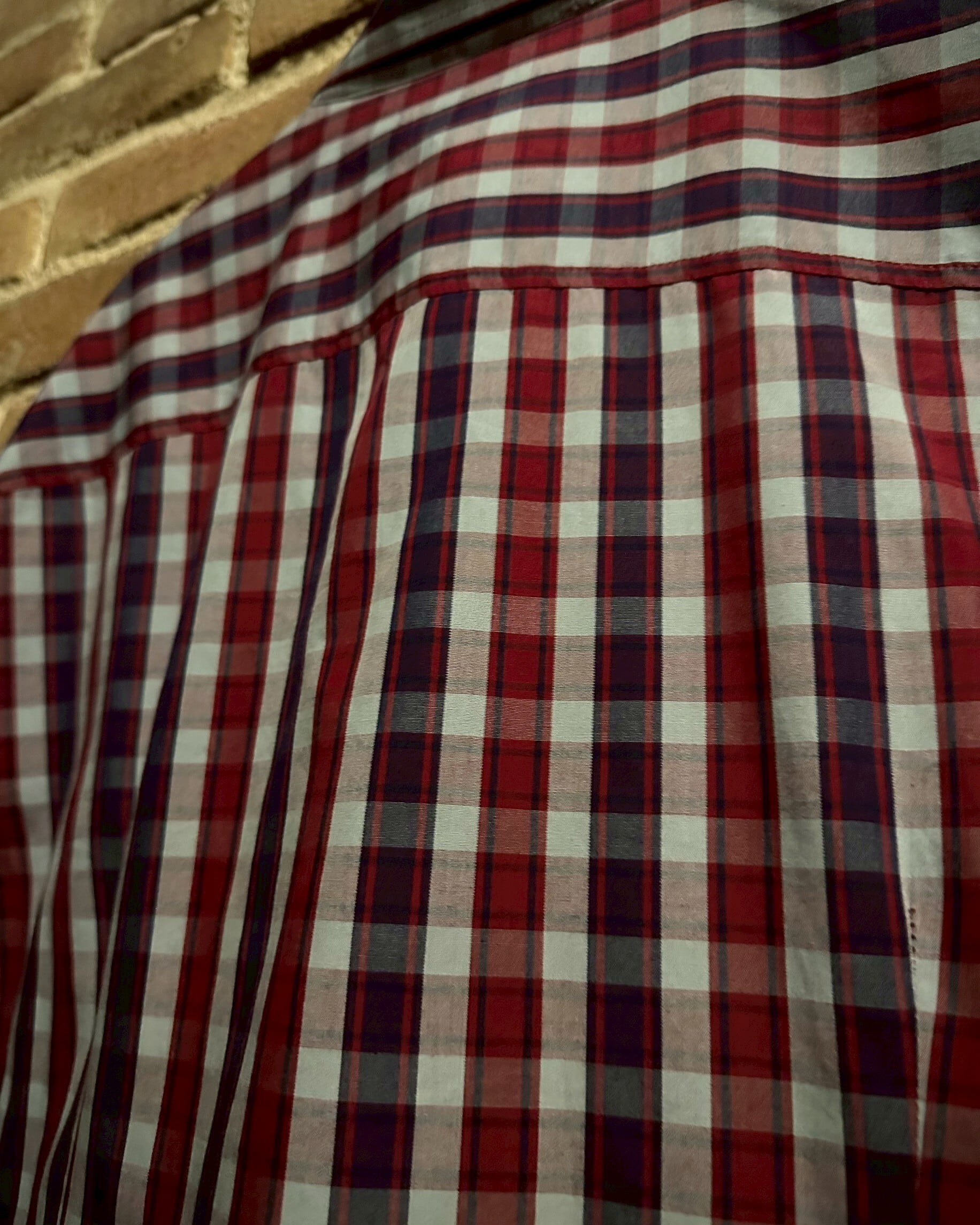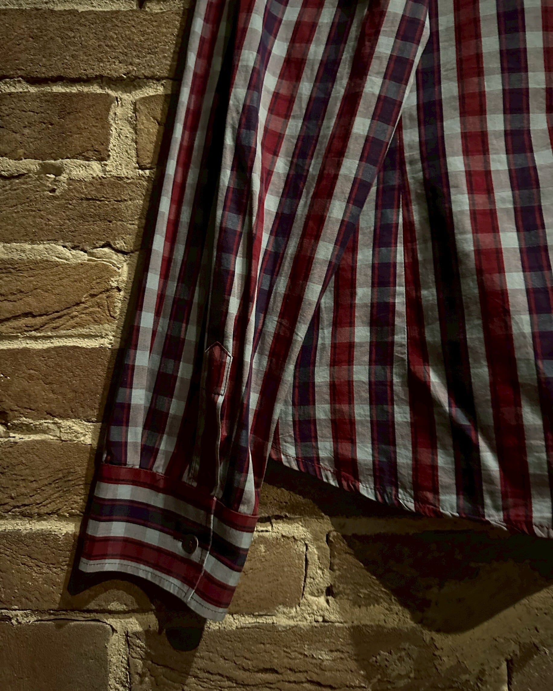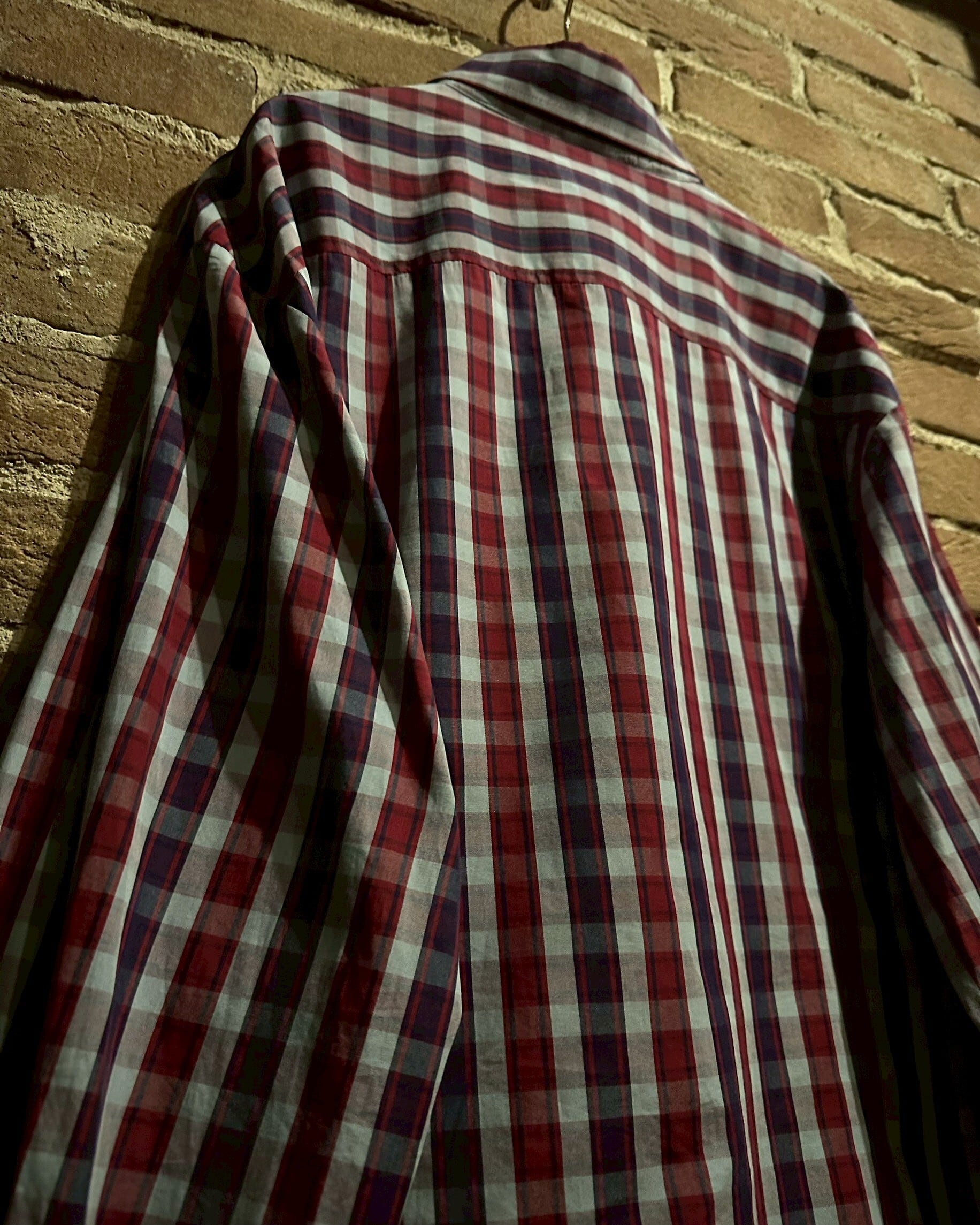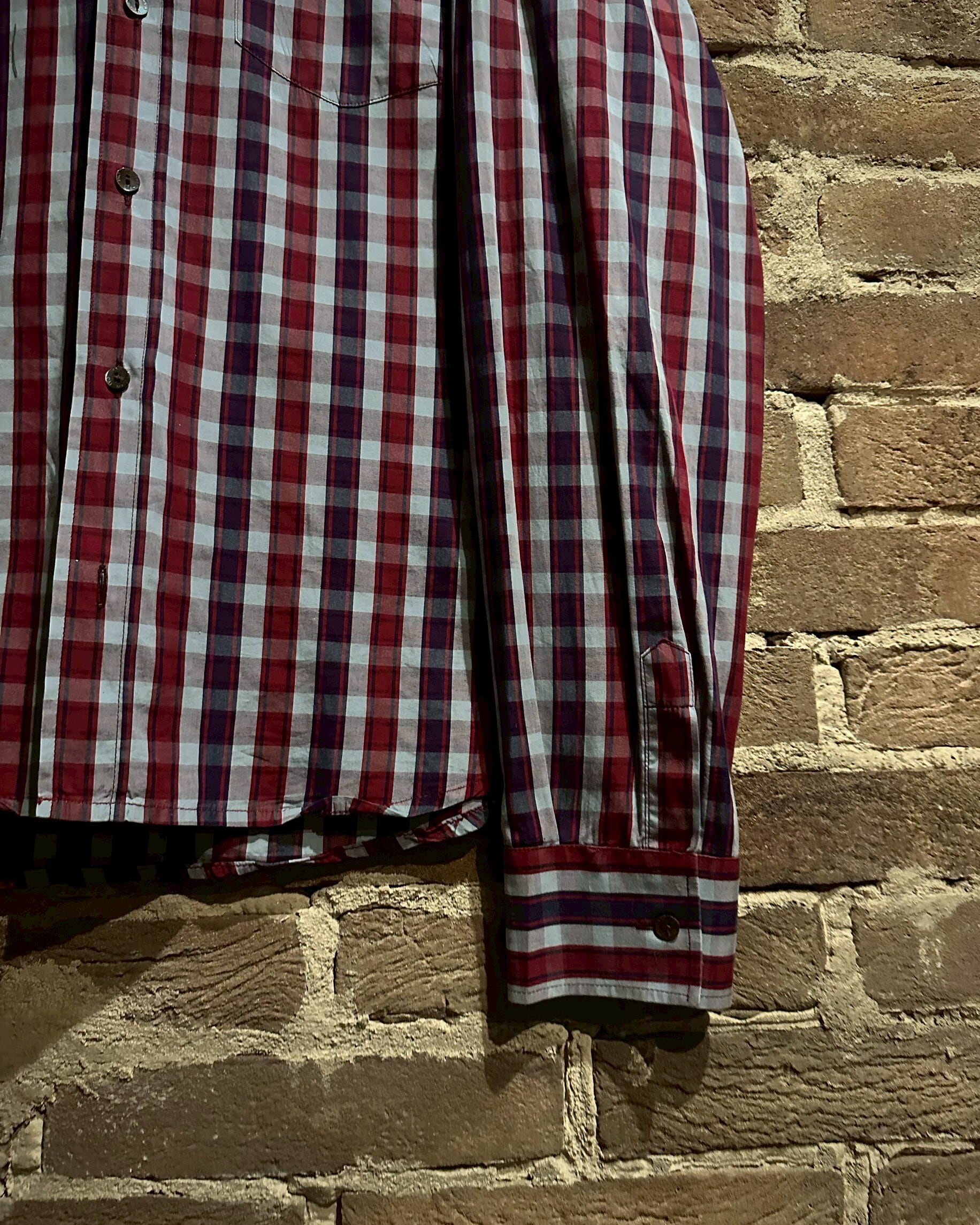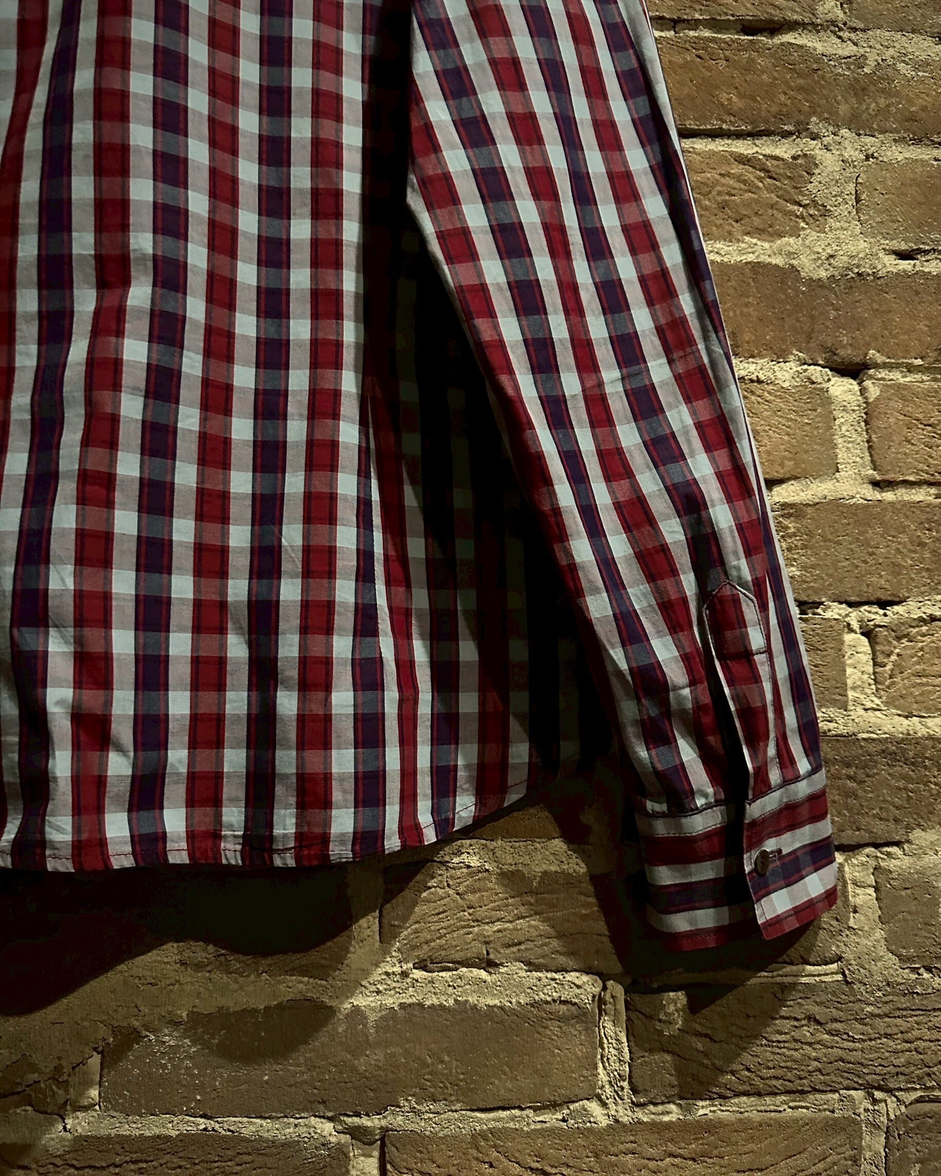 赤やライトブルーをベースとしたチェック柄を載せた長袖シャツ。