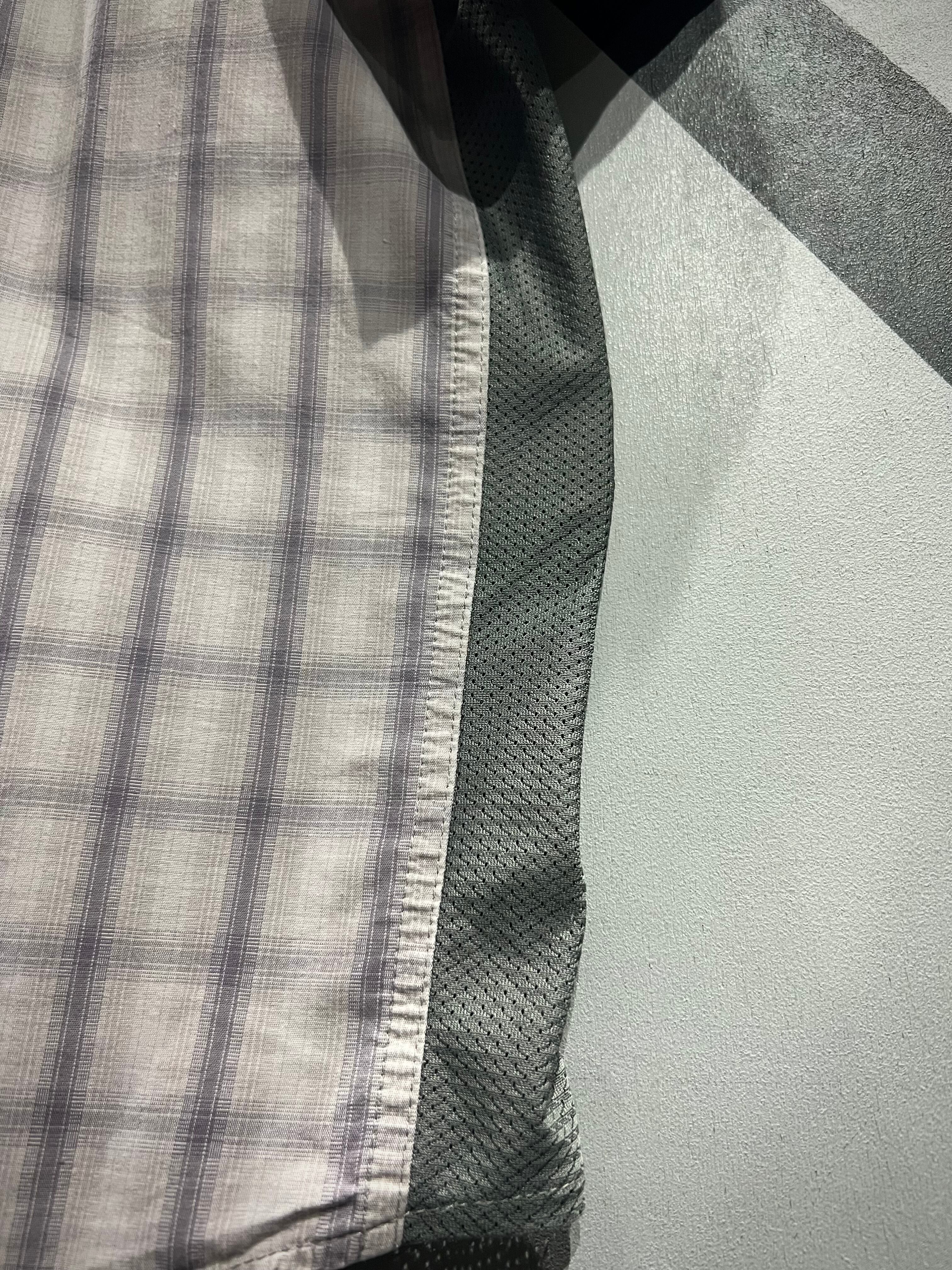 チェック柄のボディに、肩のアクションプリーツ、ボディサイドにメッシュを切り替えた1着。