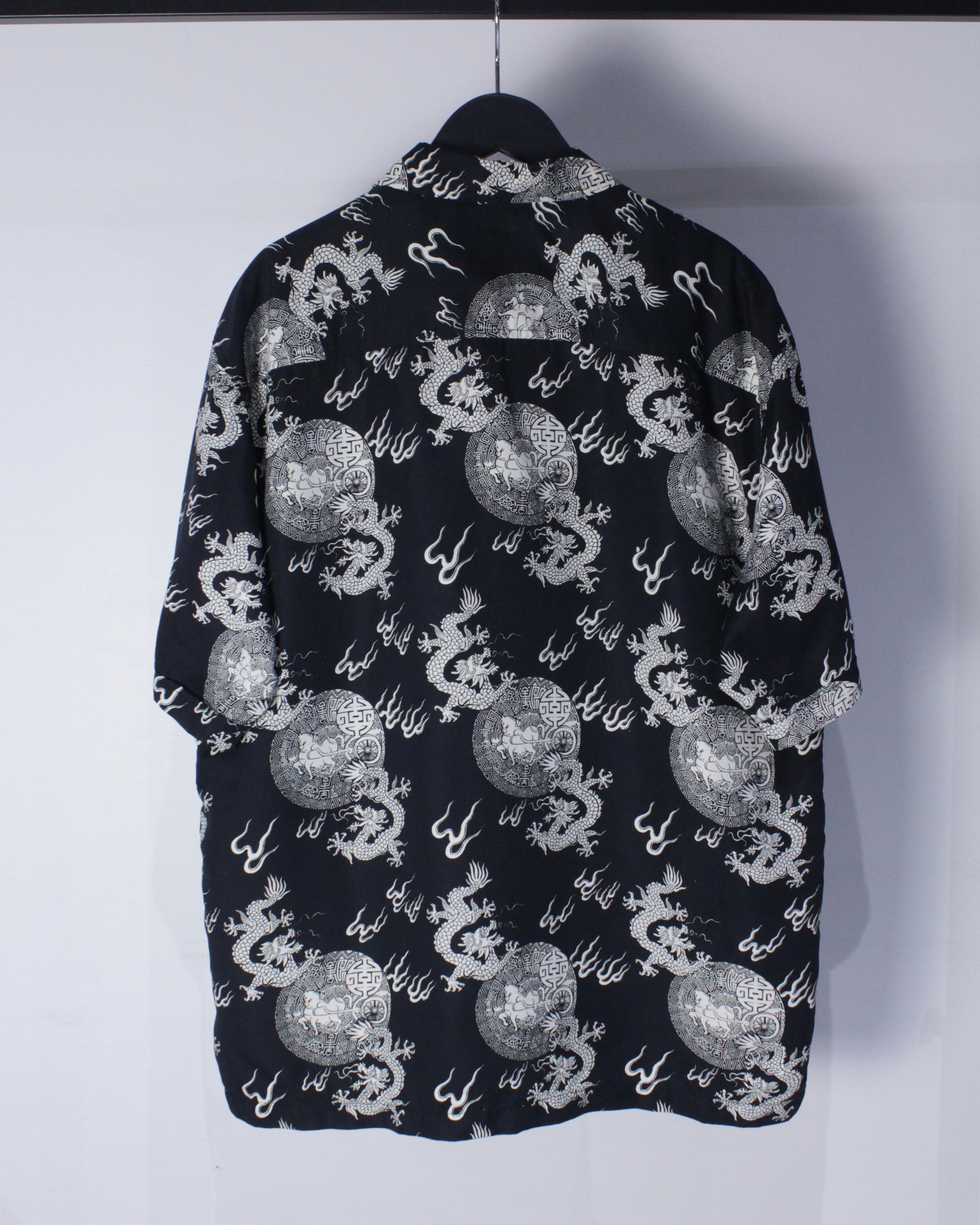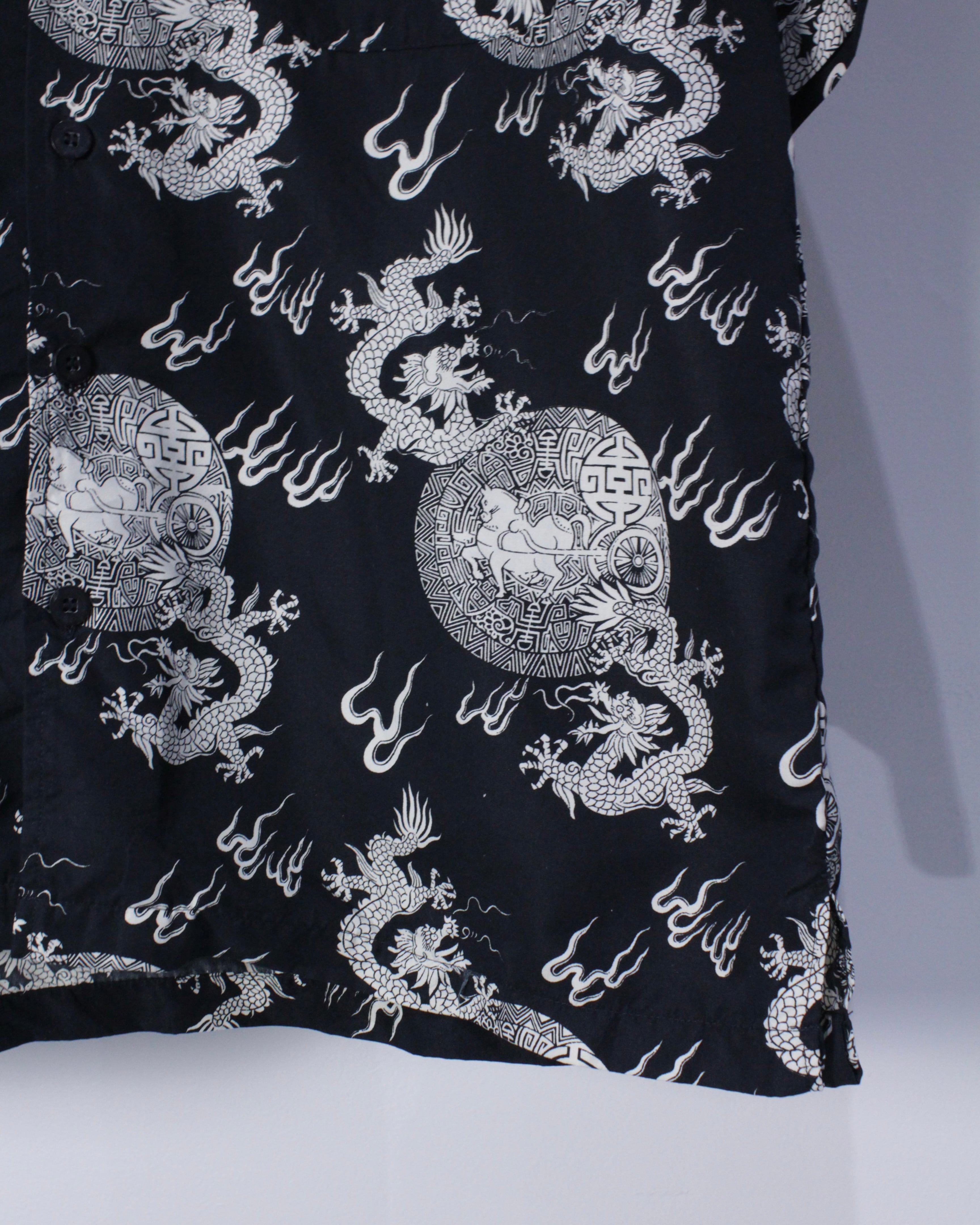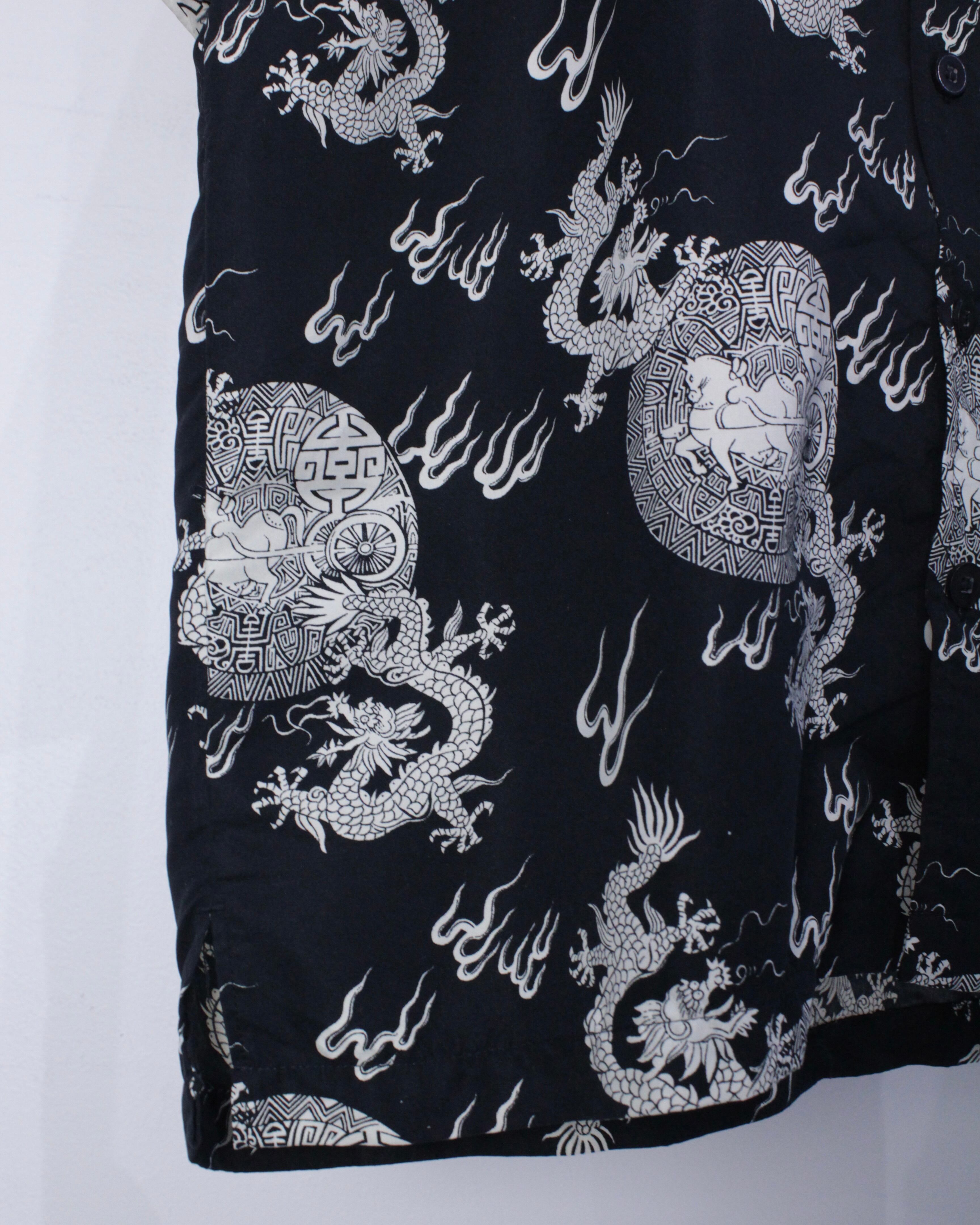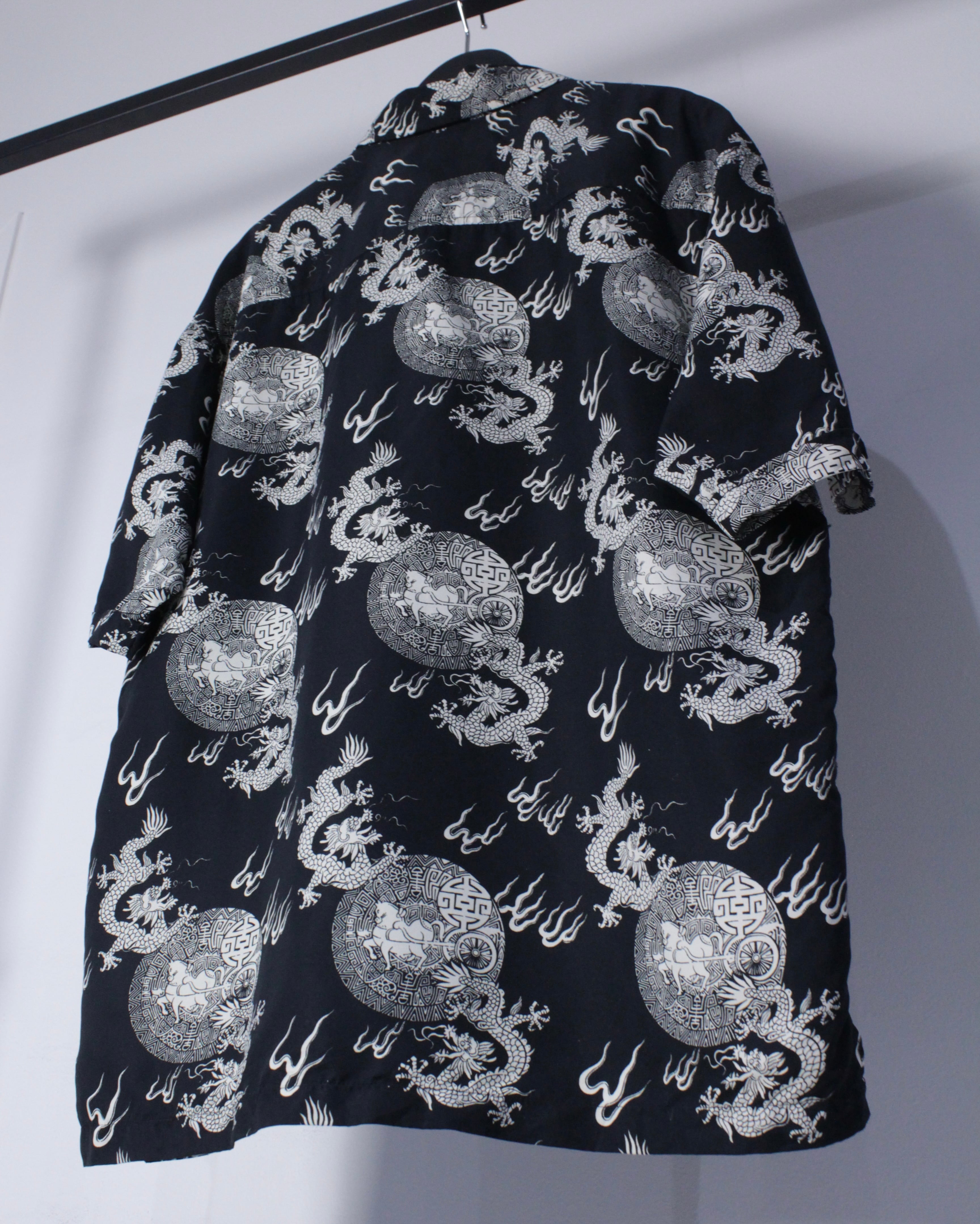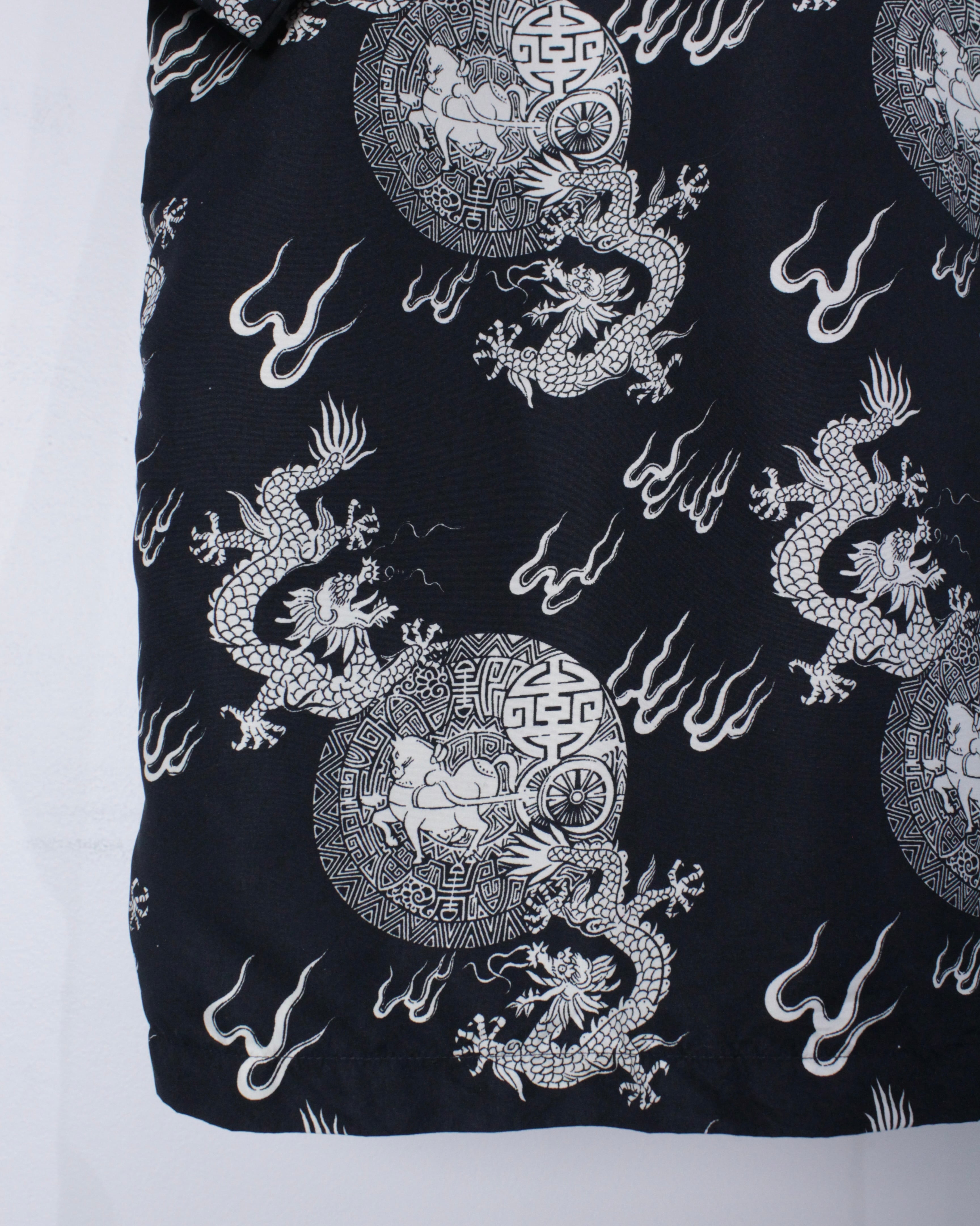 サラッとしたブラックのポリエステルボディをベースに、白のカラーで全面にチャイナ調の雰囲気を感じるドラゴンのデザインを施した半袖シャツ。
