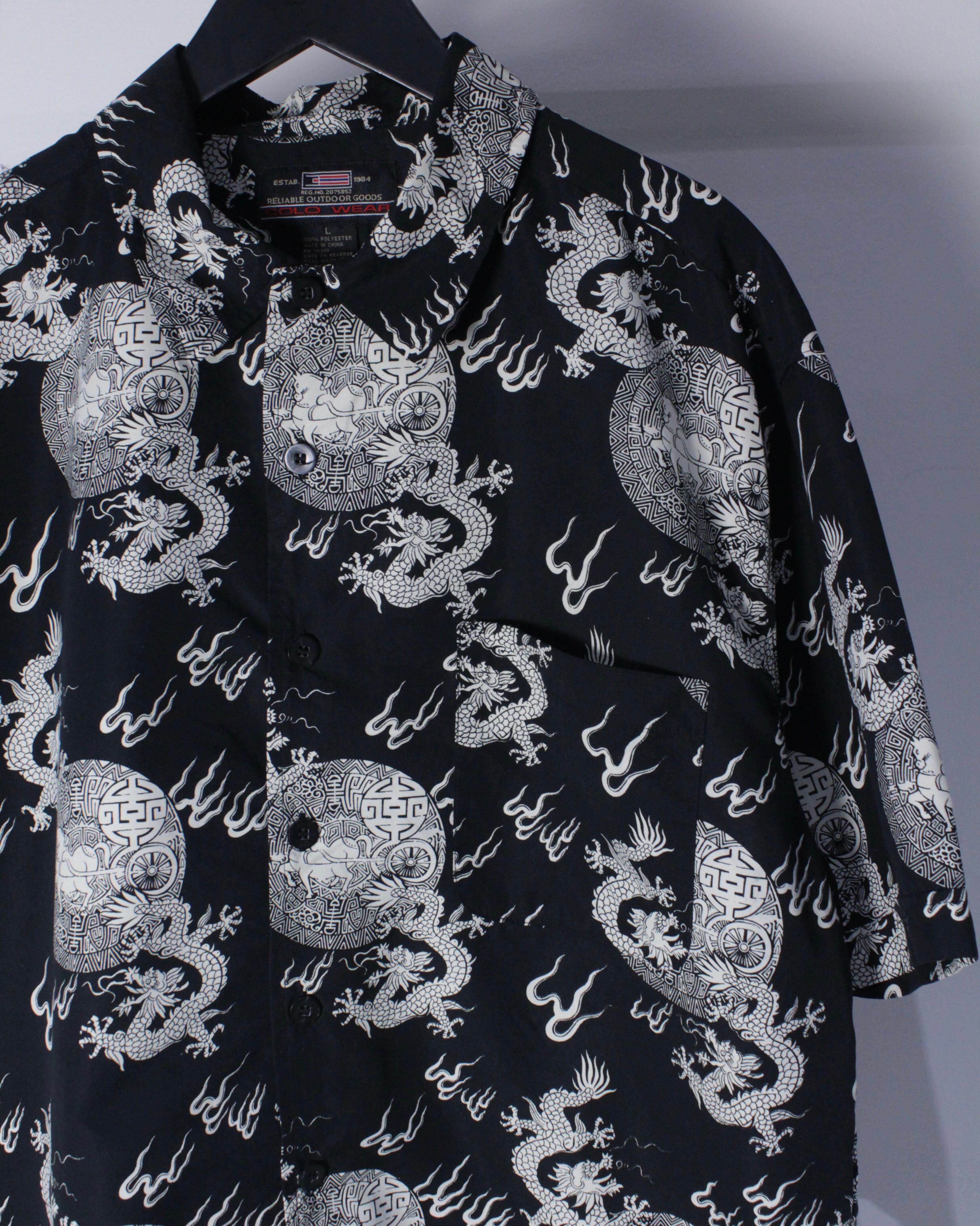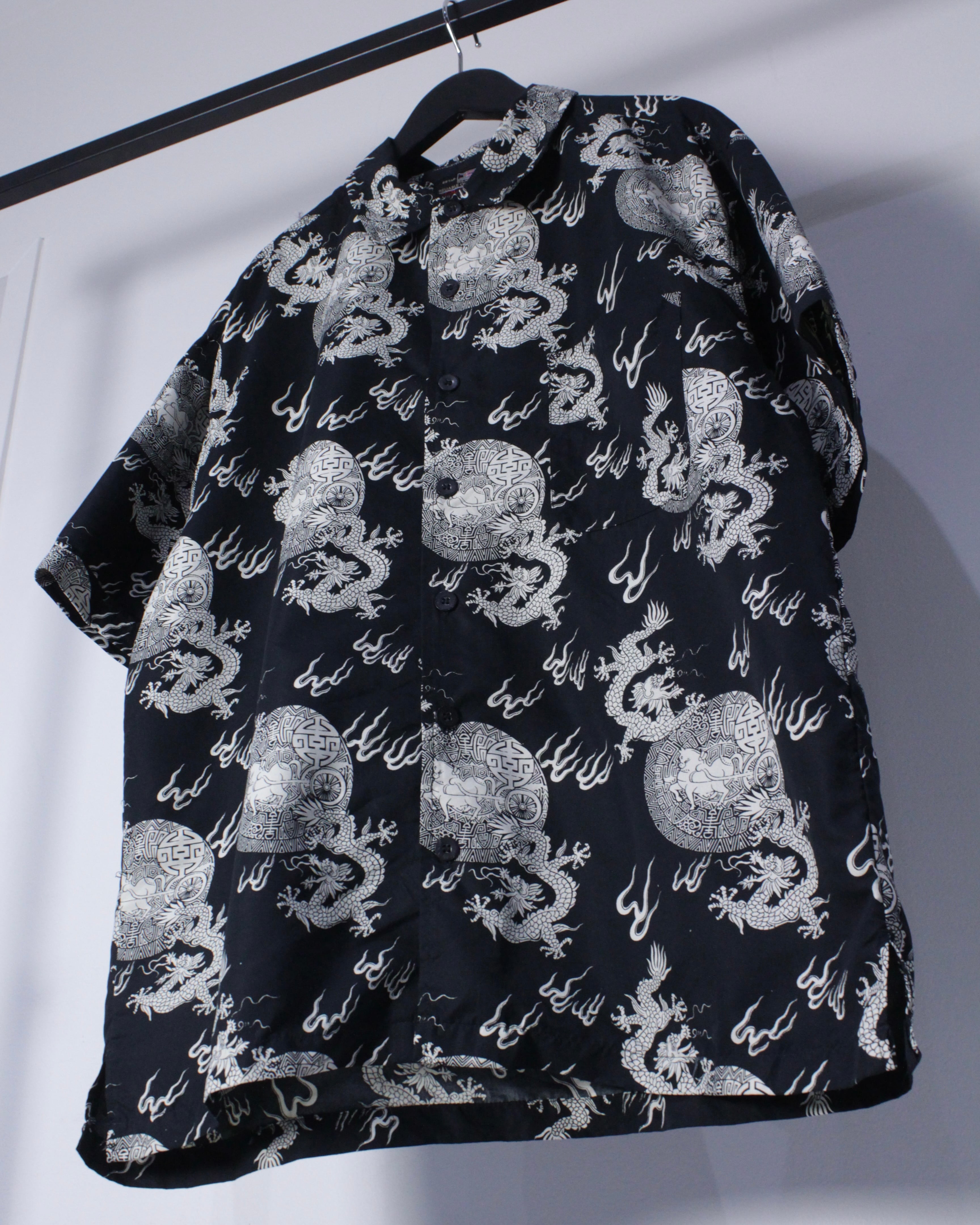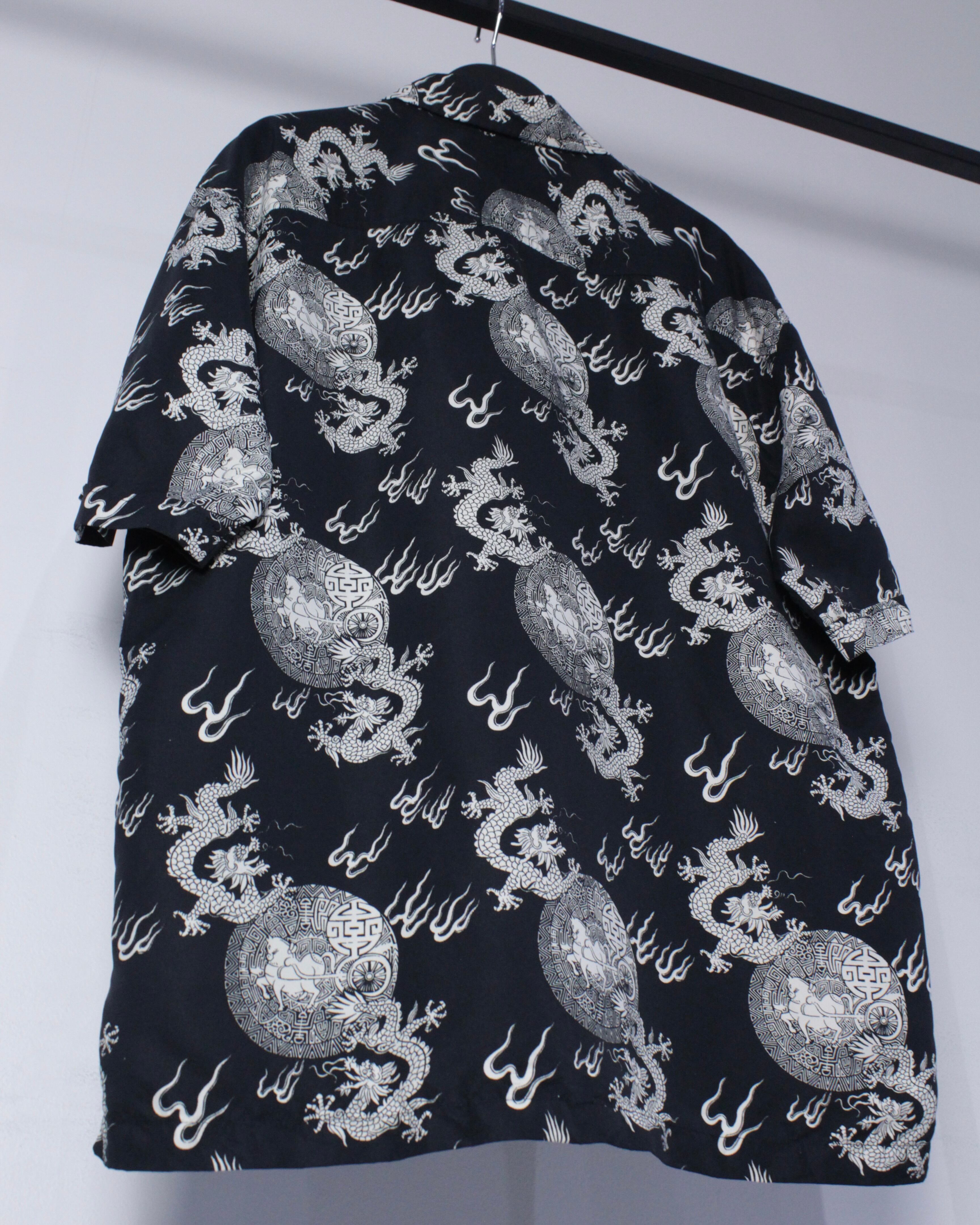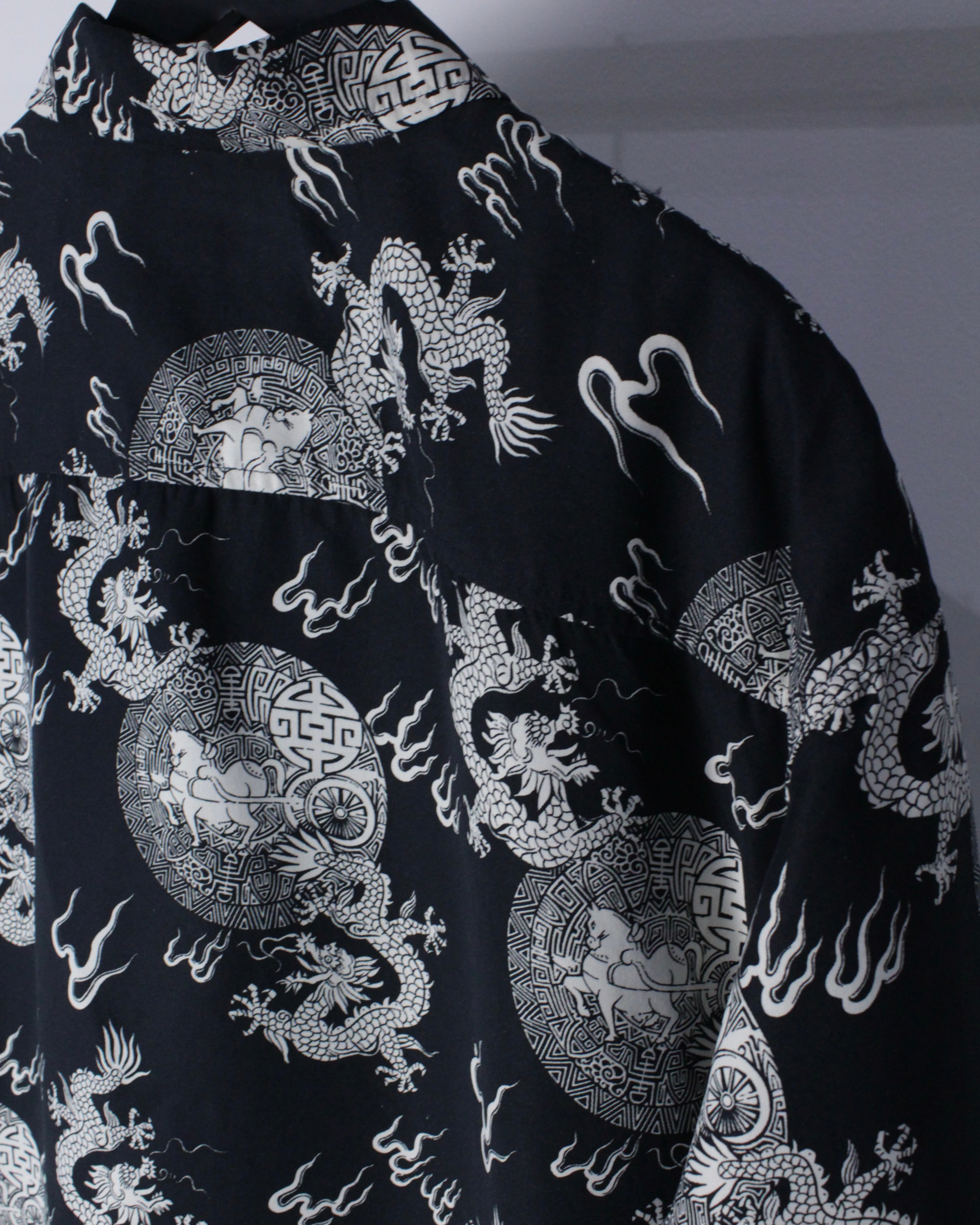 サラッとしたブラックのポリエステルボディをベースに、白のカラーで全面にチャイナ調の雰囲気を感じるドラゴンのデザインを施した半袖シャツ。