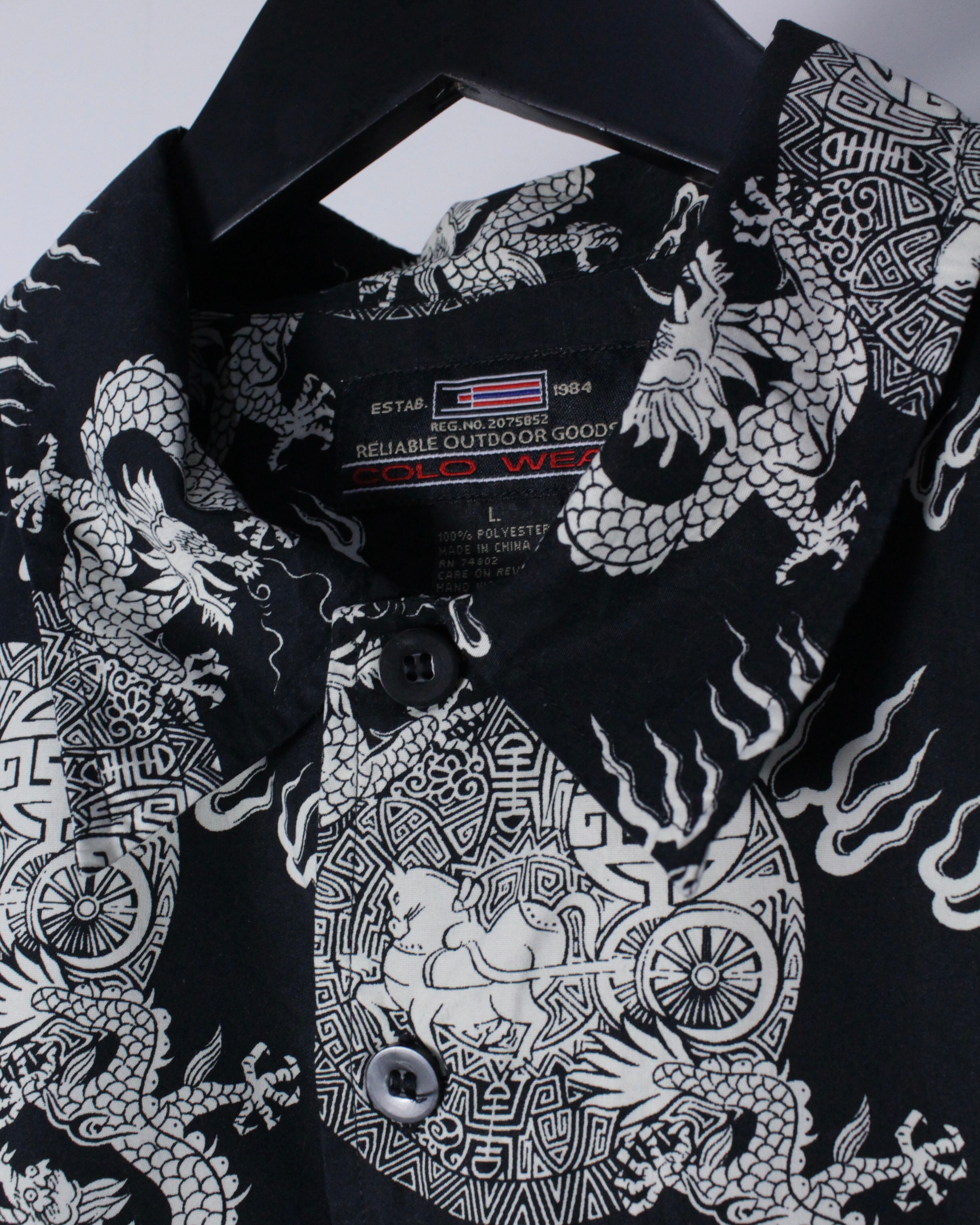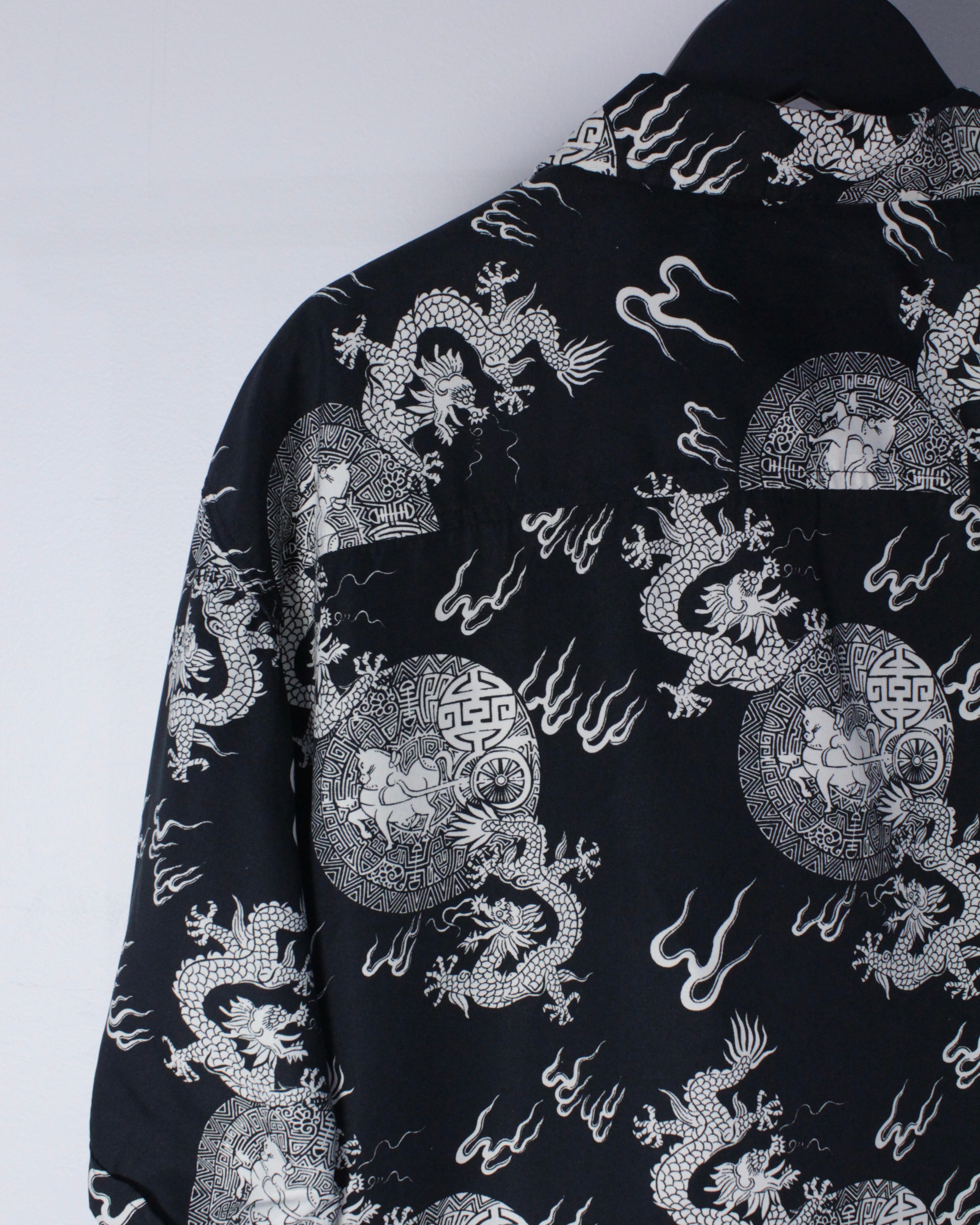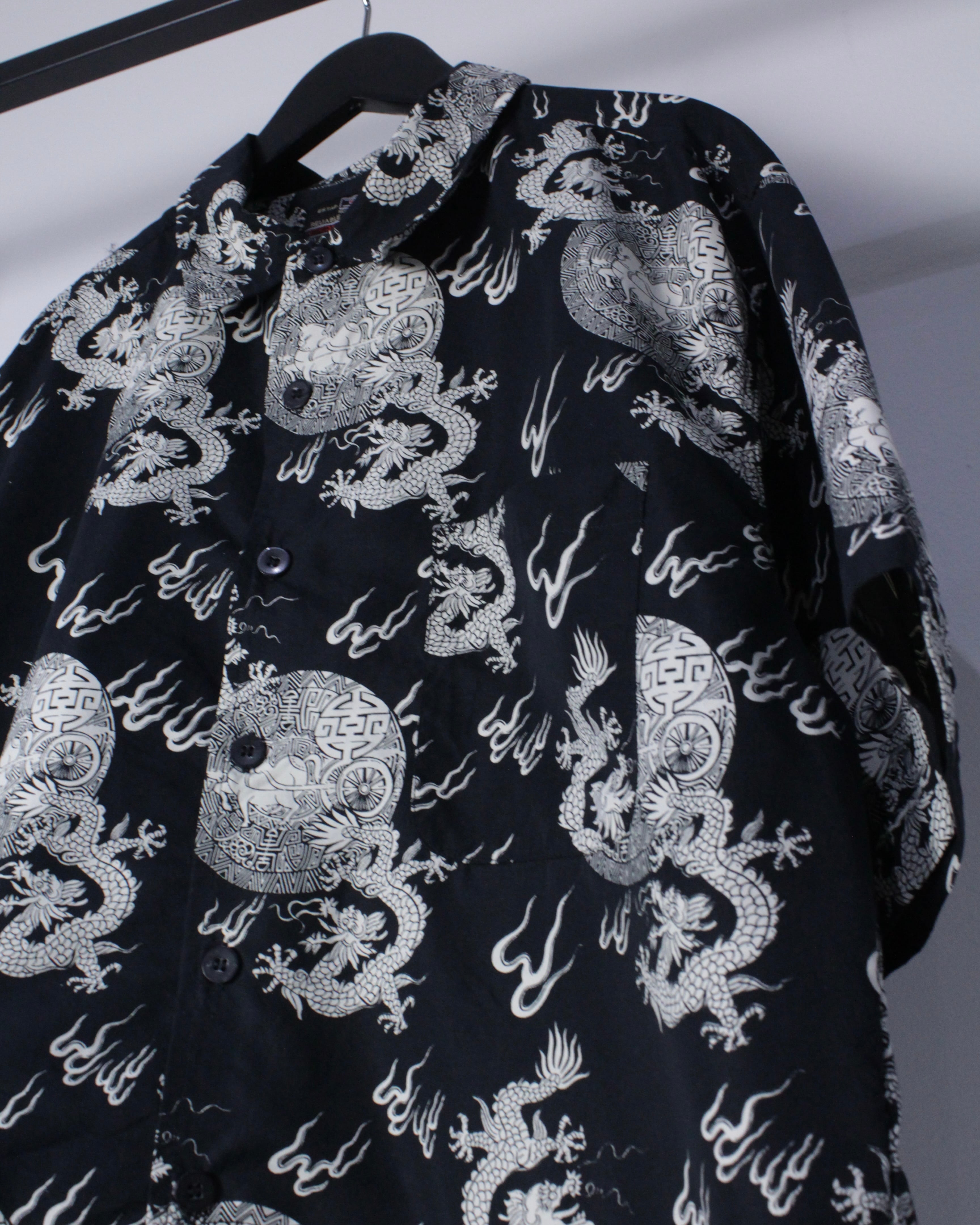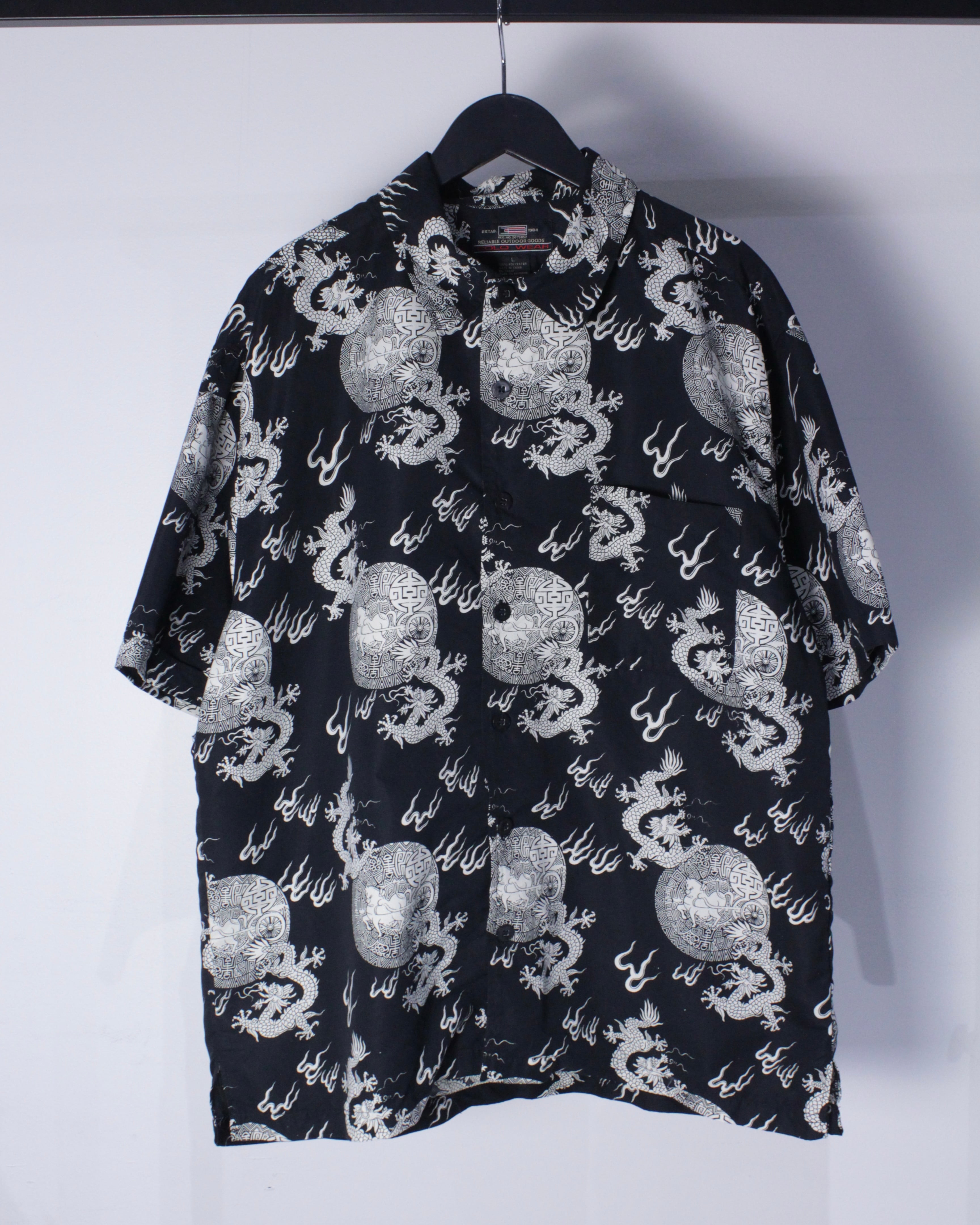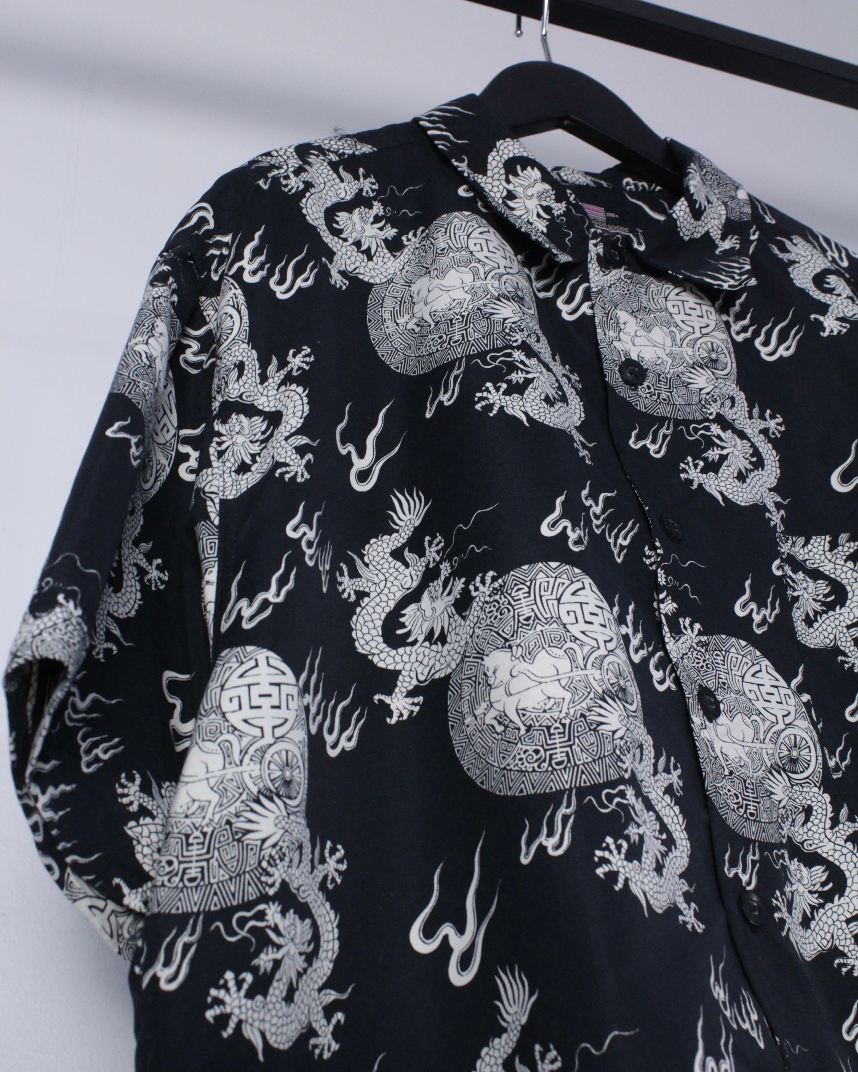 サラッとしたブラックのポリエステルボディをベースに、白のカラーで全面にチャイナ調の雰囲気を感じるドラゴンのデザインを施した半袖シャツ。