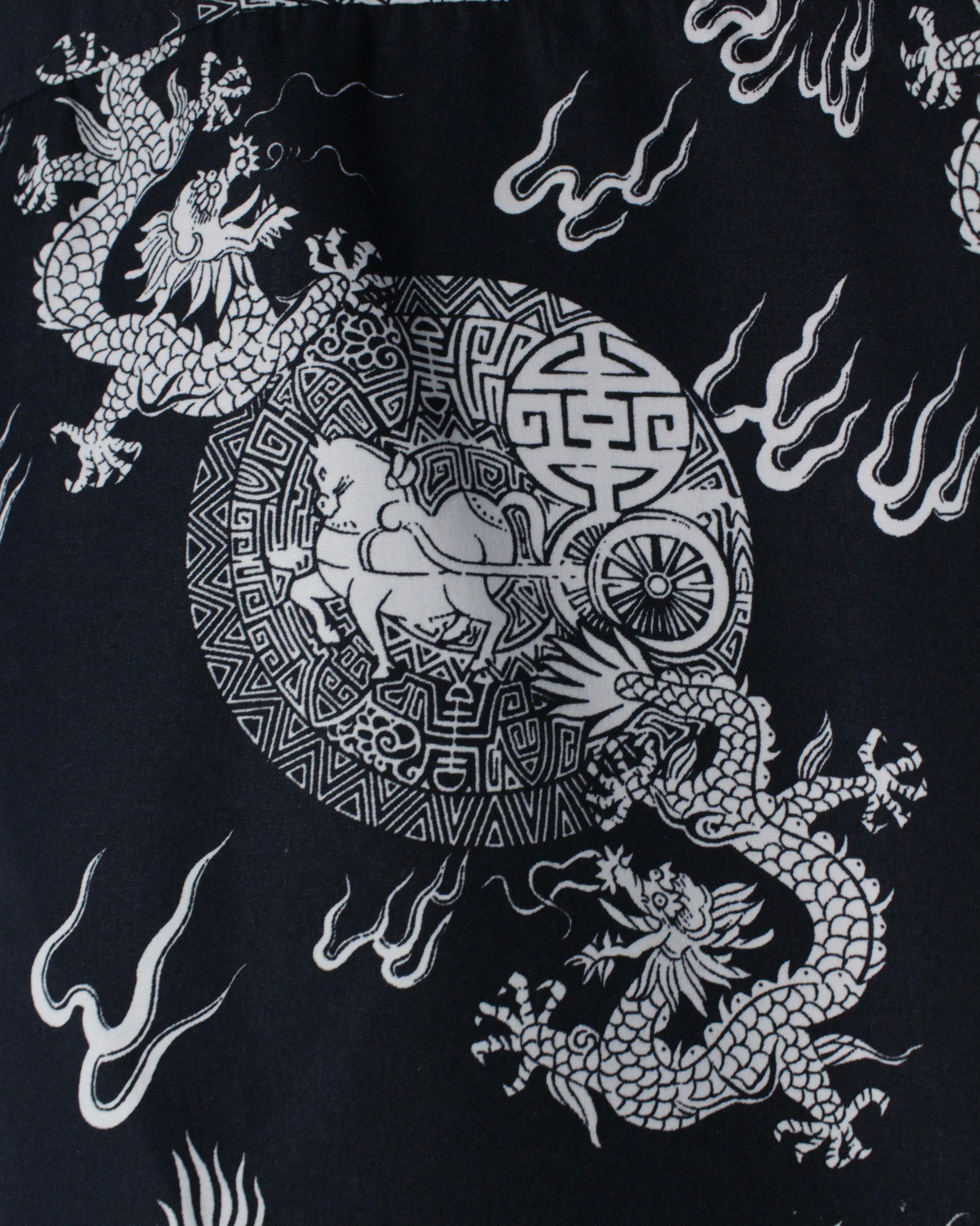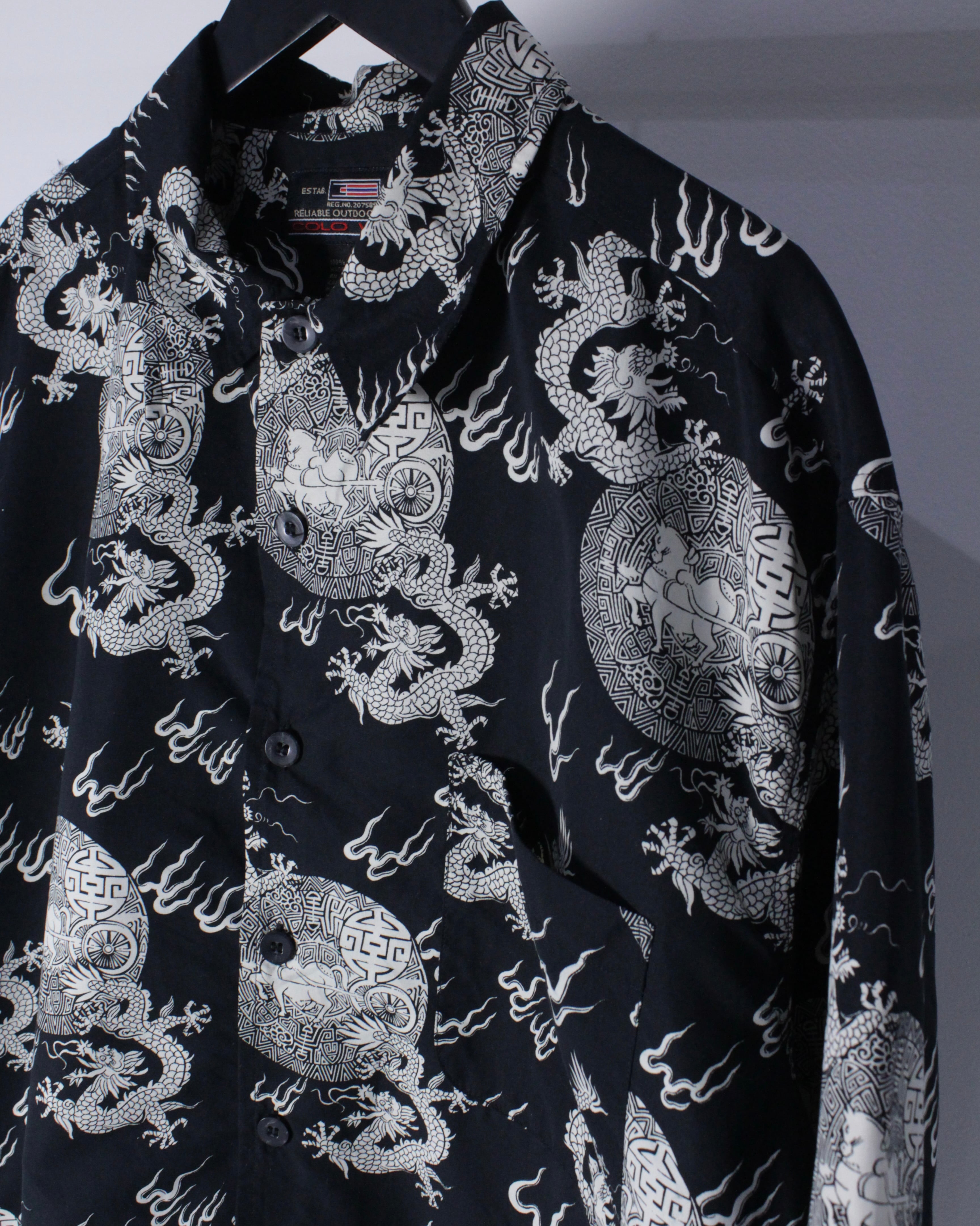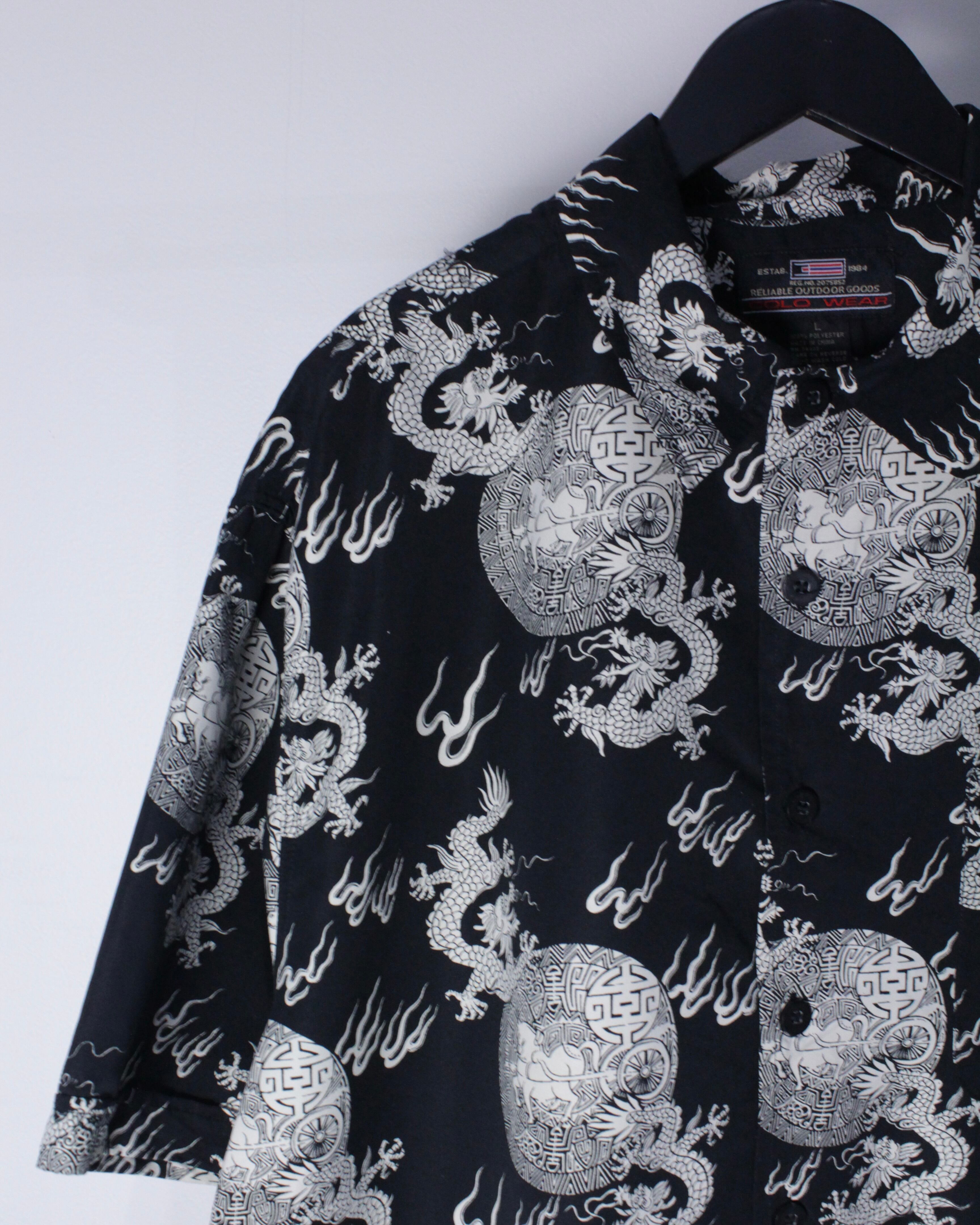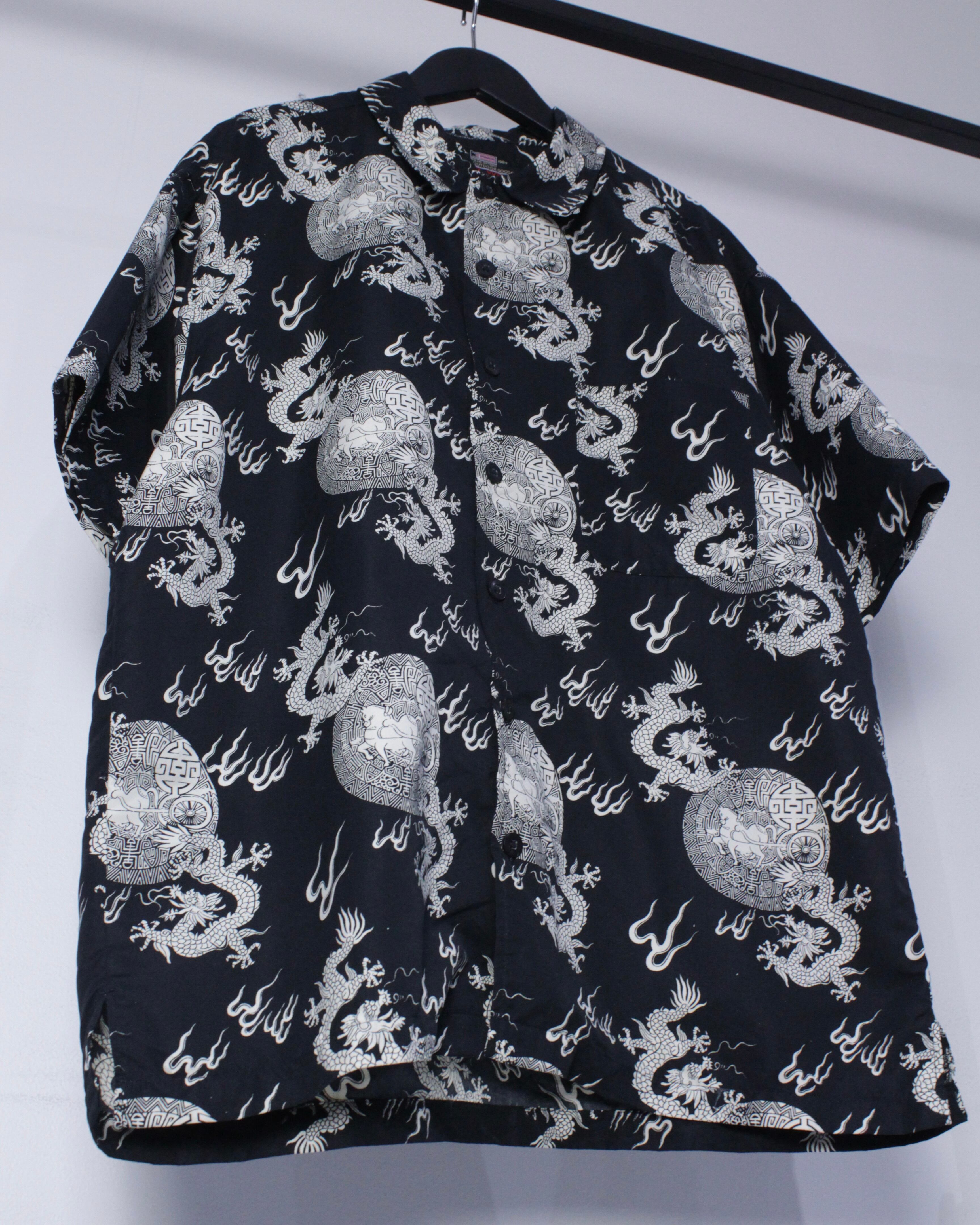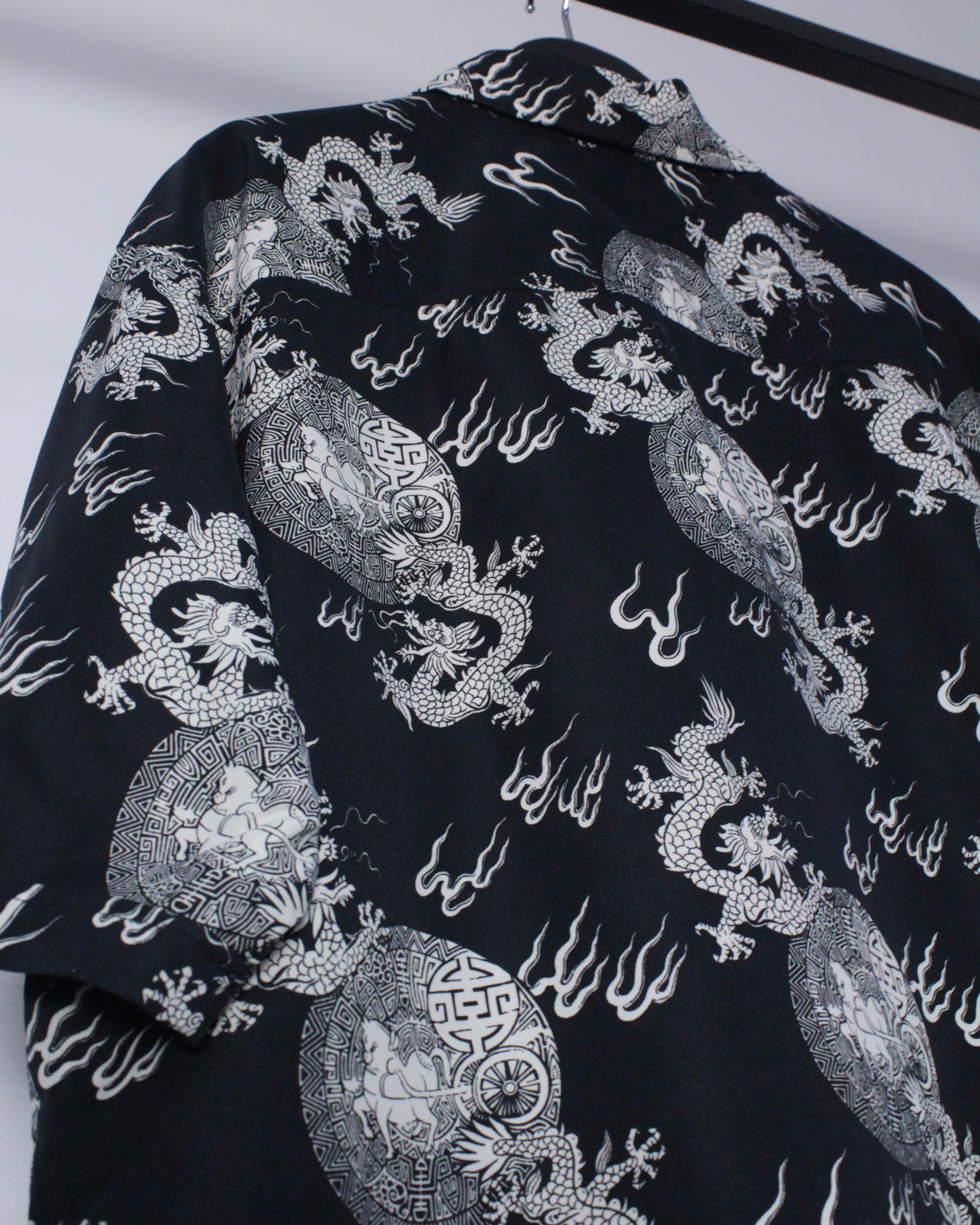 サラッとしたブラックのポリエステルボディをベースに、白のカラーで全面にチャイナ調の雰囲気を感じるドラゴンのデザインを施した半袖シャツ。