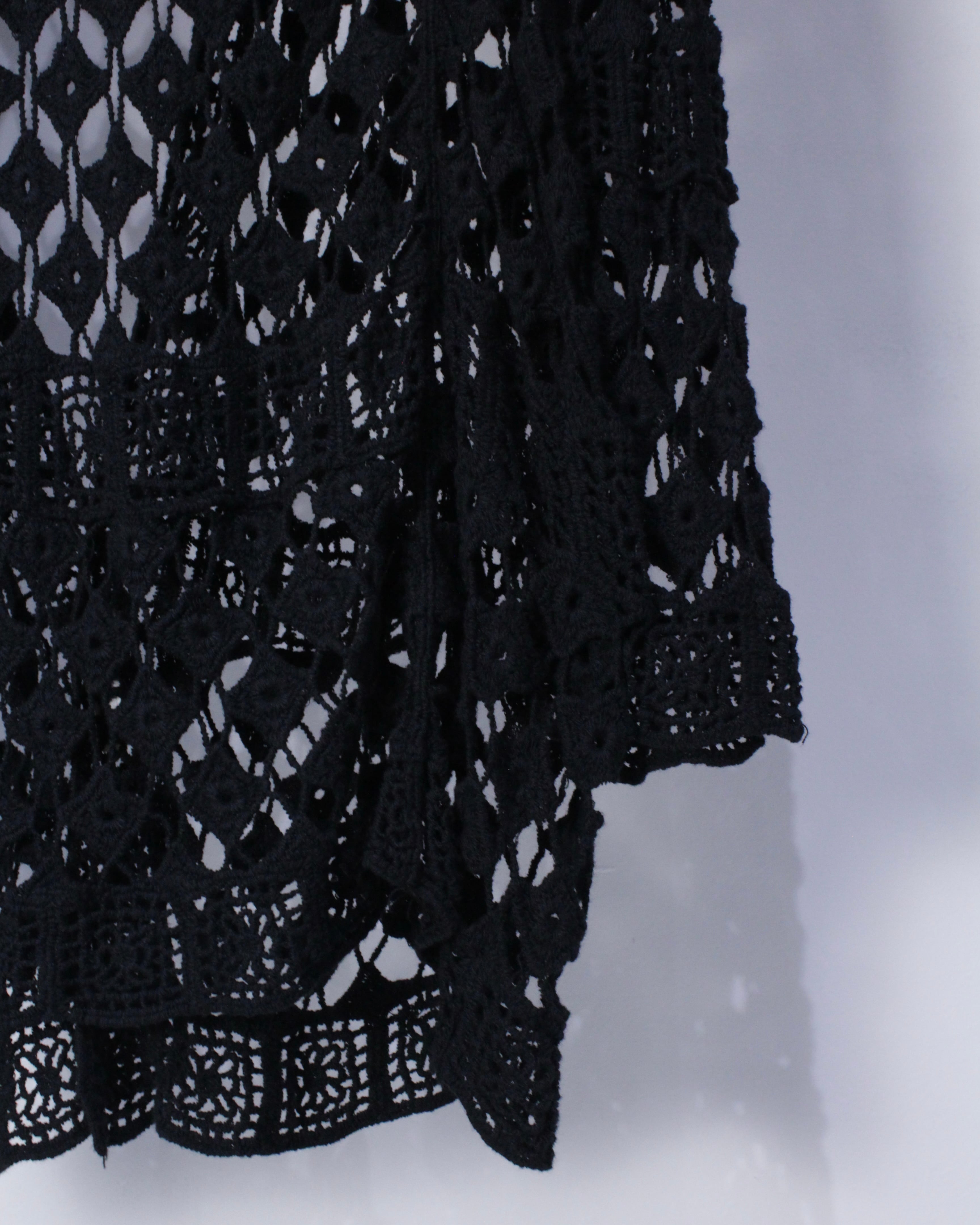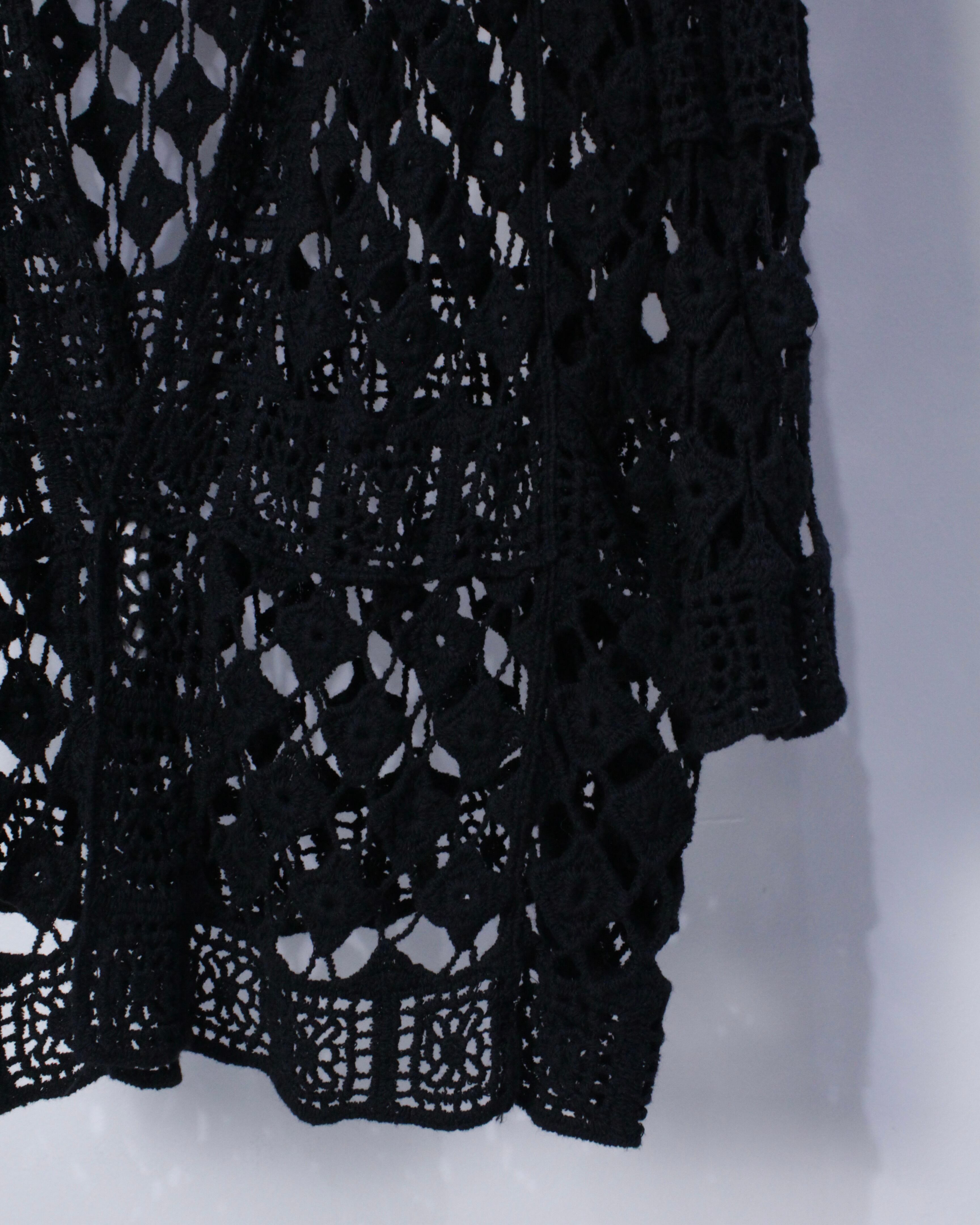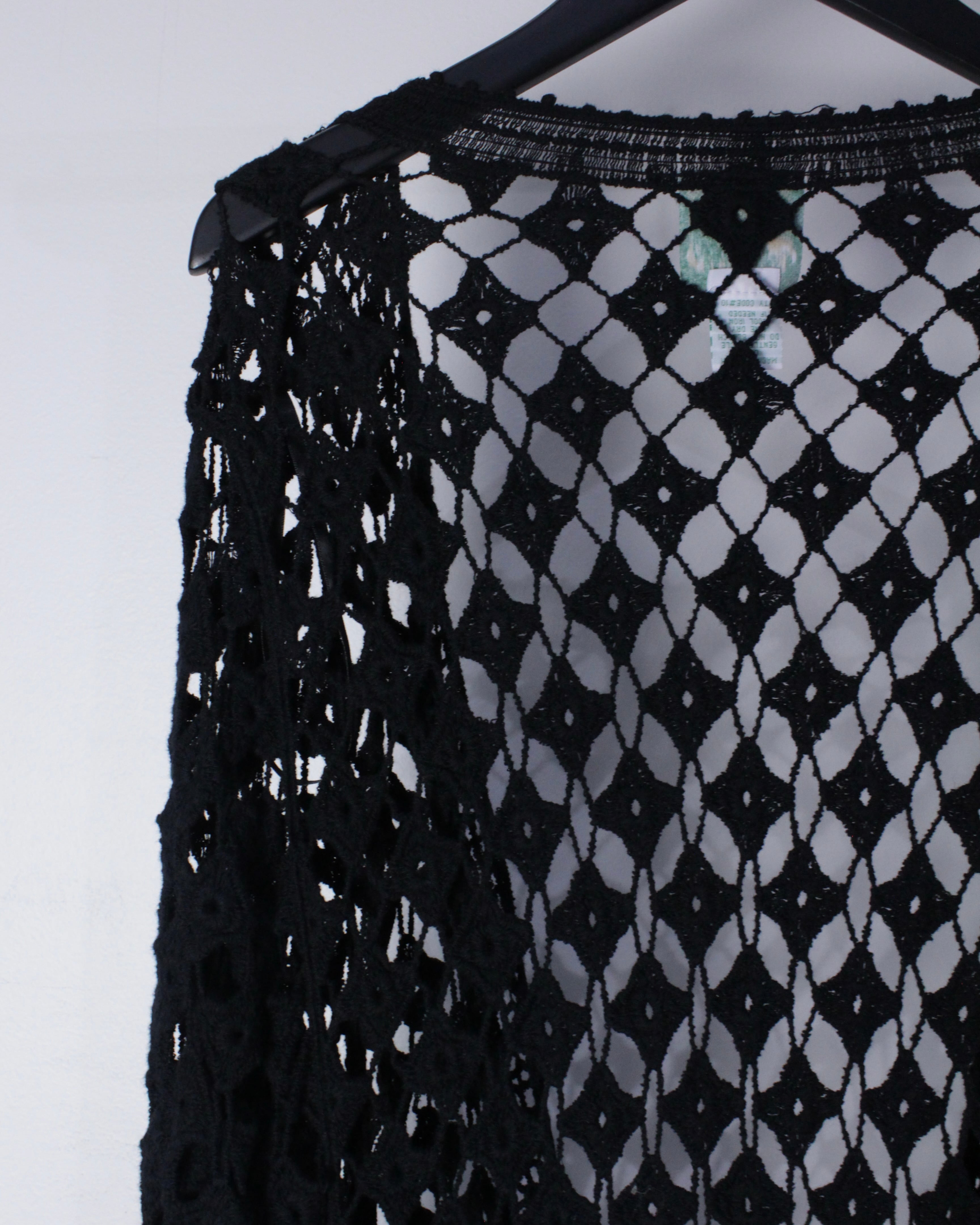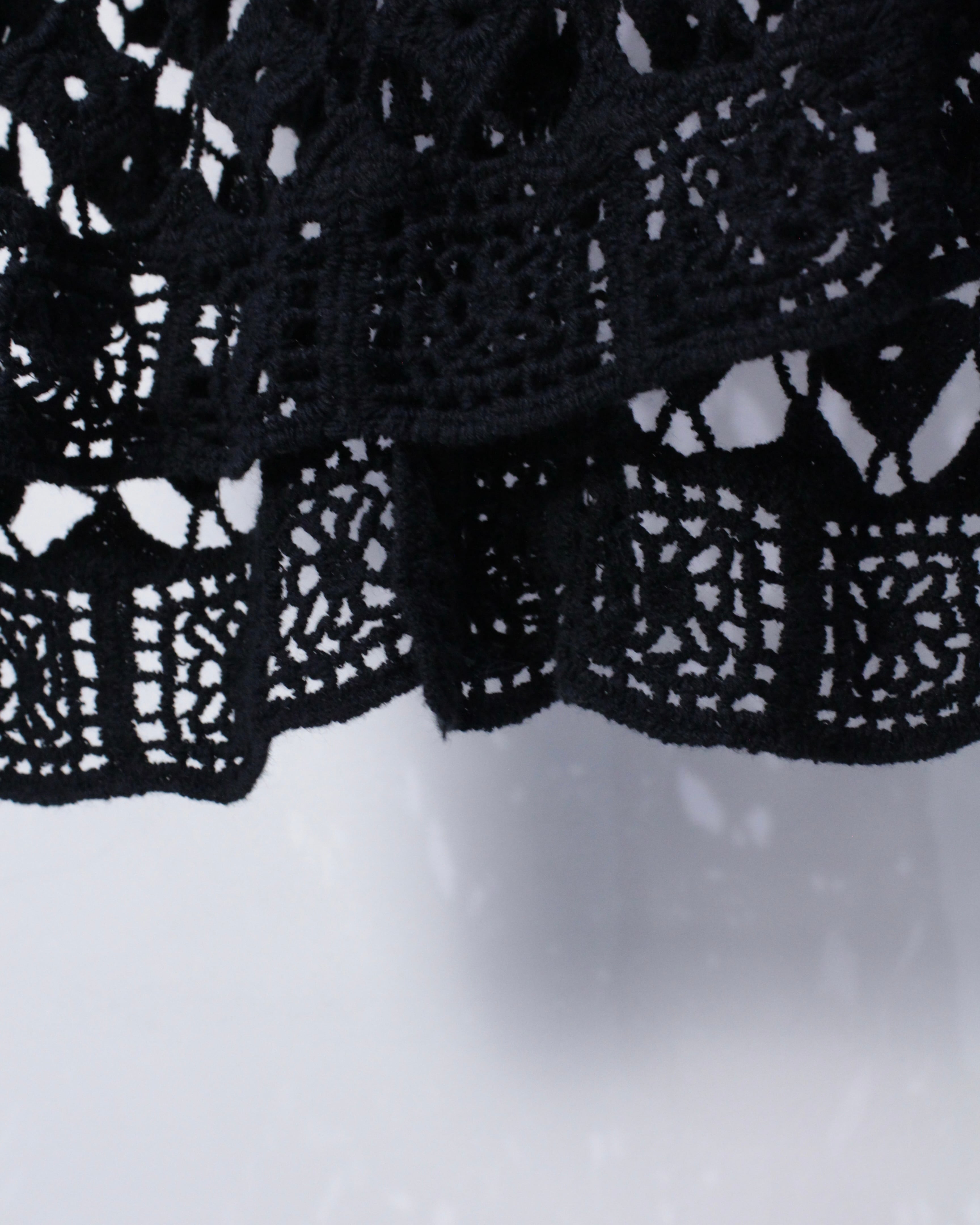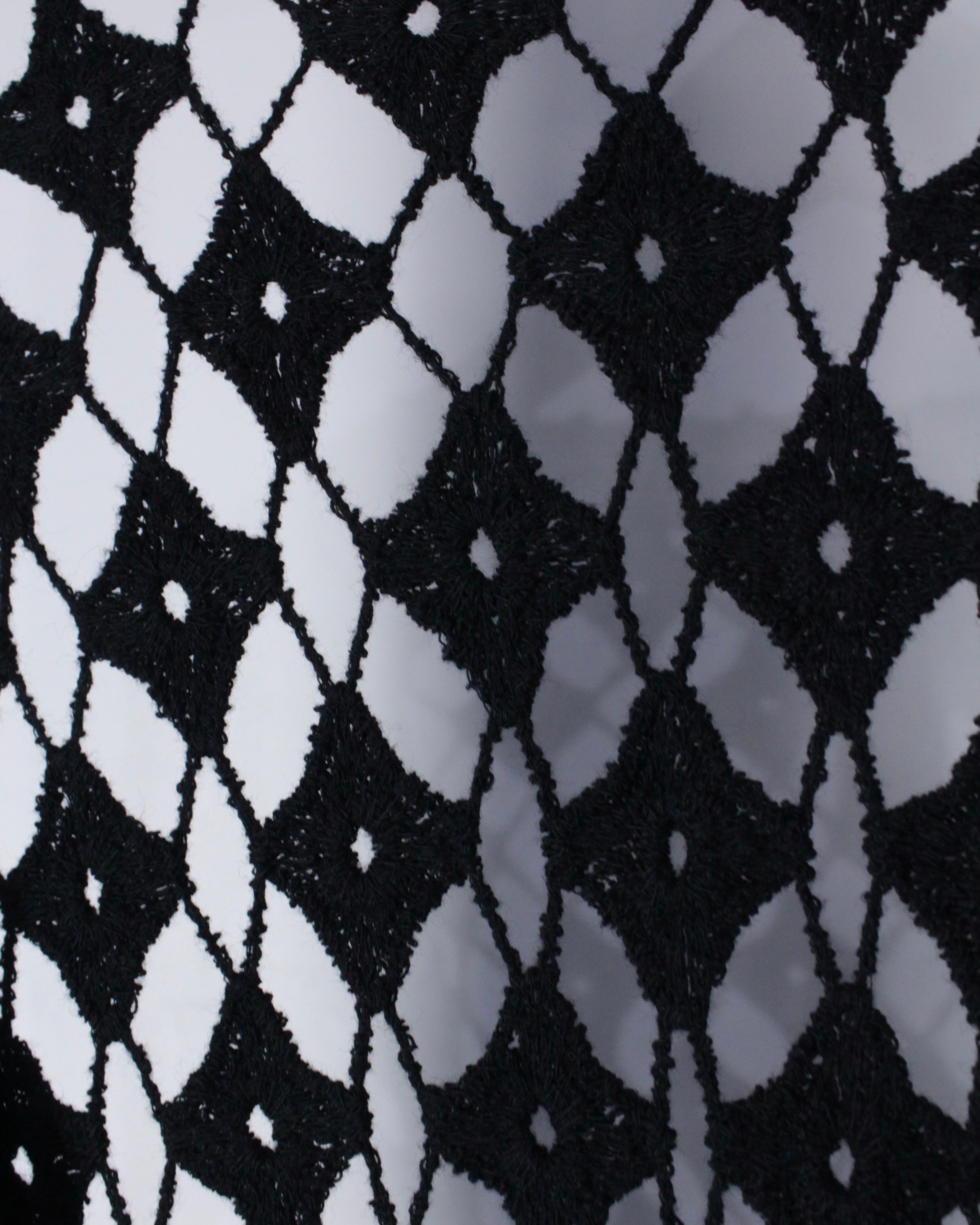ブラックカラーでまとめ上げられた上品さを醸し出すボディに、編み込みで全面に花柄をあしらったメッシュ羽織りジャケット。