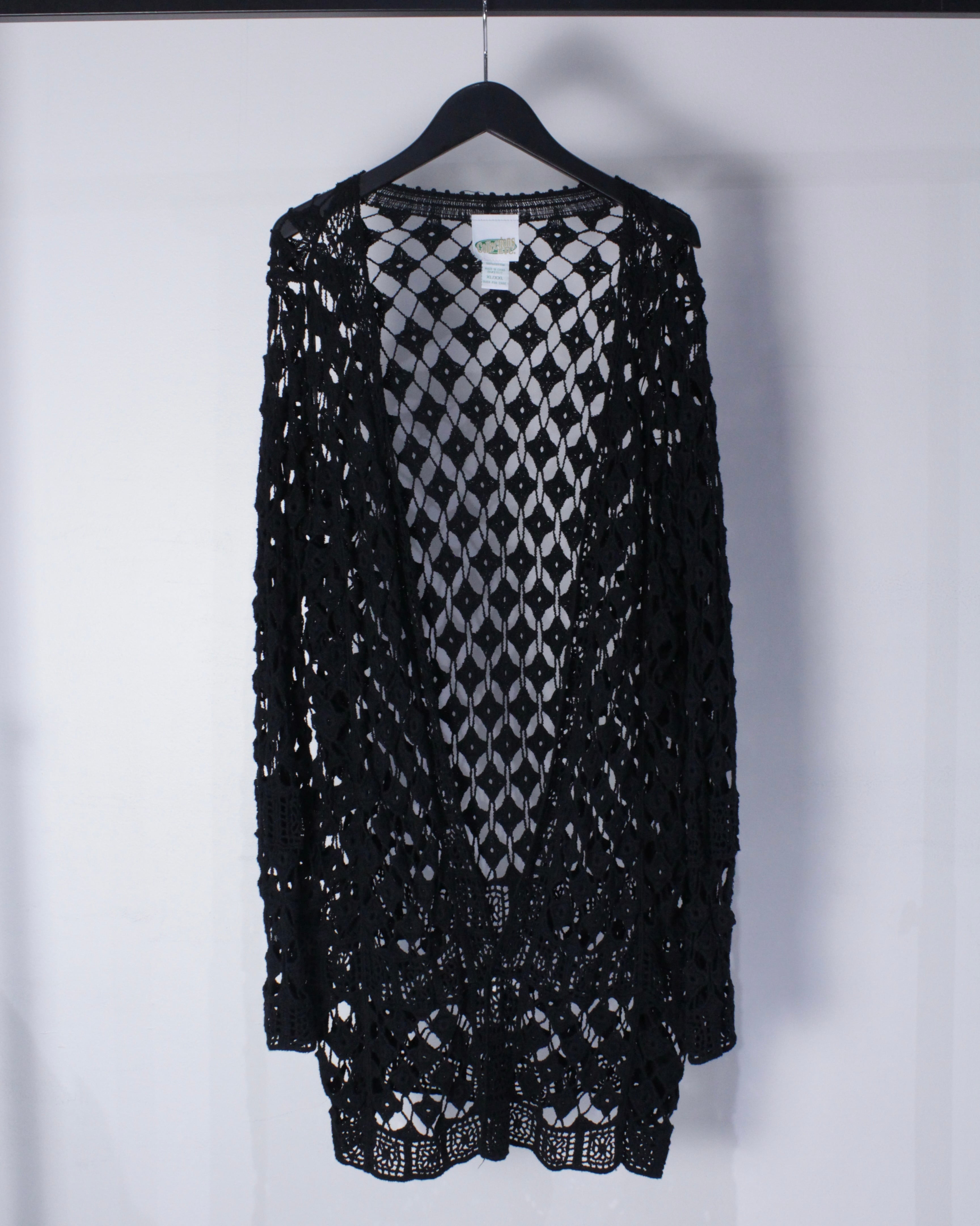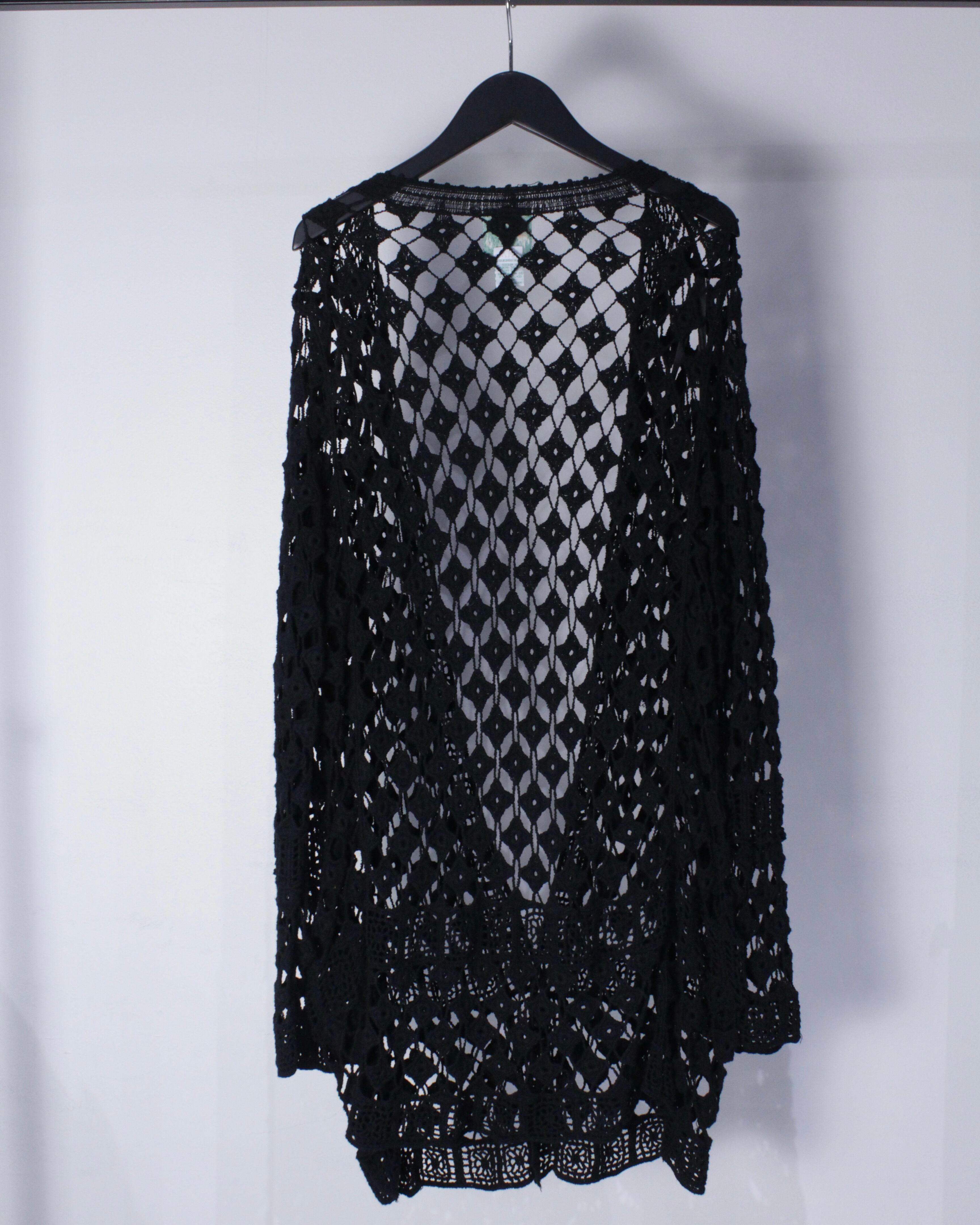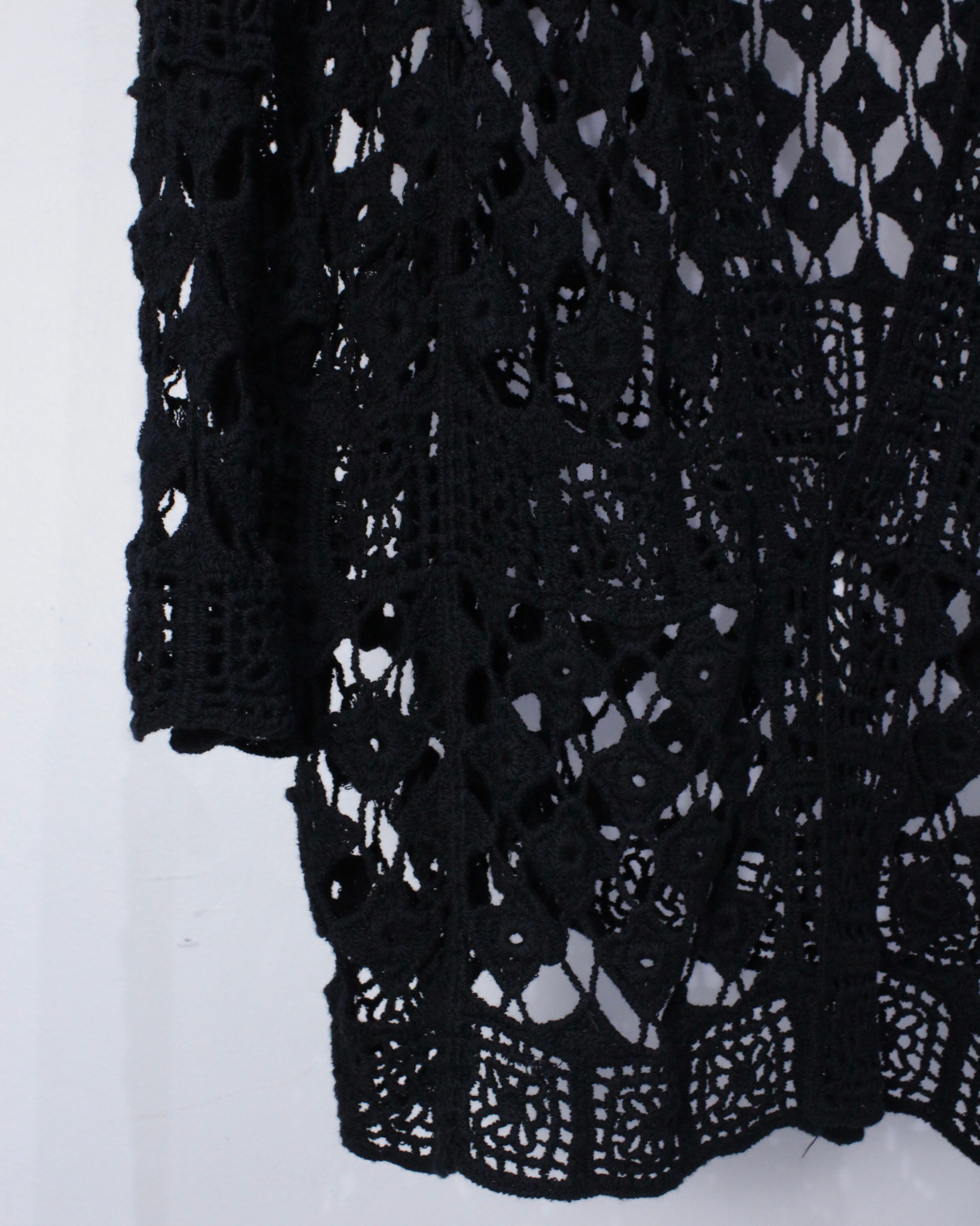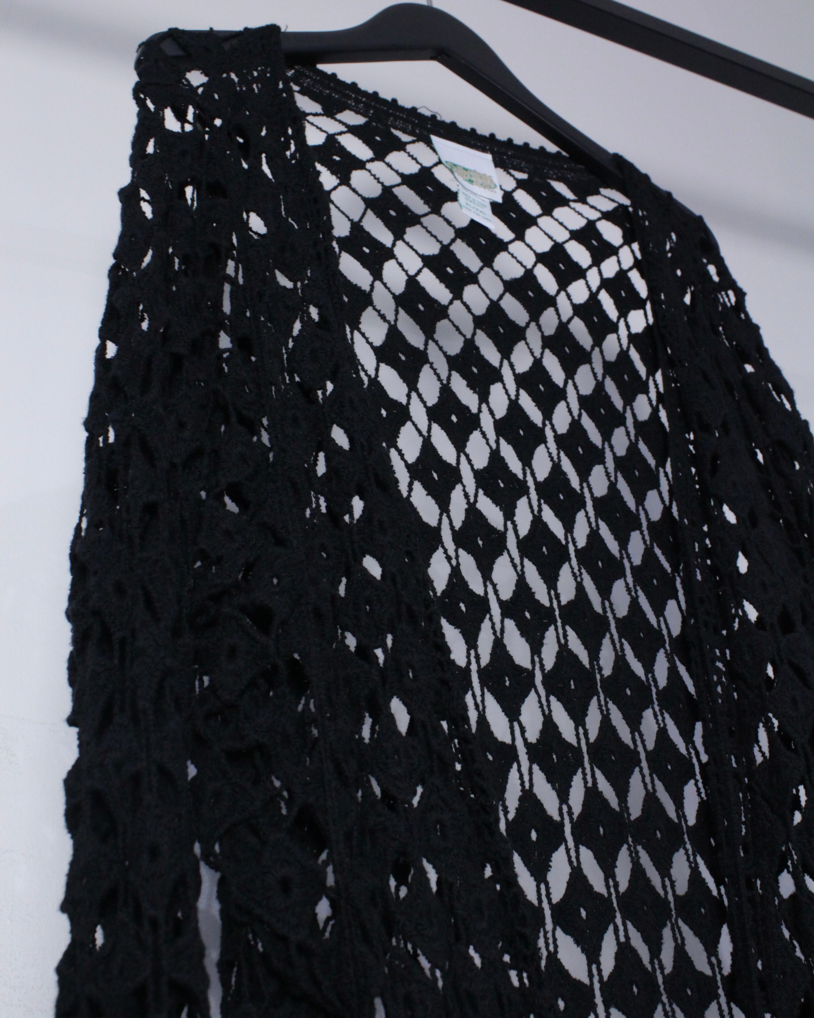 ブラックカラーでまとめ上げられた上品さを醸し出すボディに、編み込みで全面に花柄をあしらったメッシュ羽織りジャケット。