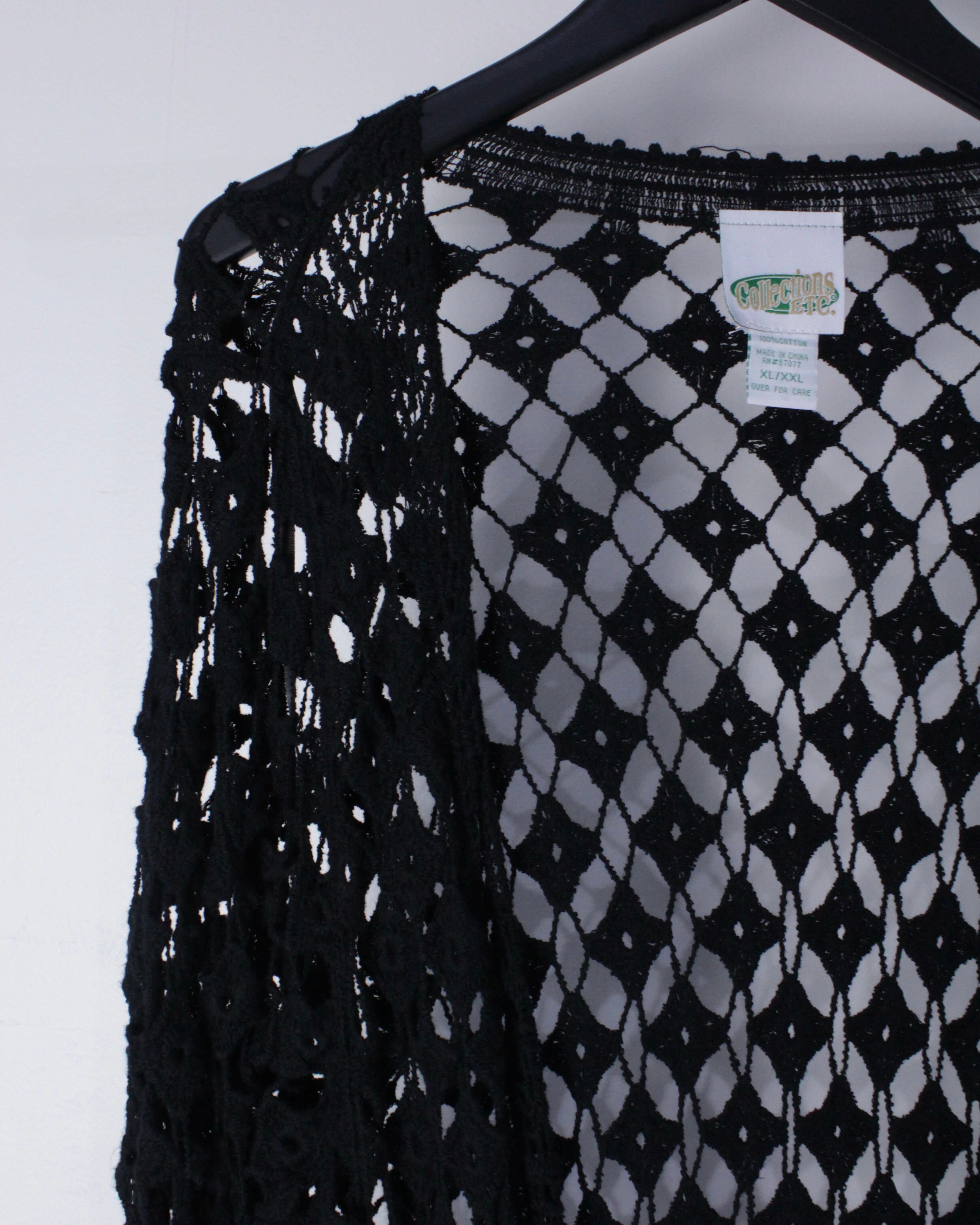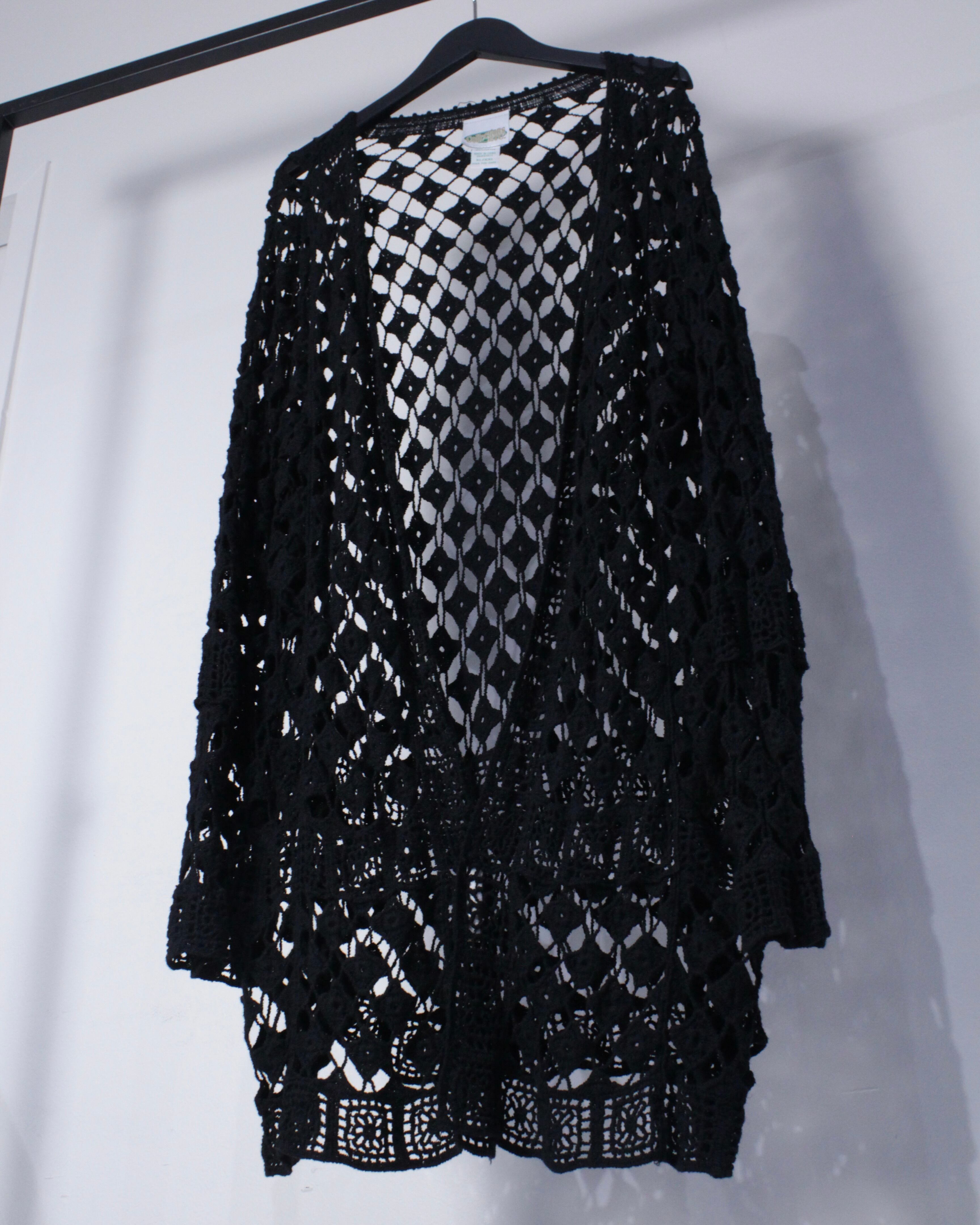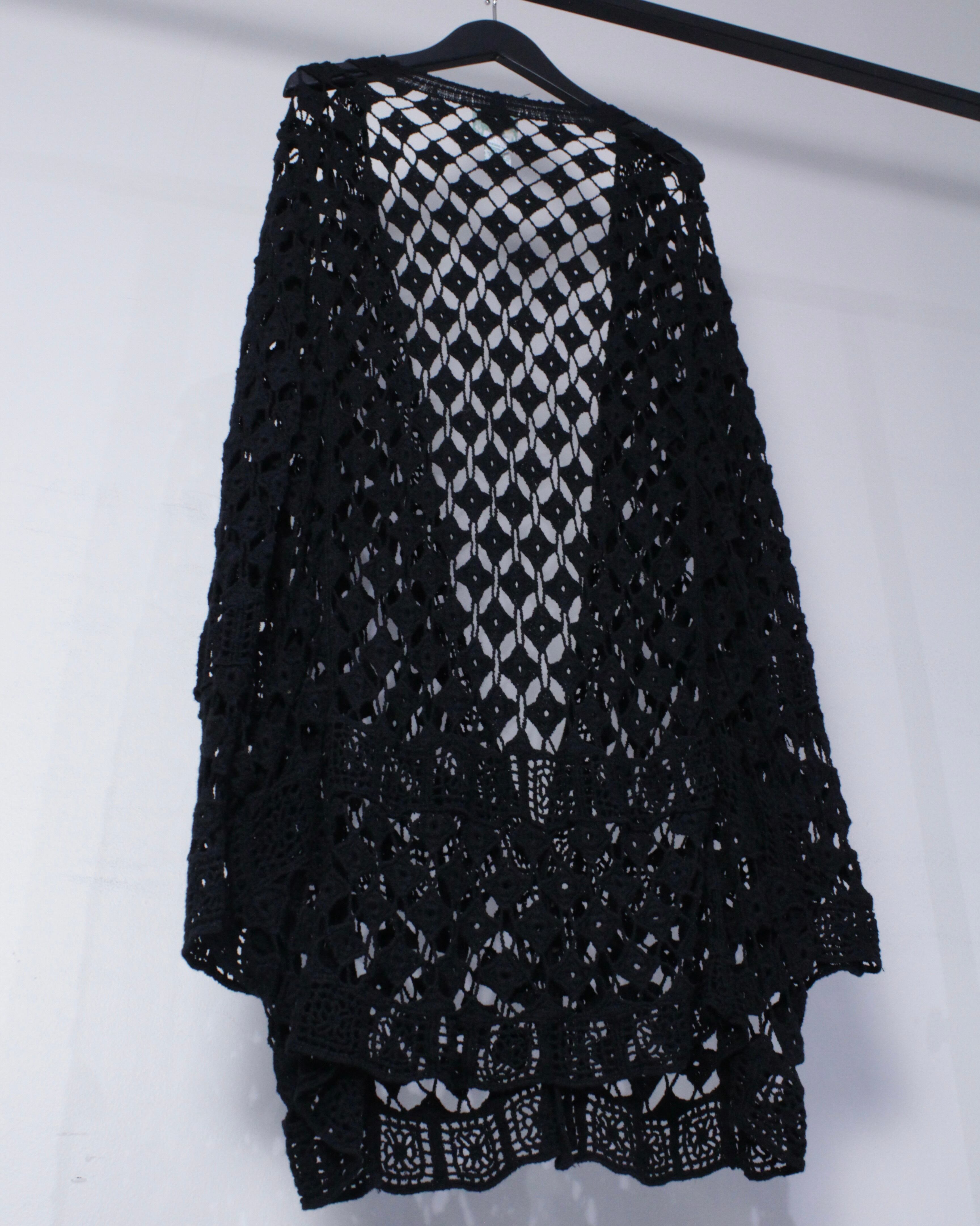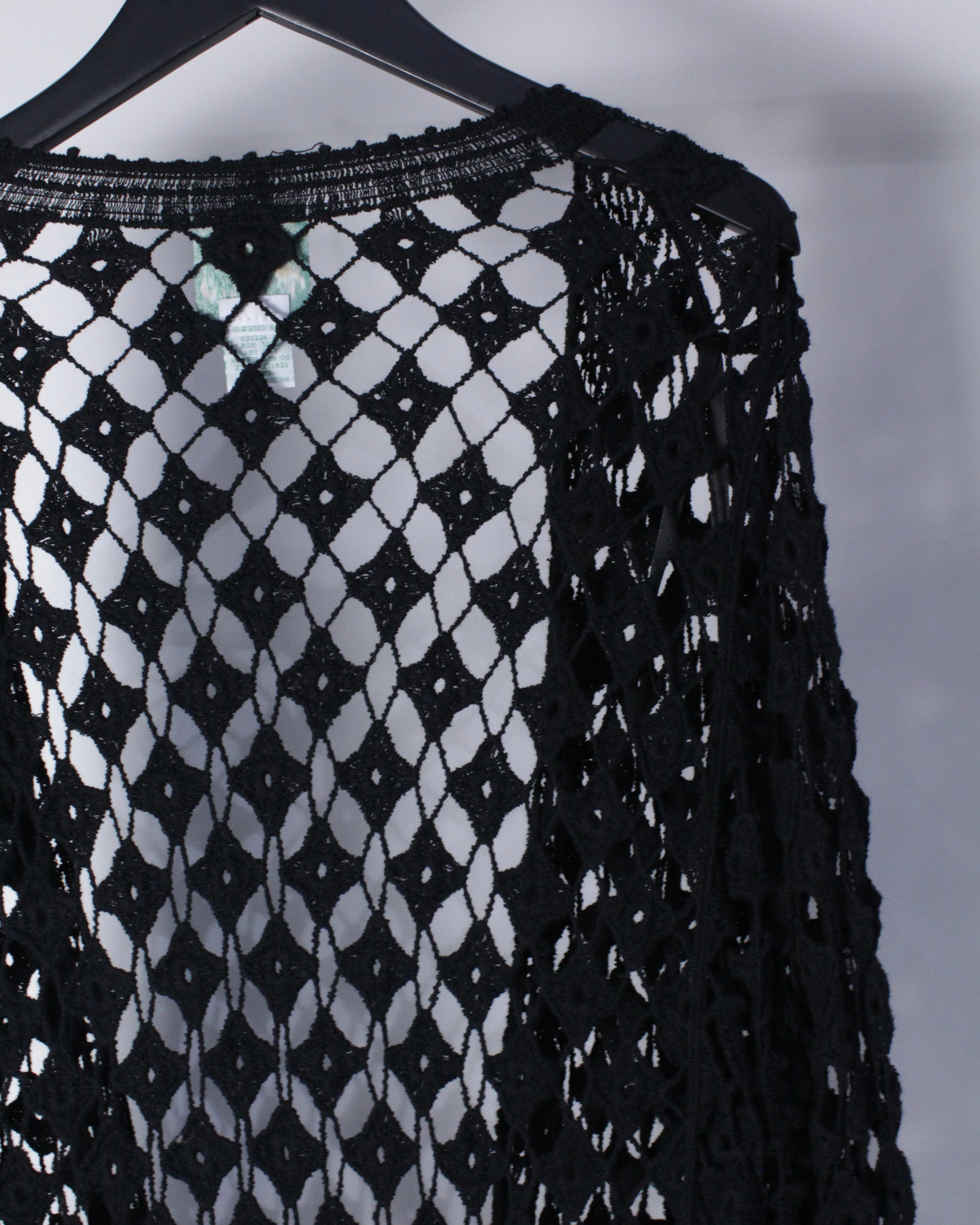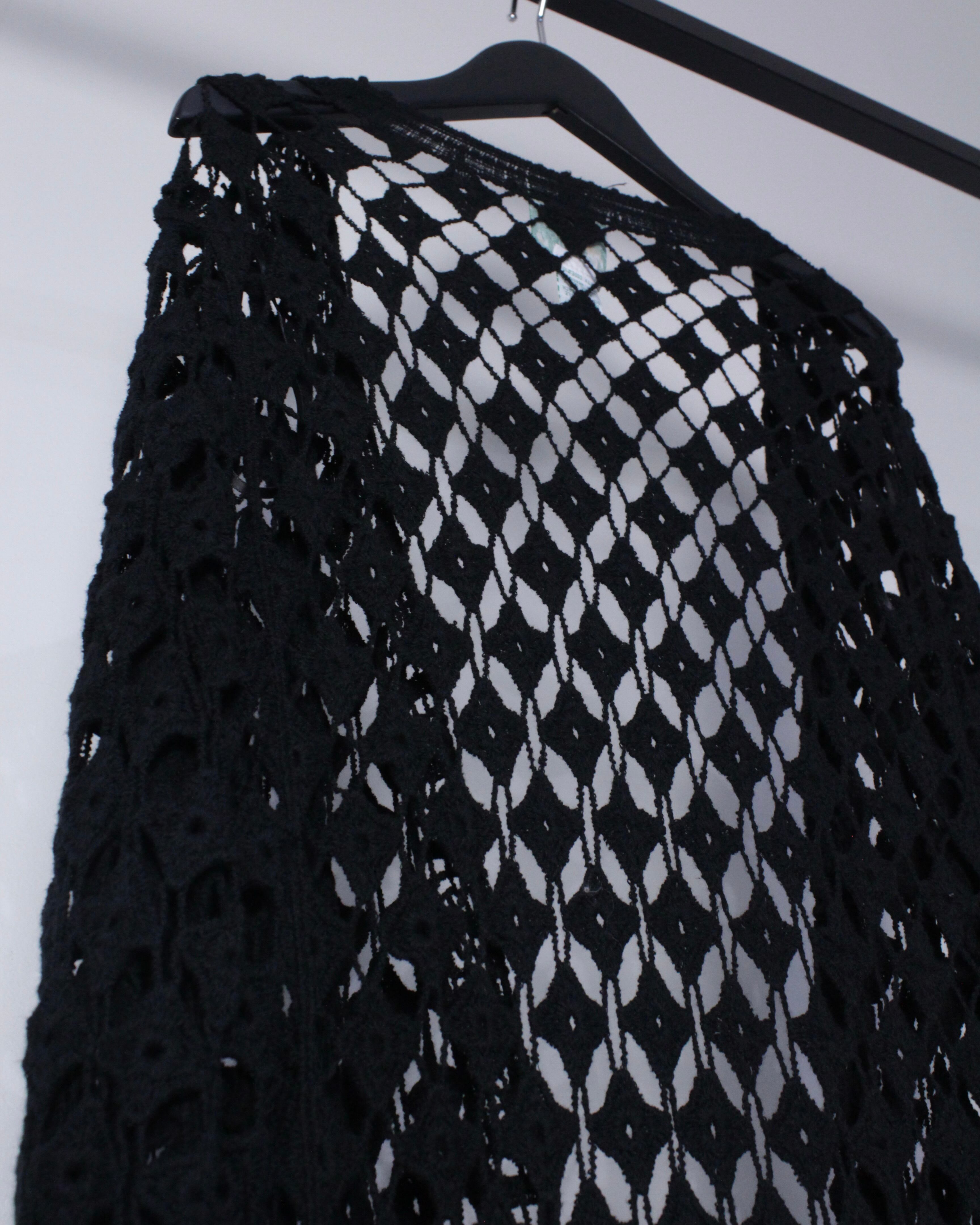 ブラックカラーでまとめ上げられた上品さを醸し出すボディに、編み込みで全面に花柄をあしらったメッシュ羽織りジャケット。