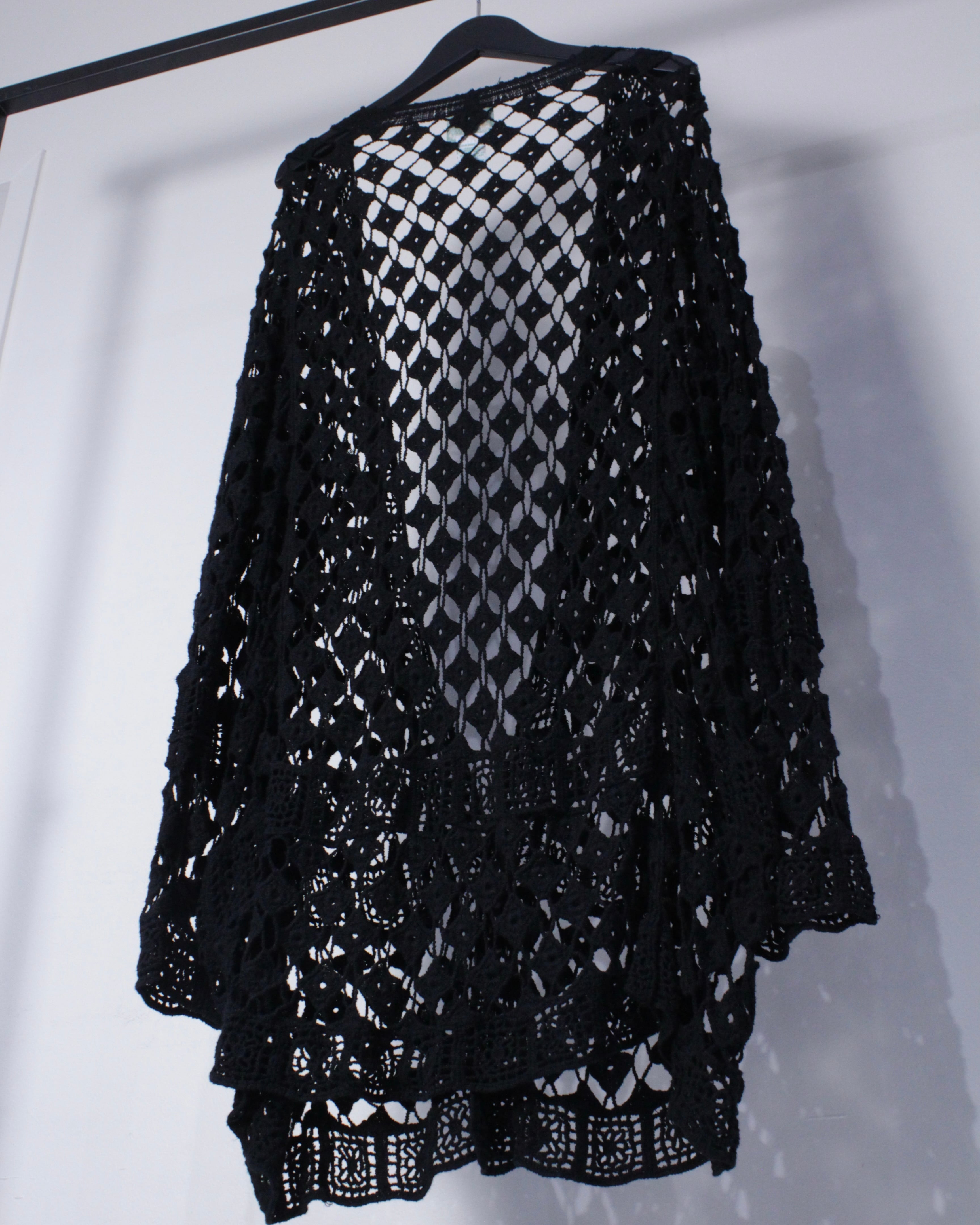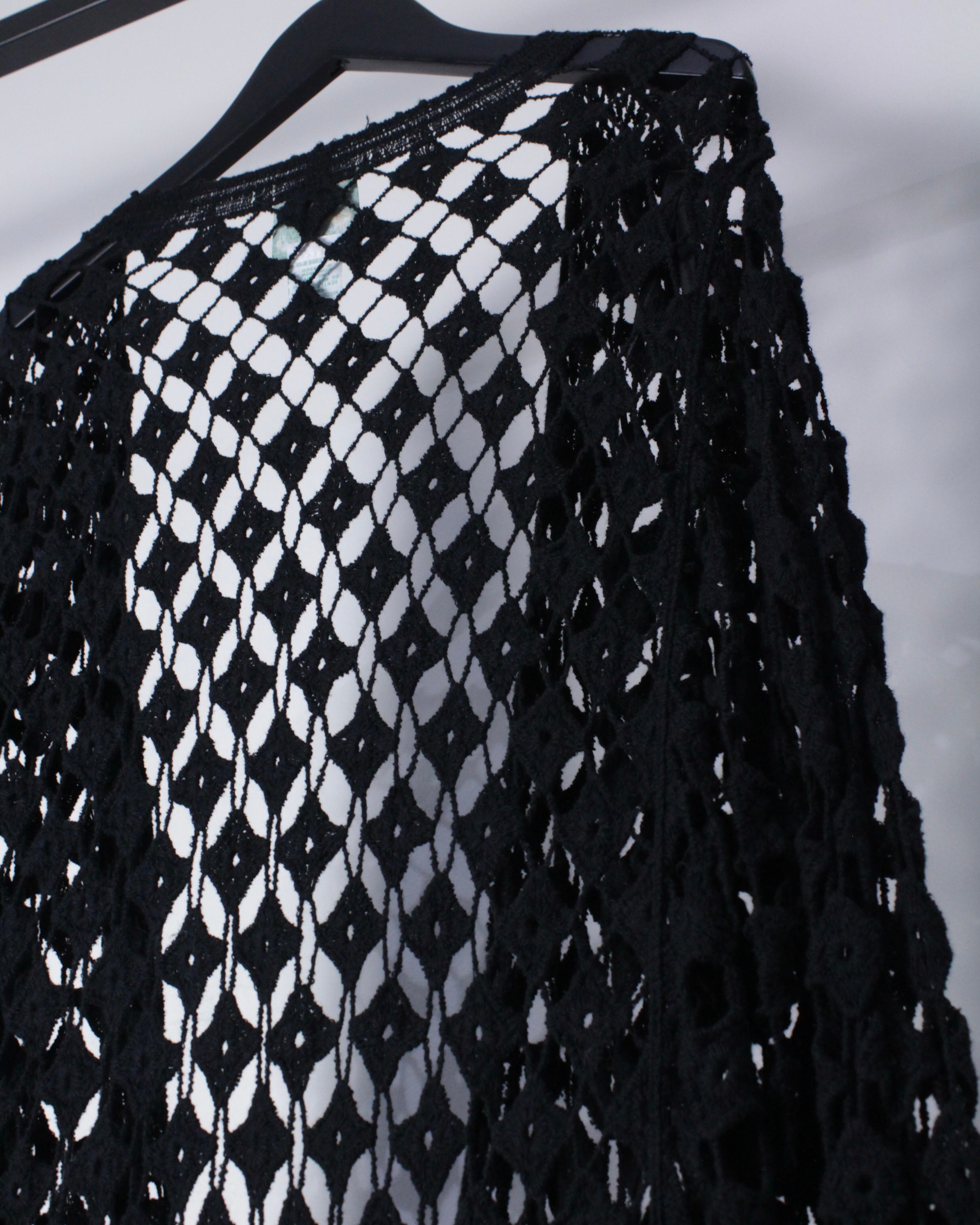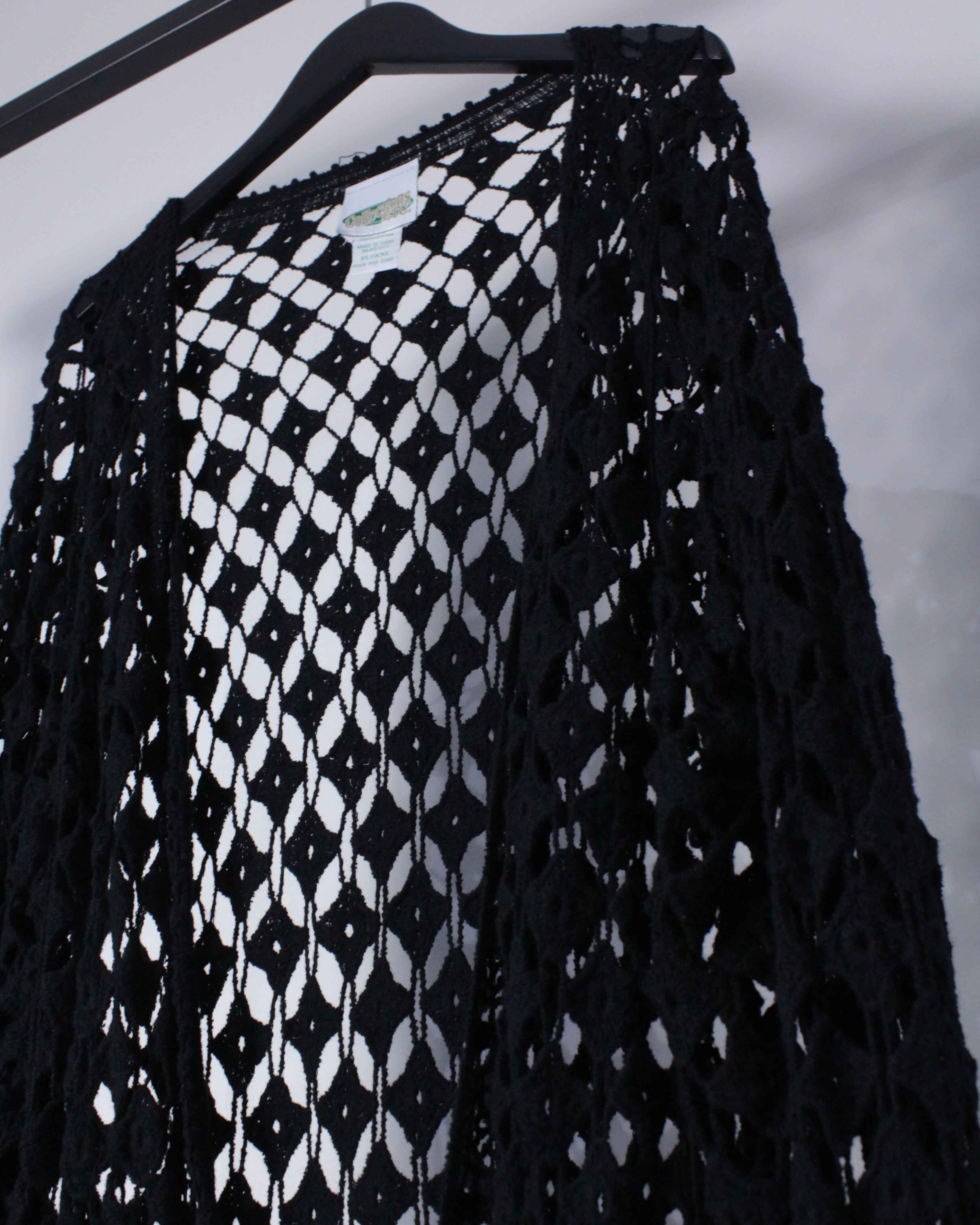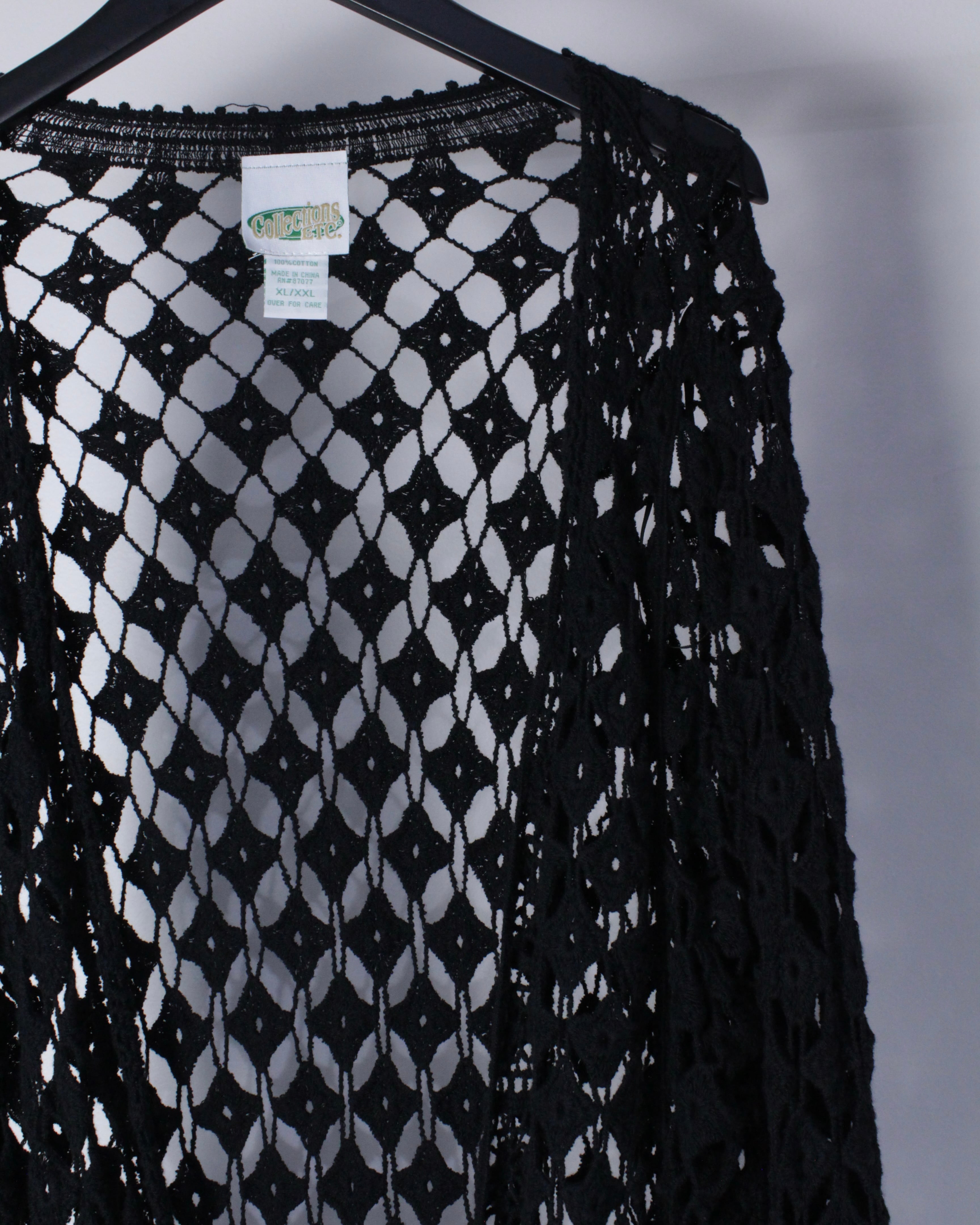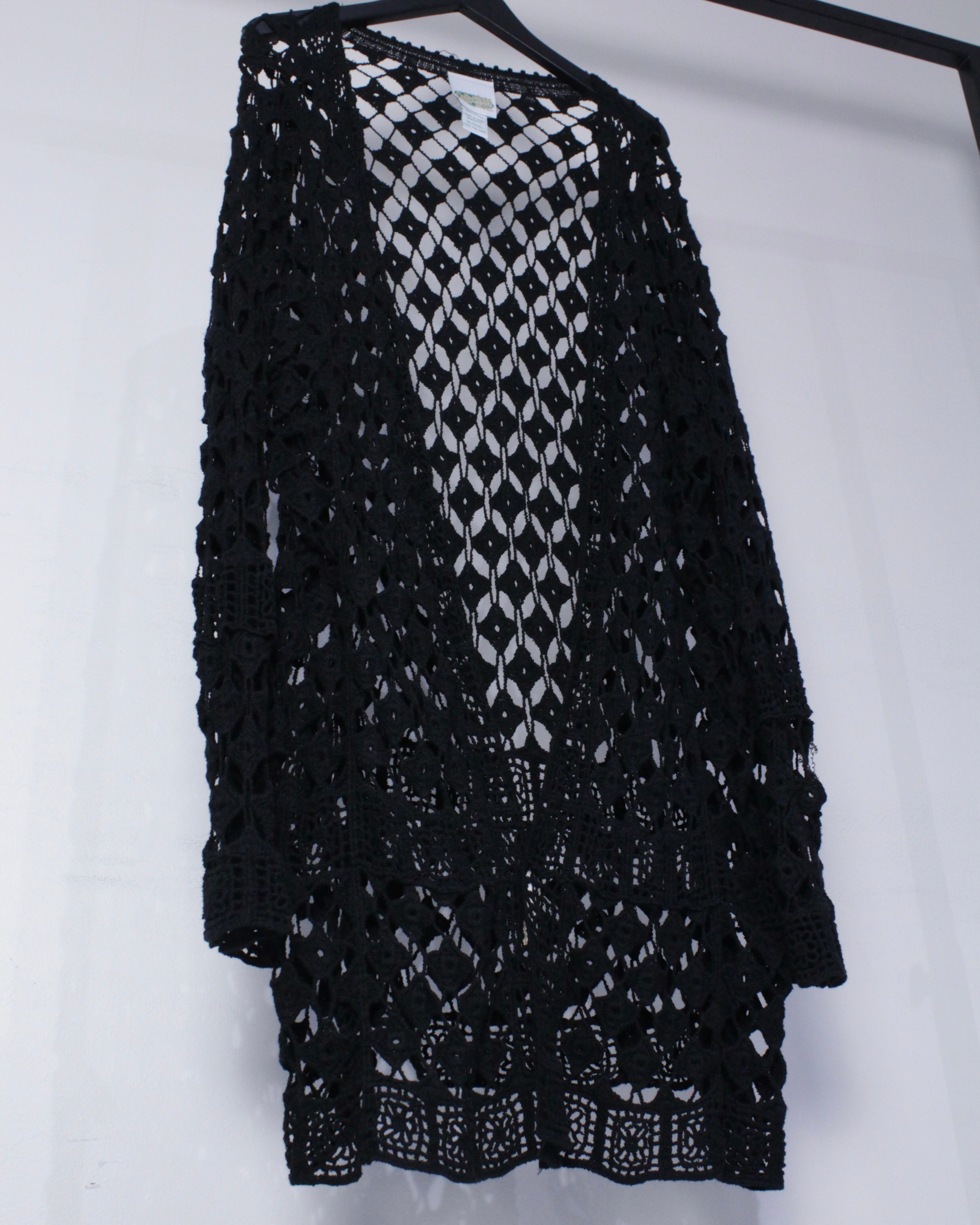 ブラックカラーでまとめ上げられた上品さを醸し出すボディに、編み込みで全面に花柄をあしらったメッシュ羽織りジャケット。
