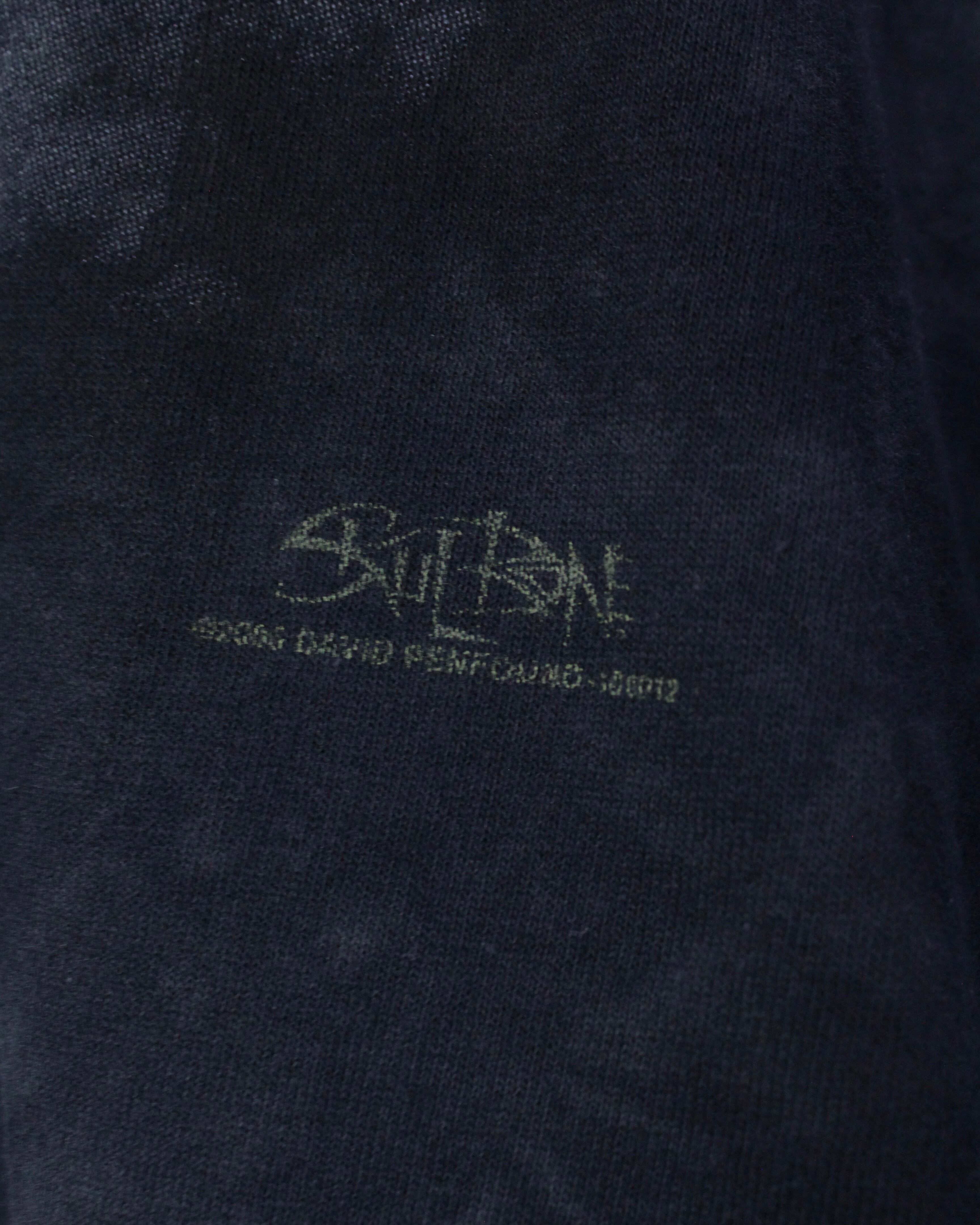 染めのような柄が全面に施されたボディに、フロントには服が敗れ、内側の骨が見えたような退廃的なスケルトンデザインが施されたTシャツ。