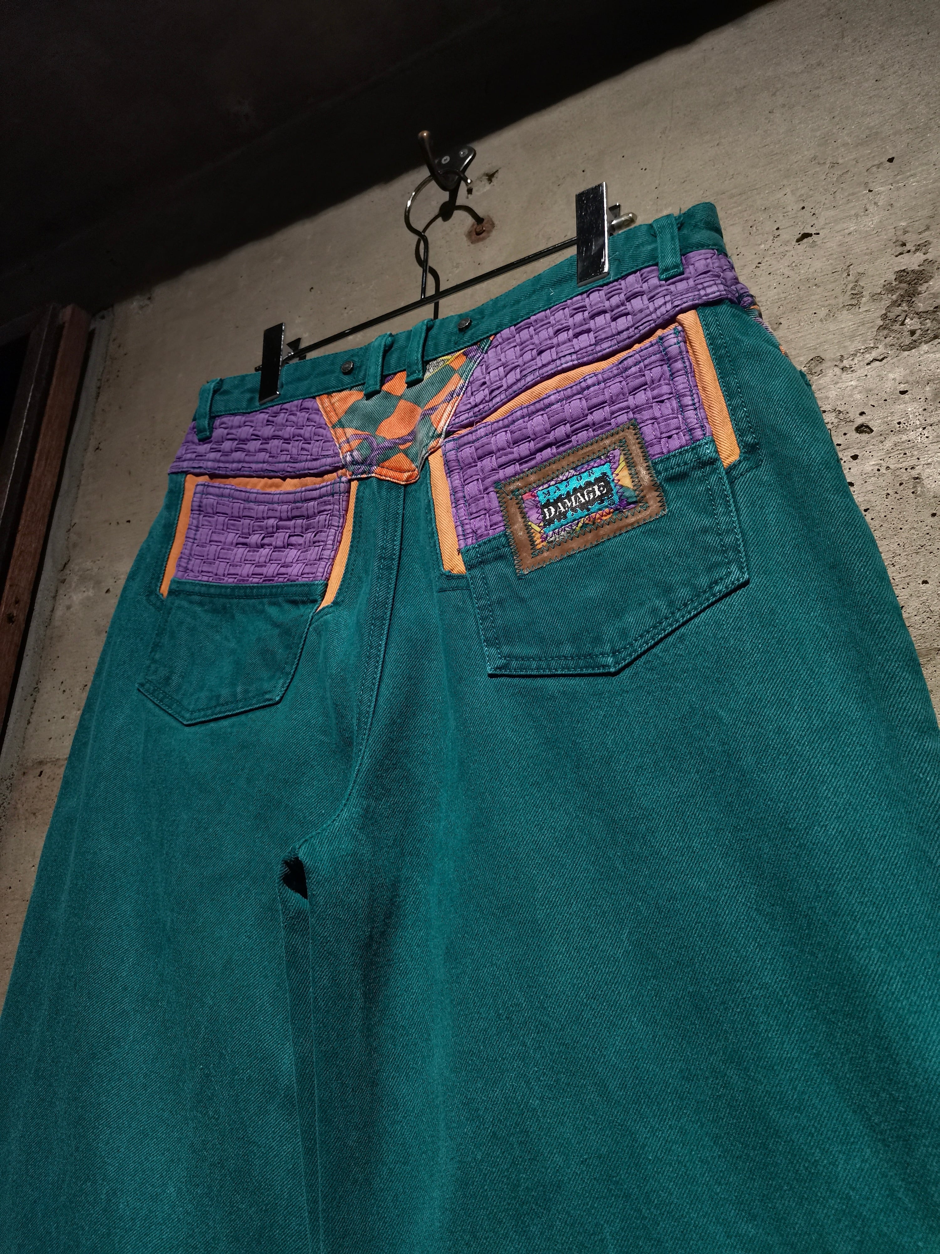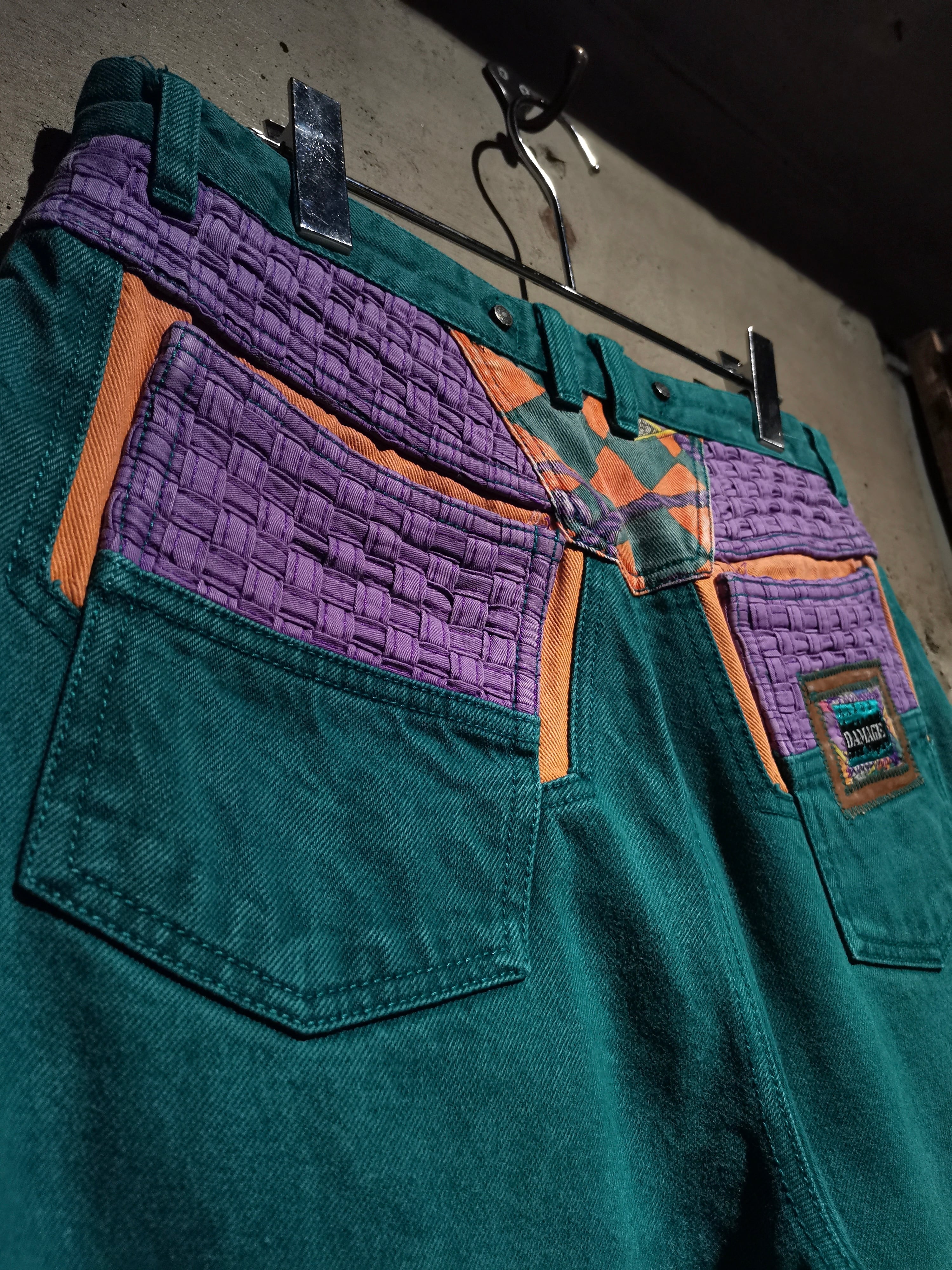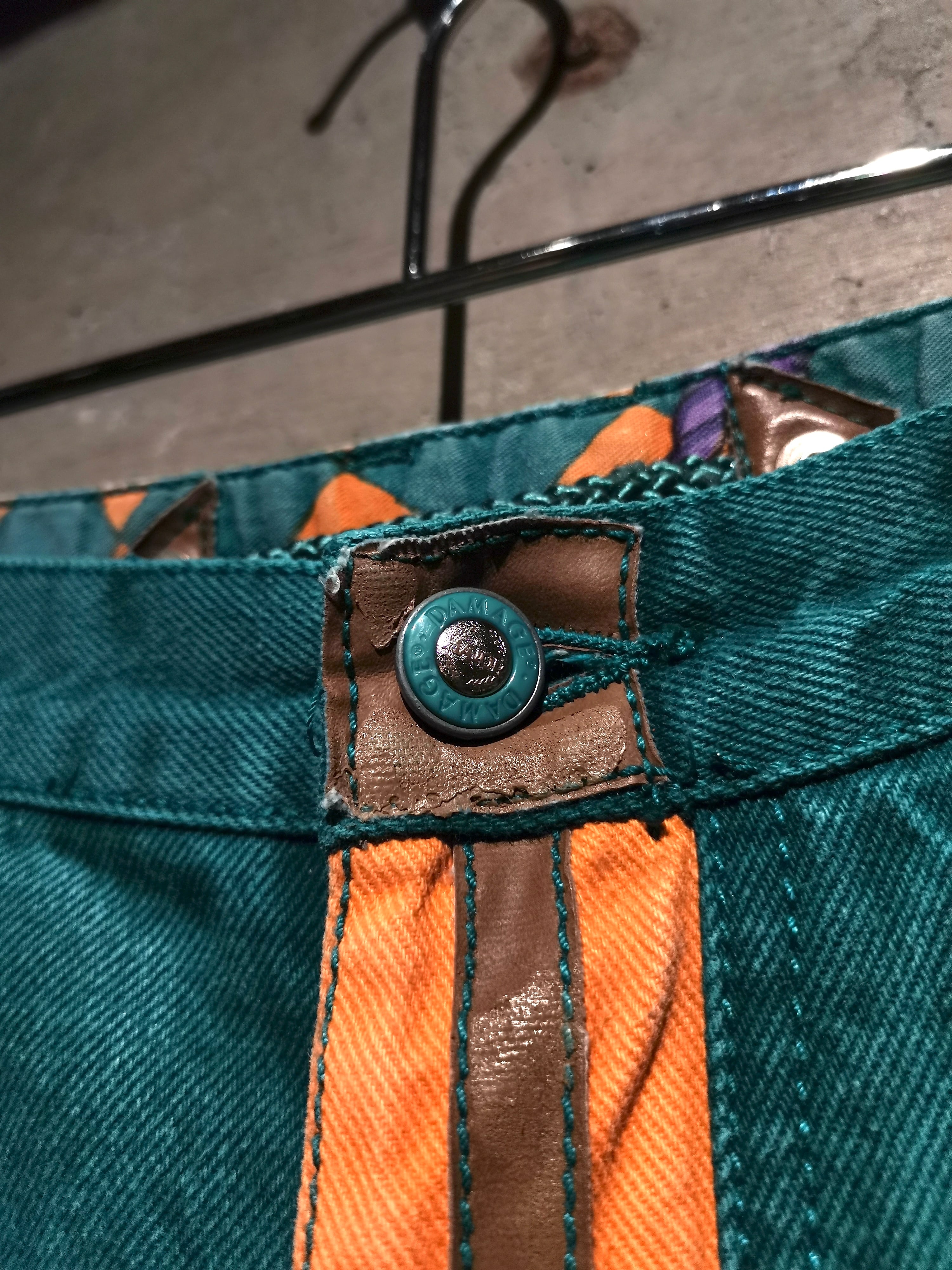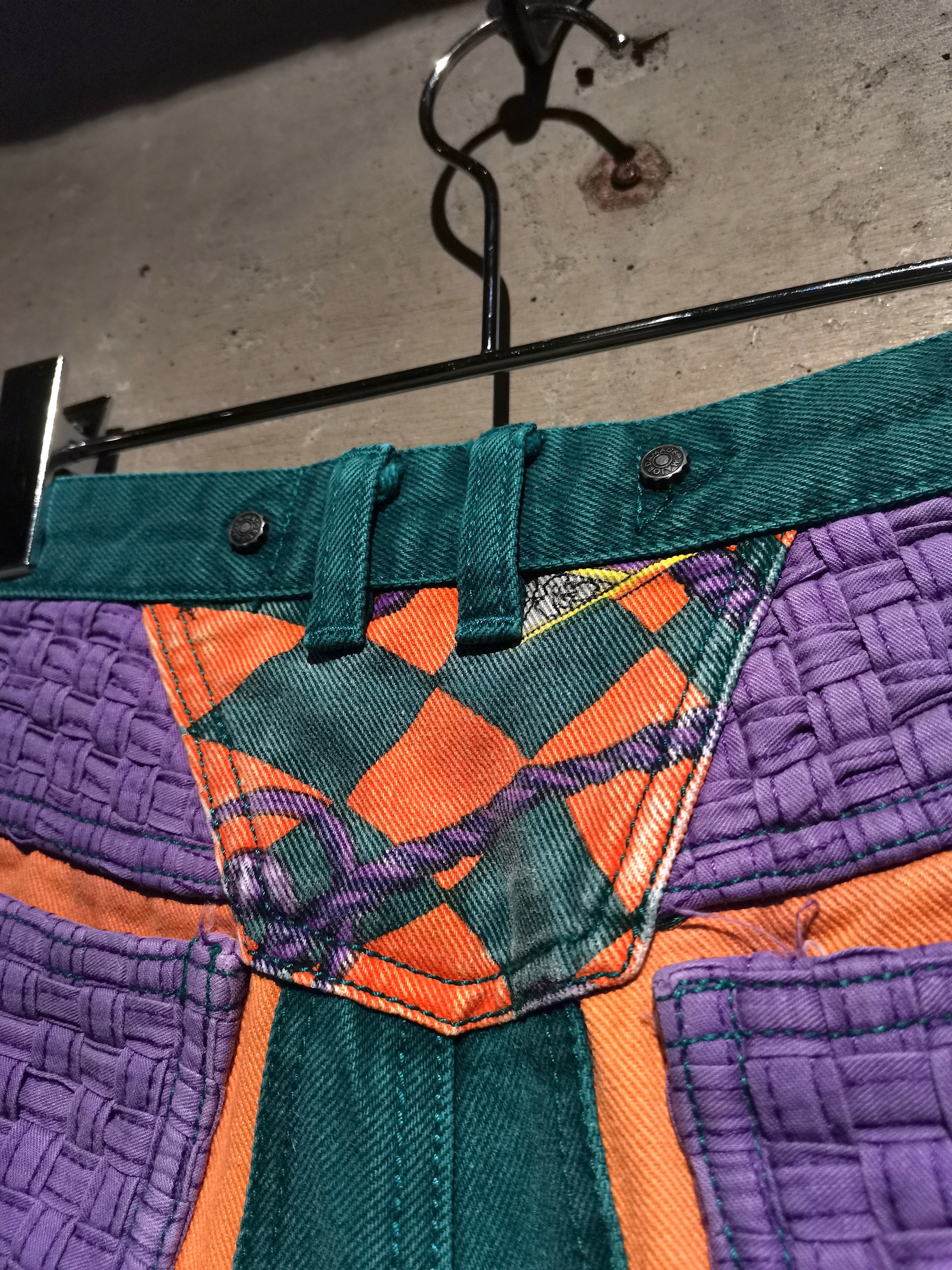 前立て部分にはオレンジのデニムにブラウンのフェイクレザー切り替え、フロント、バックポケット部分には紫の編み込みやスカーフ風の柄をあしらったデニム生地で切り替えた、唯一無二のデザイン性を誇る1本。