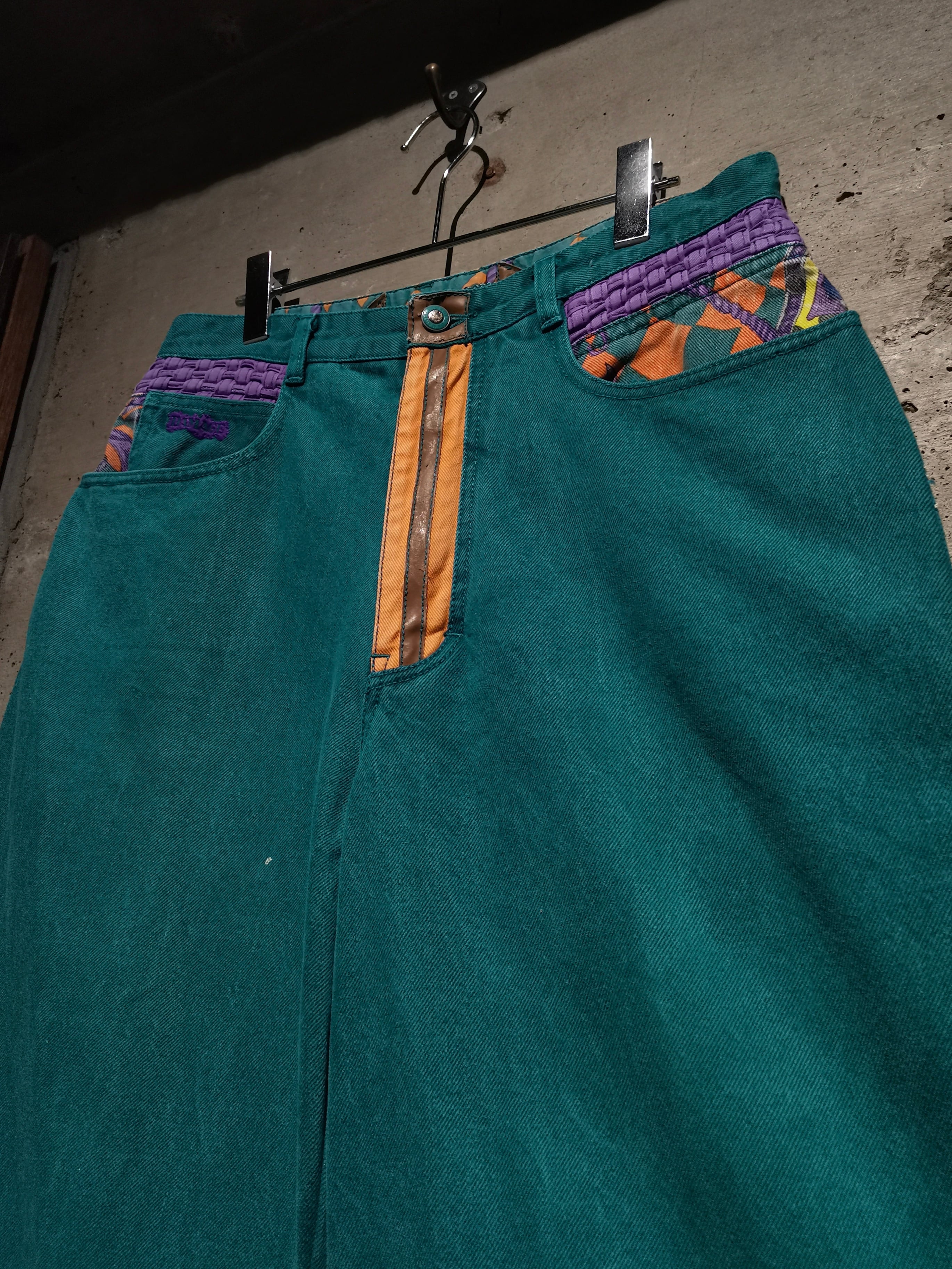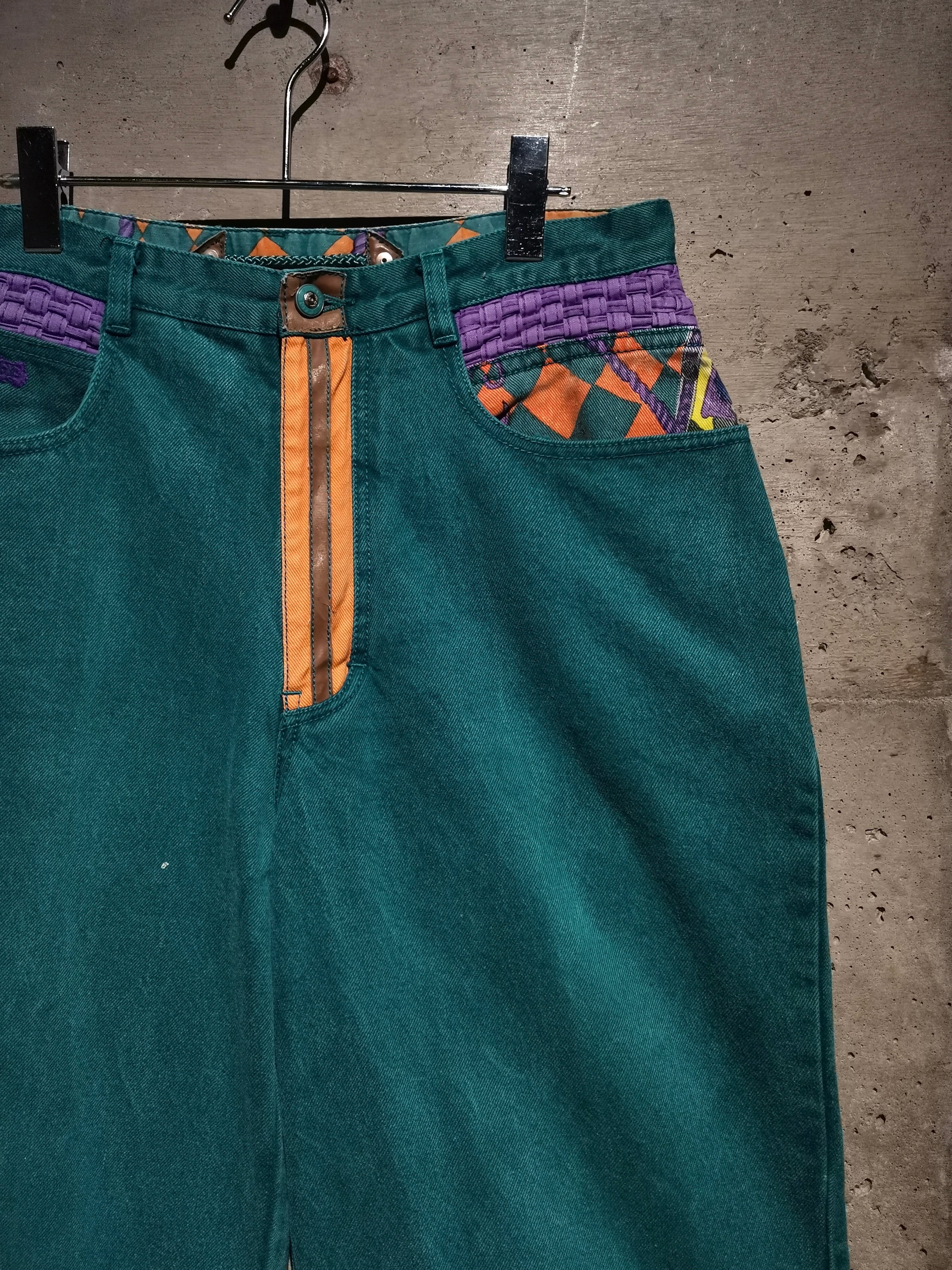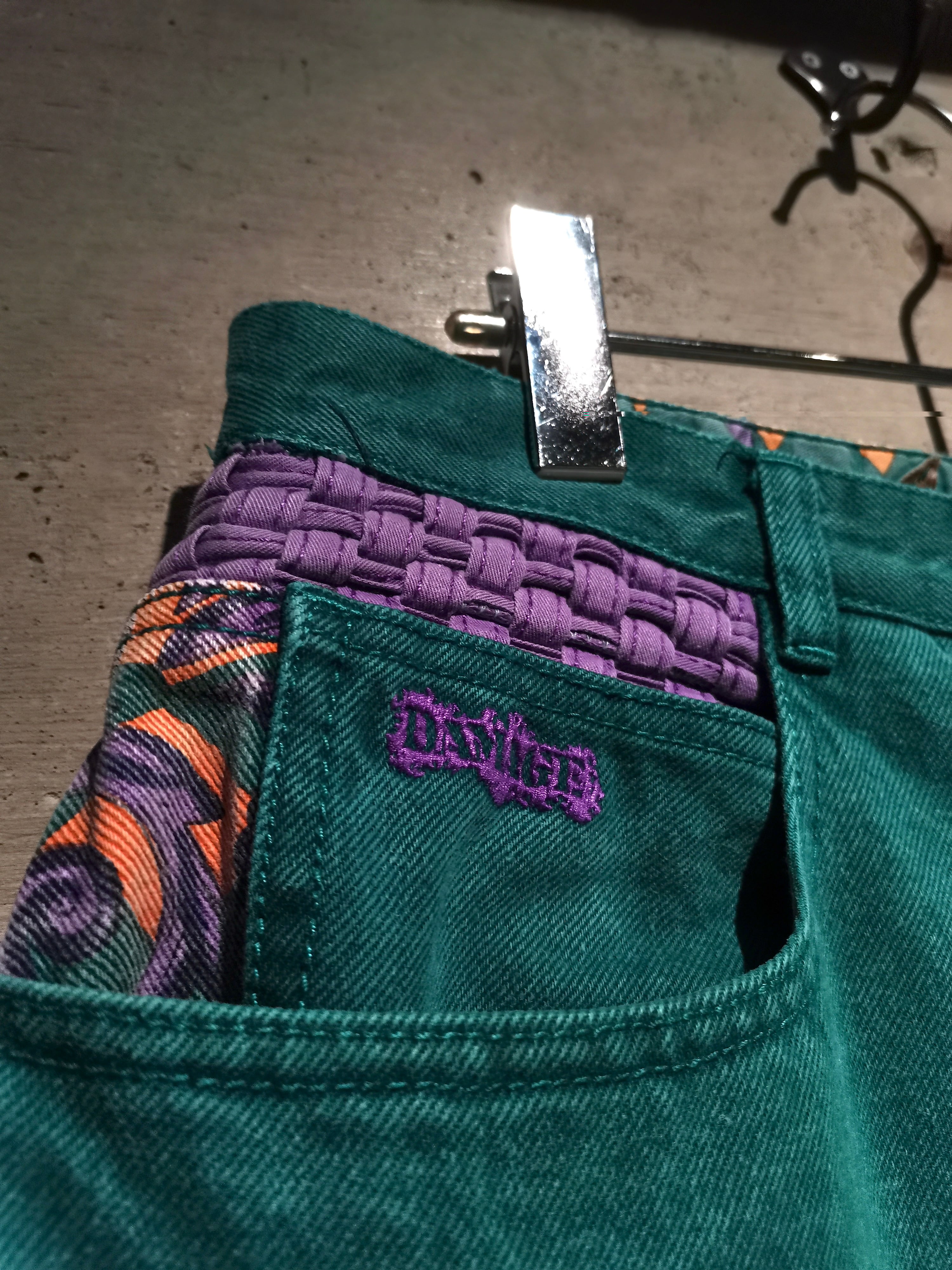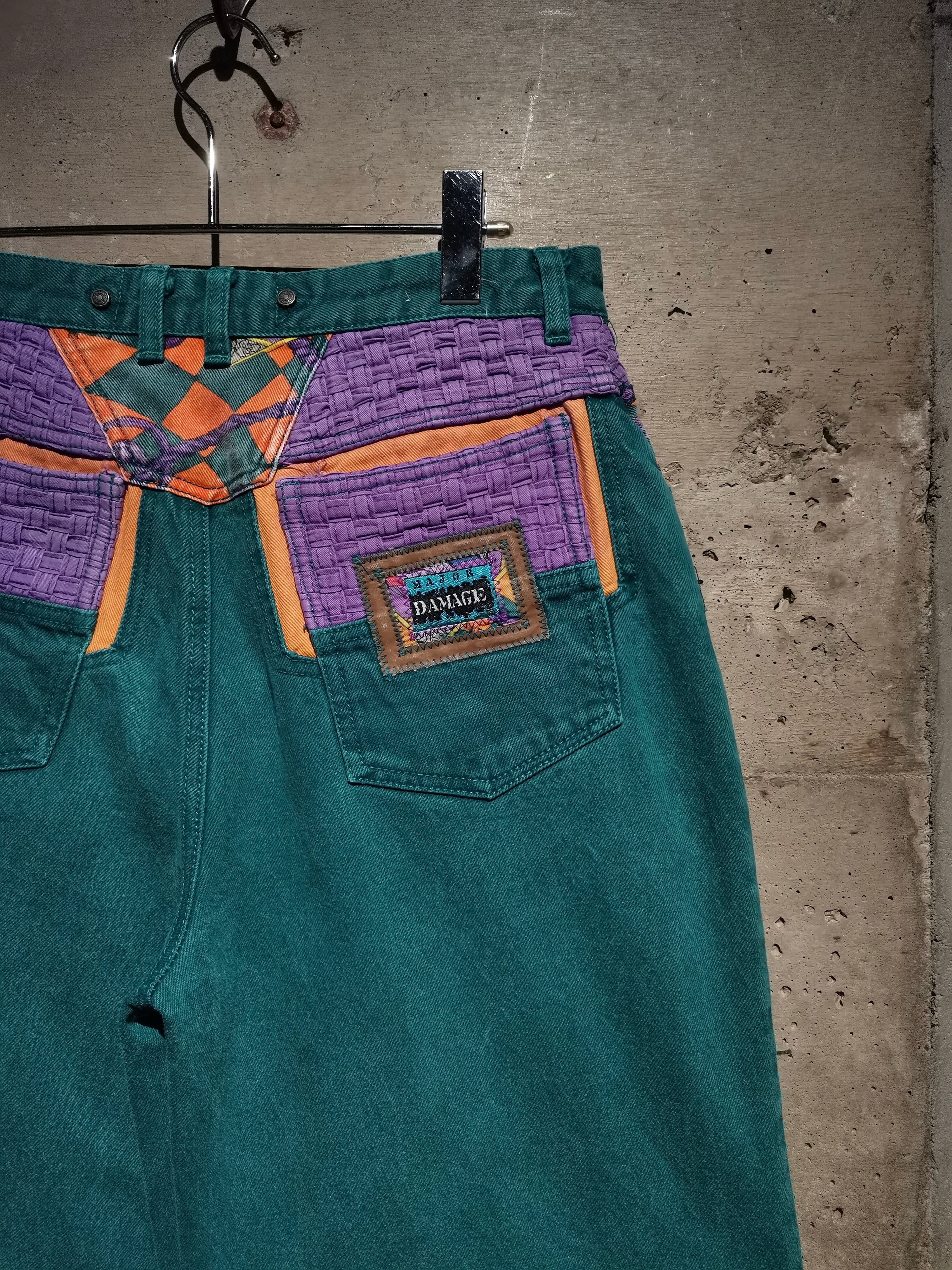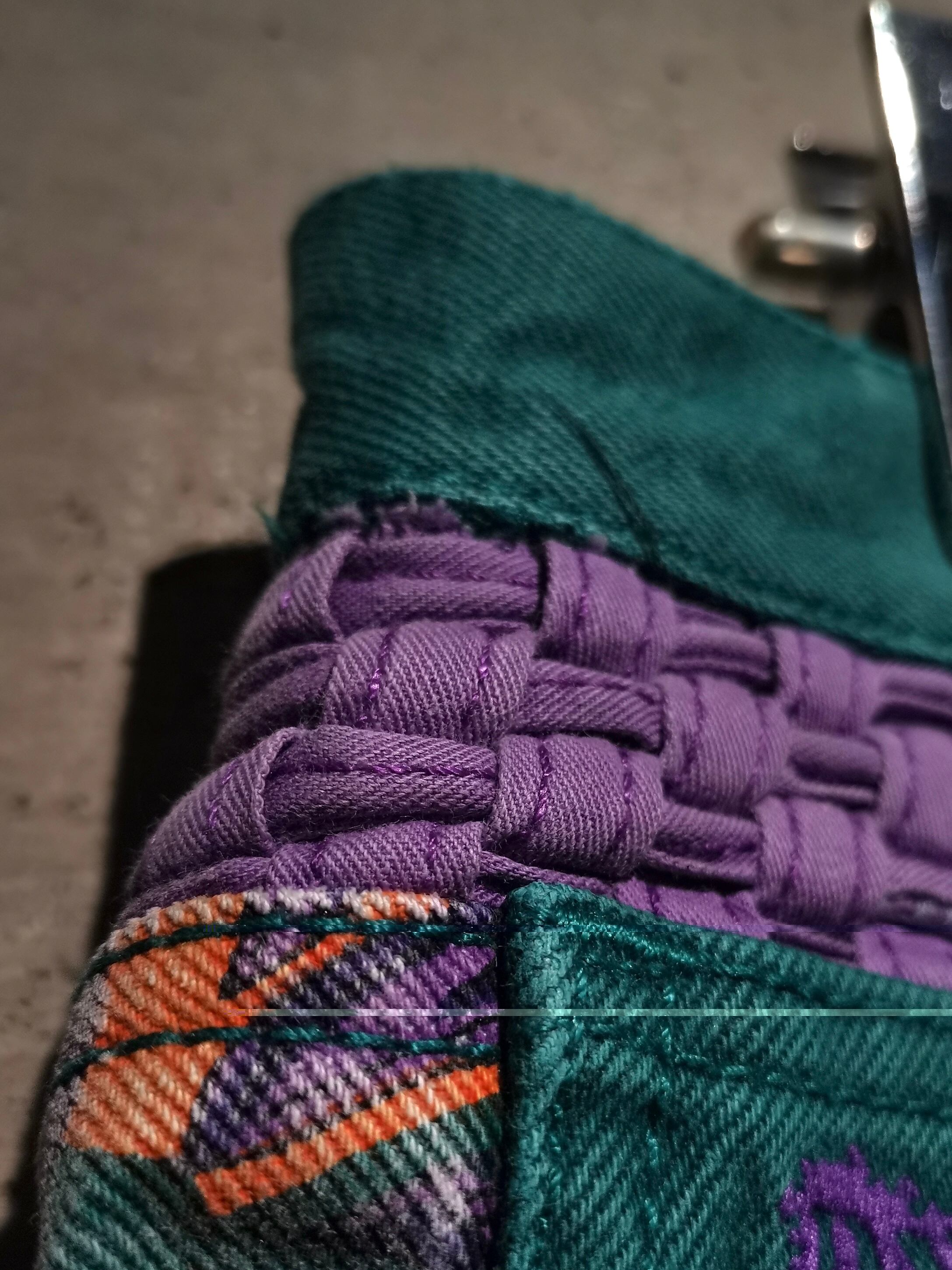 前立て部分にはオレンジのデニムにブラウンのフェイクレザー切り替え、フロント、バックポケット部分には紫の編み込みやスカーフ風の柄をあしらったデニム生地で切り替えた、唯一無二のデザイン性を誇る1本。
