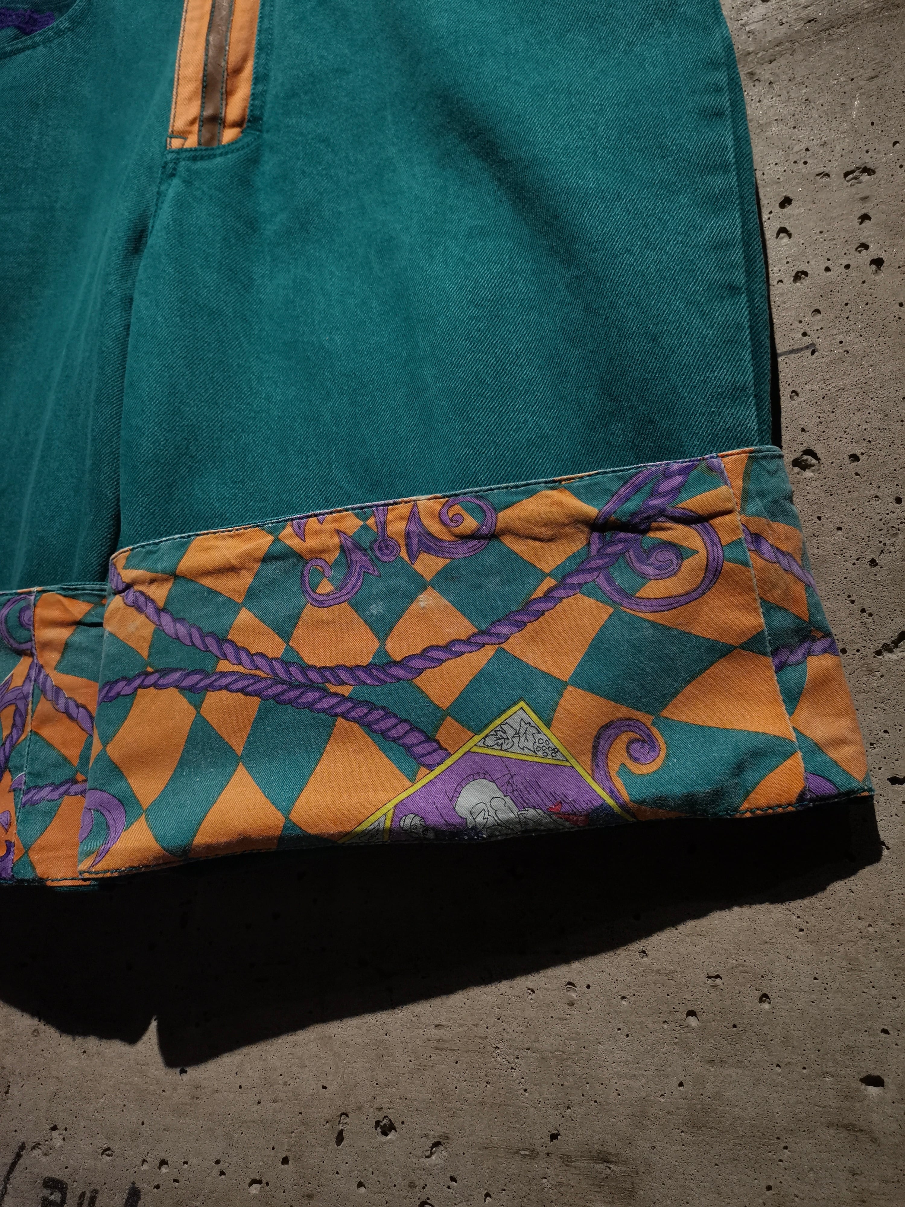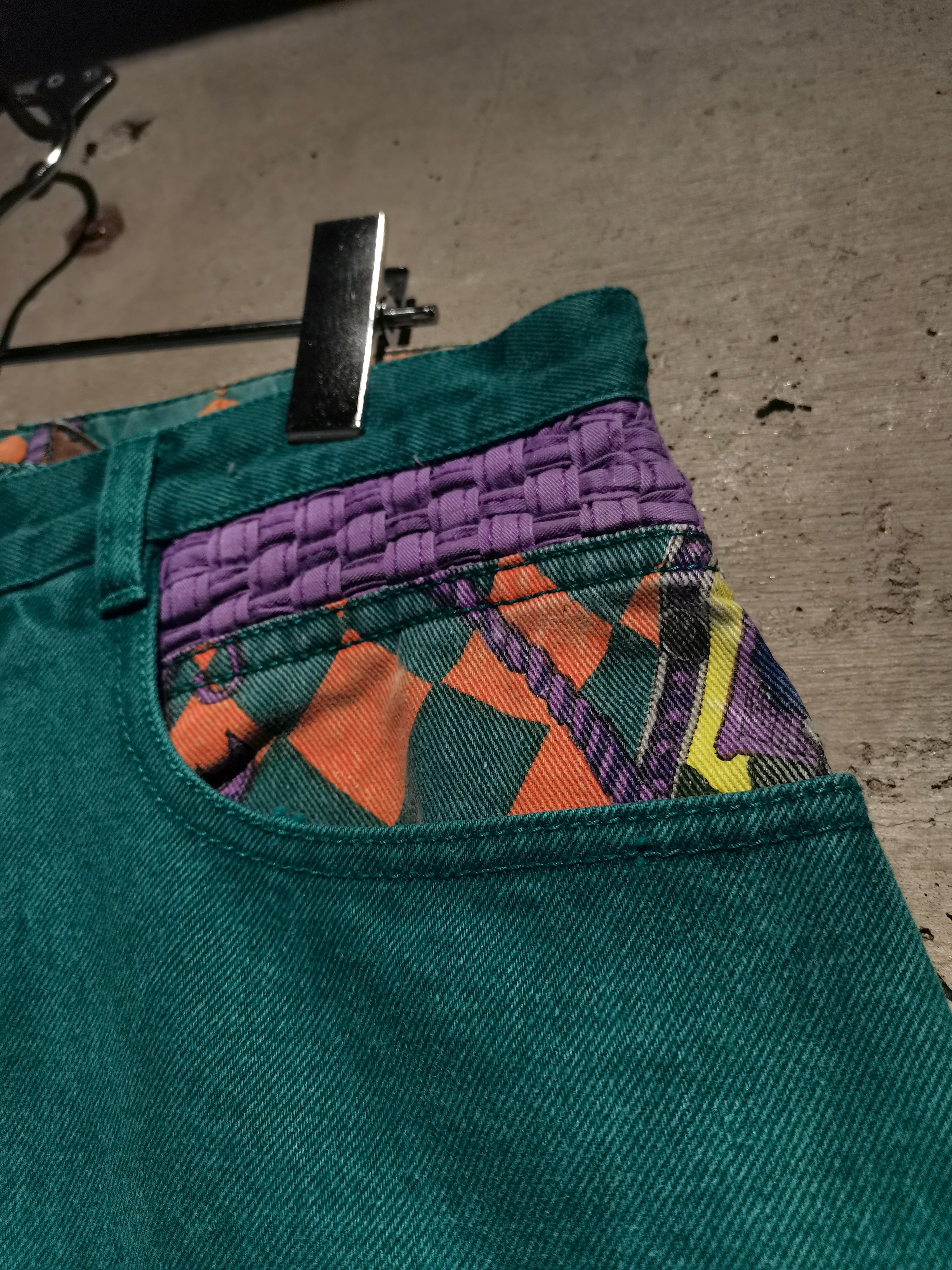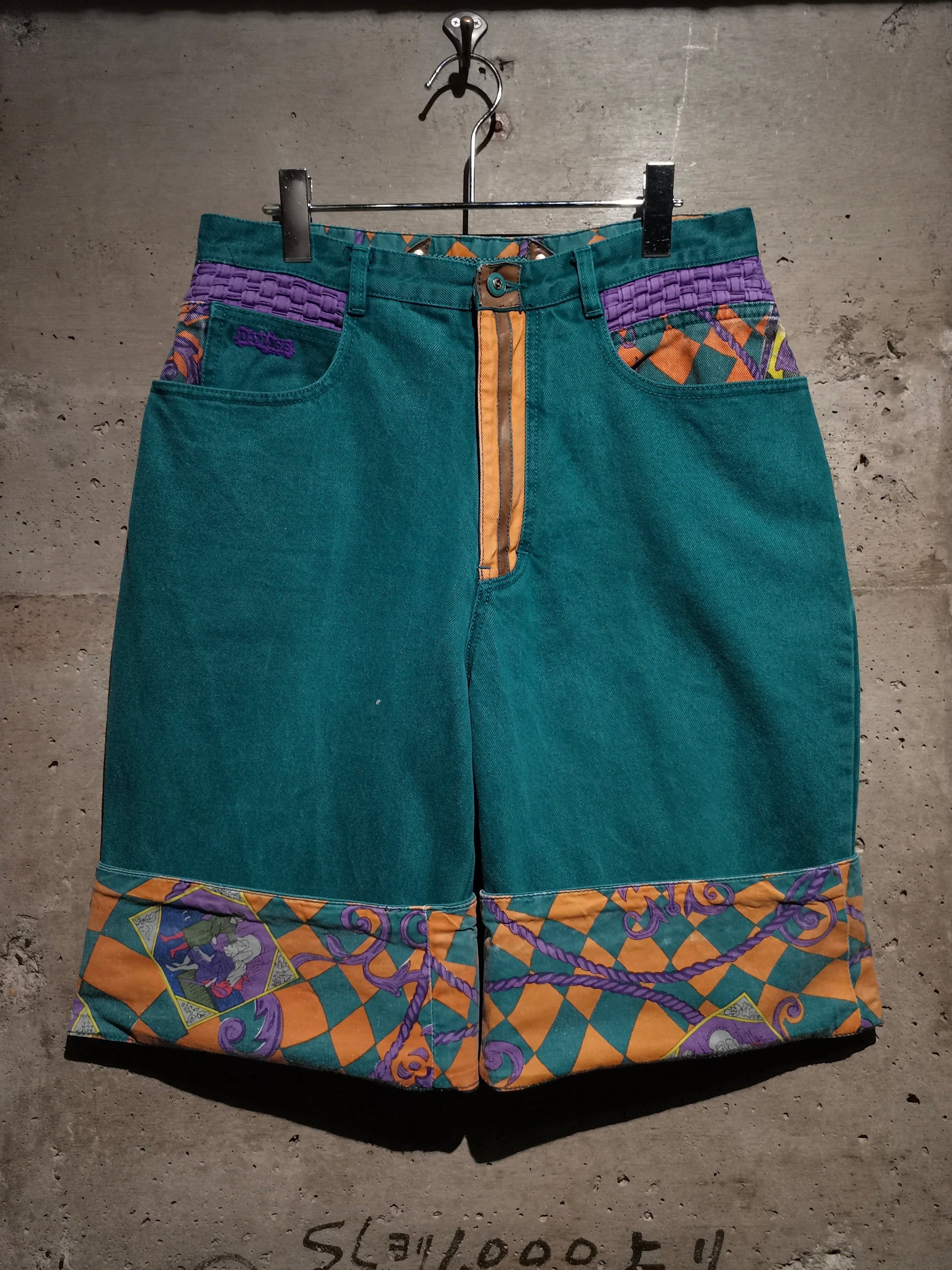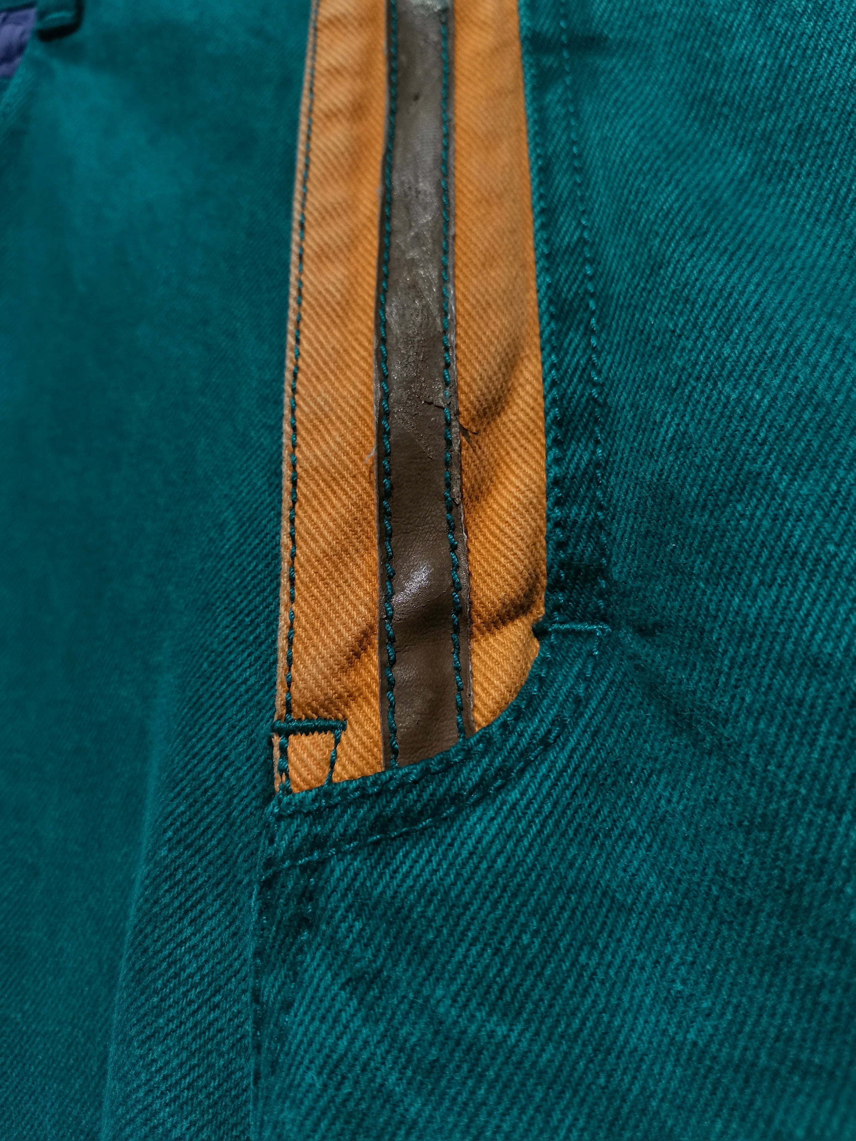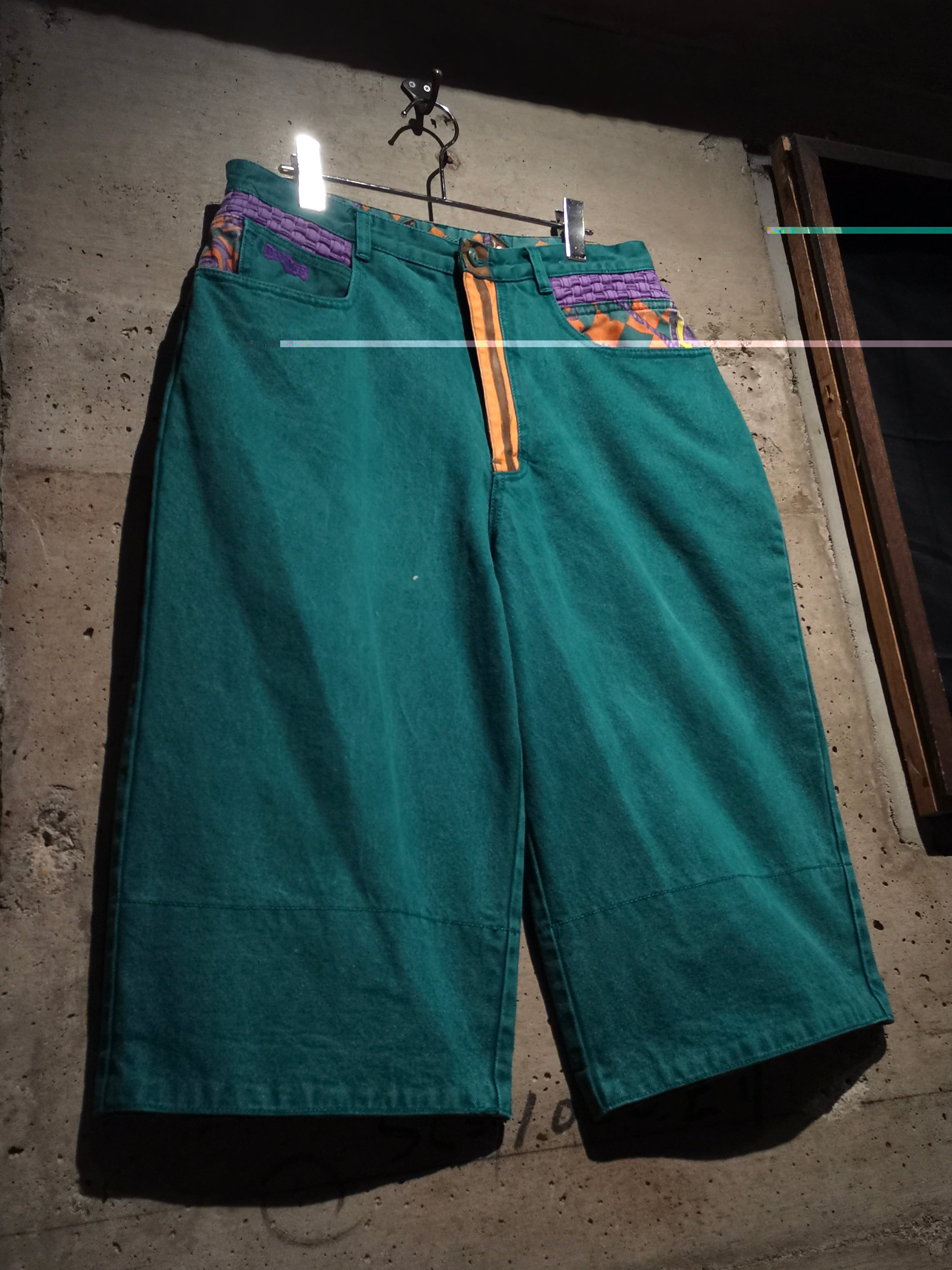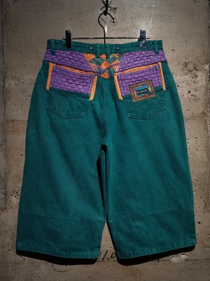 エメラルドグリーンのボディをベースに、マルチカラーの切り替えを施したデニムショーツ。