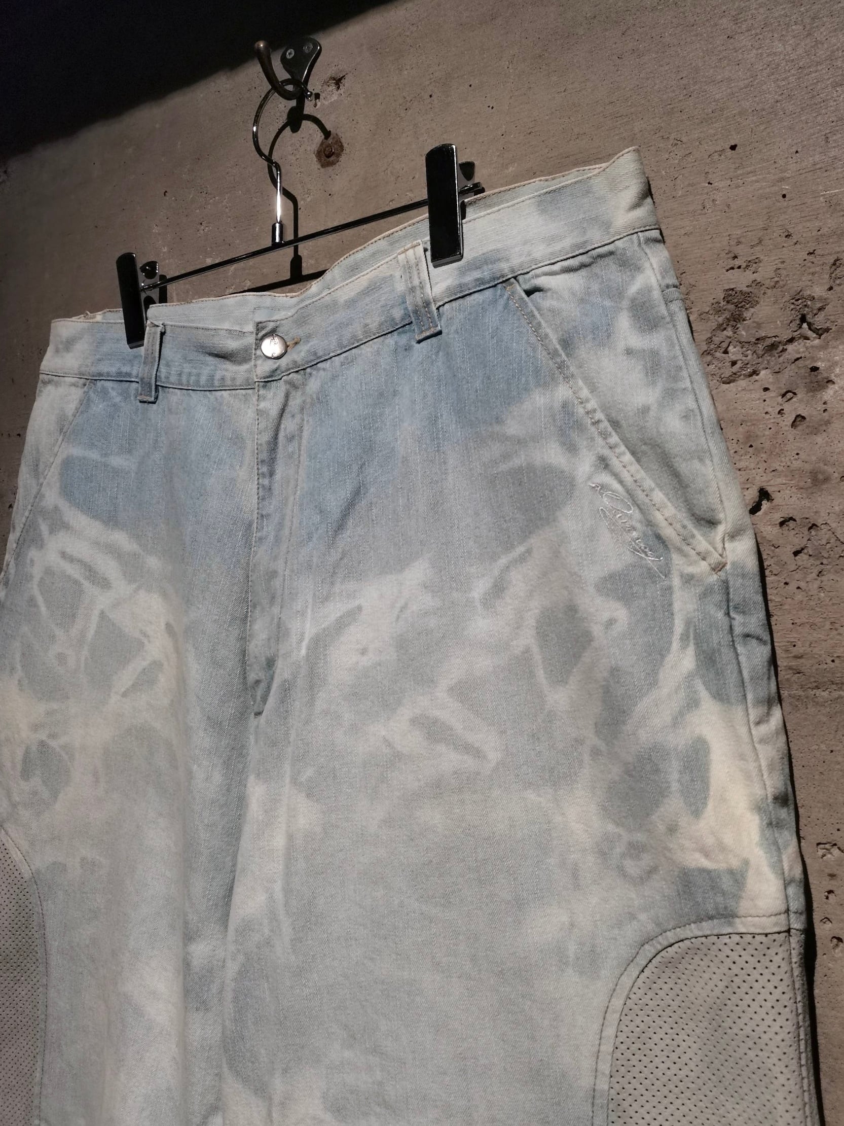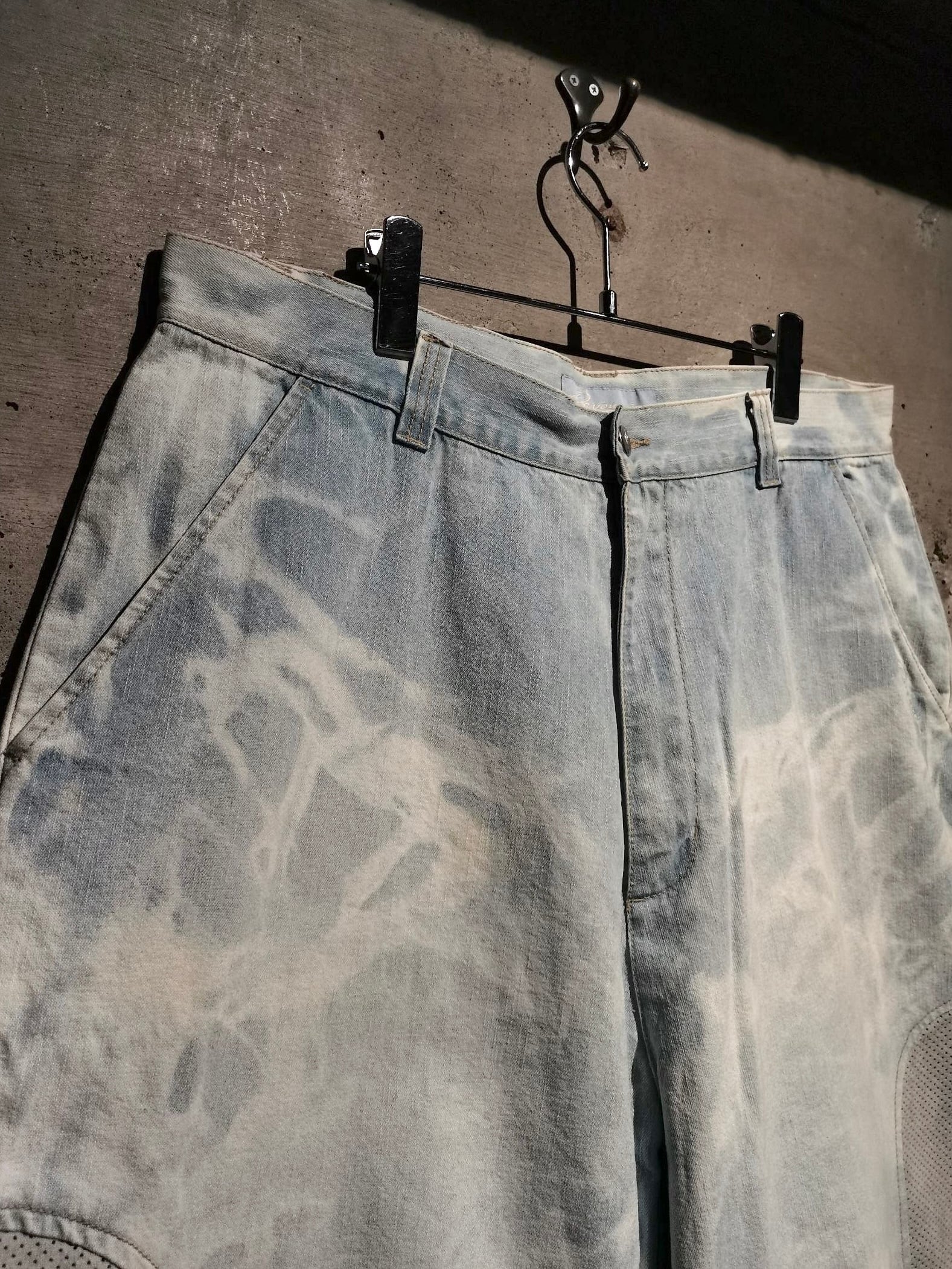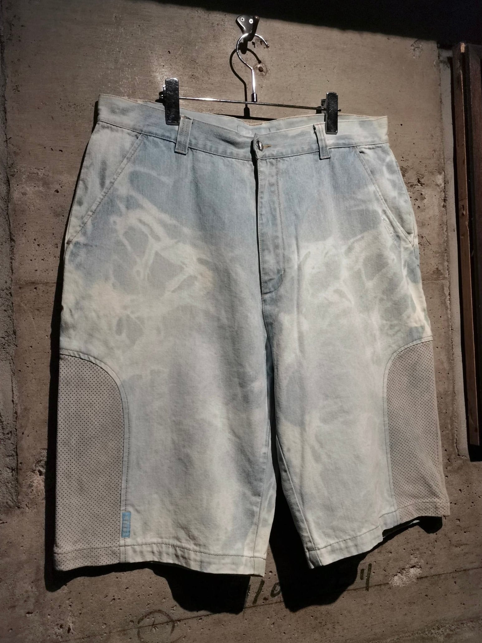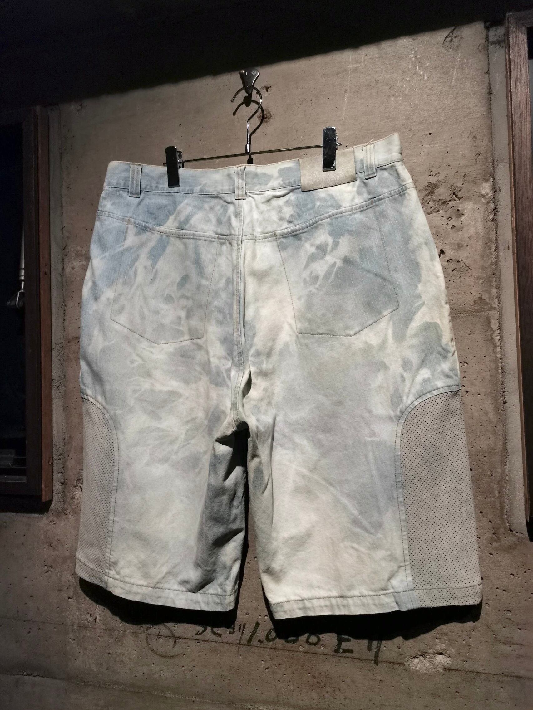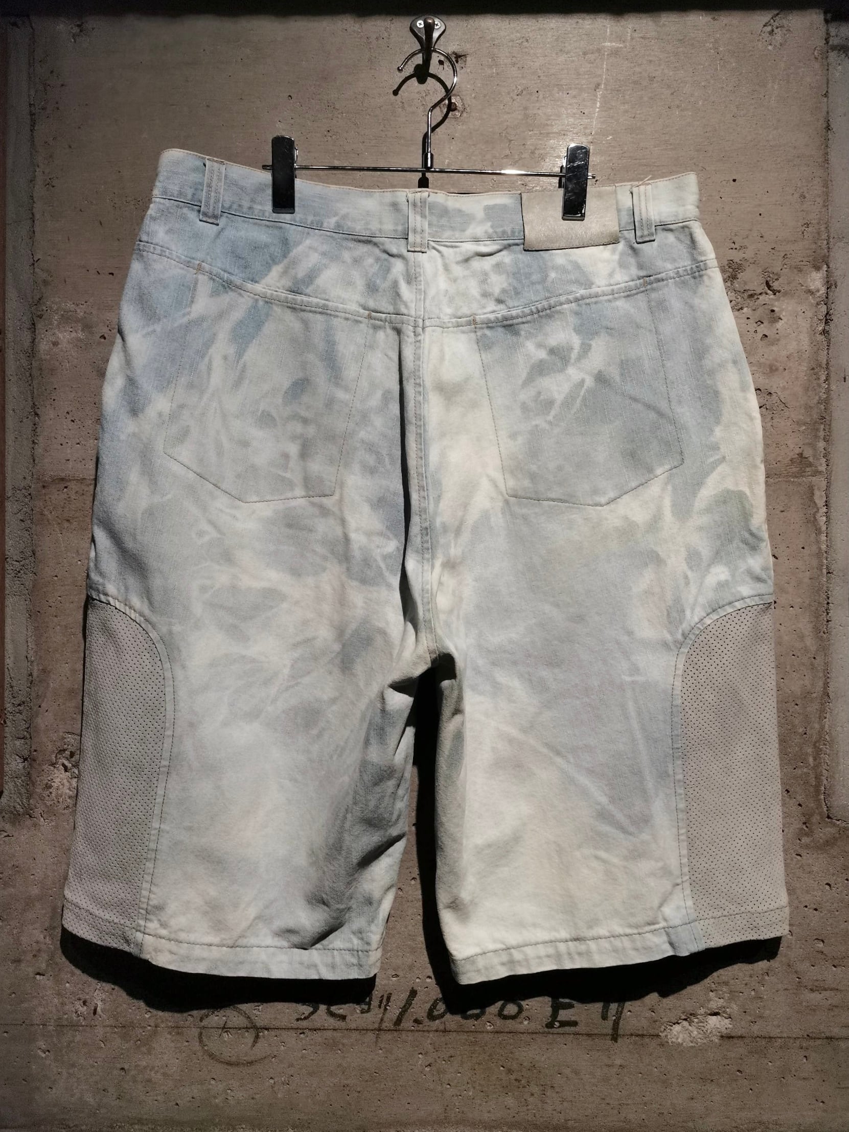 全体にブリーチ加工によるデザインが効いたアイスブルーのデニムボディに、両サイドにパンチングレザーを切り替えた当ブランドらしい異素材使いが光るショーツ。