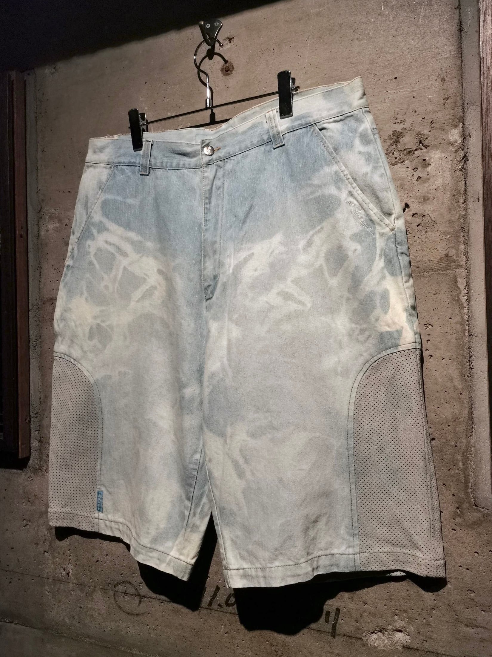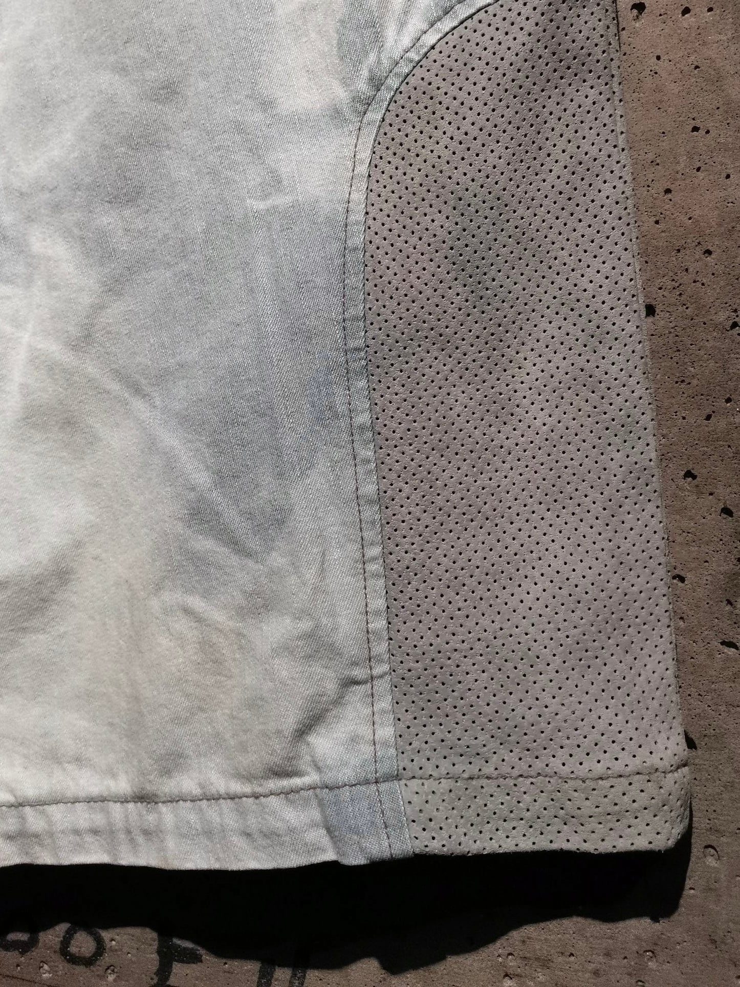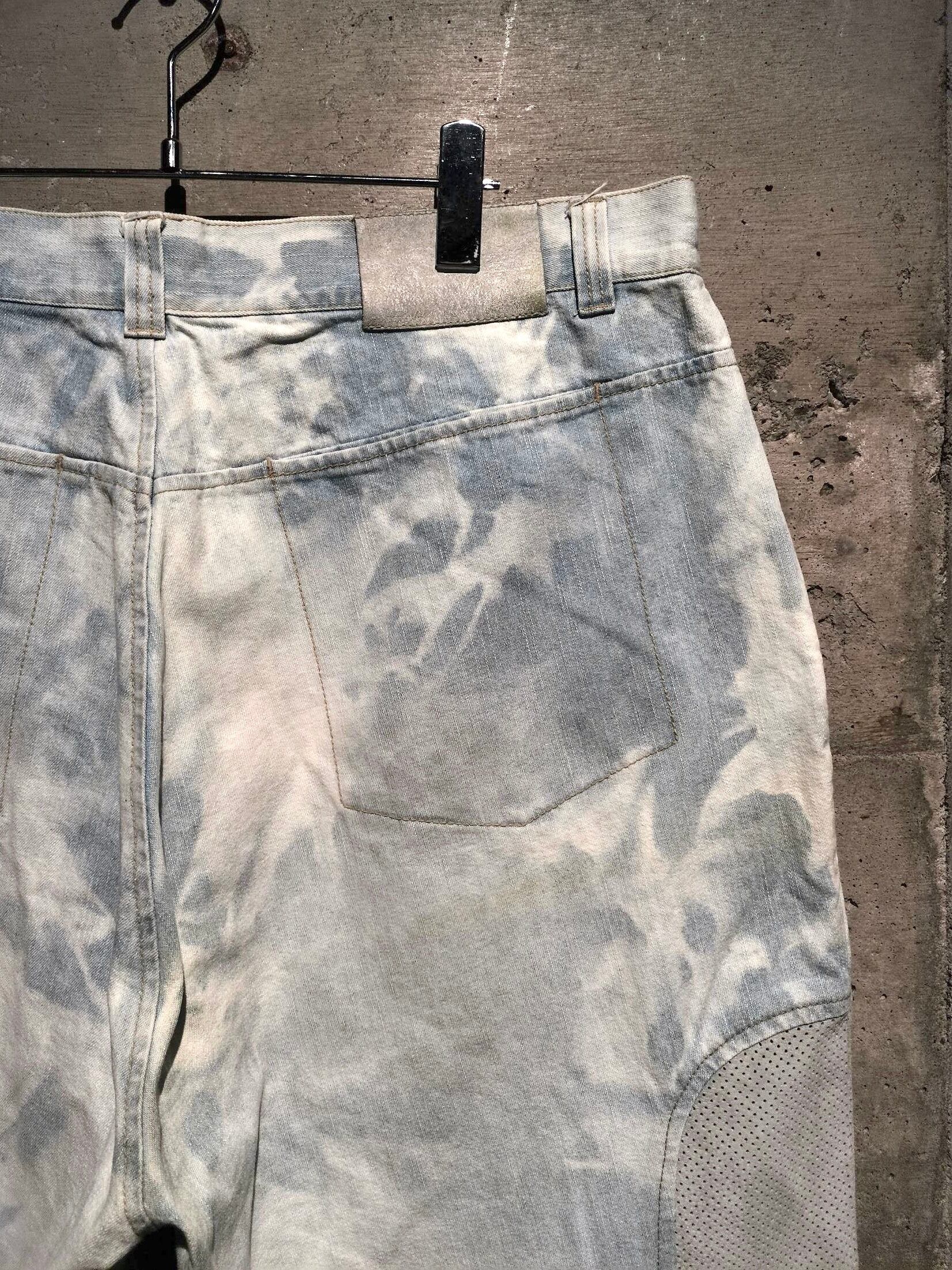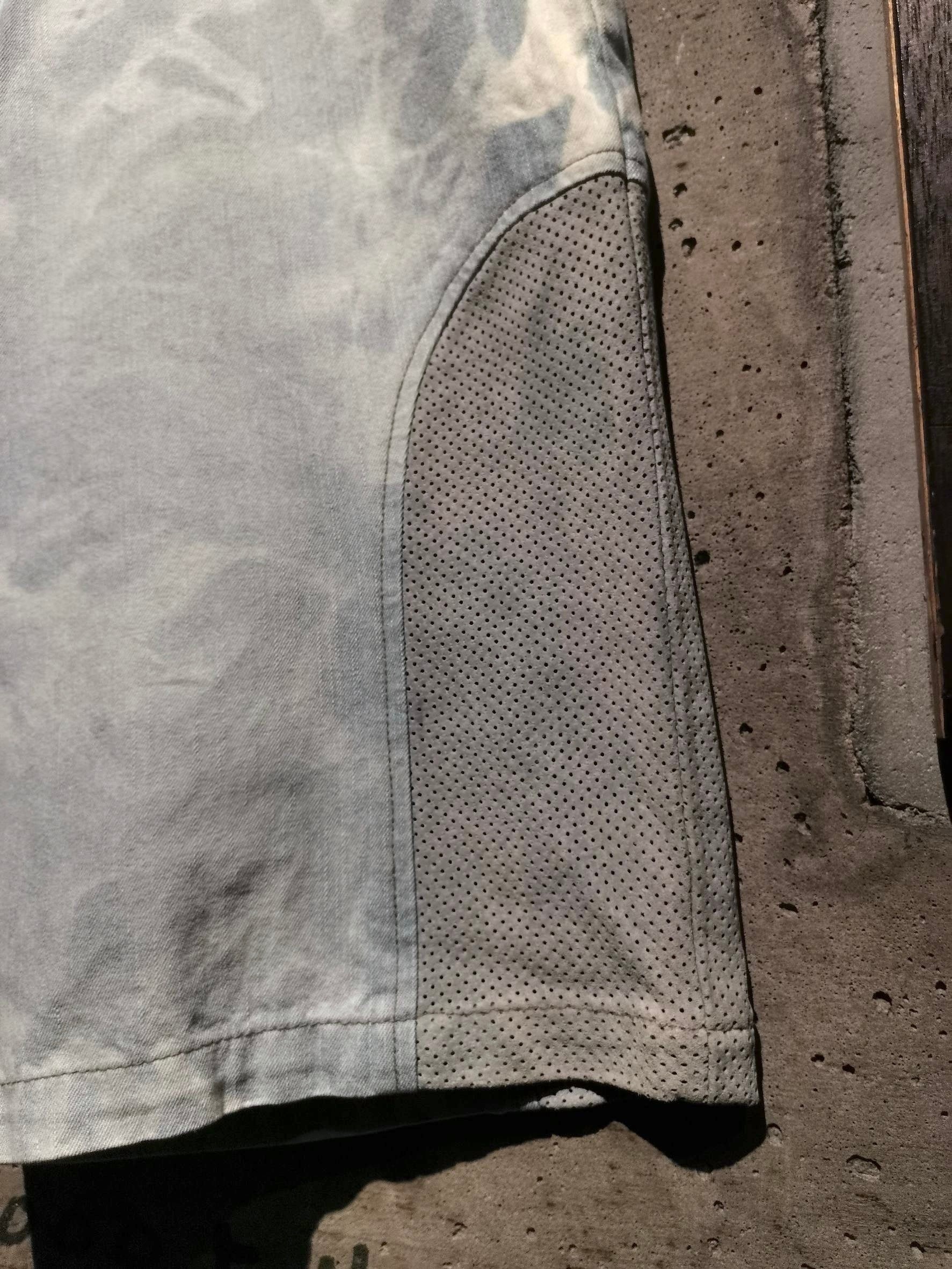 全体にブリーチ加工によるデザインが効いたアイスブルーのデニムボディに、両サイドにパンチングレザーを切り替えた当ブランドらしい異素材使いが光るショーツ。