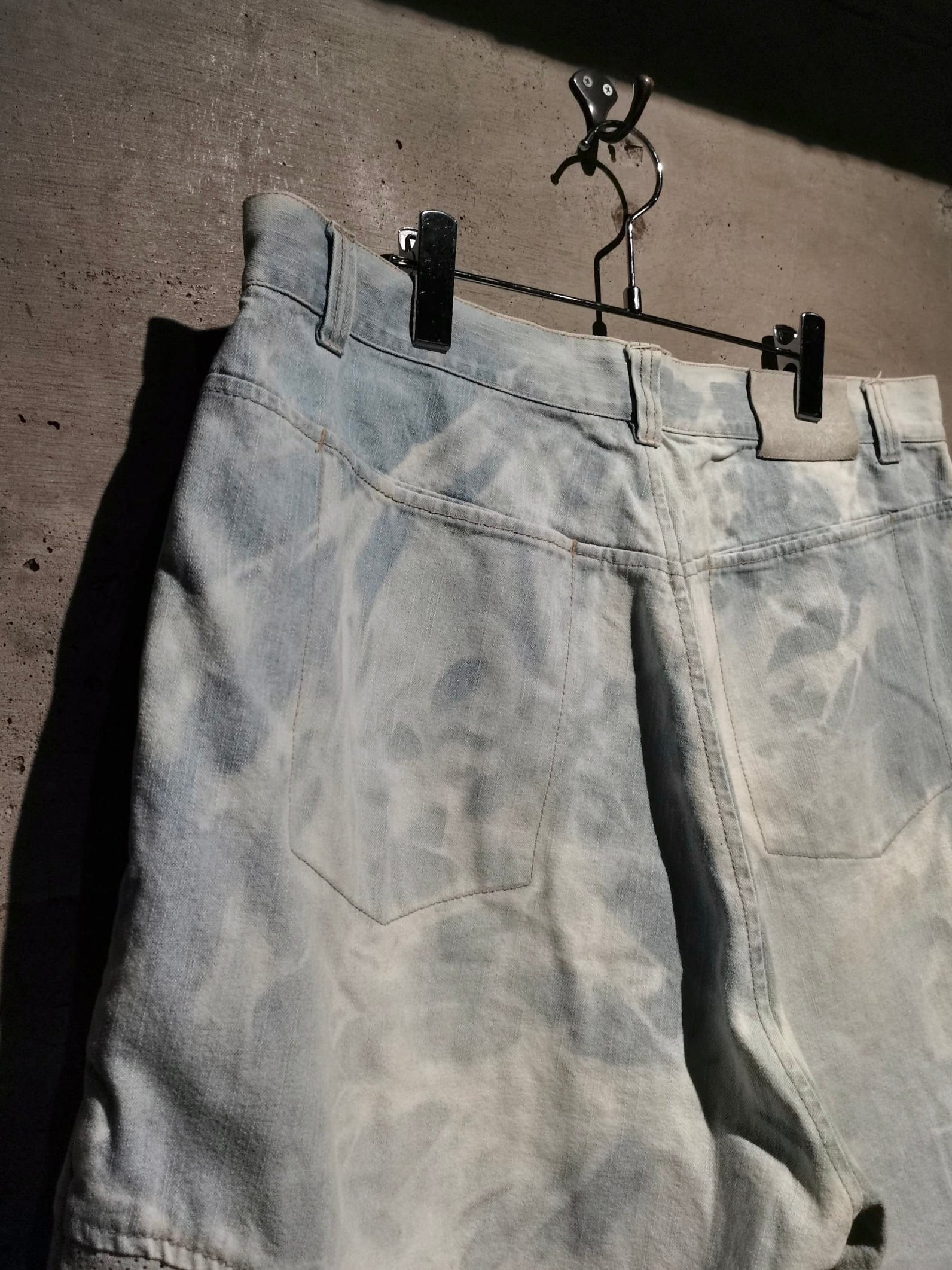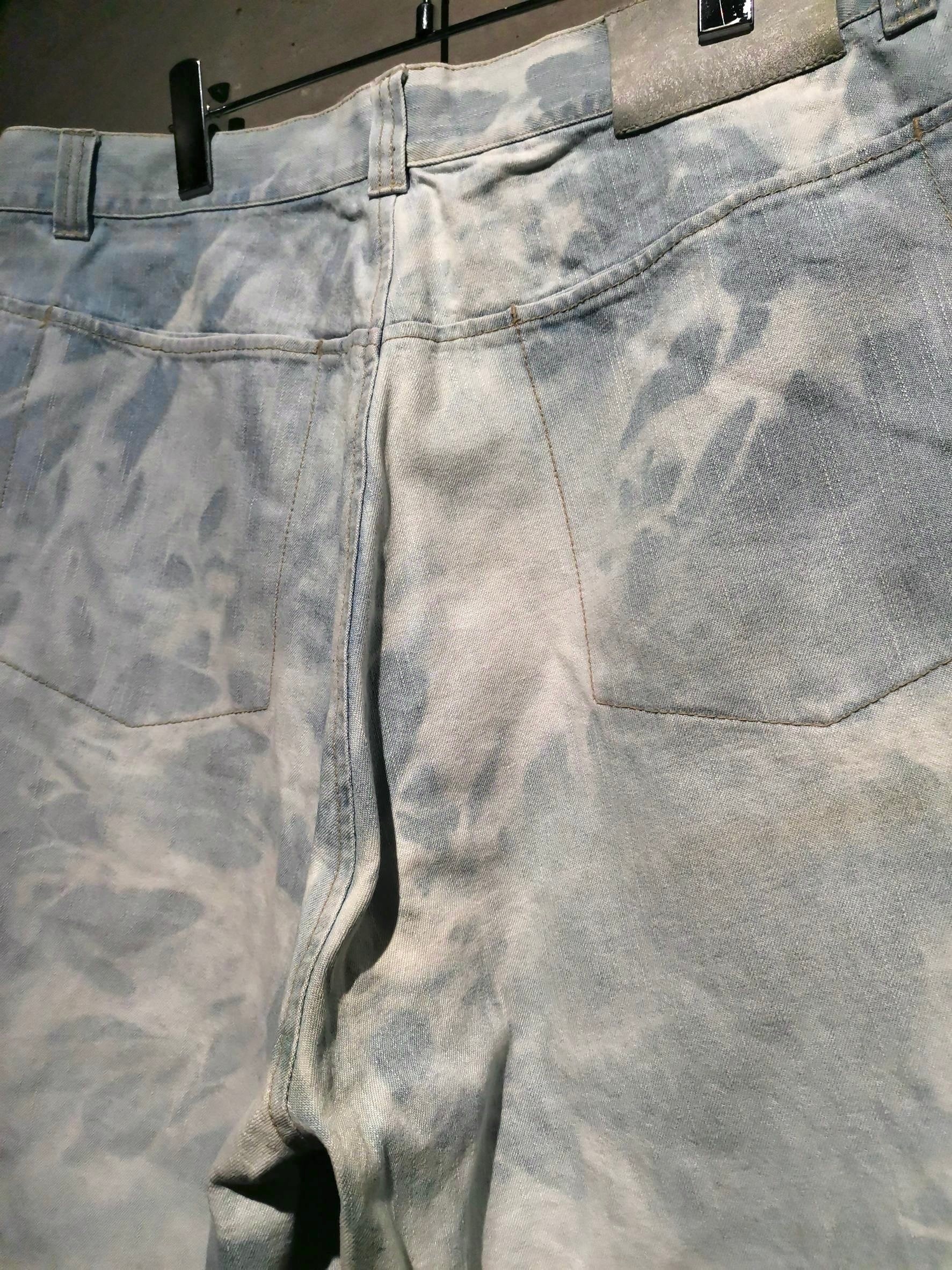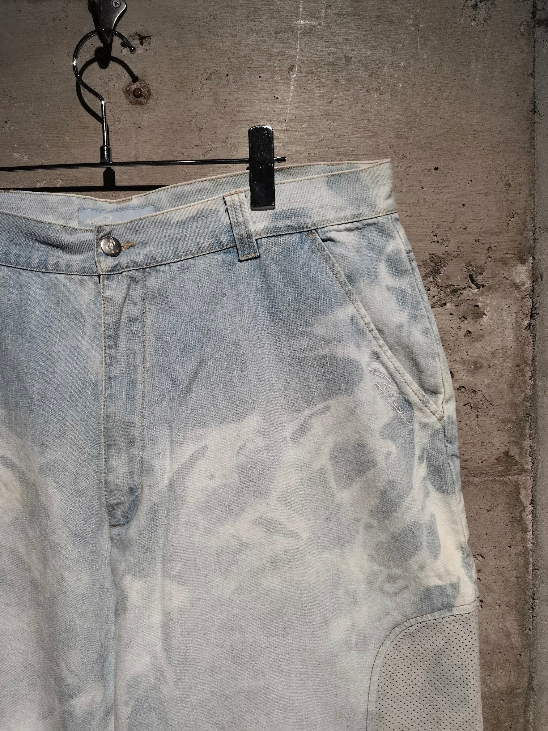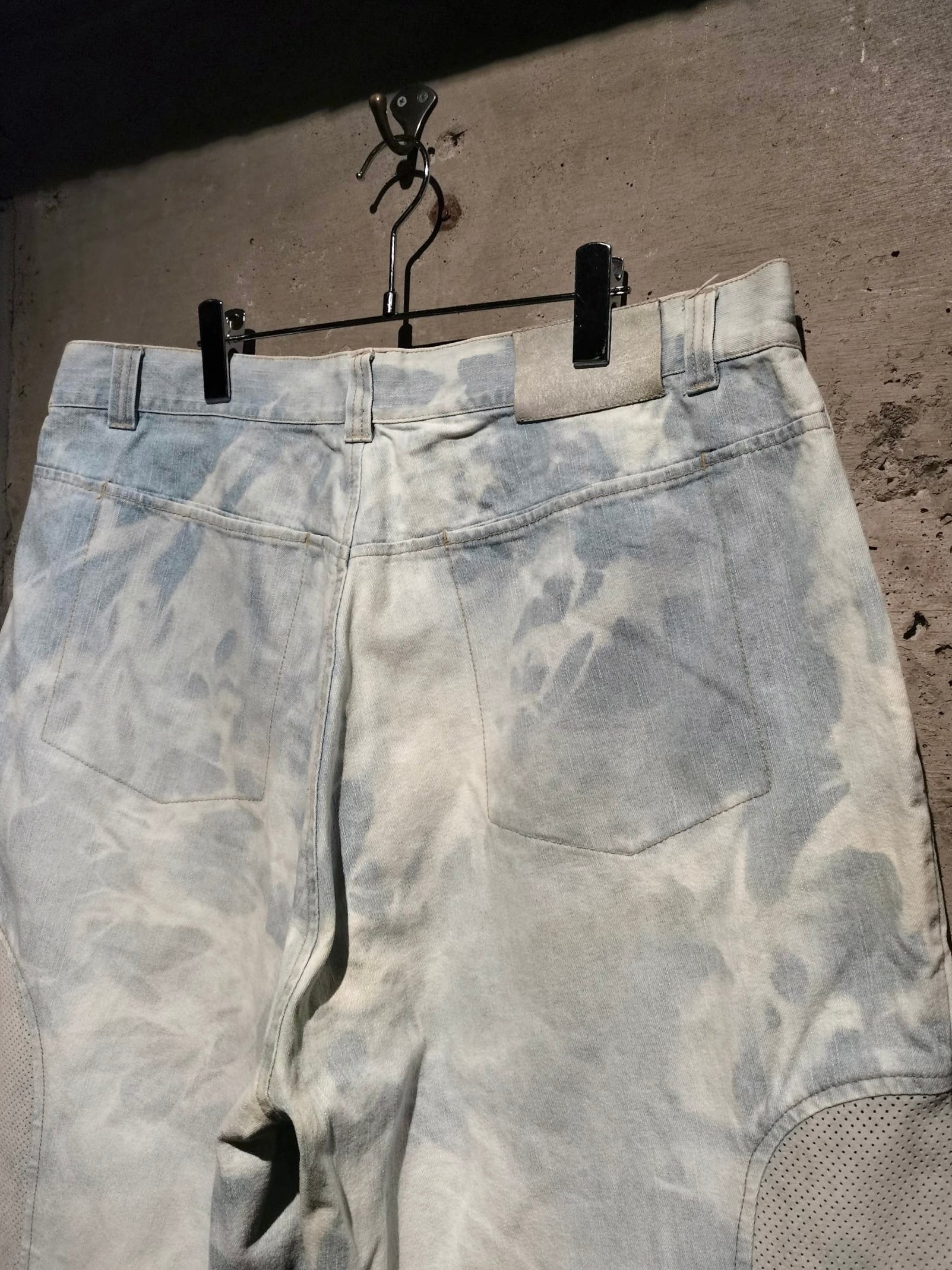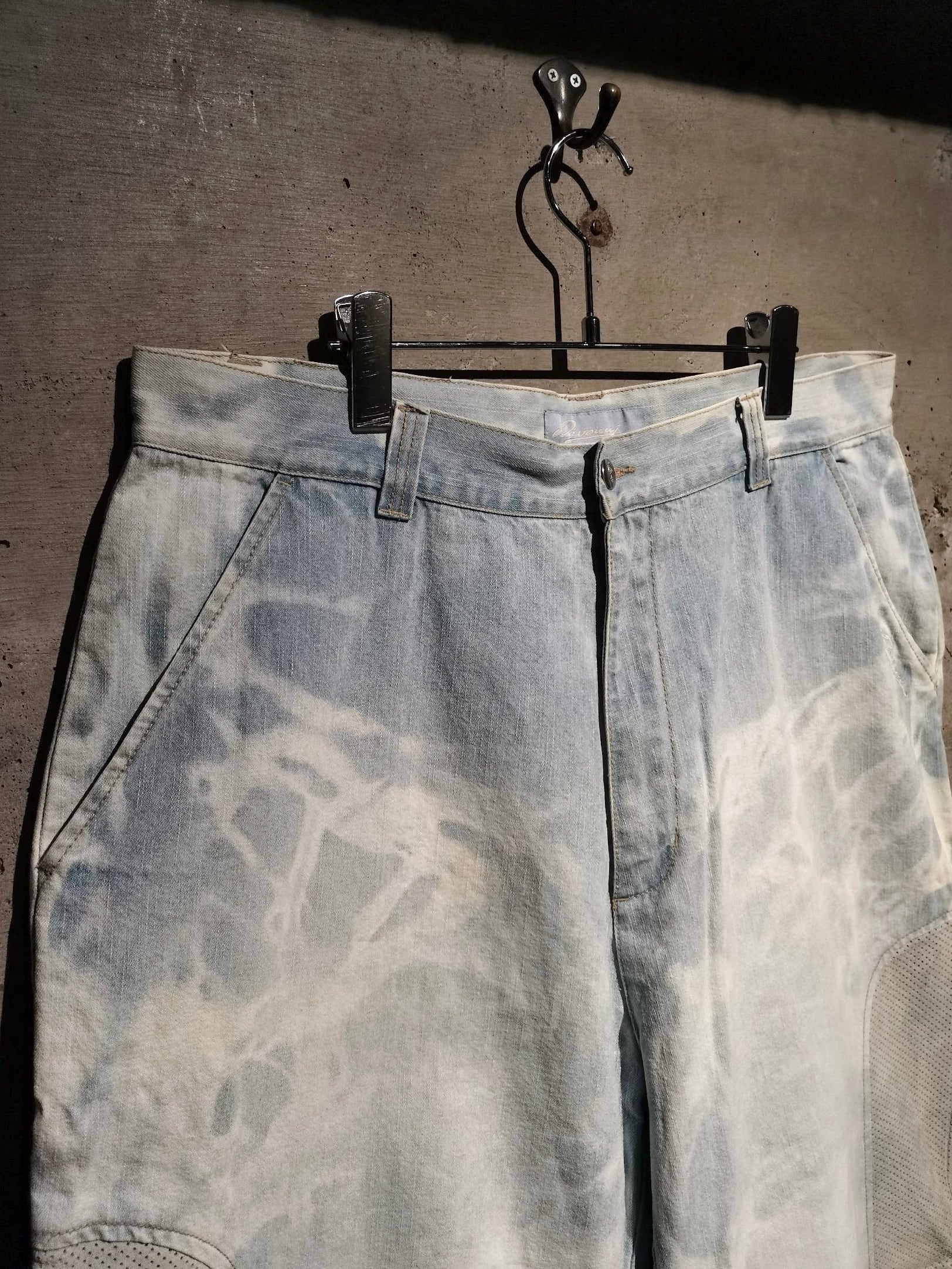 全体にブリーチ加工によるデザインが効いたアイスブルーのデニムボディに、両サイドにパンチングレザーを切り替えた当ブランドらしい異素材使いが光るショーツ。