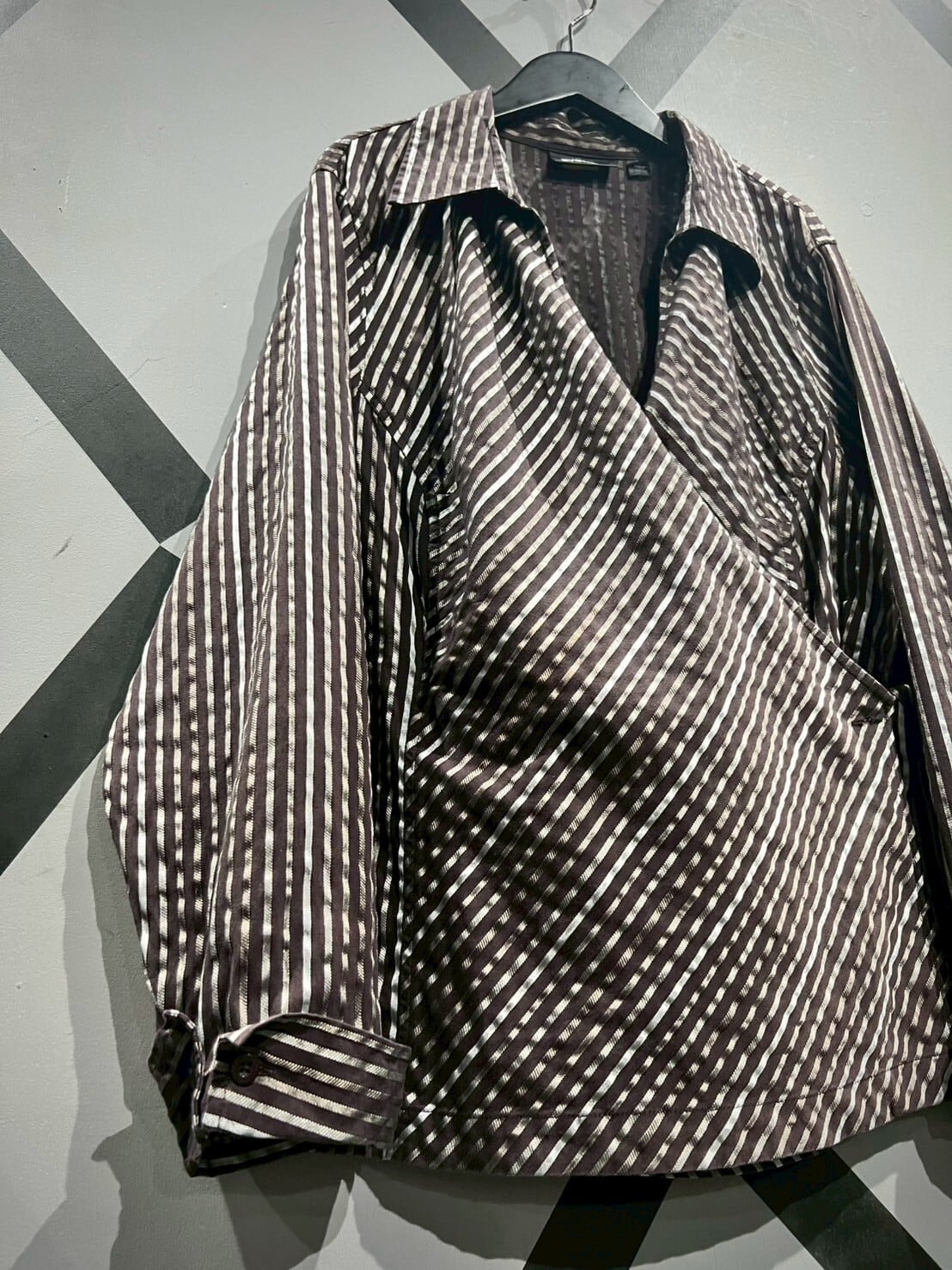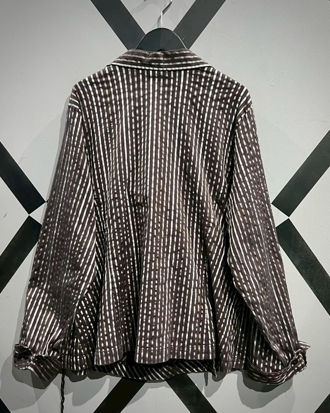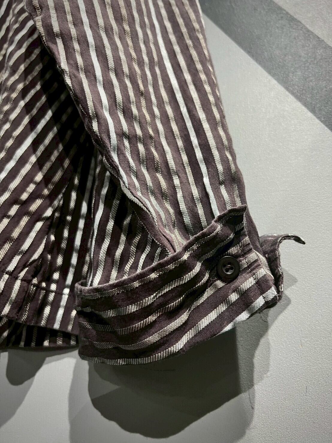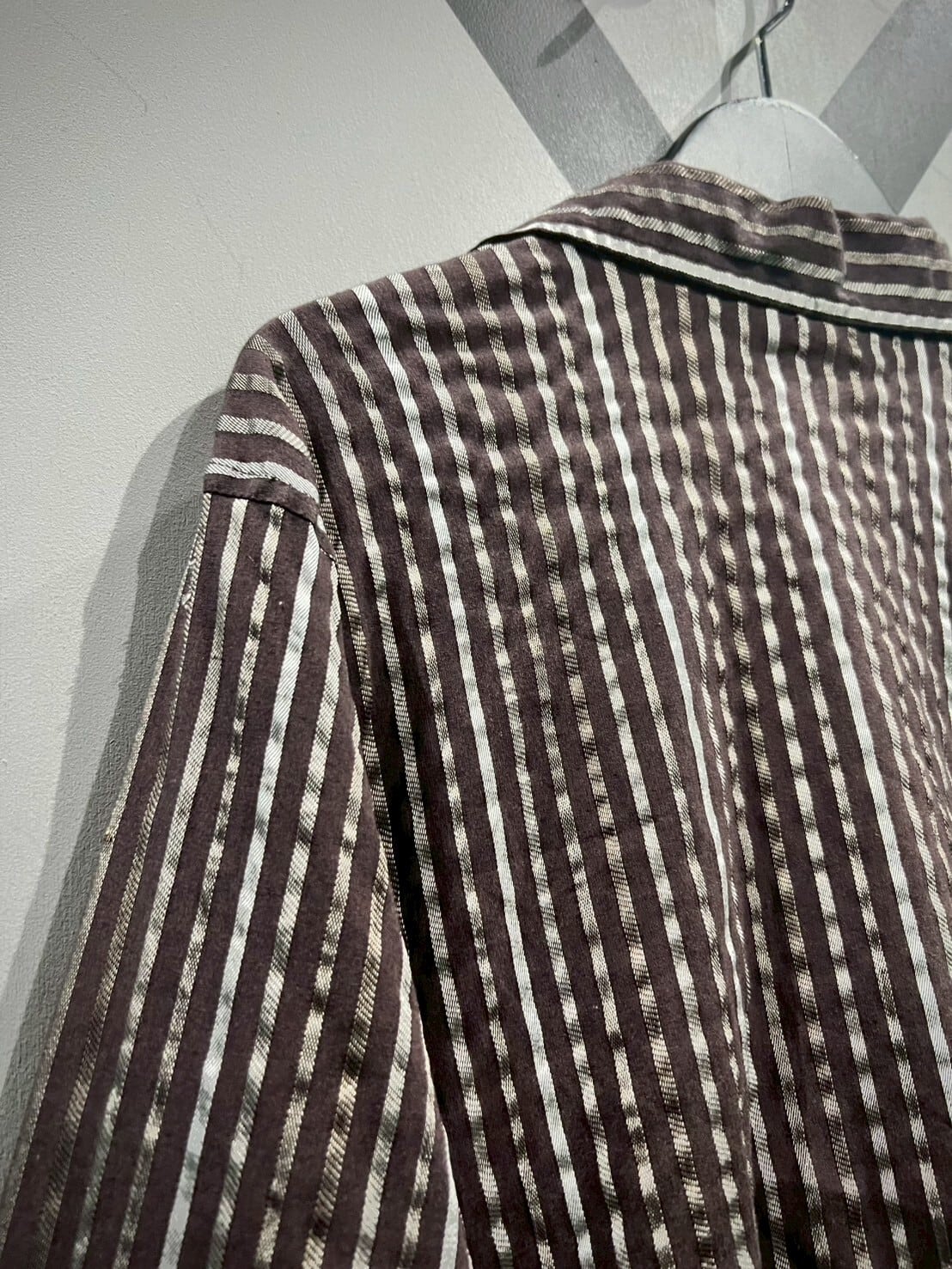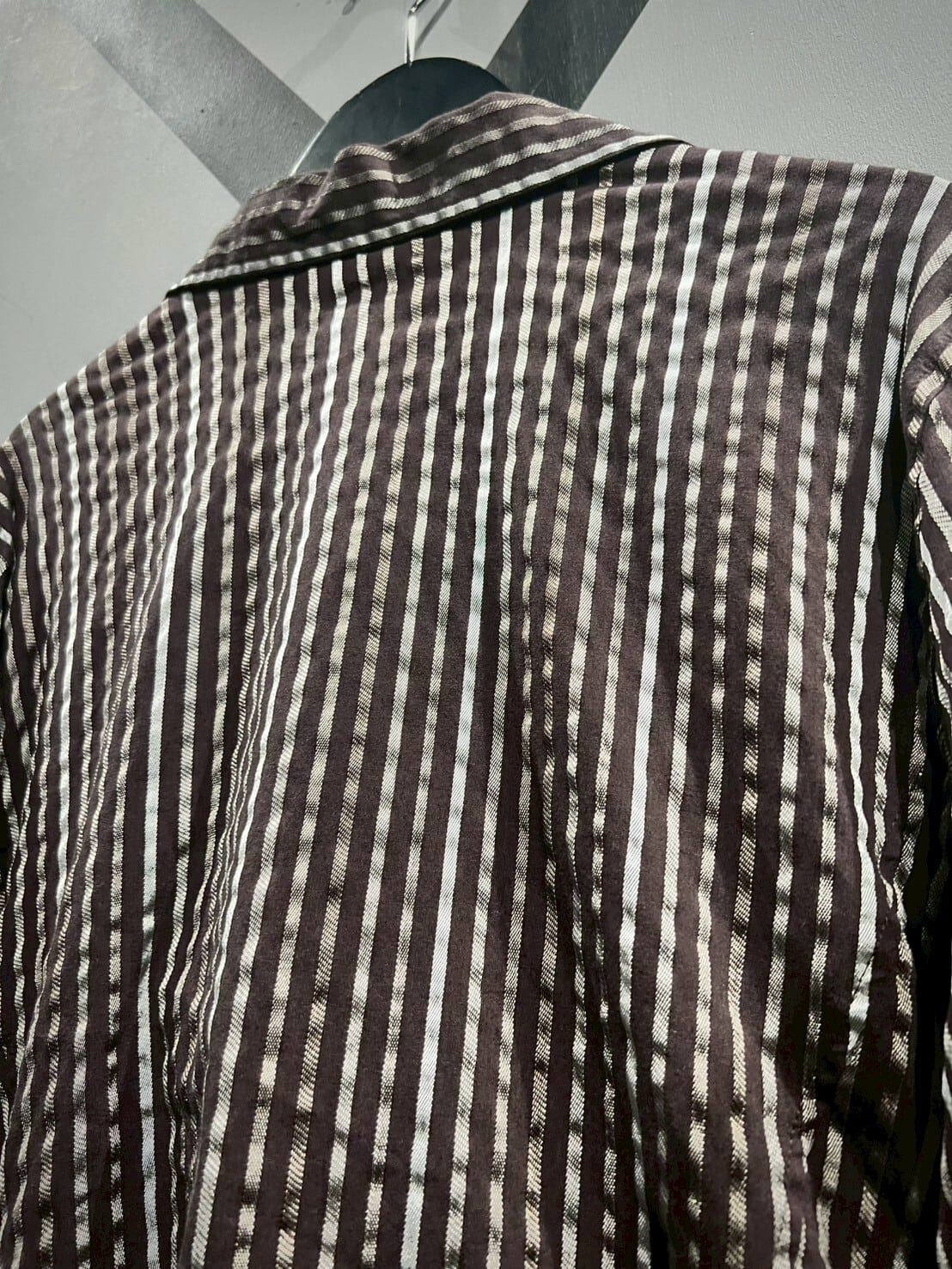 コットン×ポリのブラウンのボディに、メタリックなシルバーでストライプを載せた生地を用いて、日本の和の"甚兵衛羽織"をデザインソースに作られたシャツジャケット。
