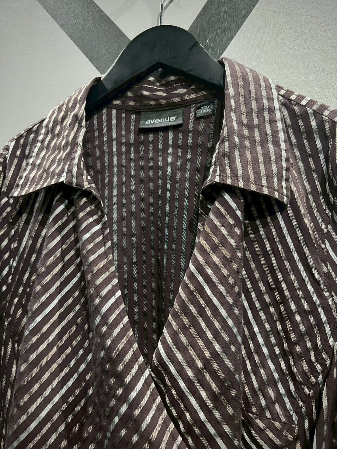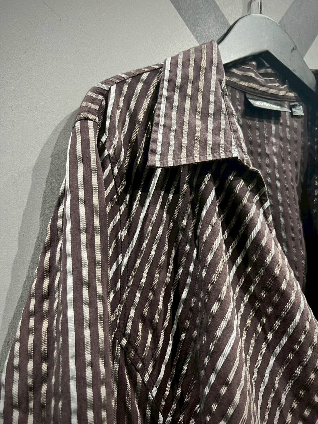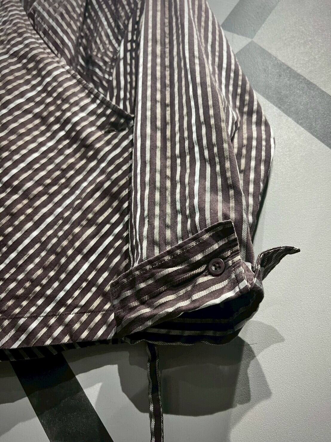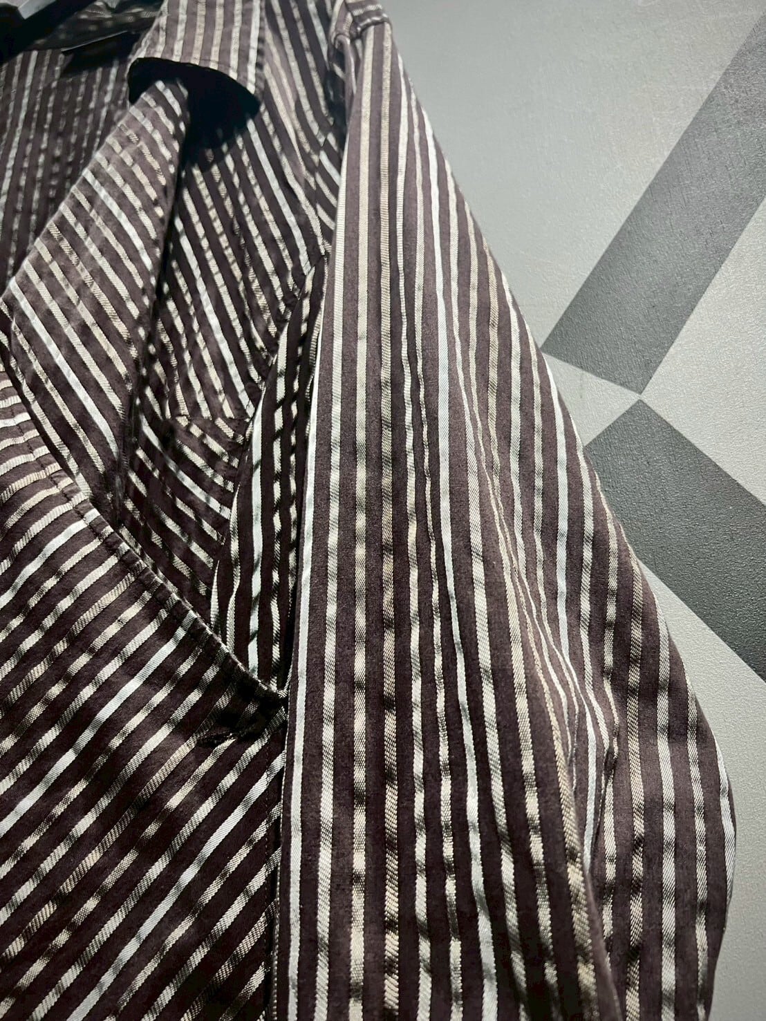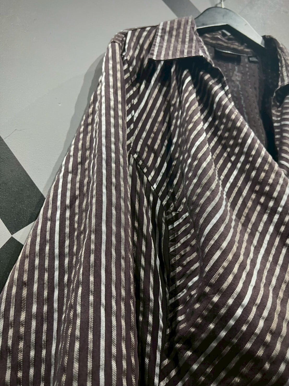コットン×ポリのブラウンのボディに、メタリックなシルバーでストライプを載せた生地を用いて、日本の和の"甚兵衛羽織"をデザインソースに作られたシャツジャケット。