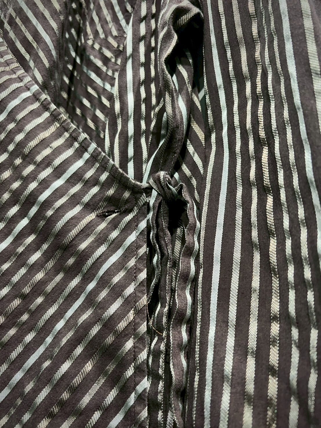 表生地に施された帯と、裏地に付けられた帯をフロントで結び合わせることにより生み出された、着物の様な前身頃のシルエットが"和"なフレーバーを漂わせると共に、襟やウエスト部分の美しいパターンなどの"洋"の要素が掛け合わされたデザインバランスが素晴らしい、、、