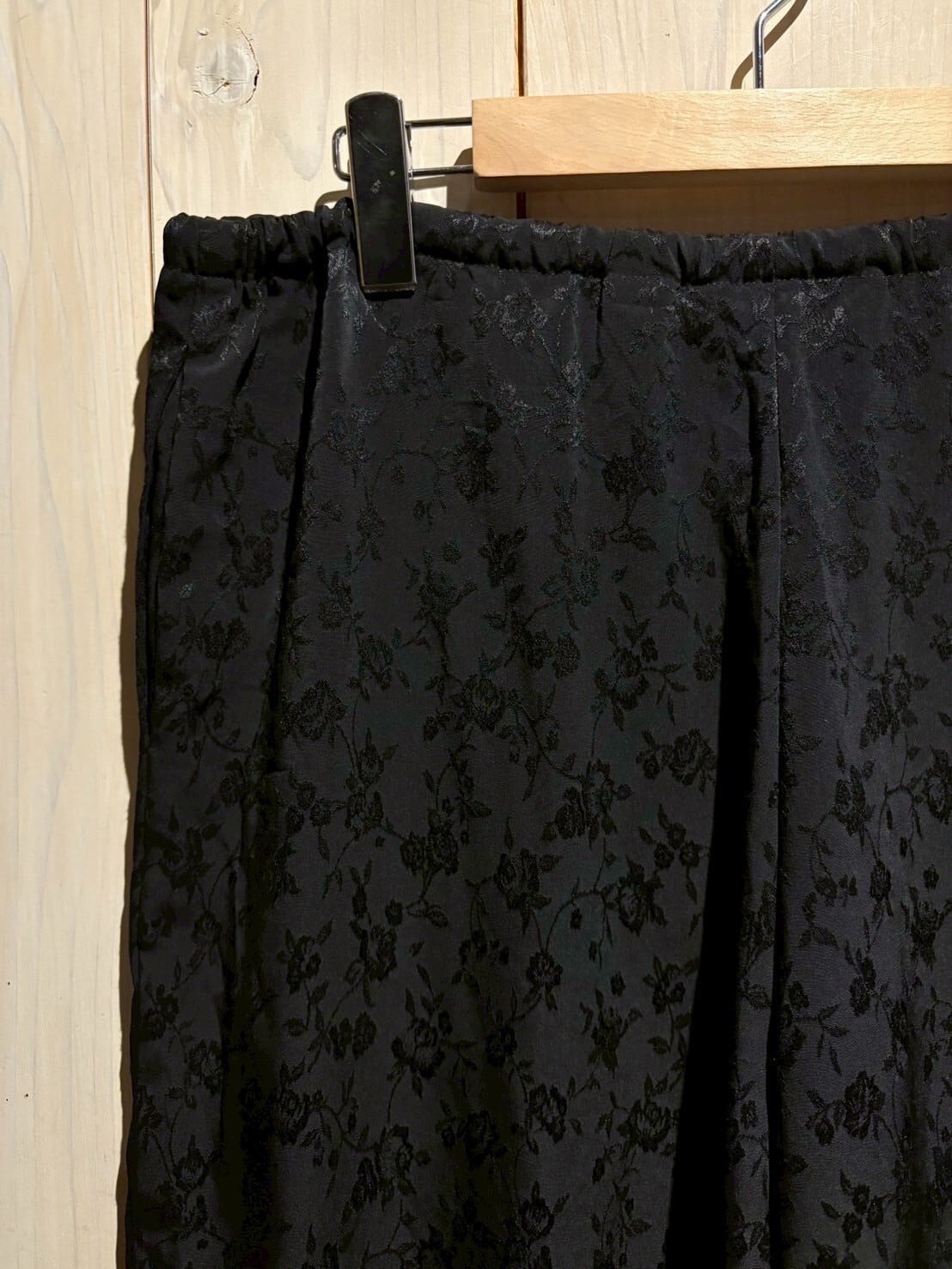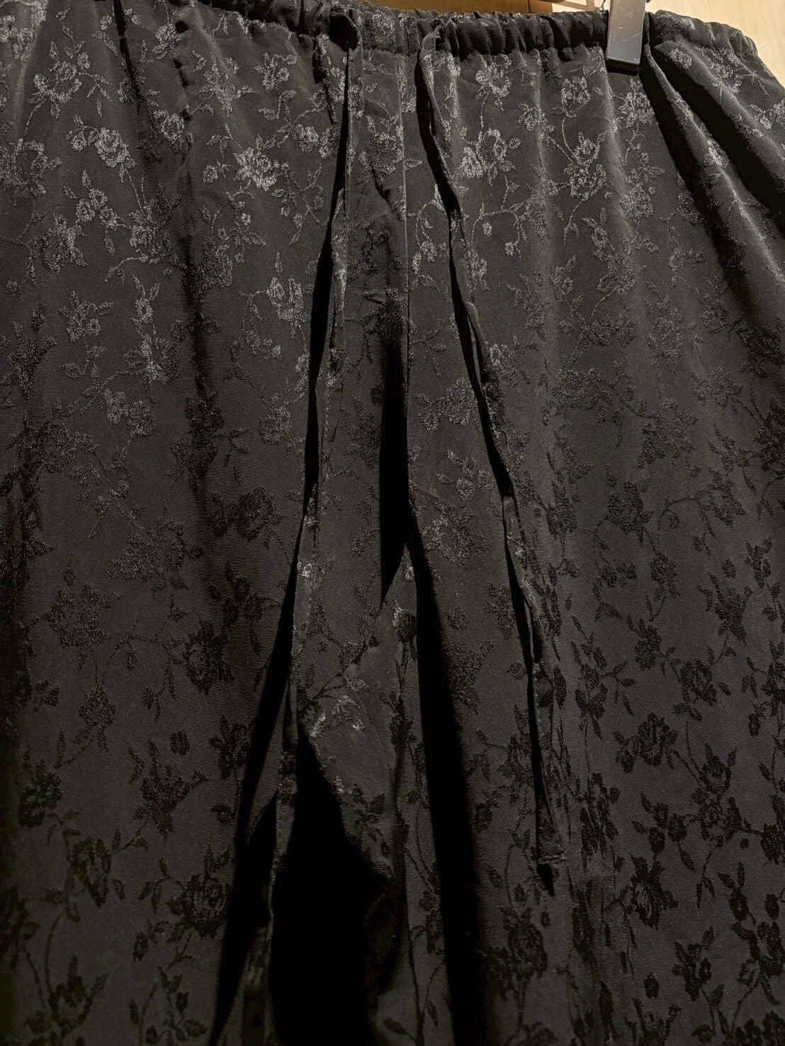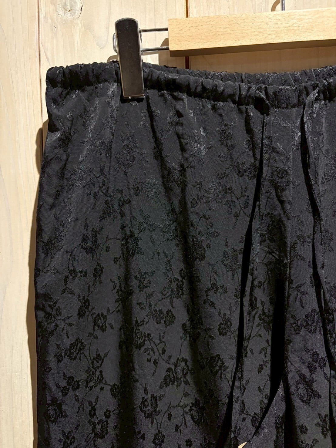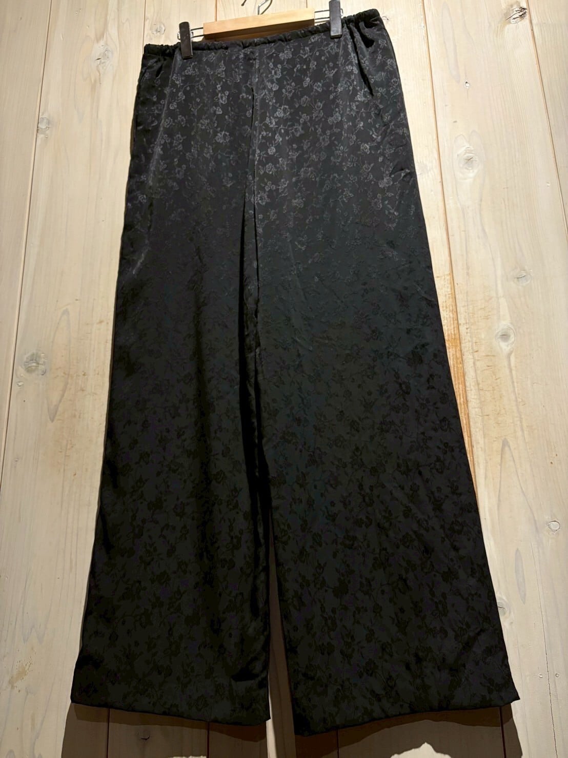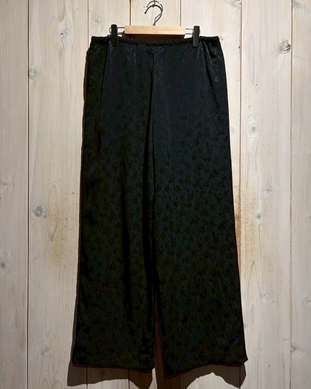 サラリと軽やかな質感のポリボディに、花柄を載せたイージーパンツ。