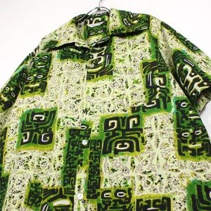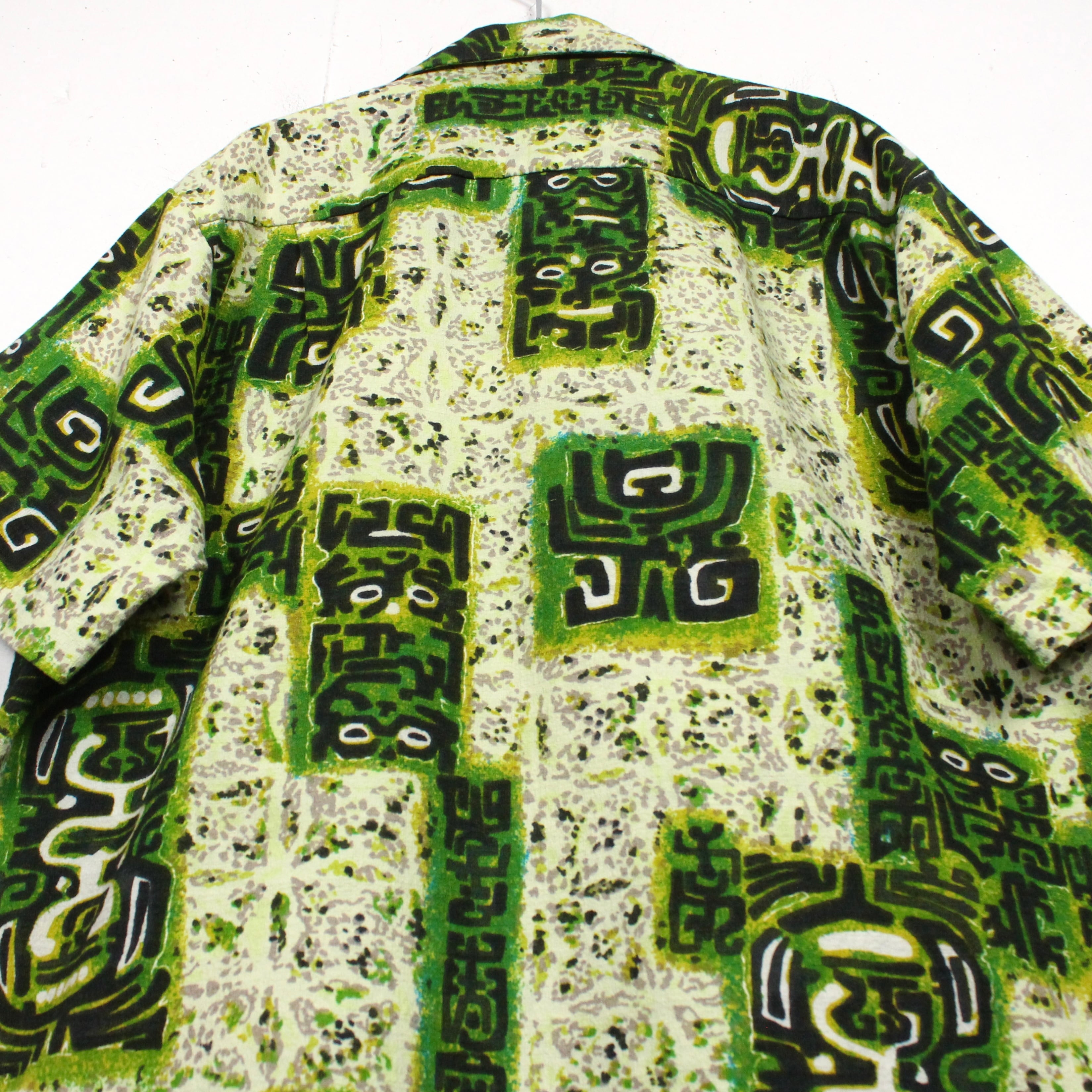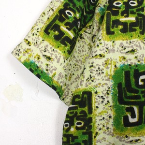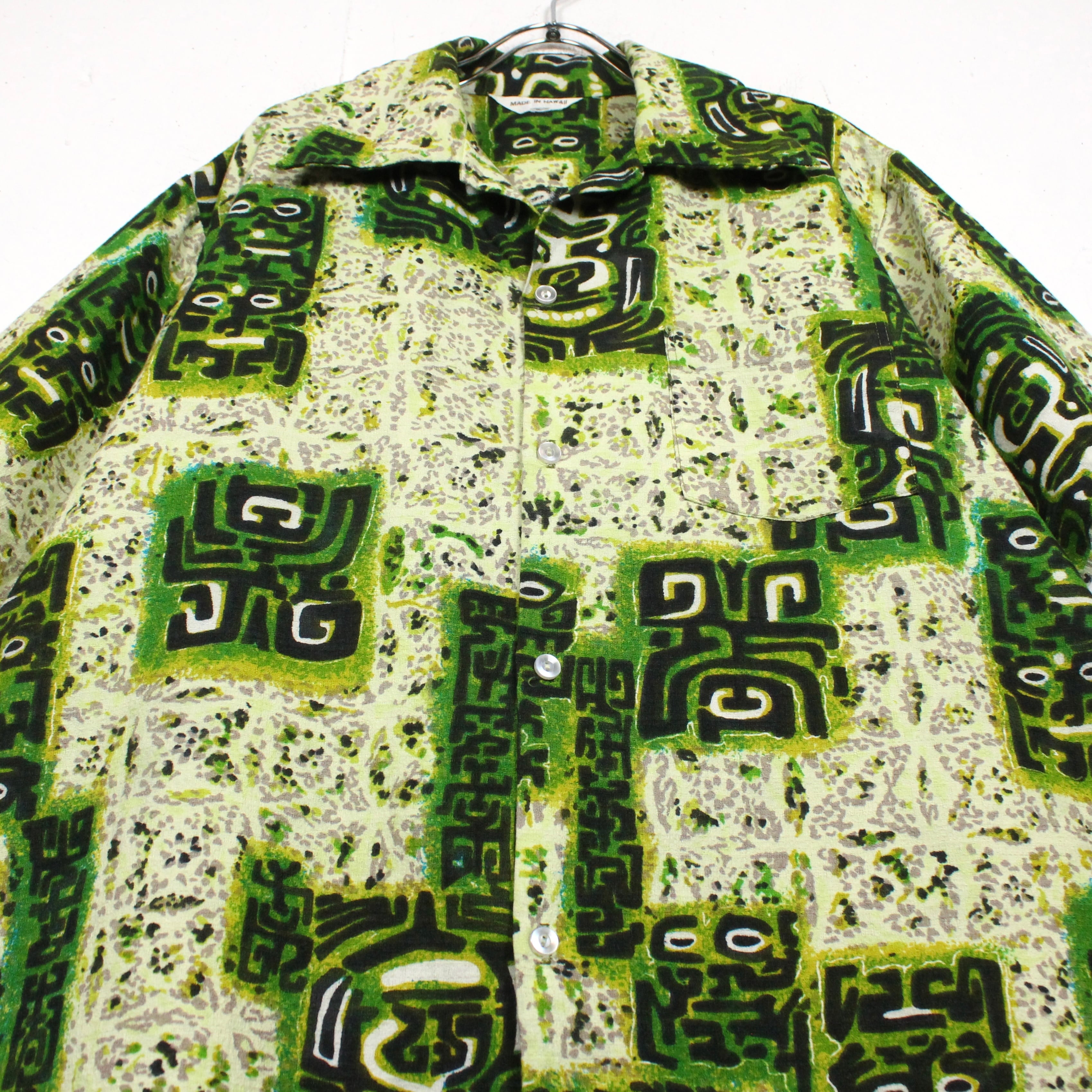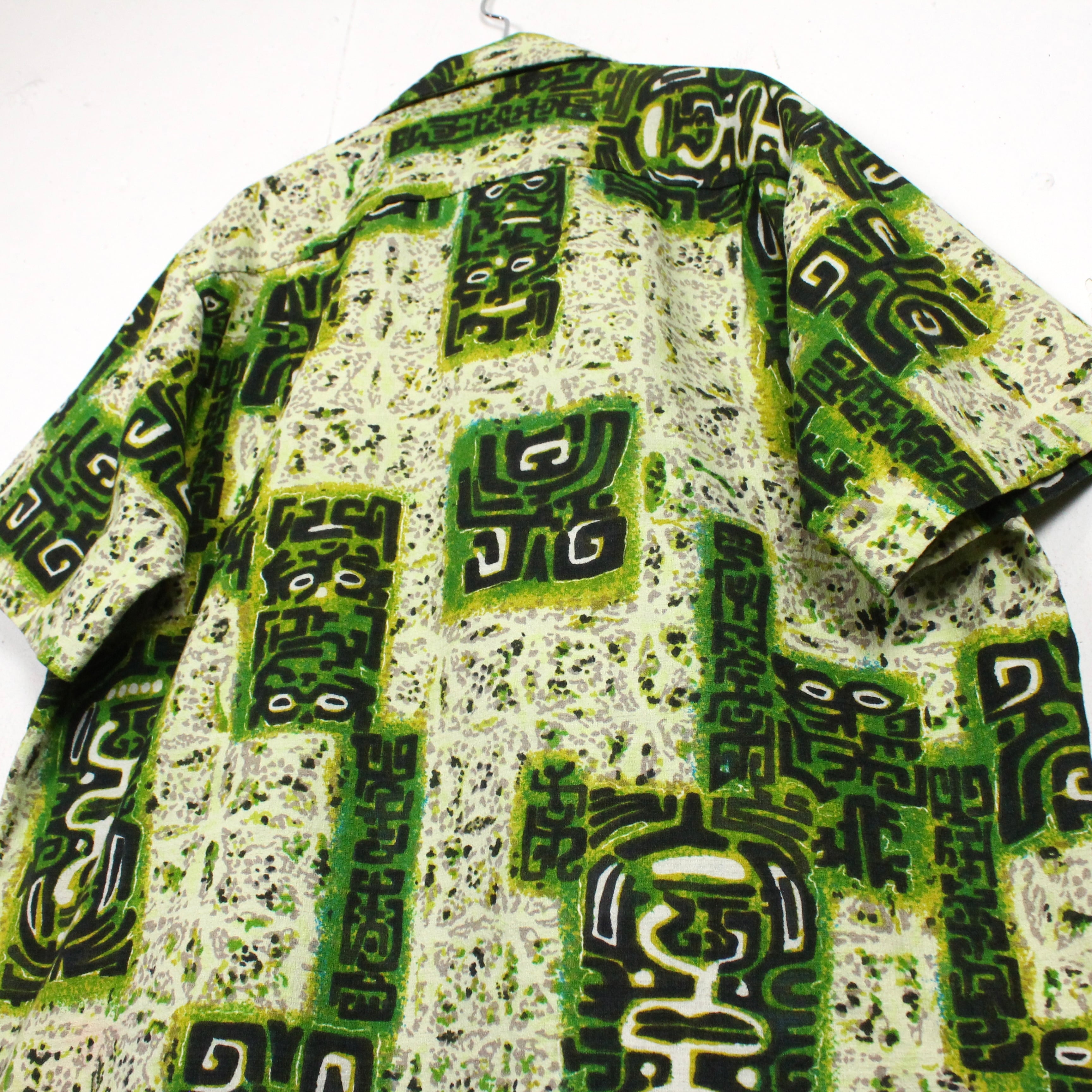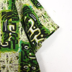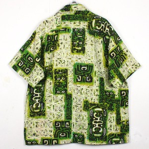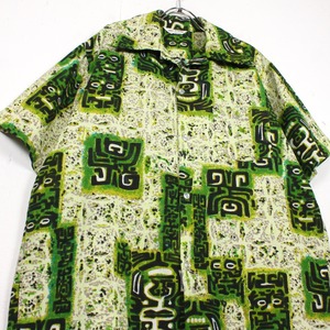 がっしりとした素材感のライトグリーンのボディをベースに、薄紫ベースとなる柄を配し、そのまわりに民族的なフレーバーを漂わせる柄を載せたアロハシャツ。どこかアーティスティックな雰囲気を醸し出す1枚に仕上がっています。