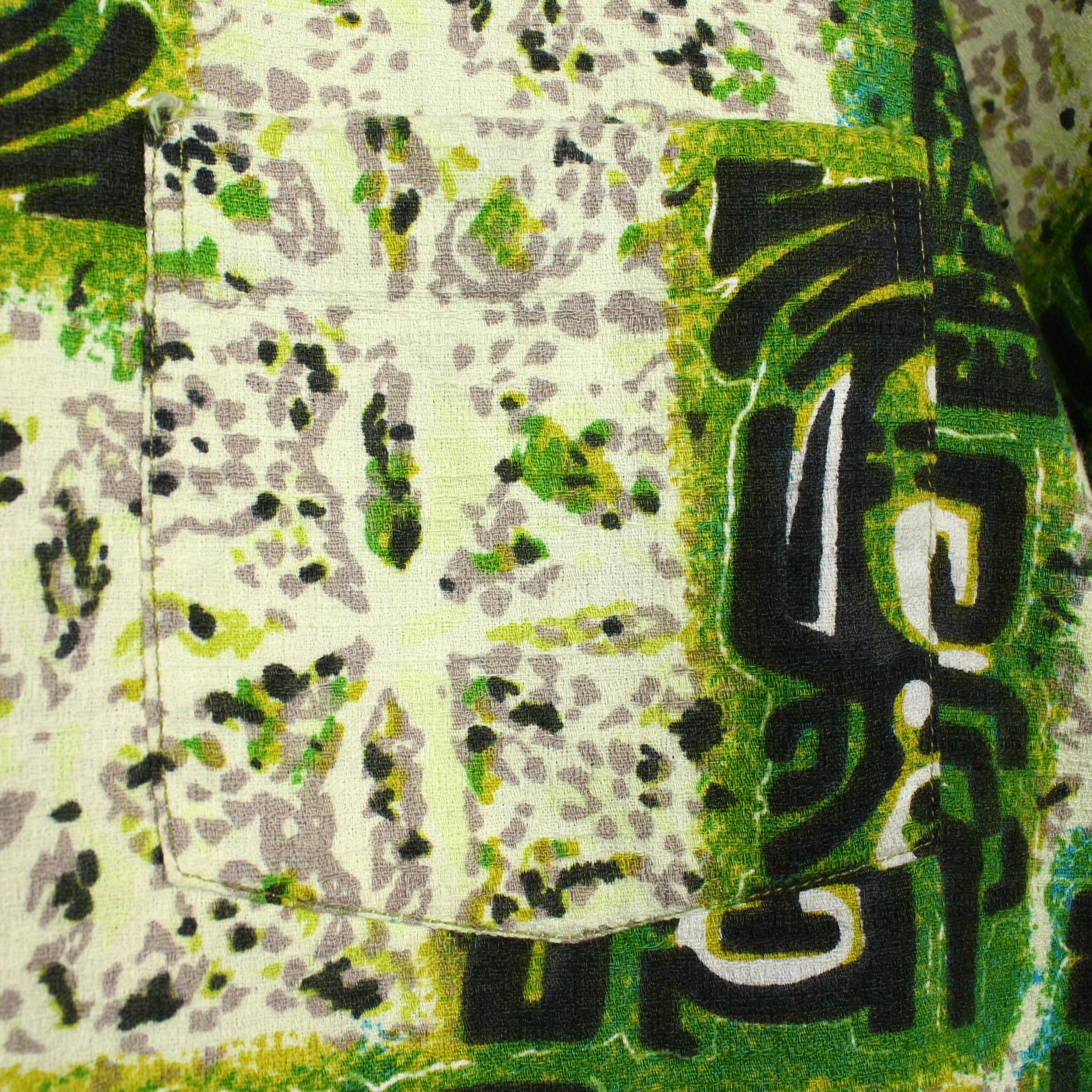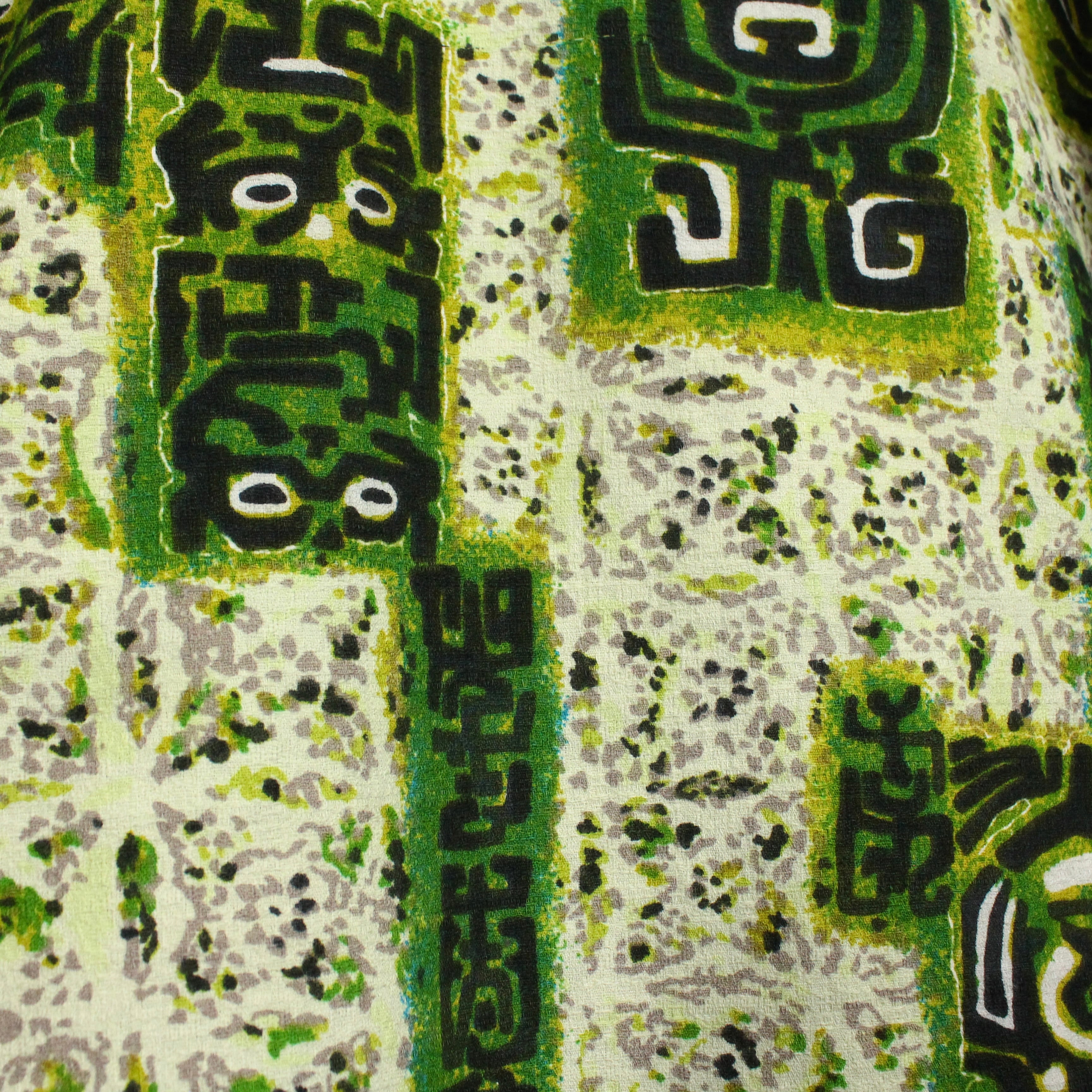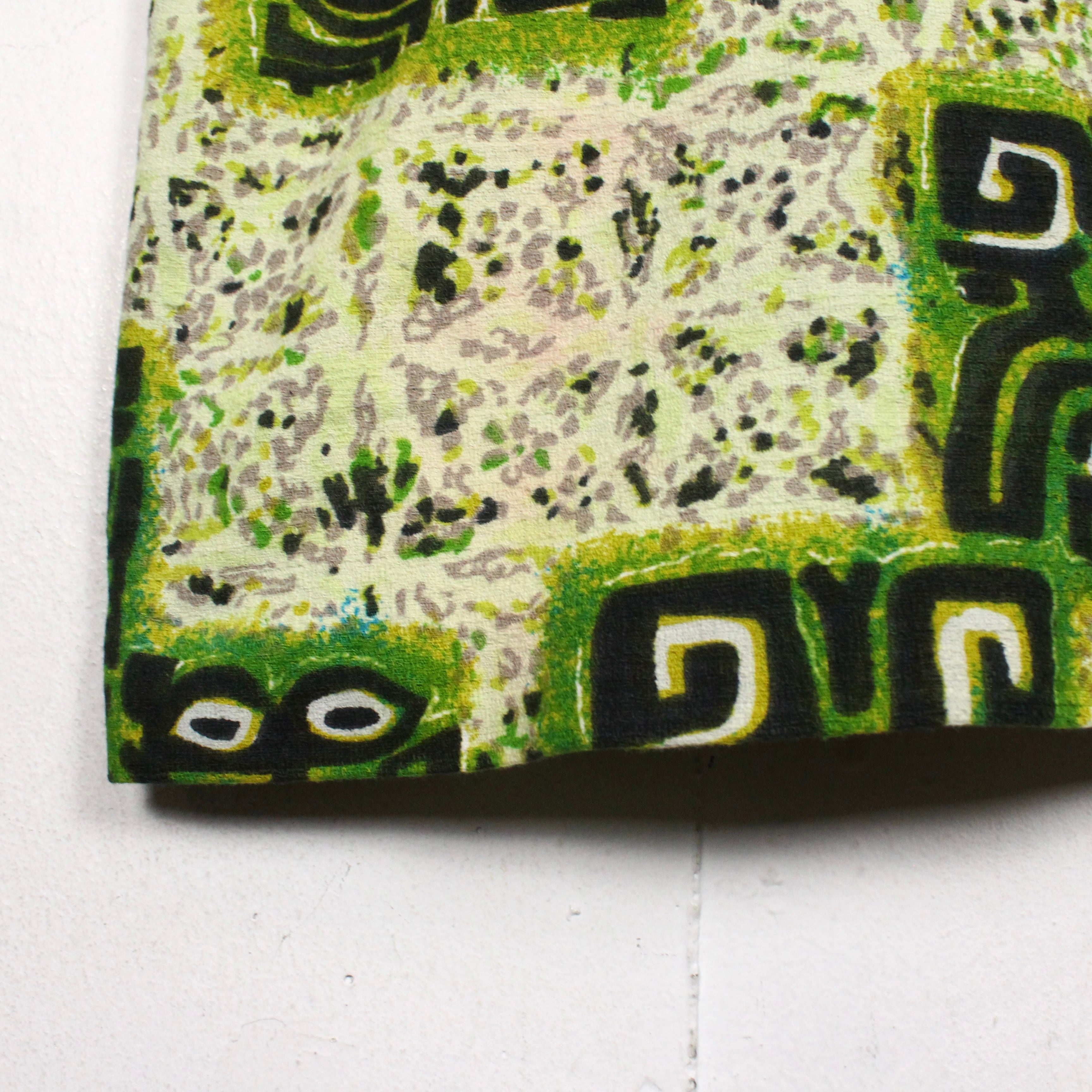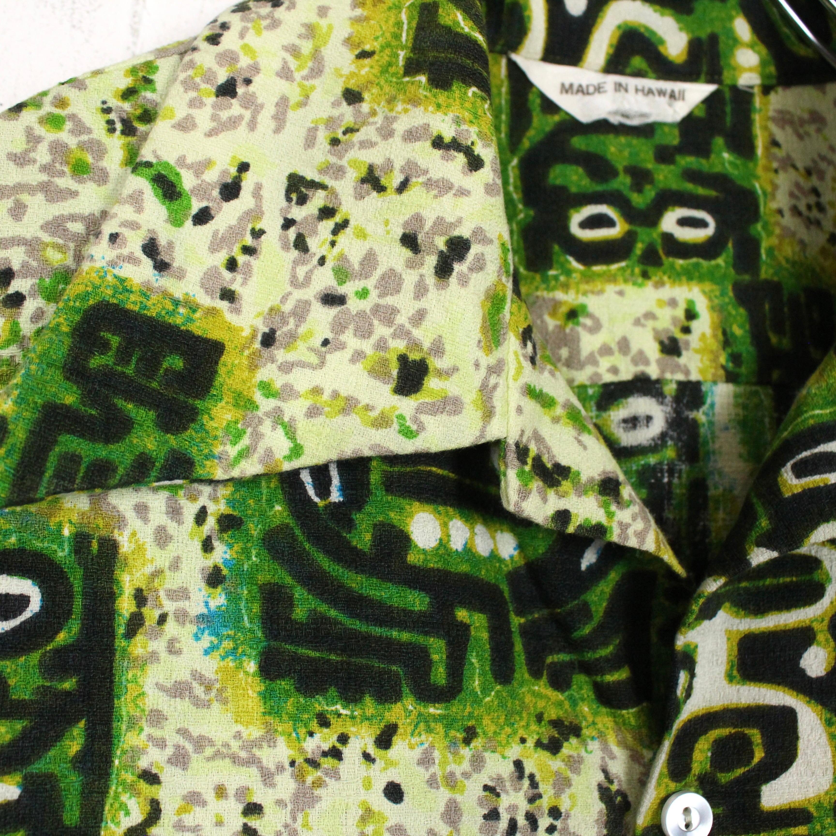 がっしりとした素材感のライトグリーンのボディをベースに、薄紫ベースとなる柄を配し、そのまわりに民族的なフレーバーを漂わせる柄を載せたアロハシャツ。どこかアーティスティックな雰囲気を醸し出す1枚に仕上がっています。