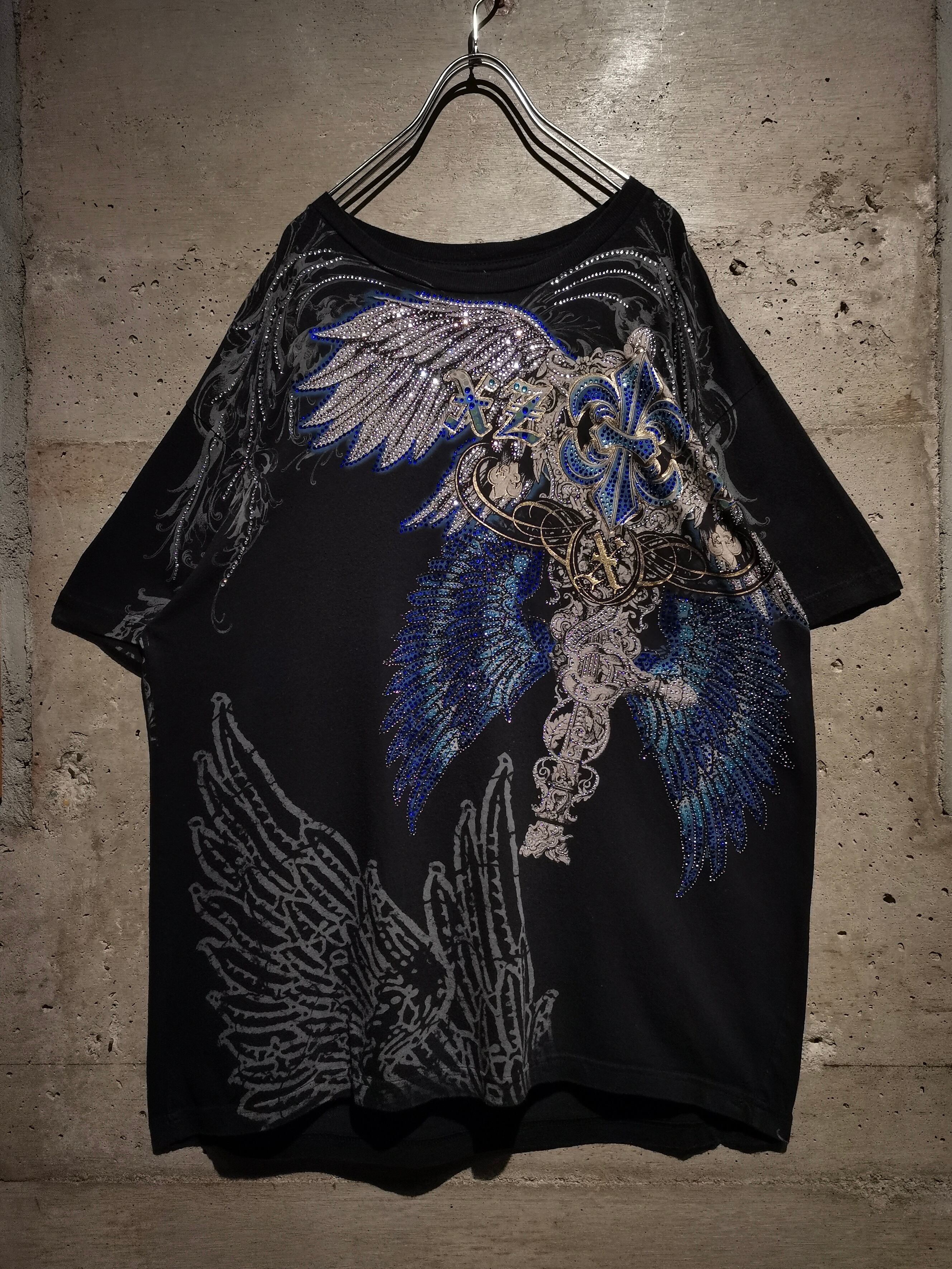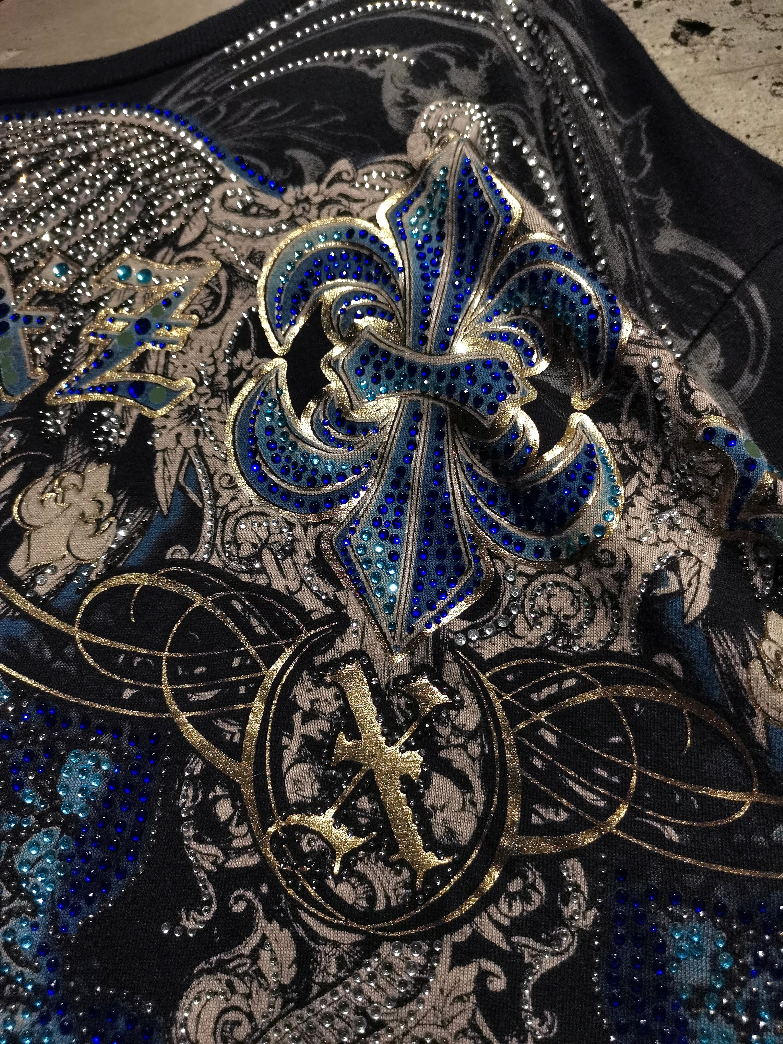 クロスやフェザーのプリントに、フロント、バック共にBling-Blingなラインストーンのデコレーション。プリントのインパクトに加えてラインストーンの輝きが抜群の存在感を放ってくれます。