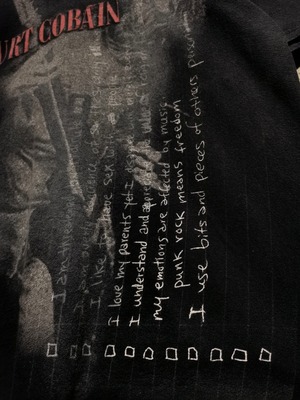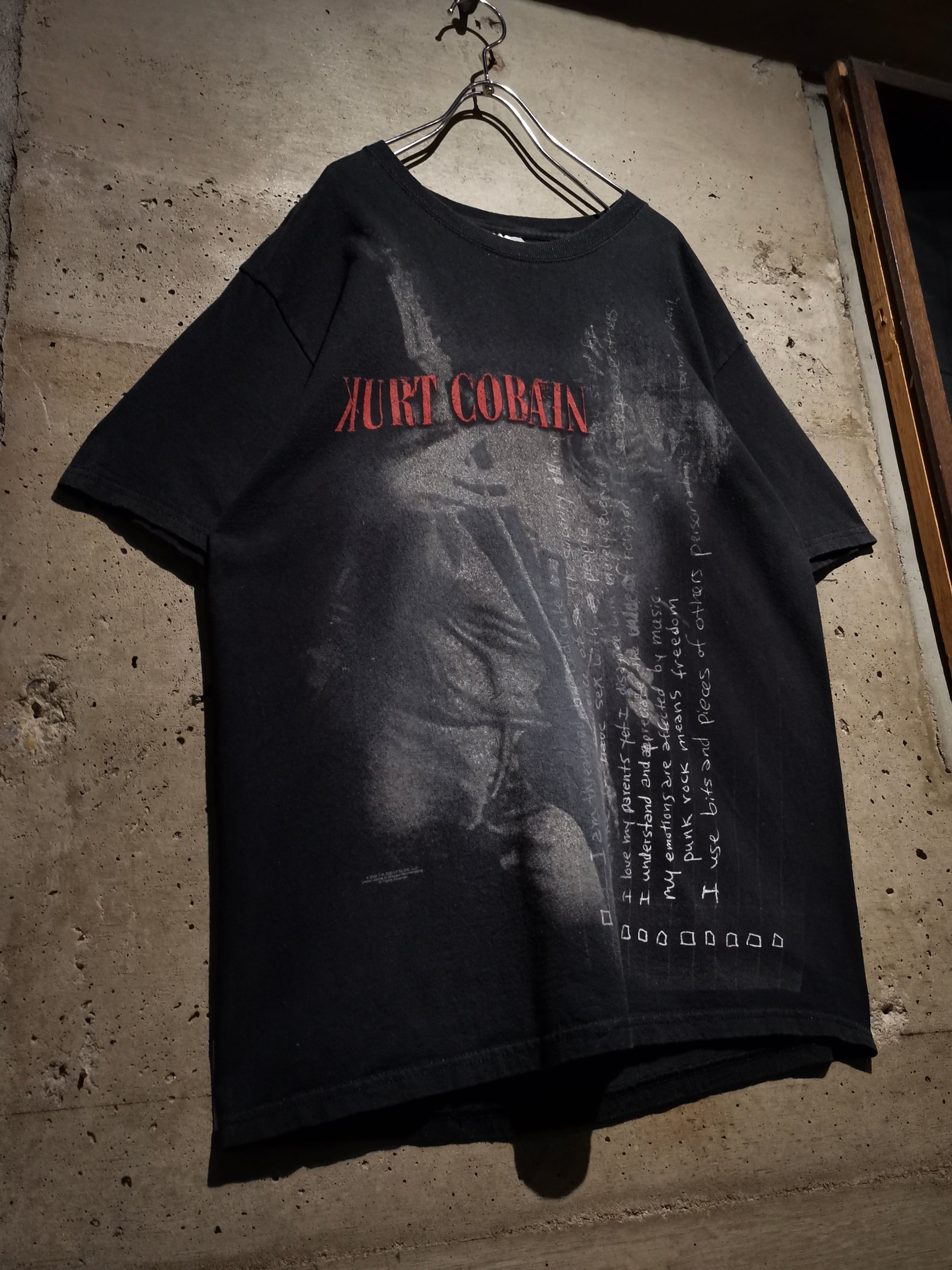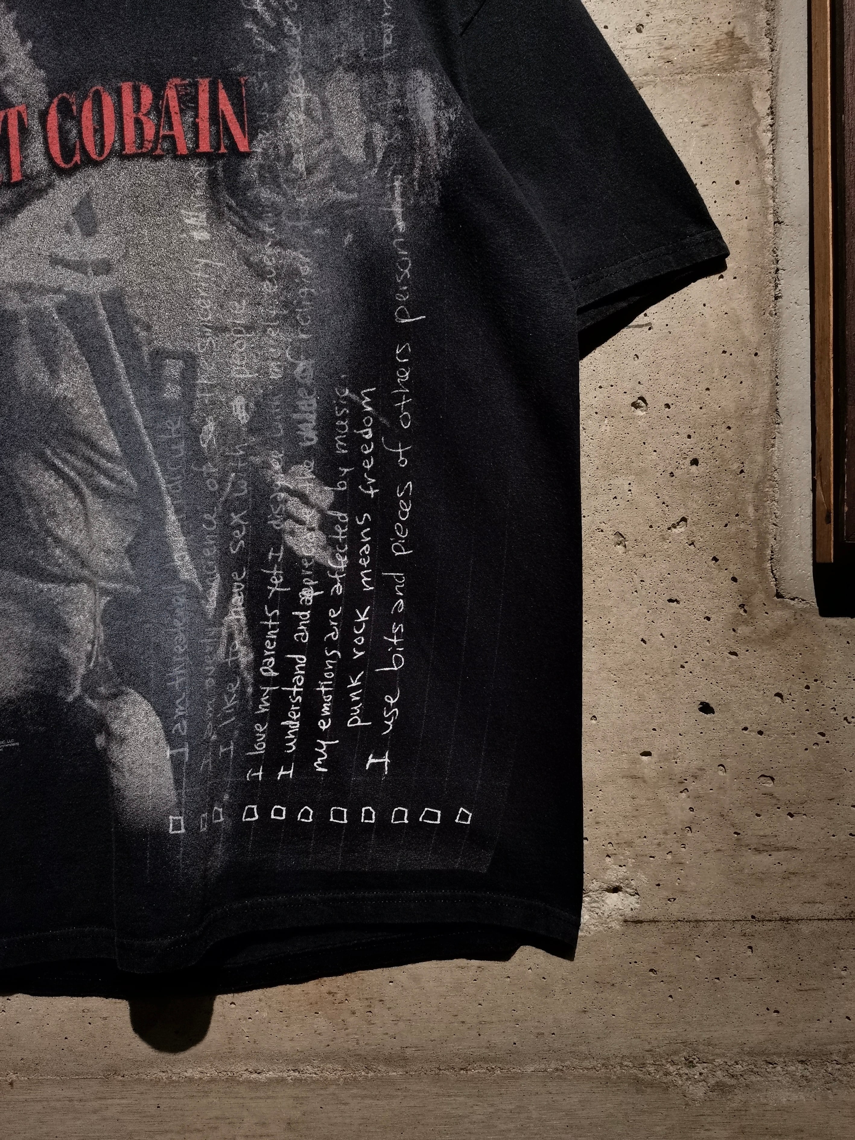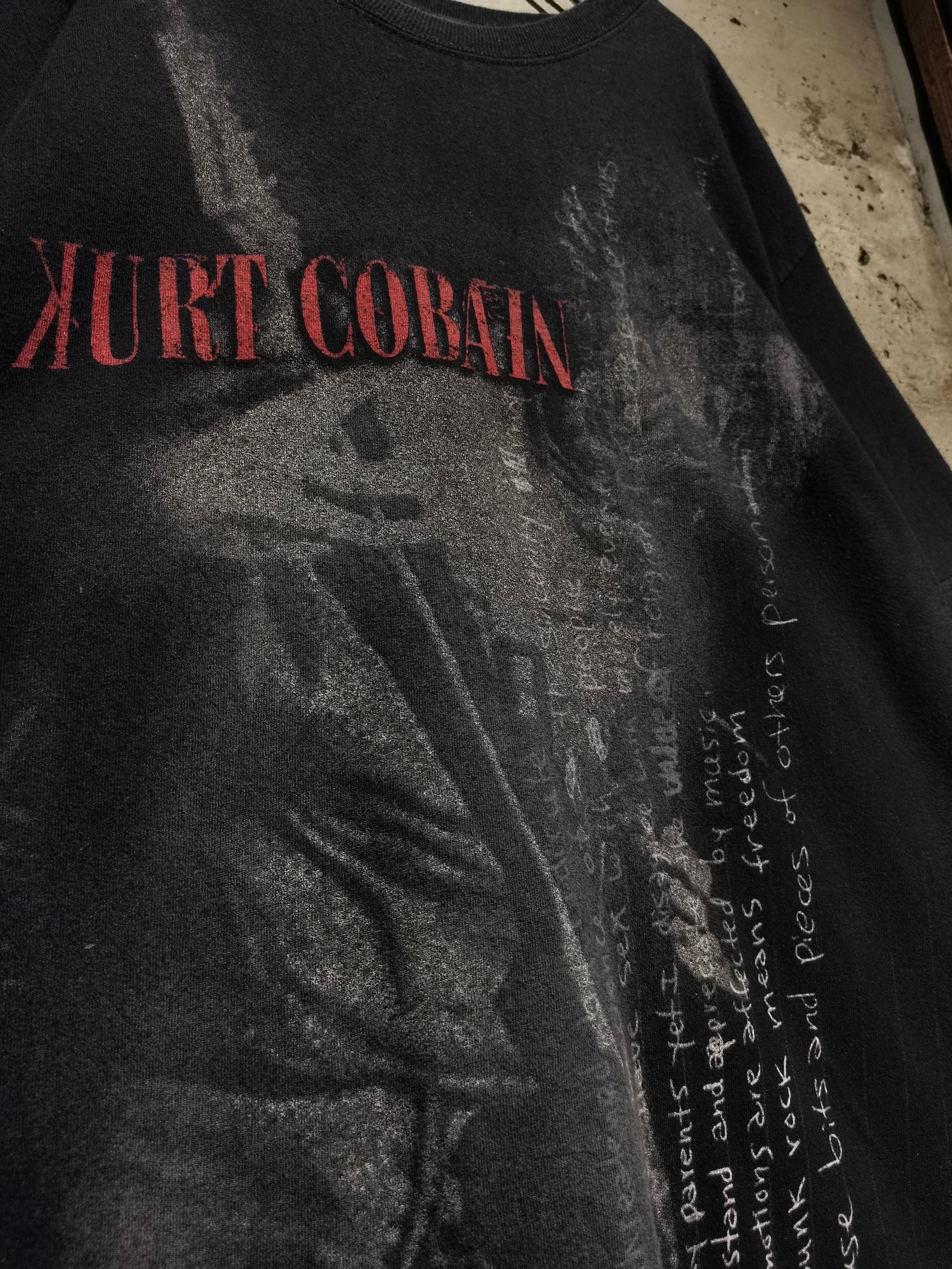 フェードの効いたブラックのボディに、中央には赤のインパクトある“KURT COBAIN”のタイポグラフィ。背景には彼の姿とともに、手書き風のメッセージが載せられた、どこかドキュメンタリータッチな1枚。