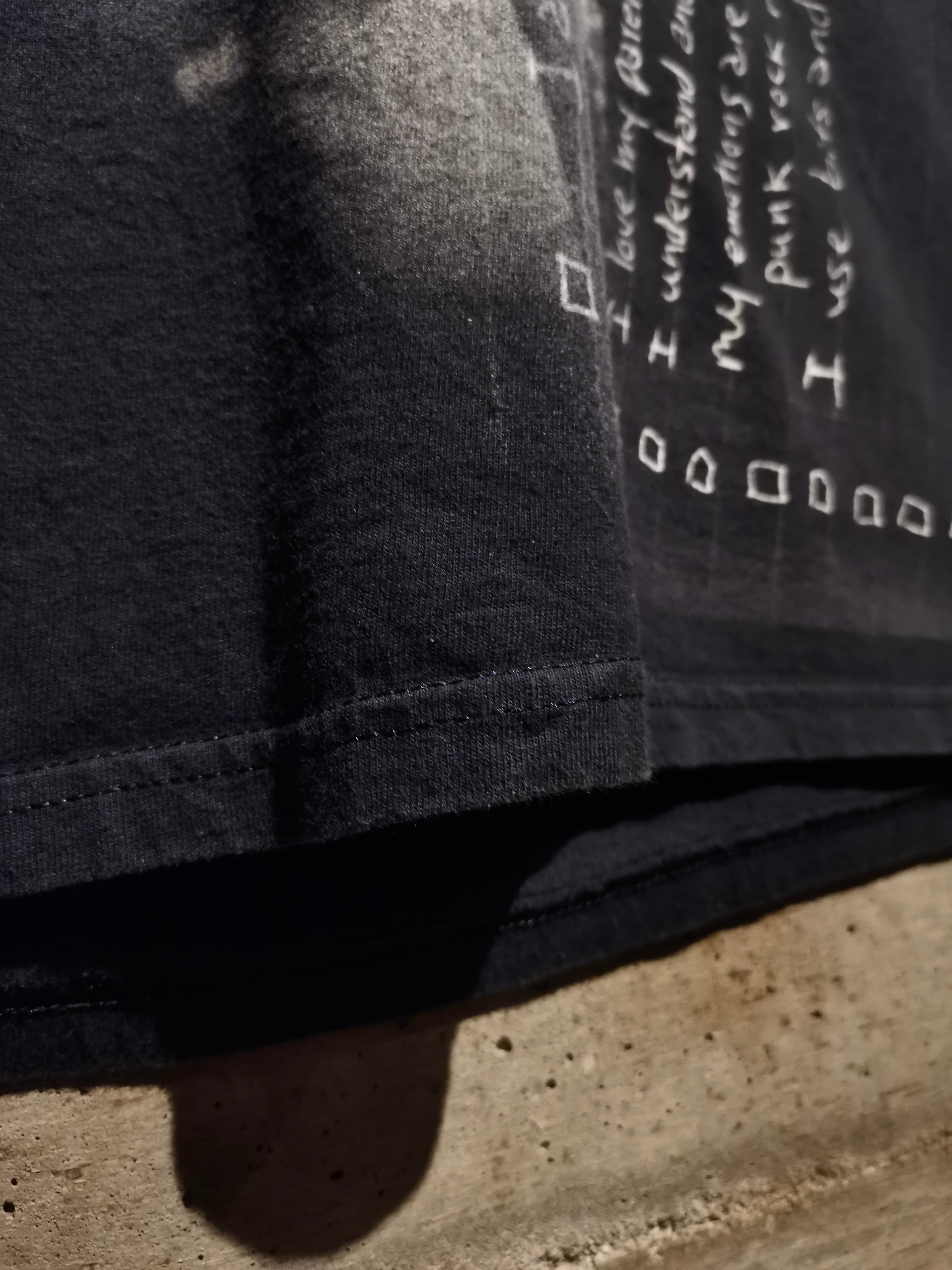 "punk rock means freedom(パンクロックは自由を意味する"など、彼の考え方がにじむ言葉たちが並んだ、彼のノートのページをそのまま写したようなデザイン。