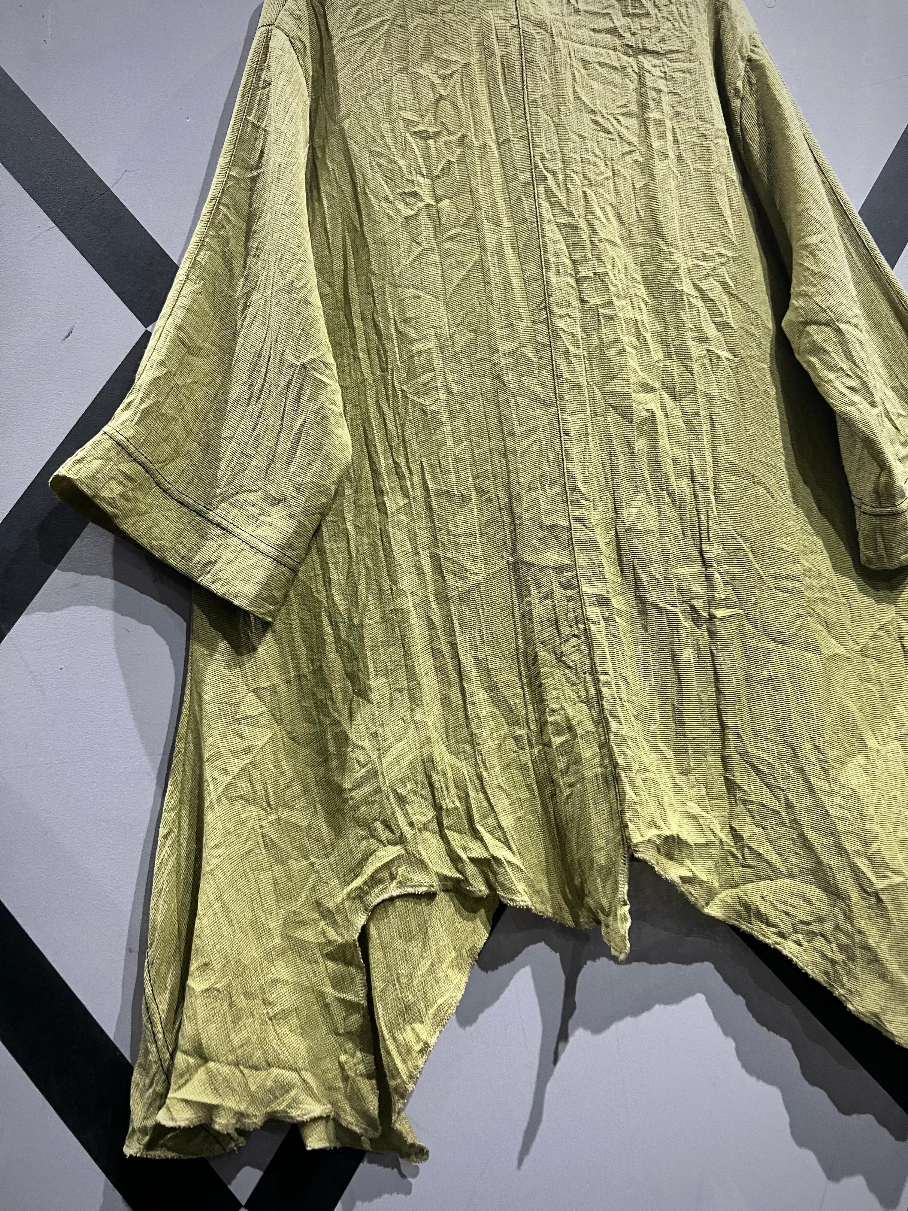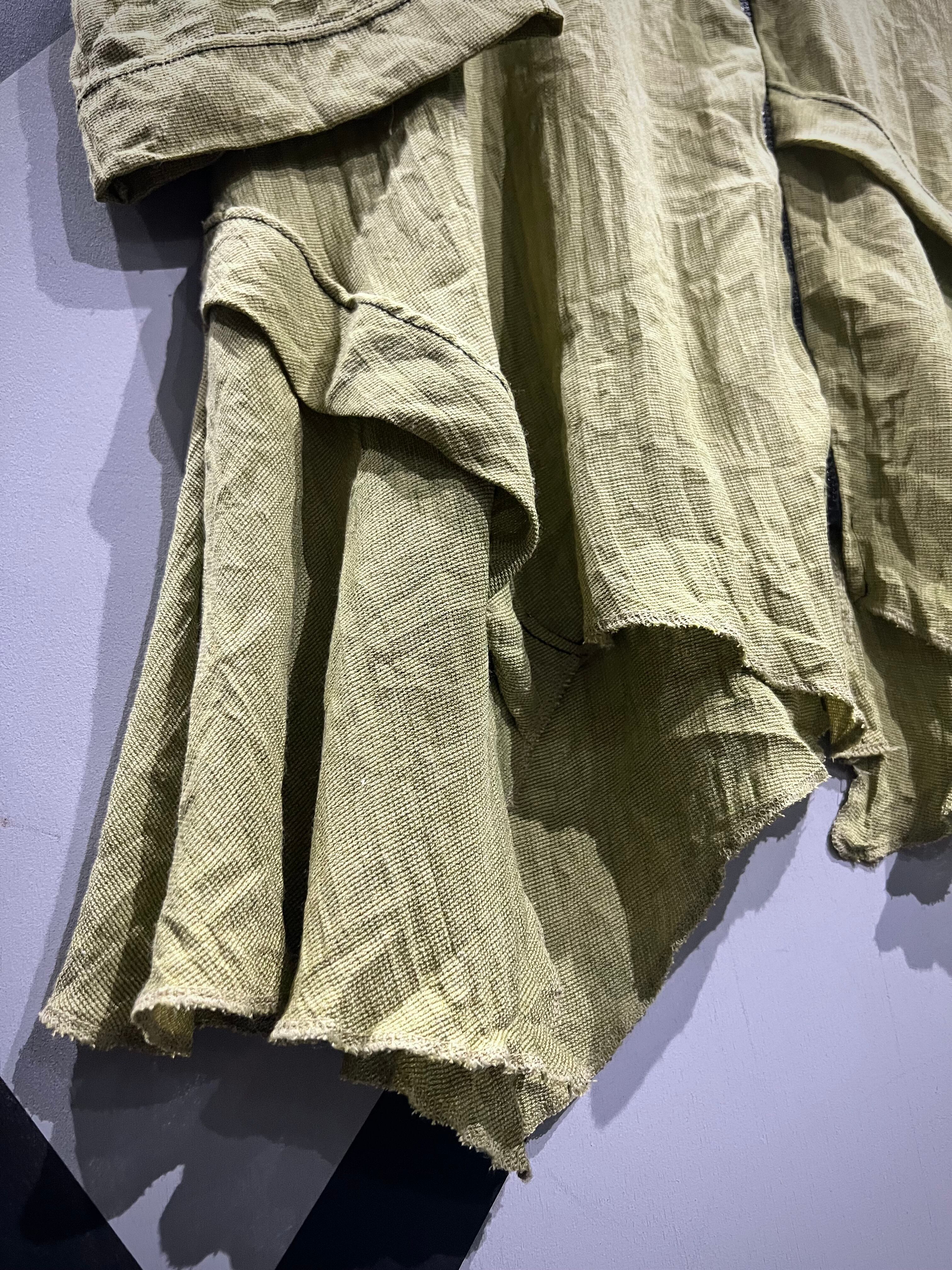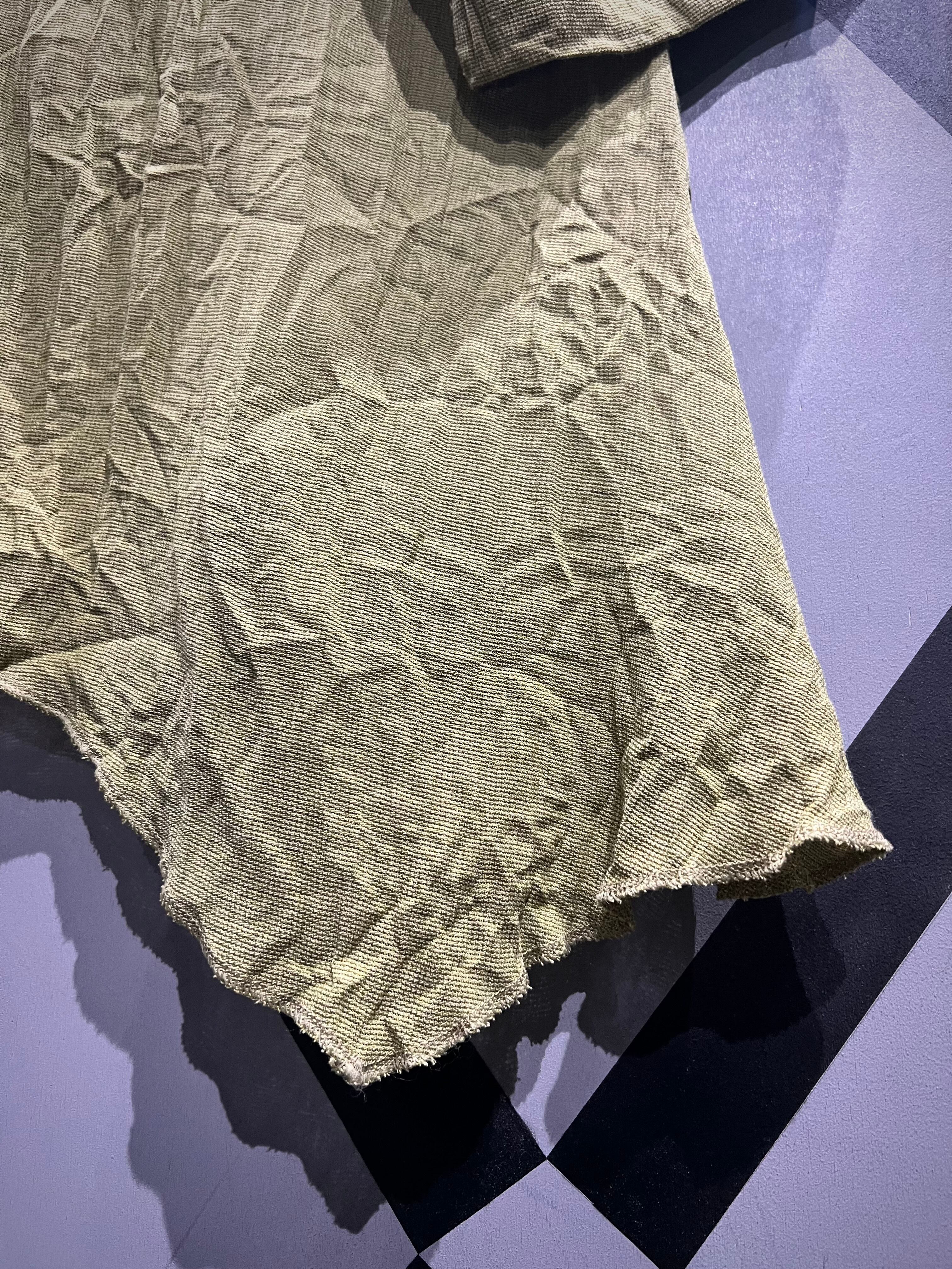 裾を大胆に斜めにカットし、柔らかな生地感と相まって美しいドレープを演出。デザインはシンプルながら着用時のシルエットで魅せる1着かと。
