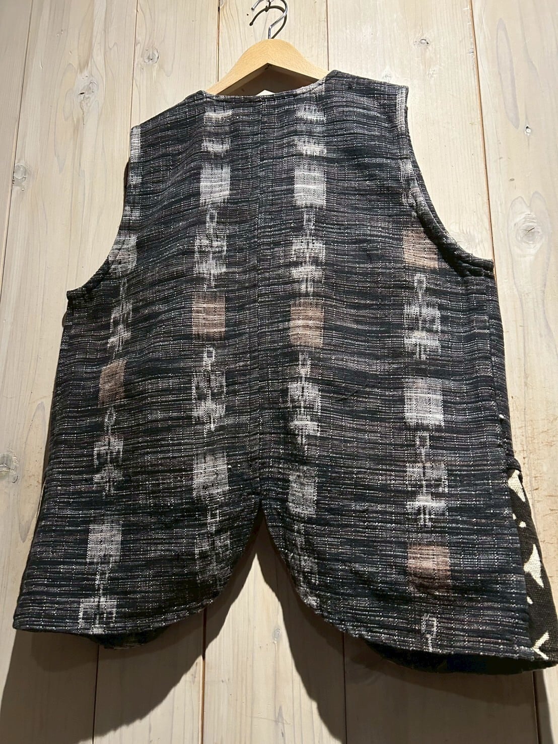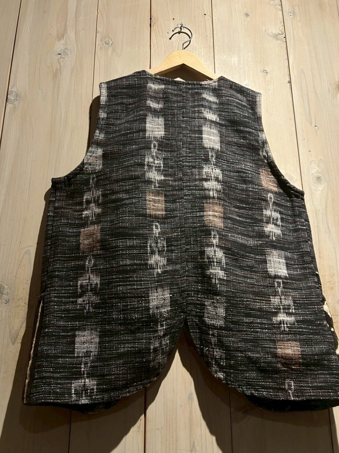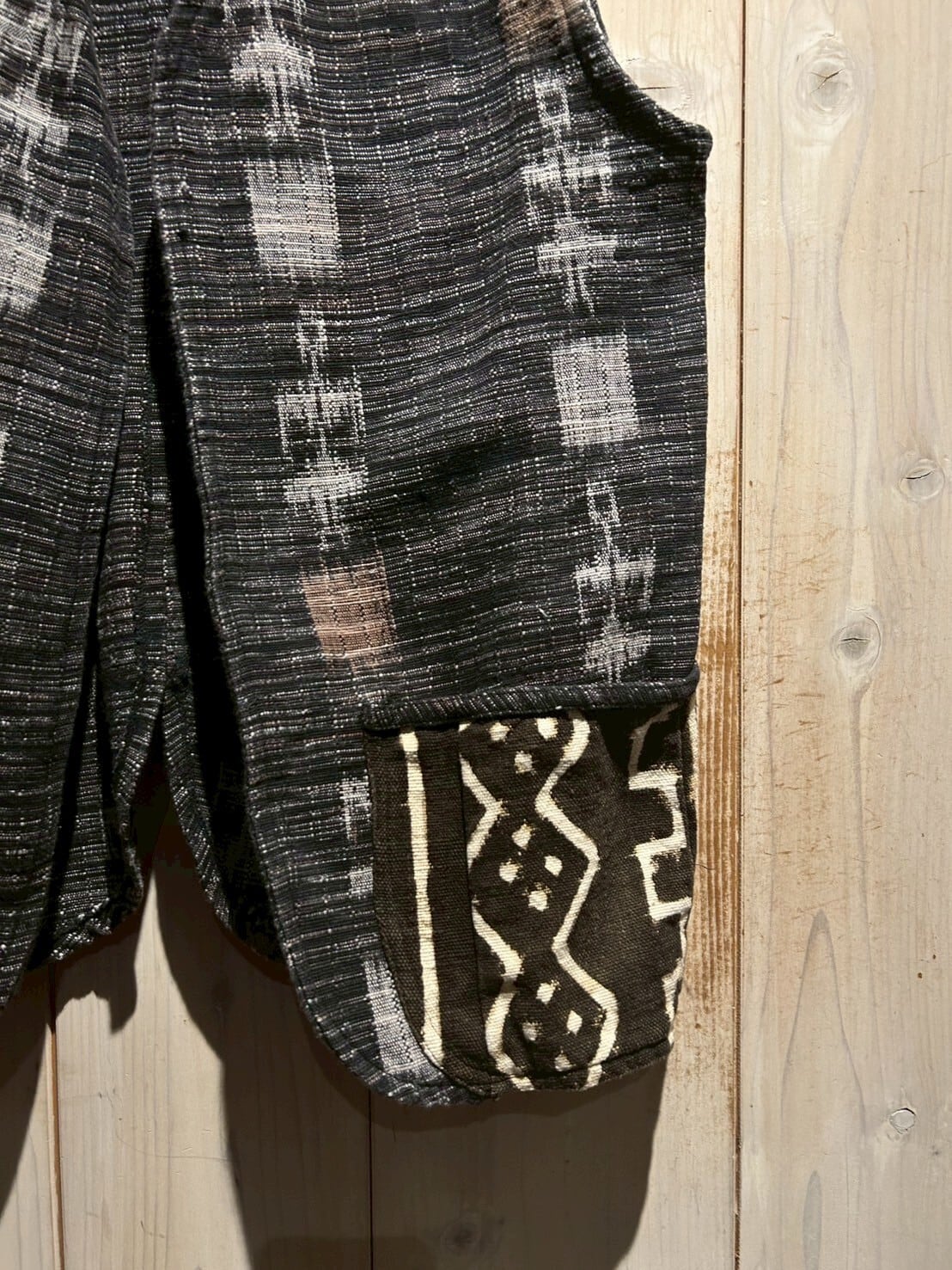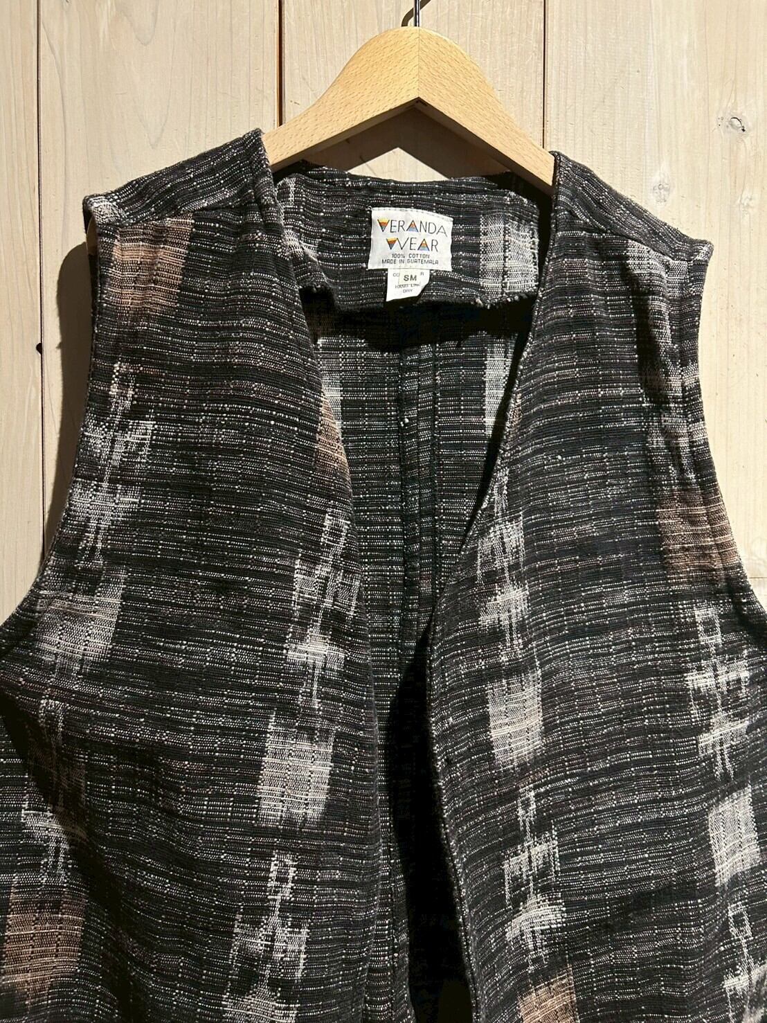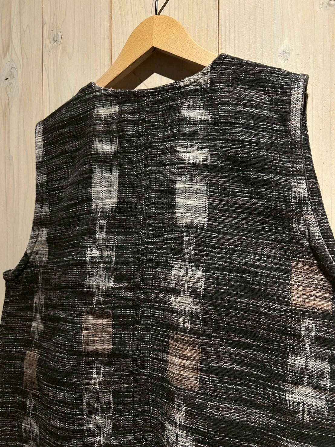 グアテマラ地方の伝統的な織を用いたボディに、アフリカンなテキスタイルを切り替えたベスト。