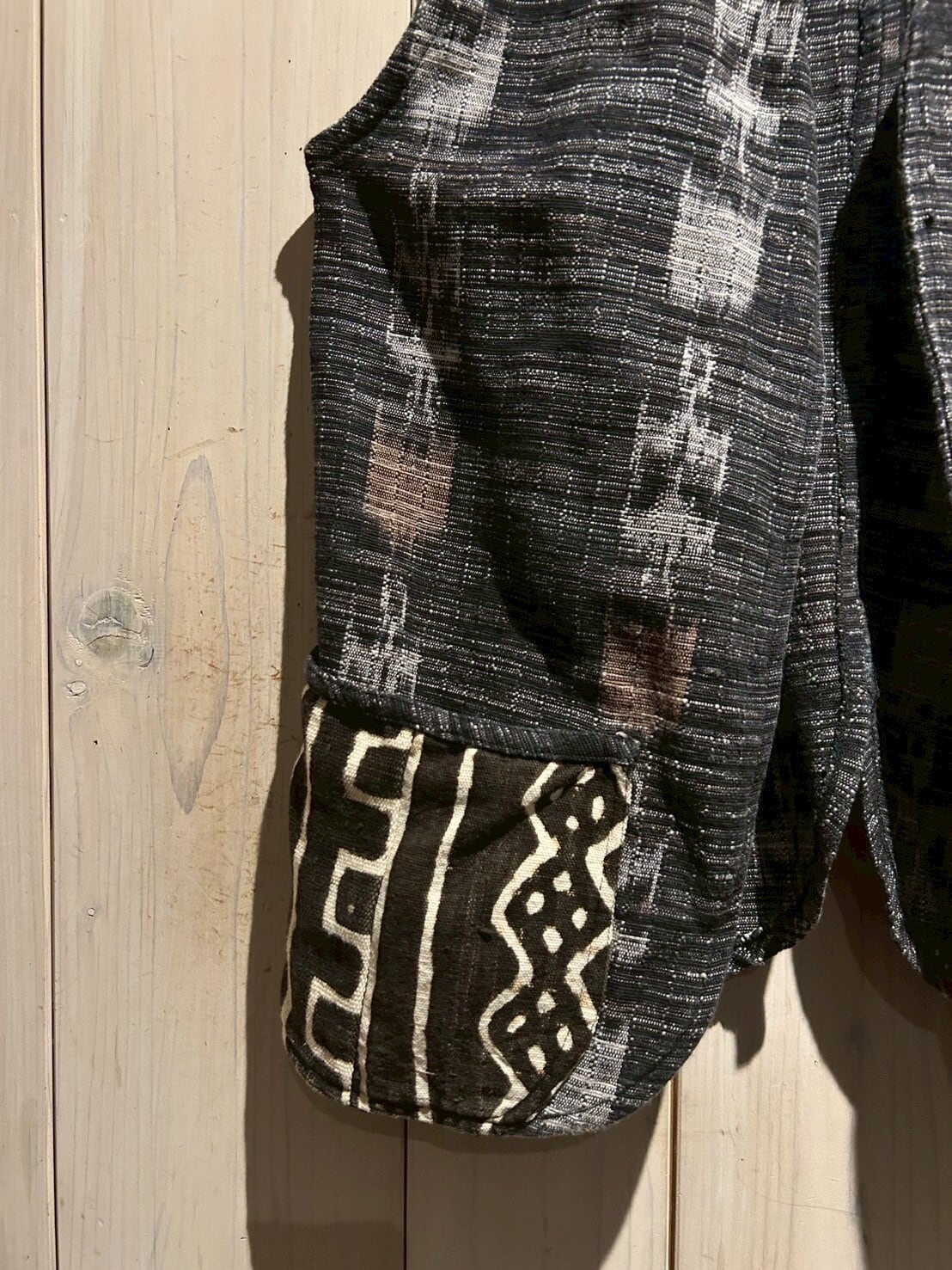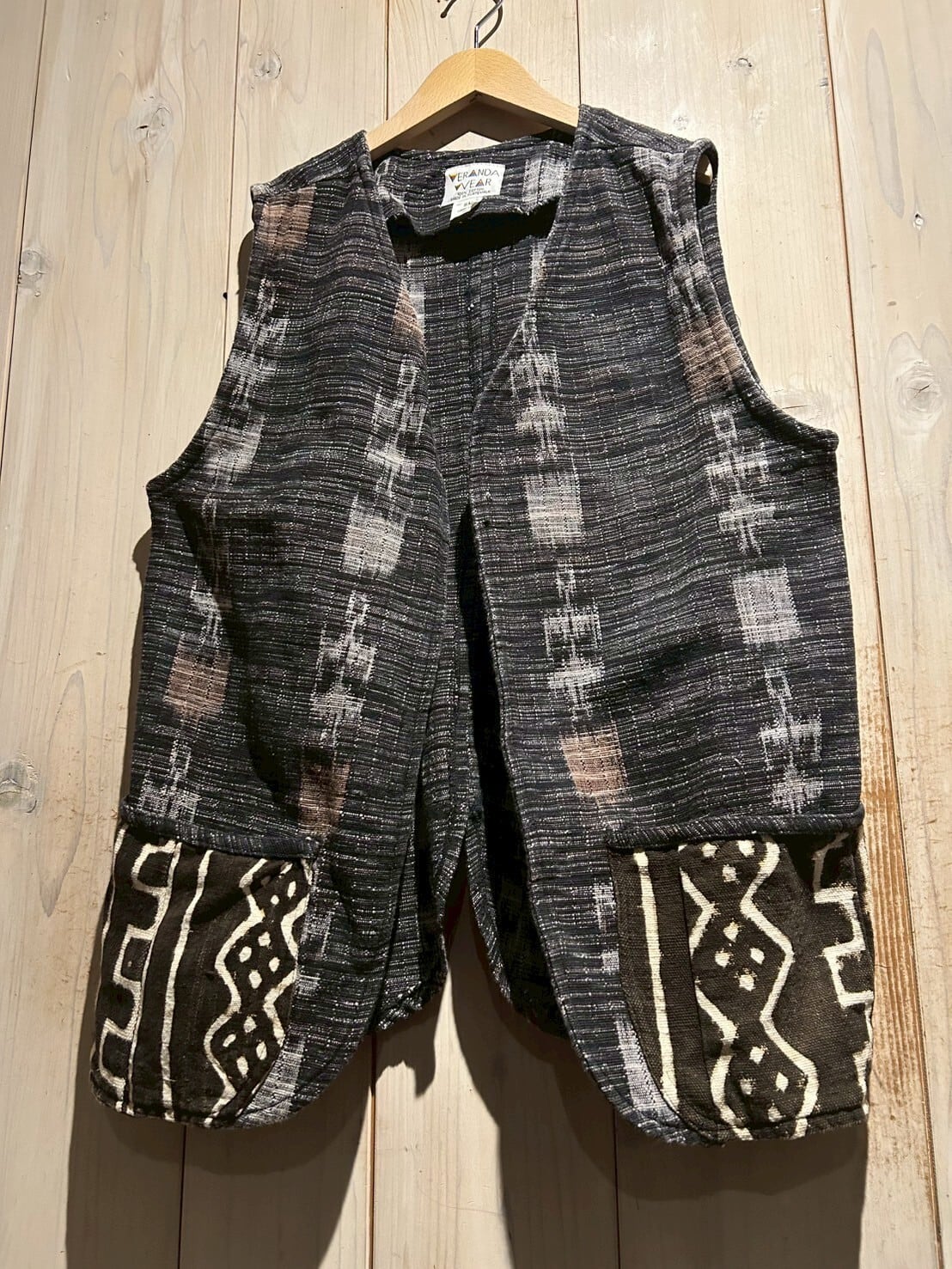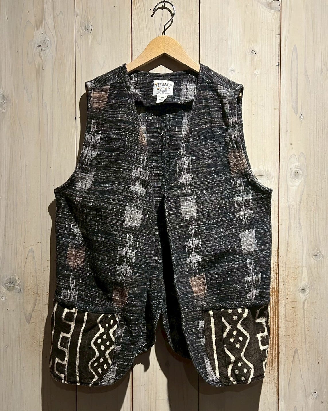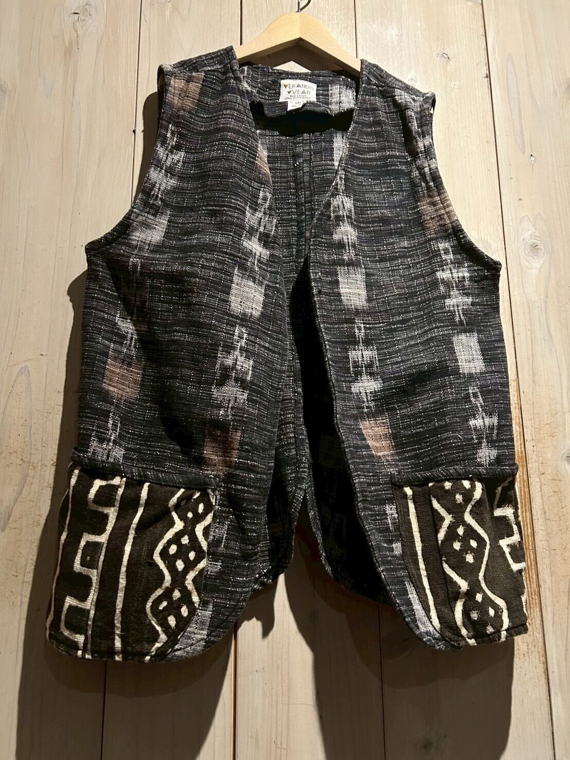 グアテマラ地方の伝統的な織を用いたボディに、アフリカンなテキスタイルを切り替えたベスト。