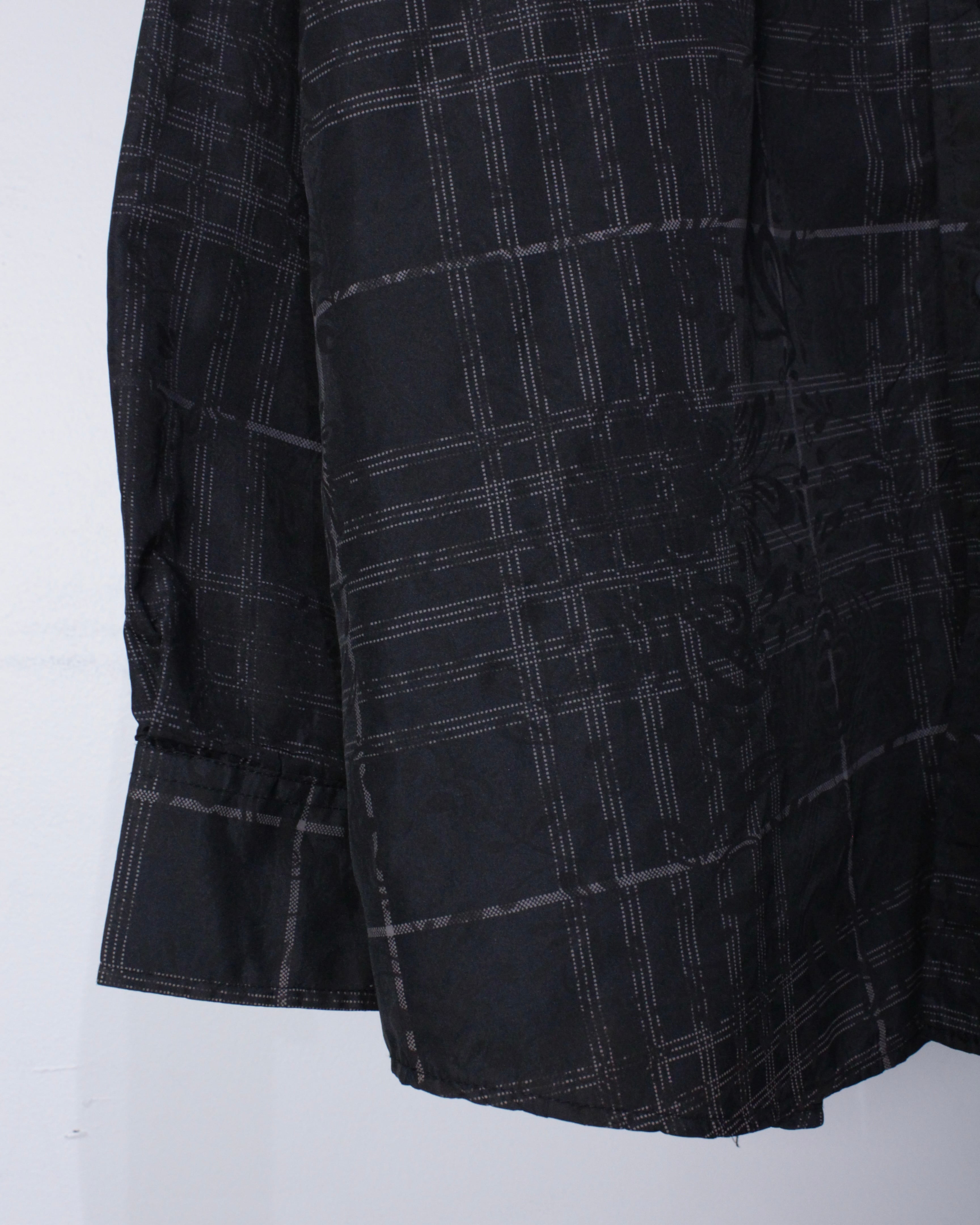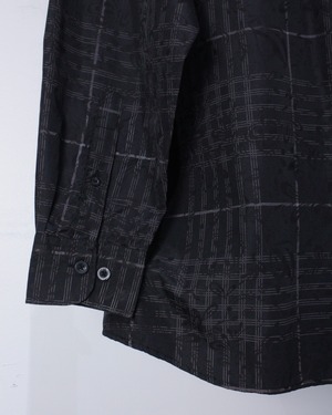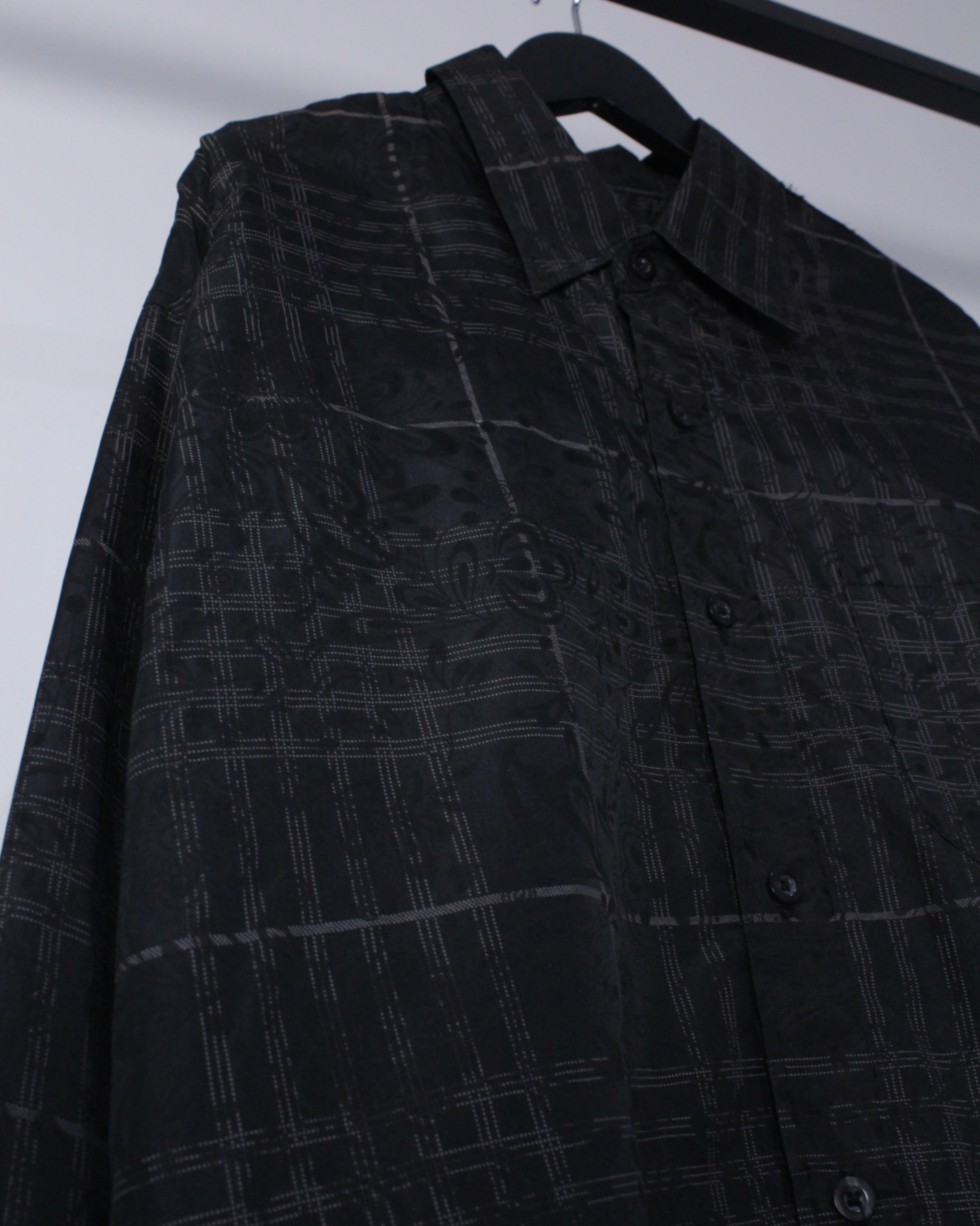 パリッとハリのあるブラックのボディをベースに、ボタニカルな柄、その上からチェック柄を載せた高いデザイン性を持ったスペシャルな長袖シャツ。