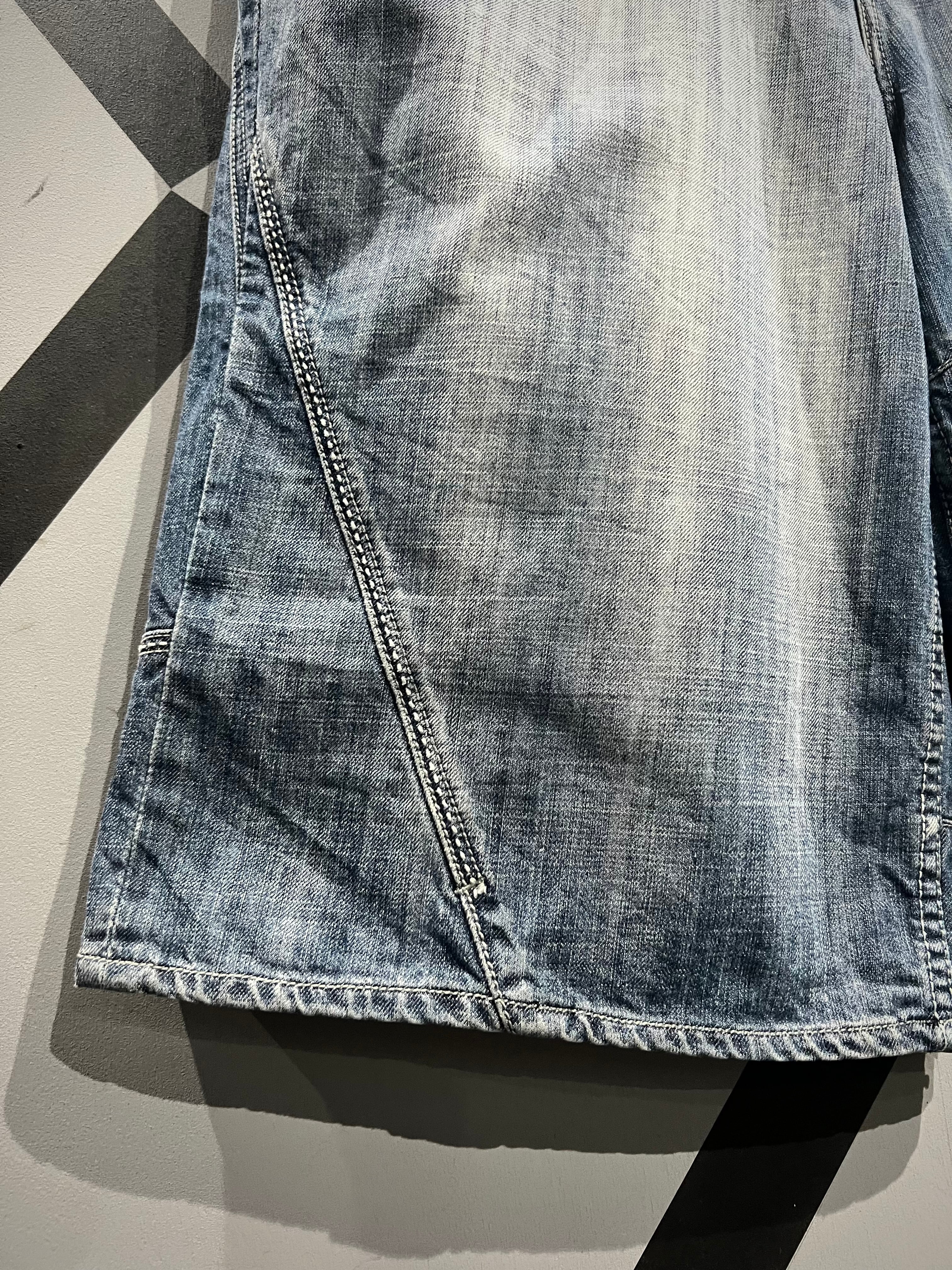 フェード感の非常に良いデニムのボディをベースに、背面にはブランドネームを刺繍で刻み込んだバギーショーツ。