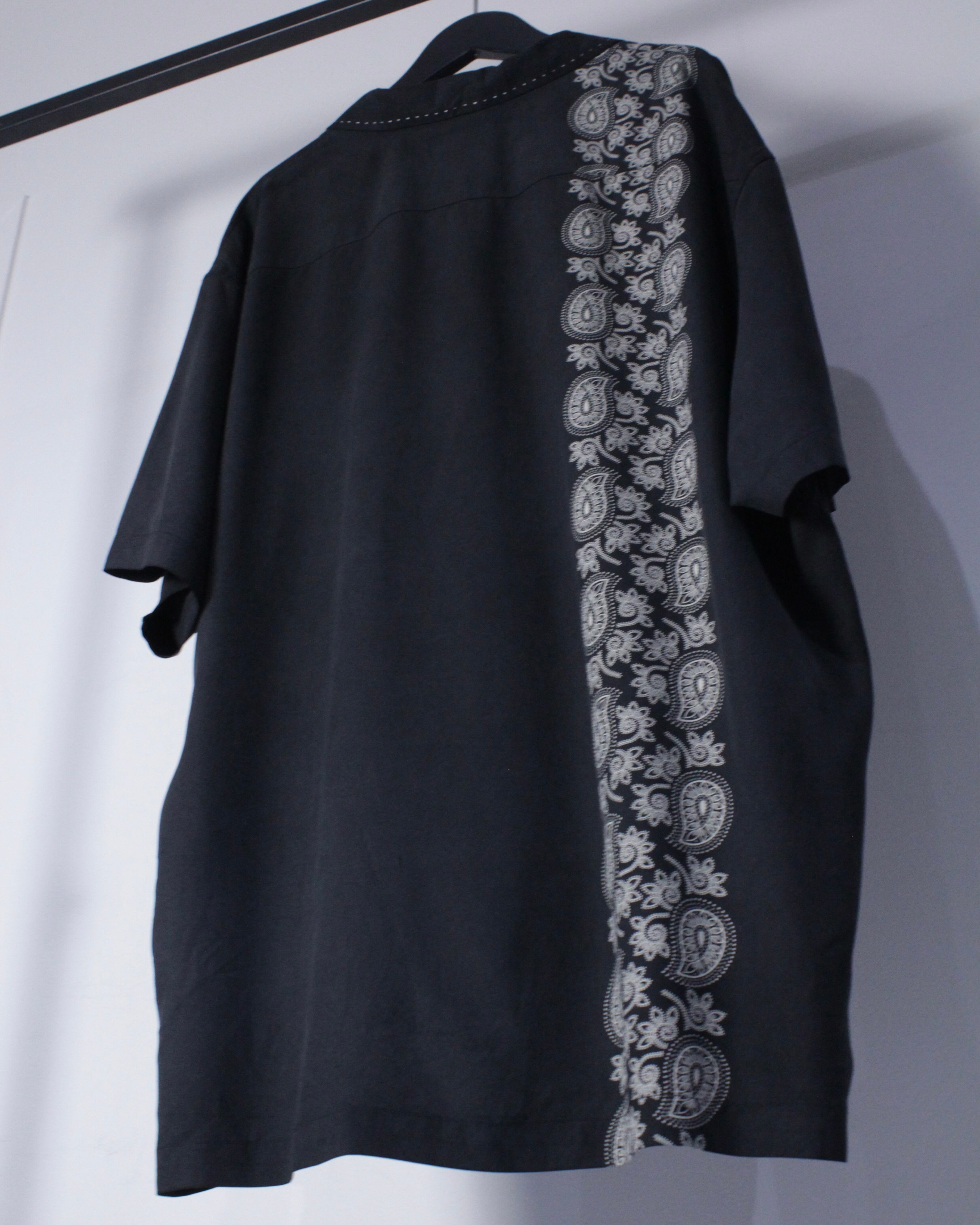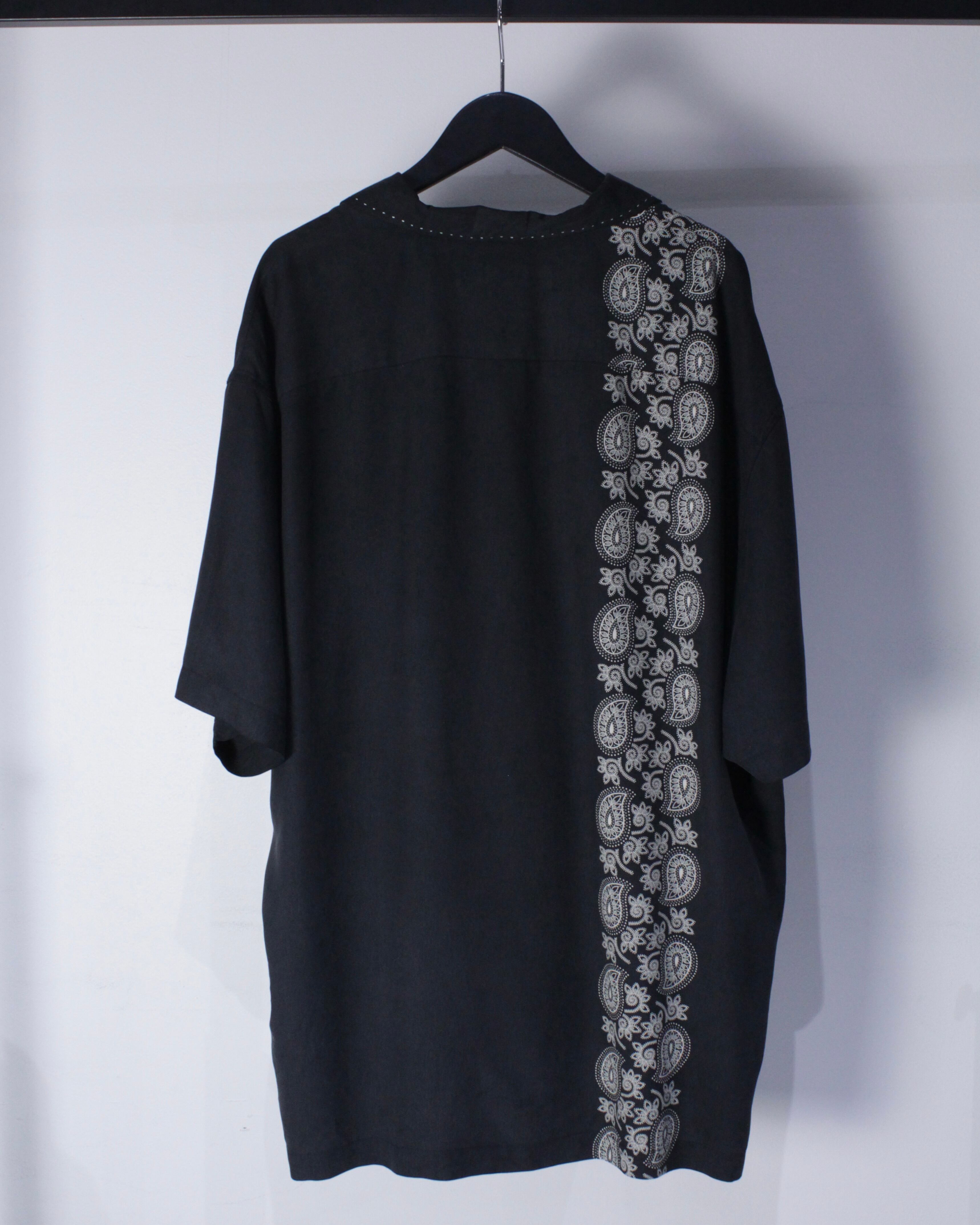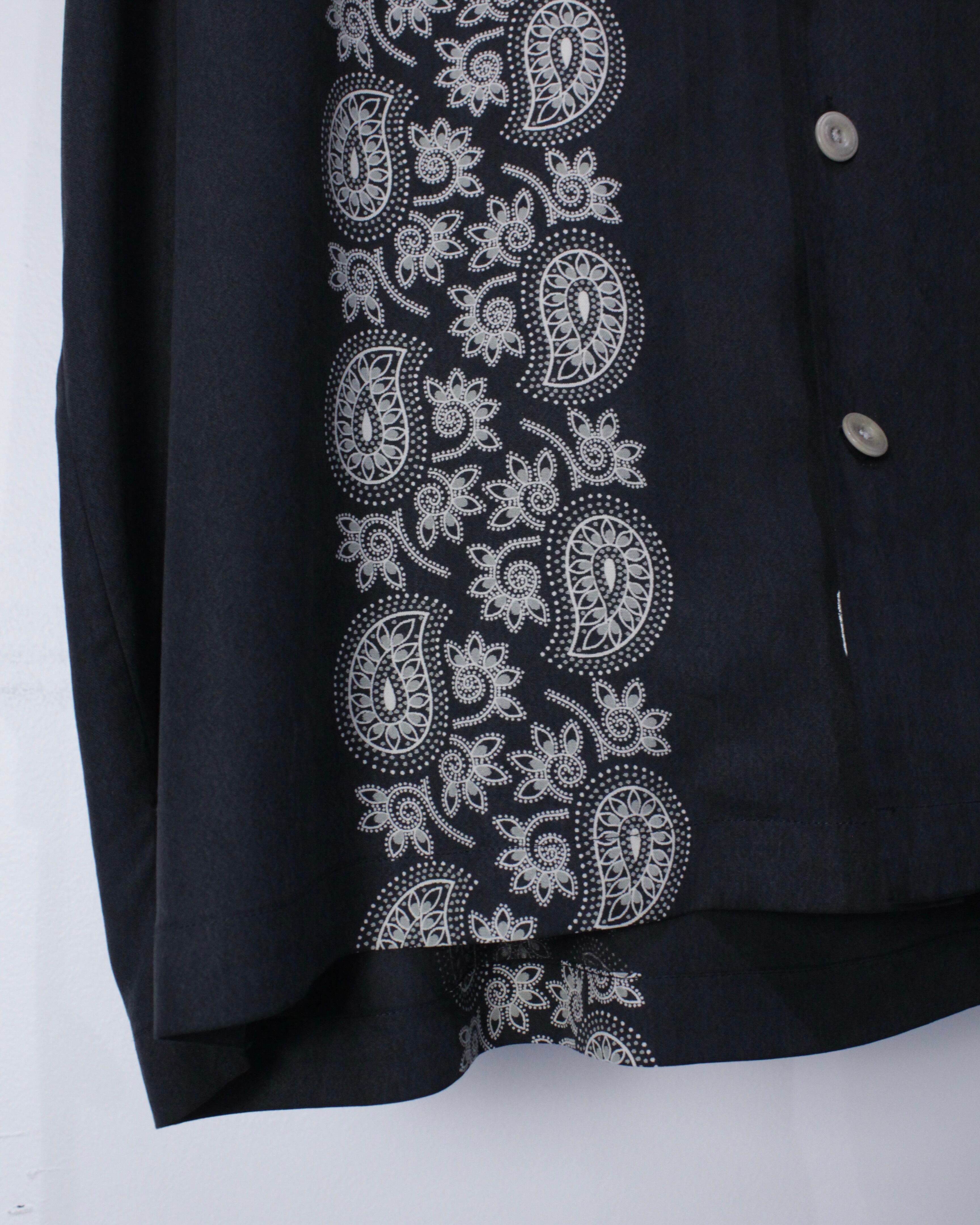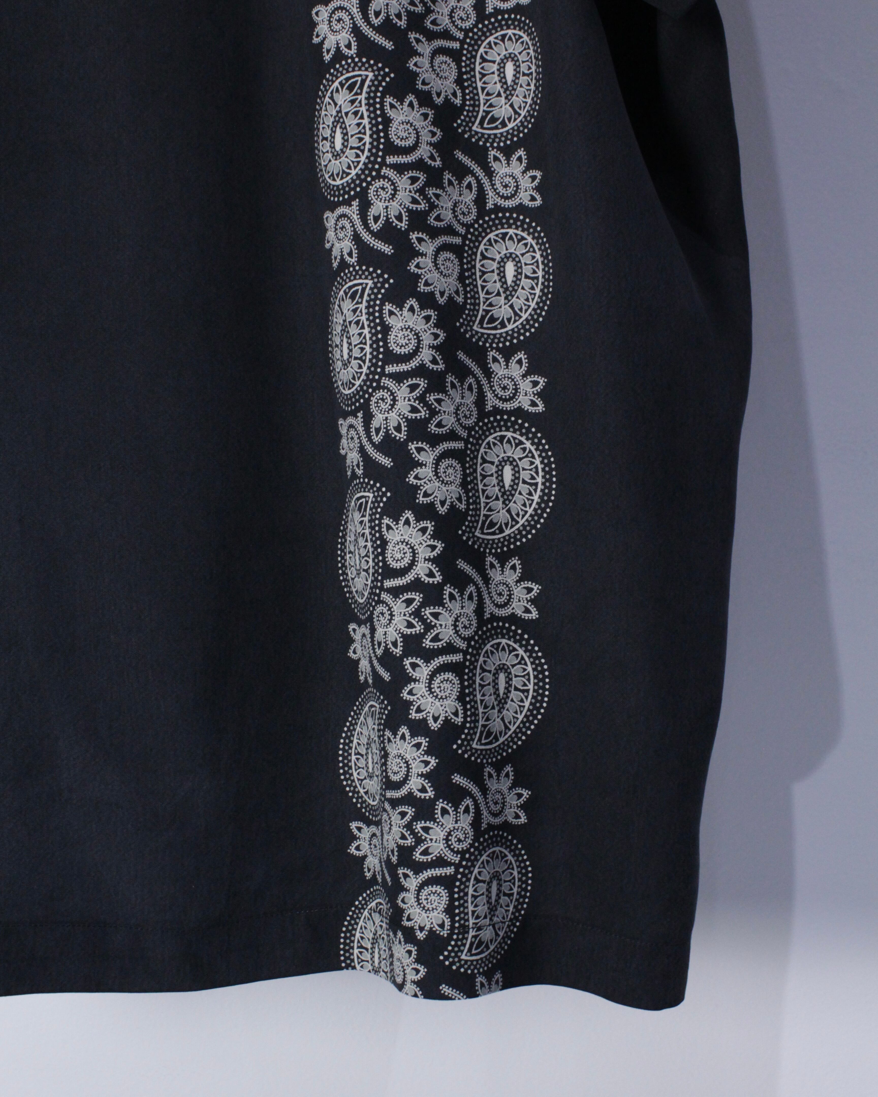 フワッとエアリーなブラックシルクのボディに、右フロントから後ろにかけて緻密にデザインされた美しいペイズリー柄をプリントで載せた半袖オープンカラーシャツ。