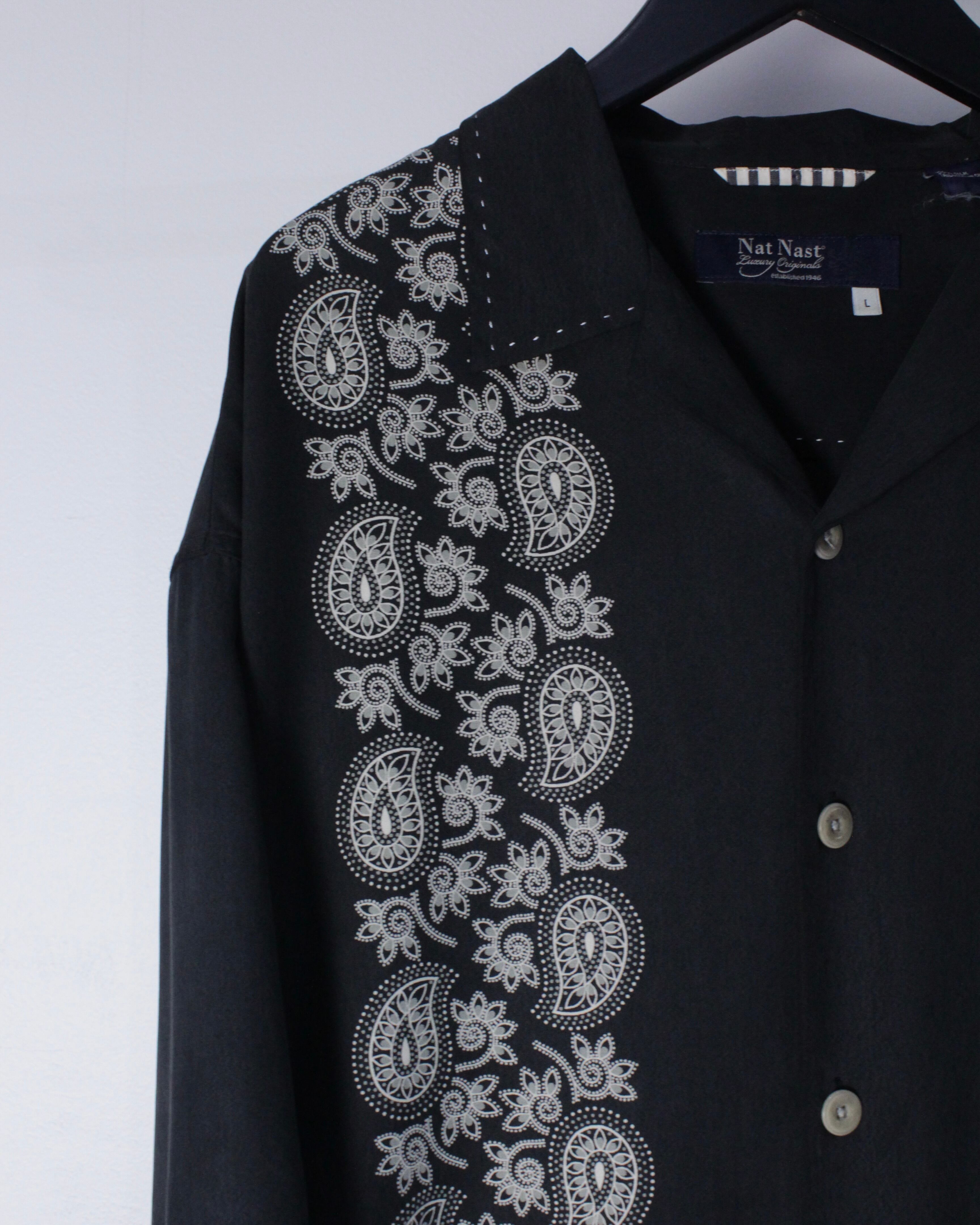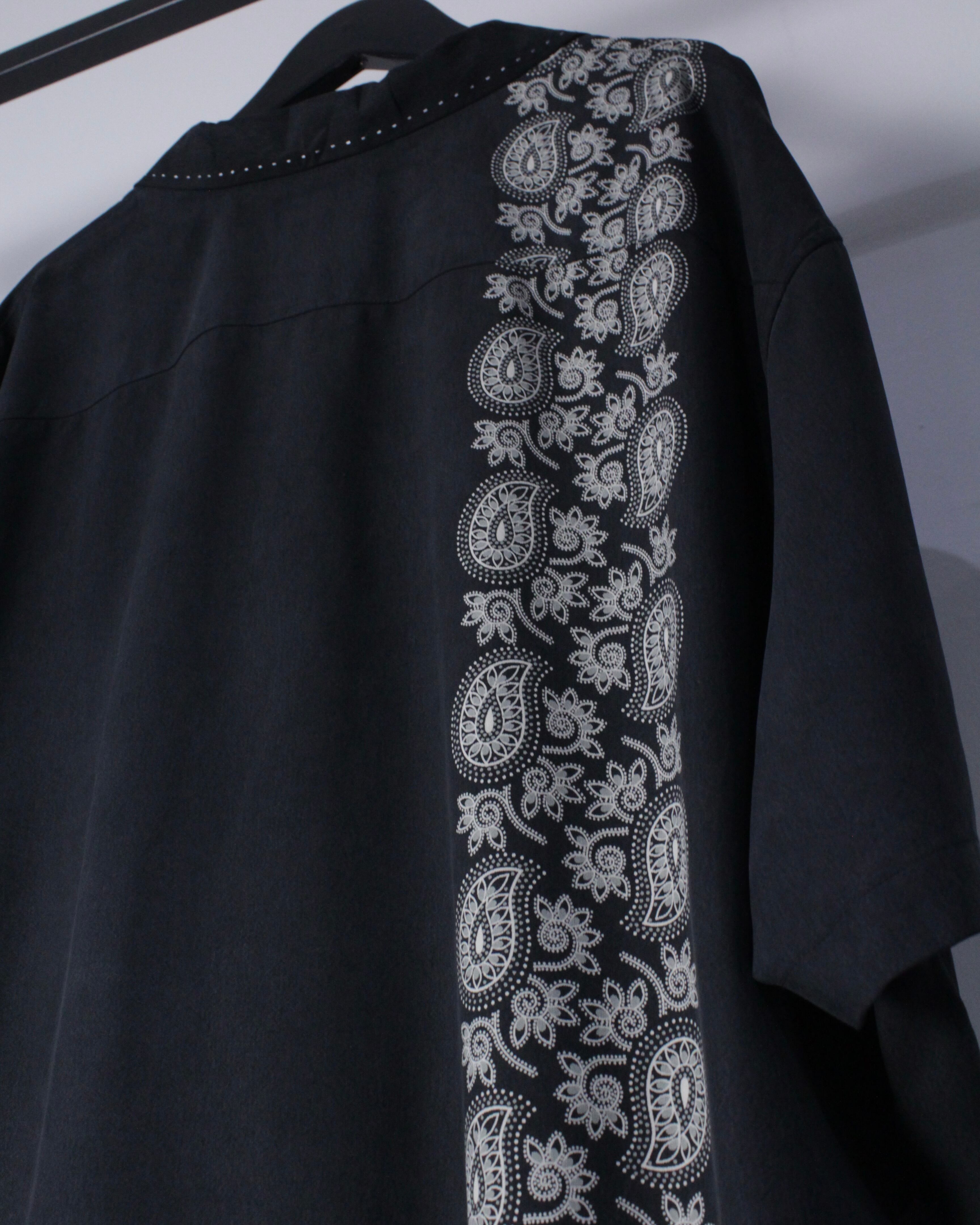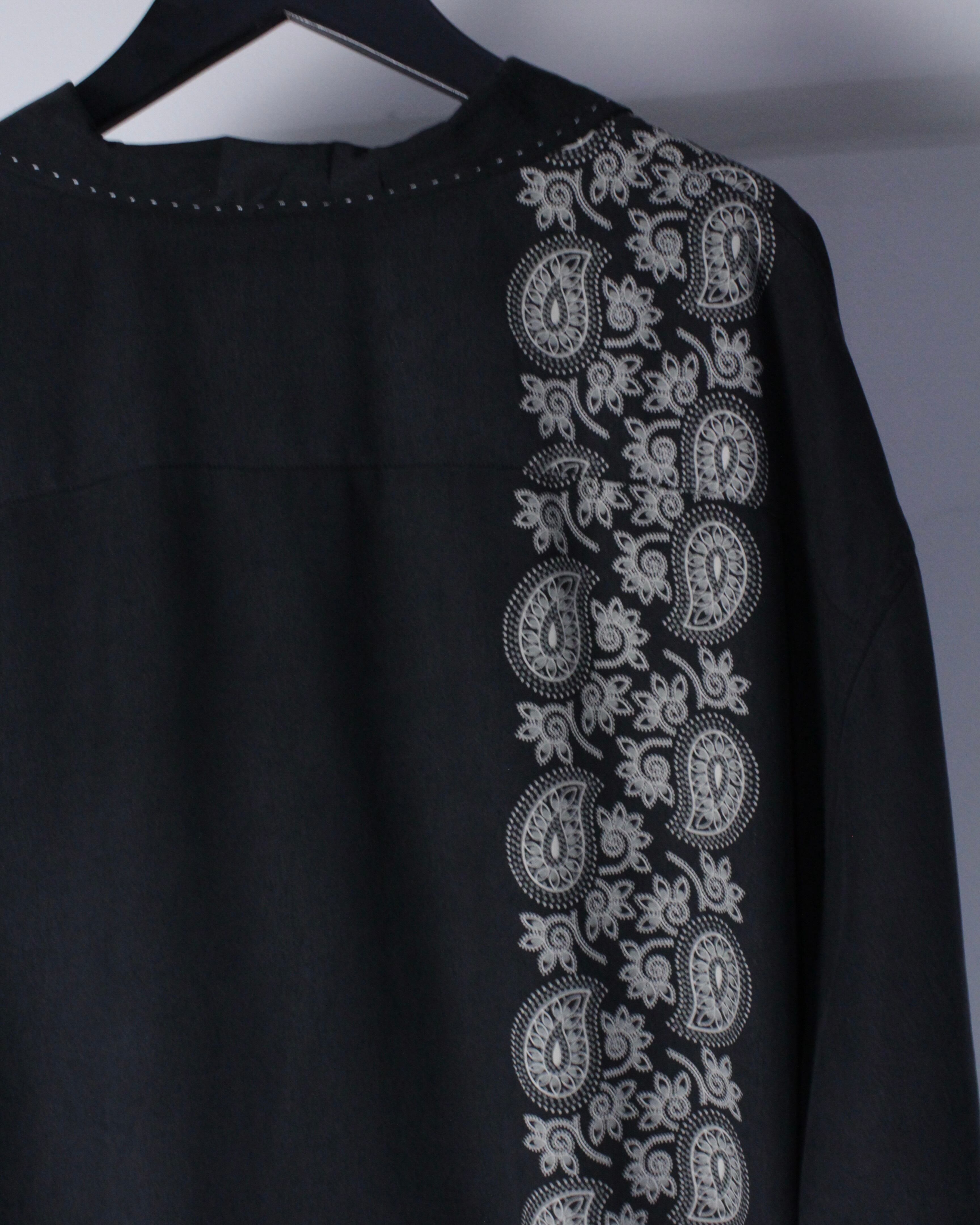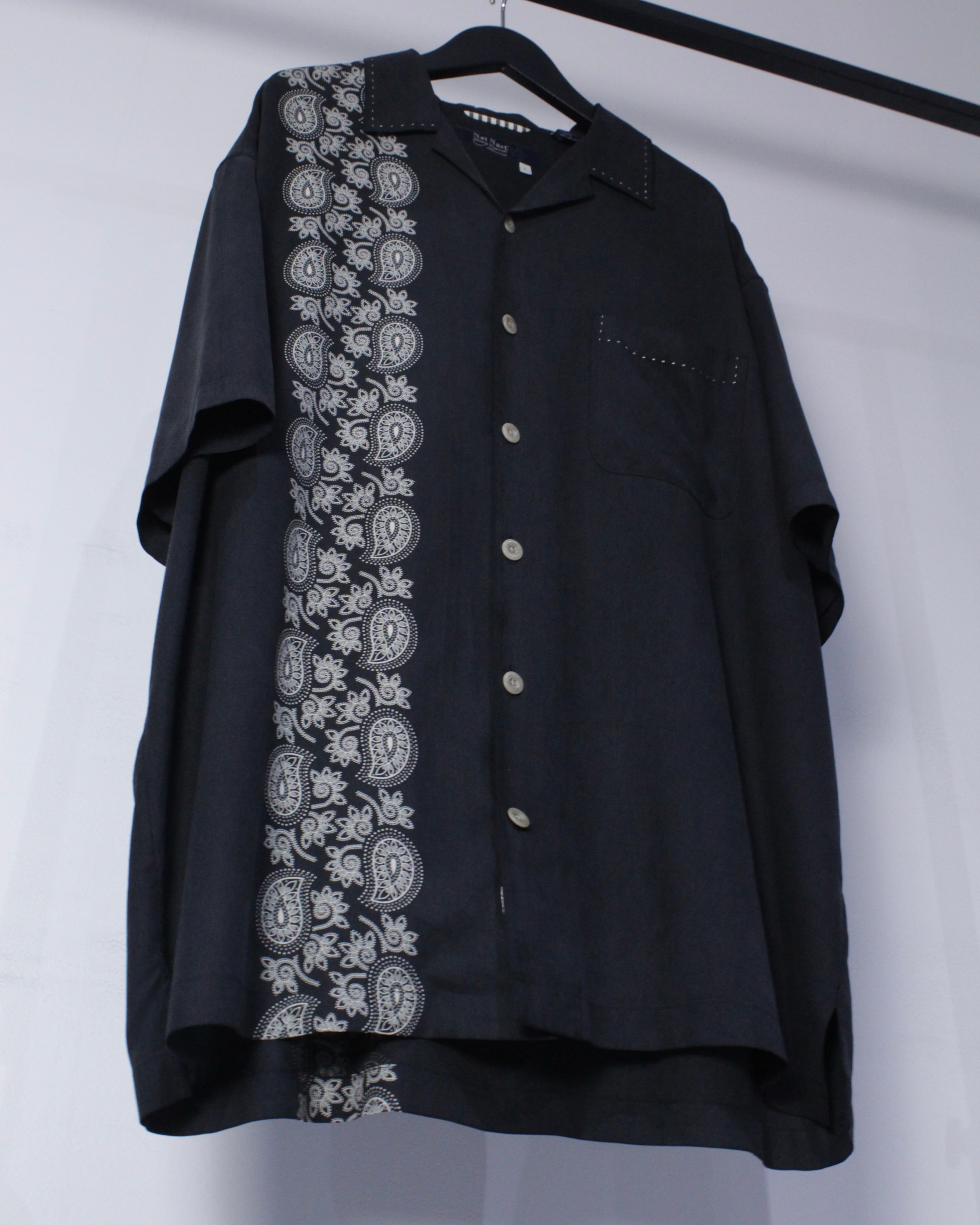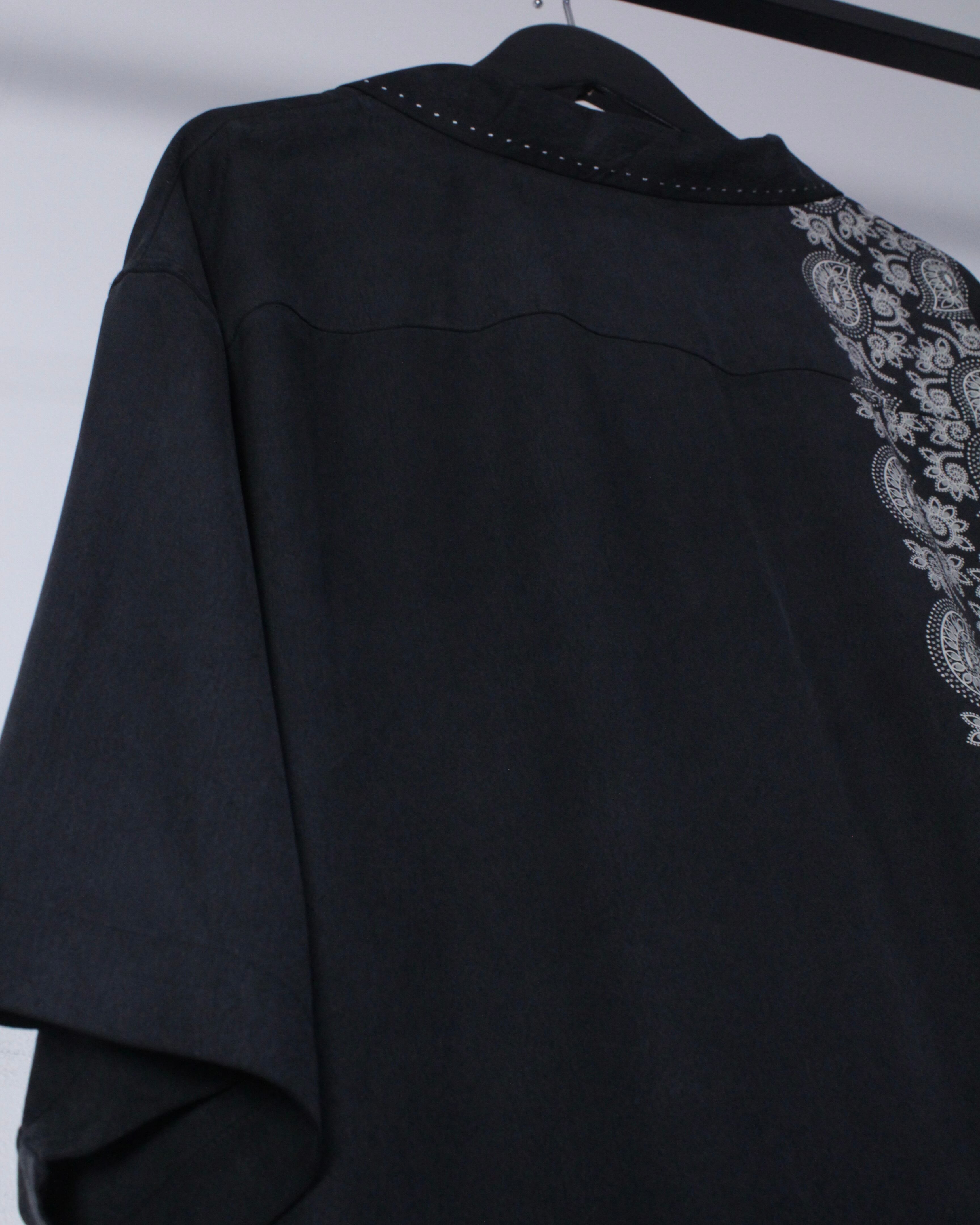フワッとエアリーなブラックシルクのボディに、右フロントから後ろにかけて緻密にデザインされた美しいペイズリー柄をプリントで載せた半袖オープンカラーシャツ。