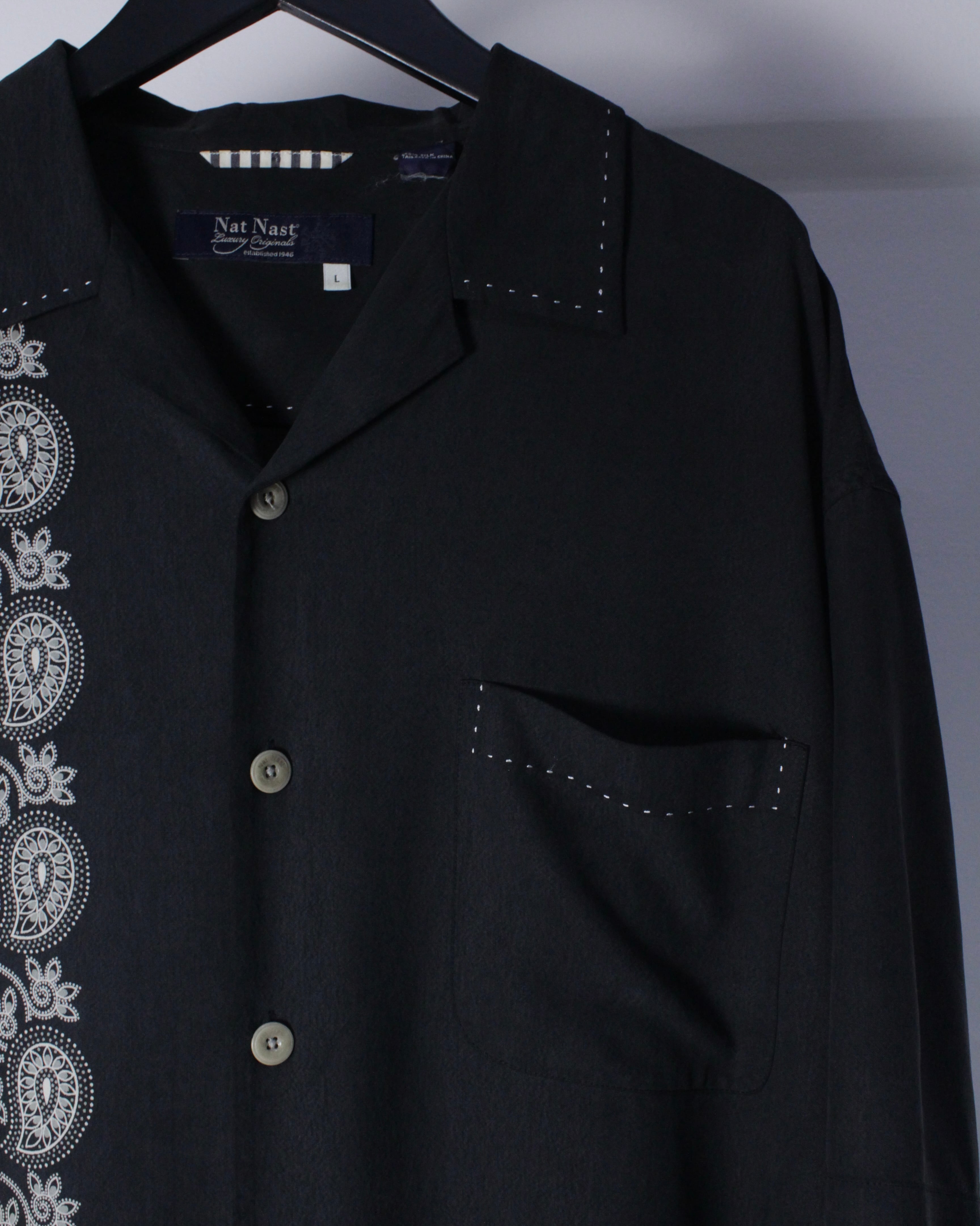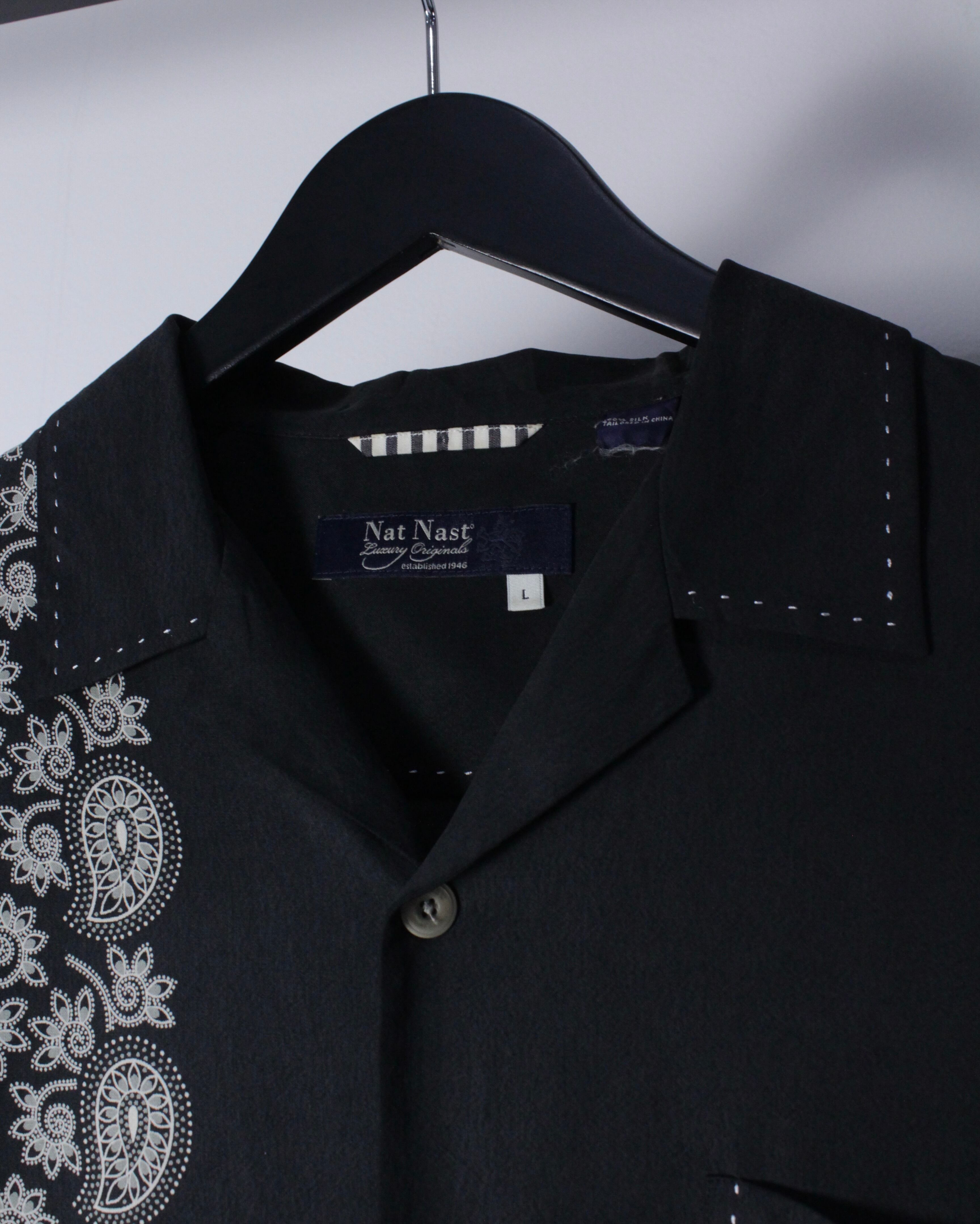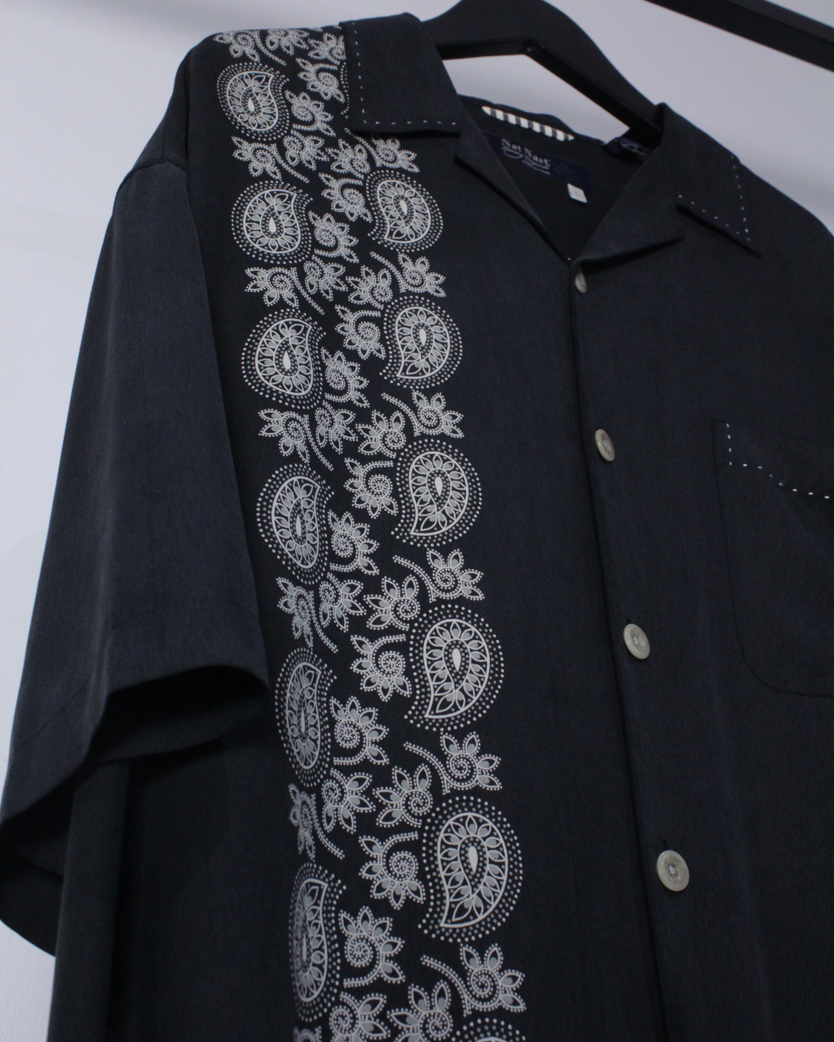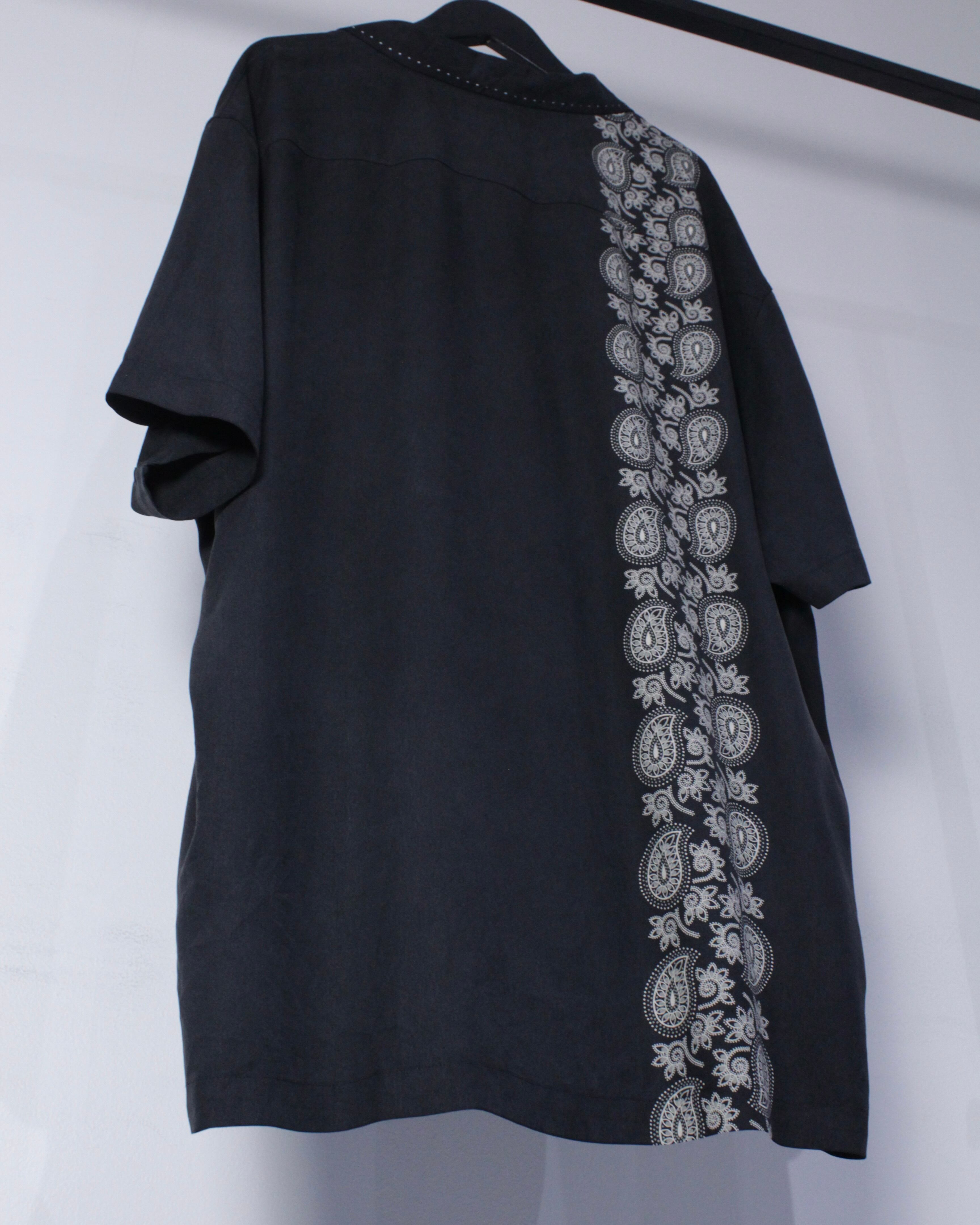 フワッとエアリーなブラックシルクのボディに、右フロントから後ろにかけて緻密にデザインされた美しいペイズリー柄をプリントで載せた半袖オープンカラーシャツ。