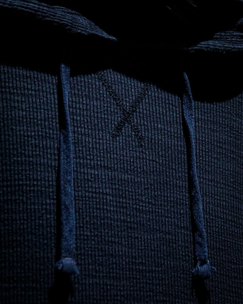 フェードブラックのカラーリングが退廃的なムードを醸し出すプルオーバーニットフーディ。