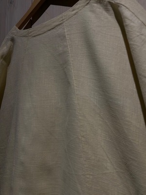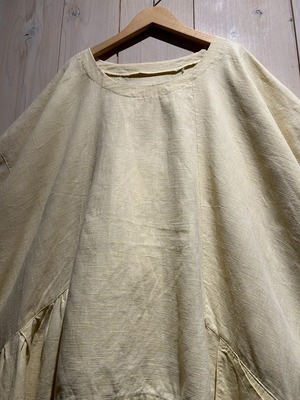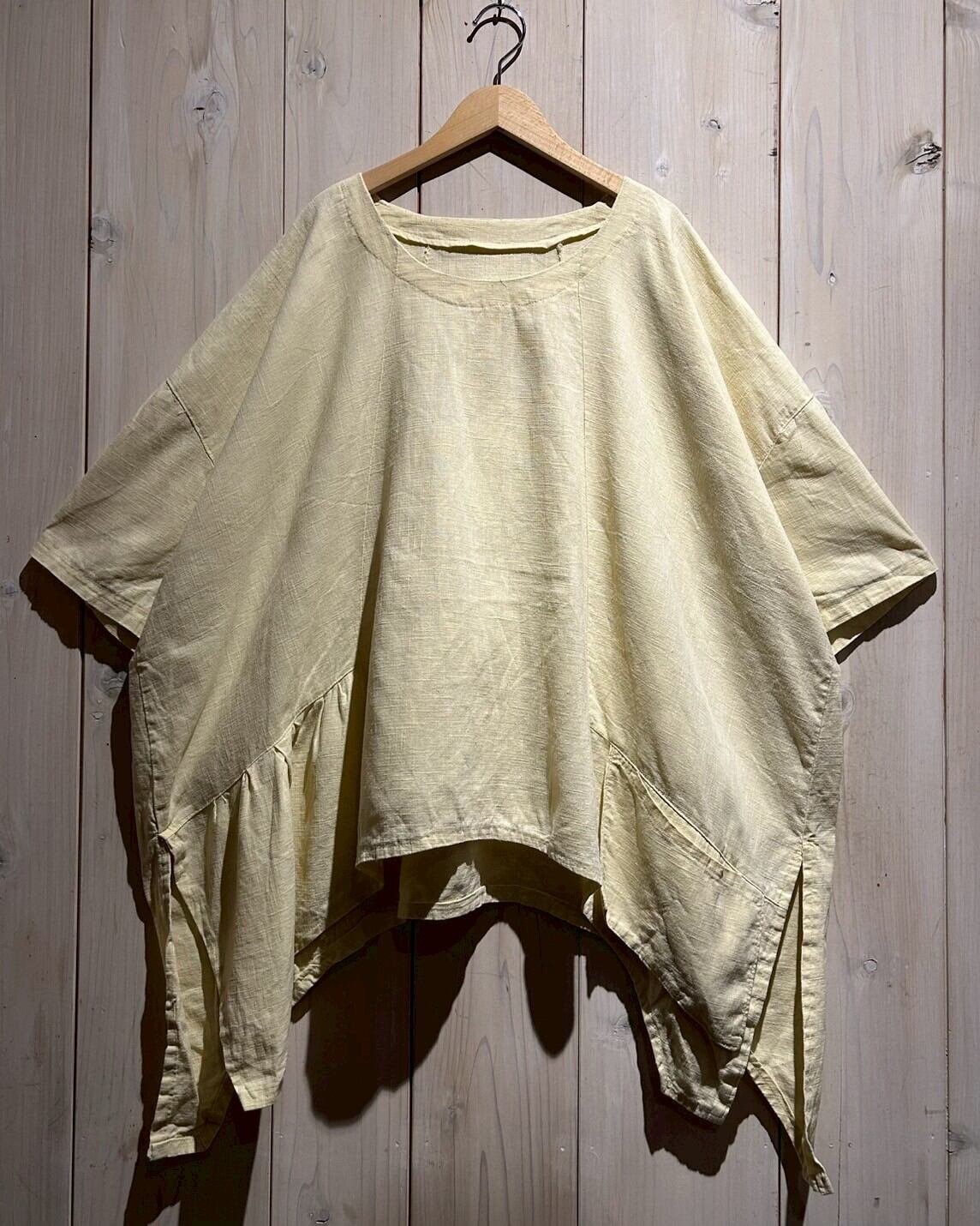 淡い黄色のリネンを用いて、変形のシルエットへと仕上げた半袖プルオーバーシャツ。
