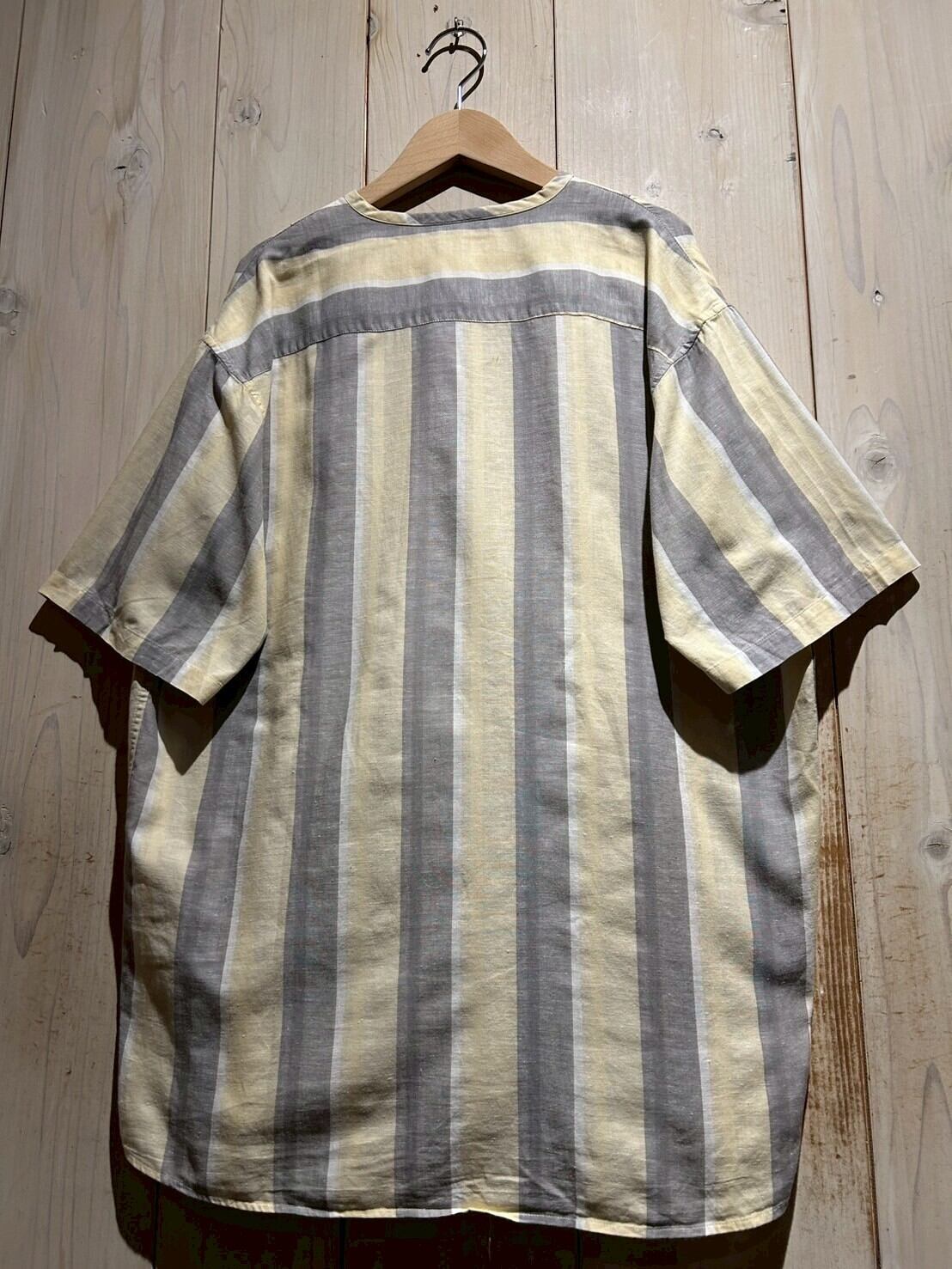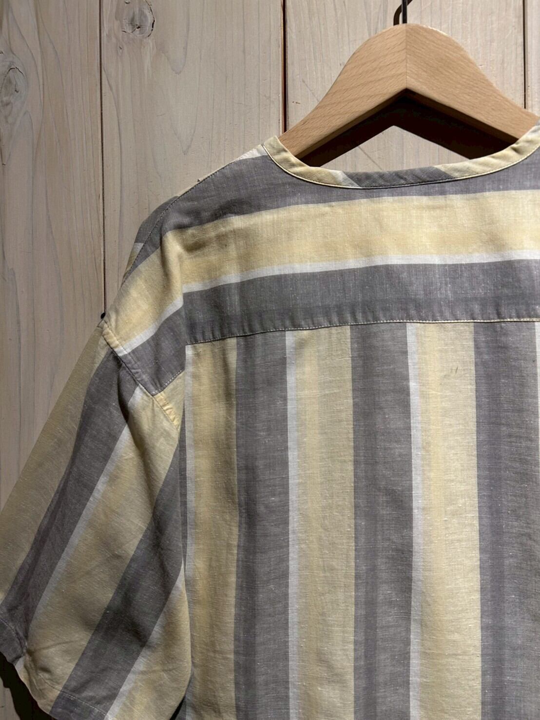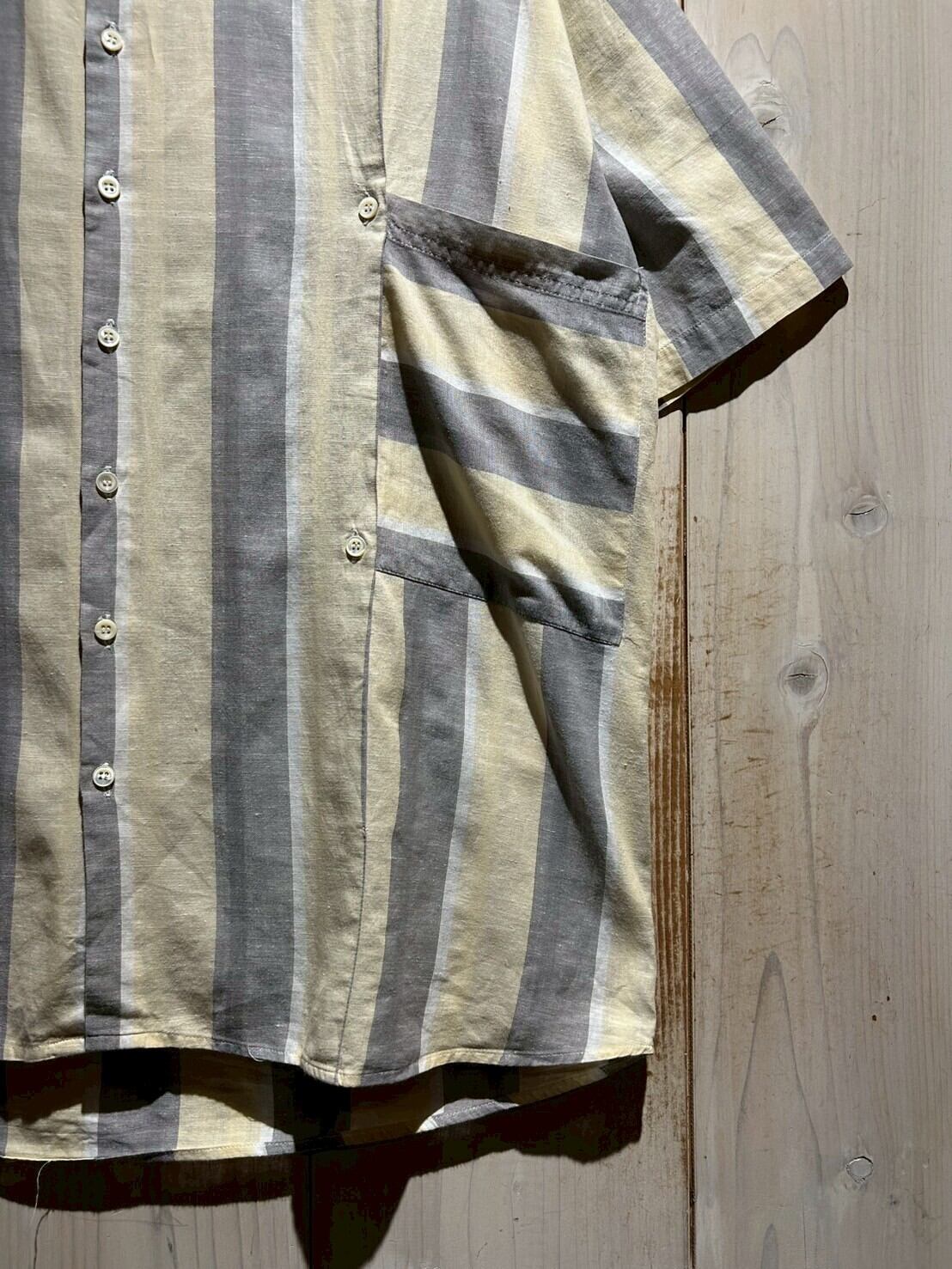 黄色、グレー、白の淡いカラーリングでストライプを載せたイタリーメイドの半袖シャツ。